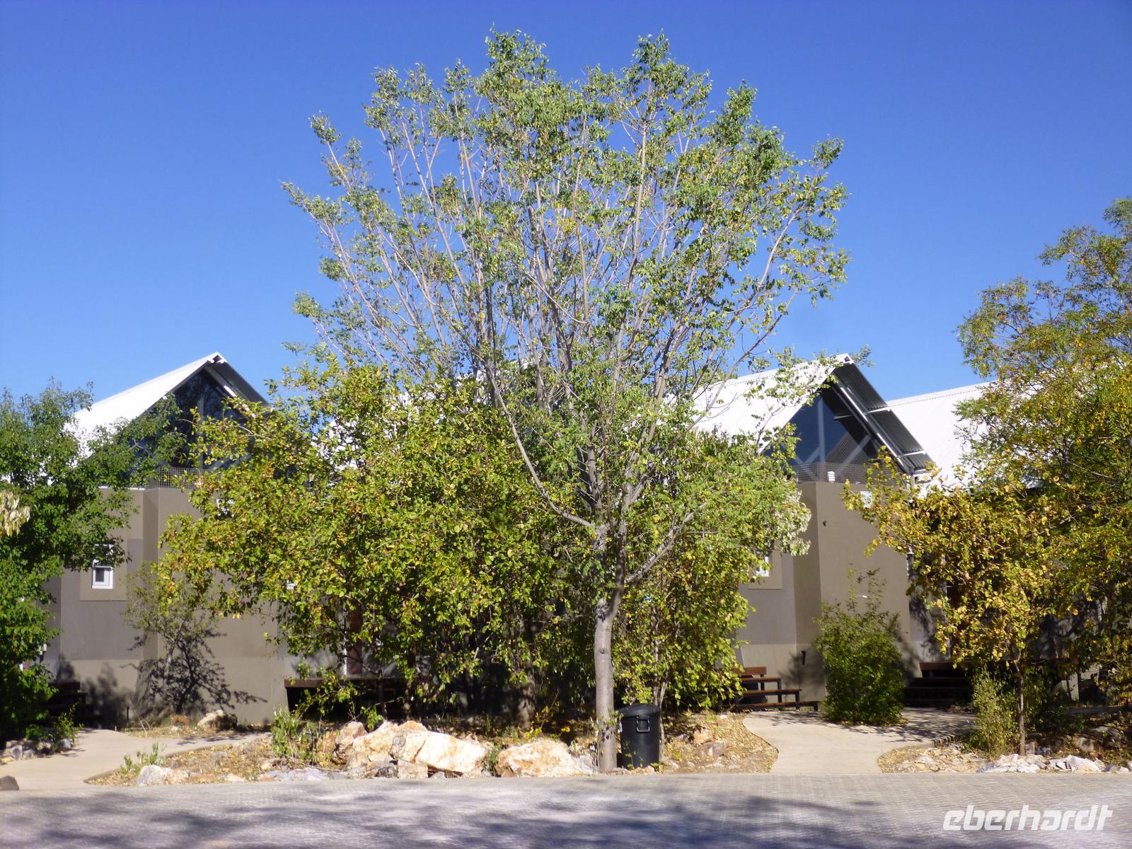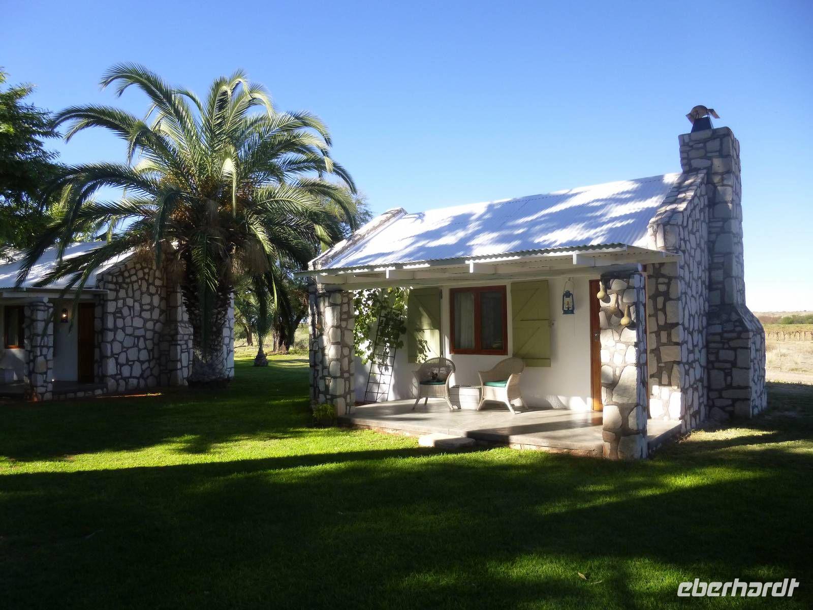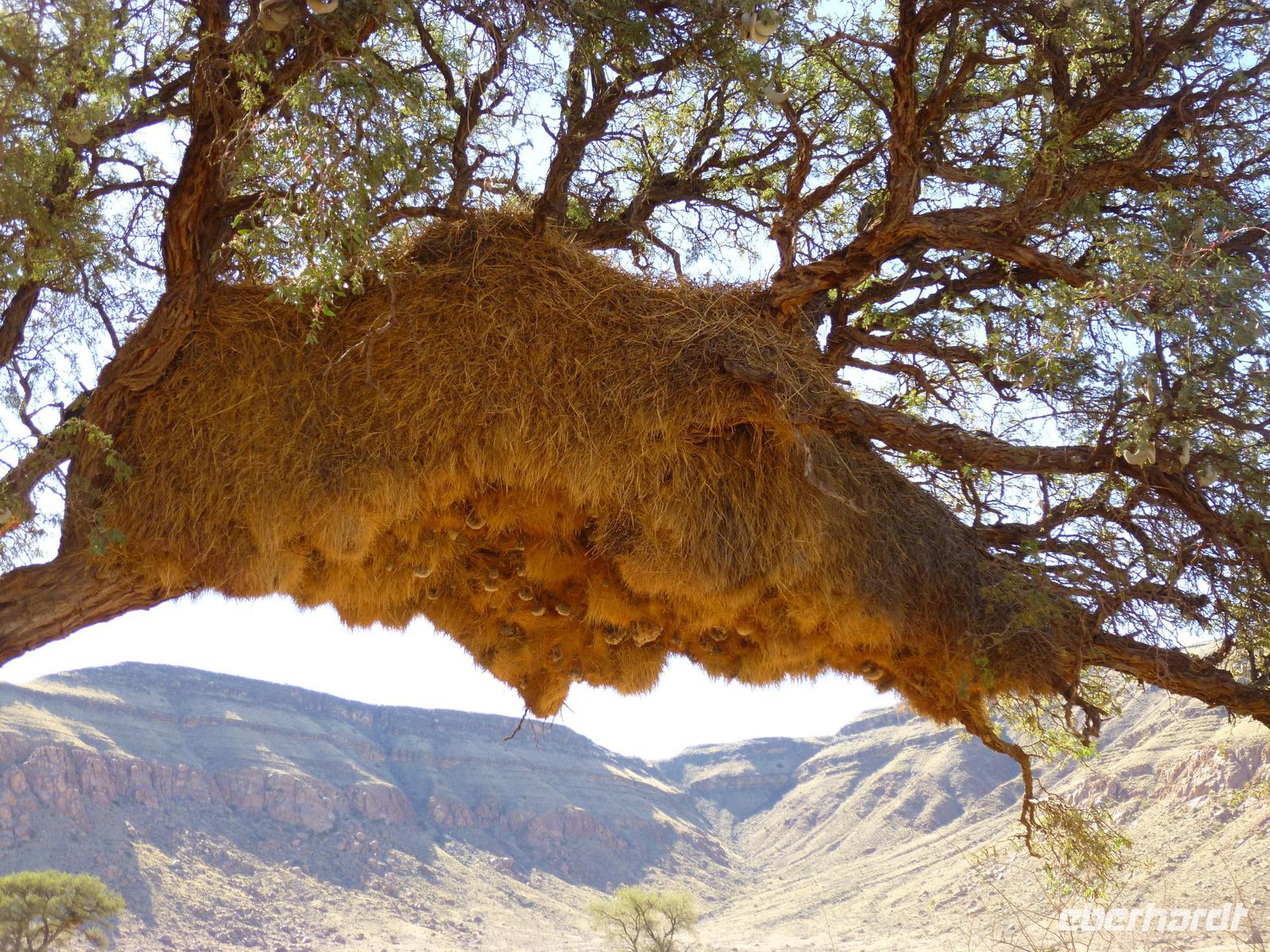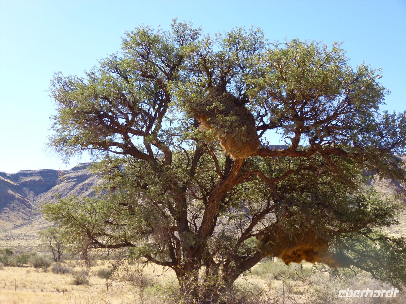 Wir fuhren entlang der Independence Avenue (Kaiser-Wilhelm-Str.). Von der einstigen Prachtstraße mit Ihren alten ehrwürdigen Häusern war leider nicht mehr viel zu sehen. Unser Safarie-Truck fuhr in Richtung Mariental. Dabei überquerten wir den südlichen Wendekreis. Unterwegs legten wir ein Picknick ein. Am Nachmittag erreichten wir die Kalahari Wüste, die größte zusammenhängende Sandfläche der Welt. Unterwegs bestaunten wir schon die großen Nester der Webervögel. Wir erreichten unseren Übernachtungsort Stampriet, der im fruchtbaren Tal des Aurob Flusses liegt. Das Kalahari-Farmhaus verfügt über einen Farmbetrieb. Uns erwartete eine kleine grüne Oase mit 11 Bungalows. Am Abend genießen wir die frischen Produkte der Farm.