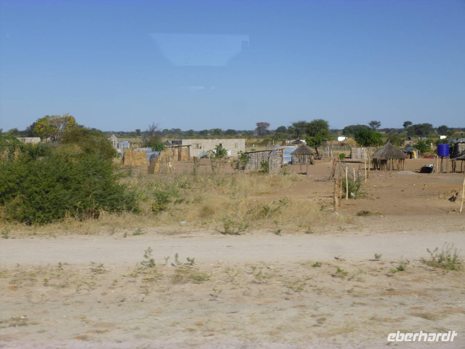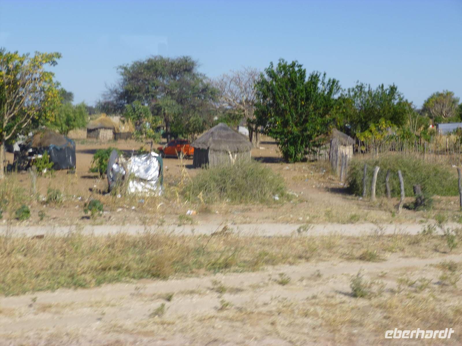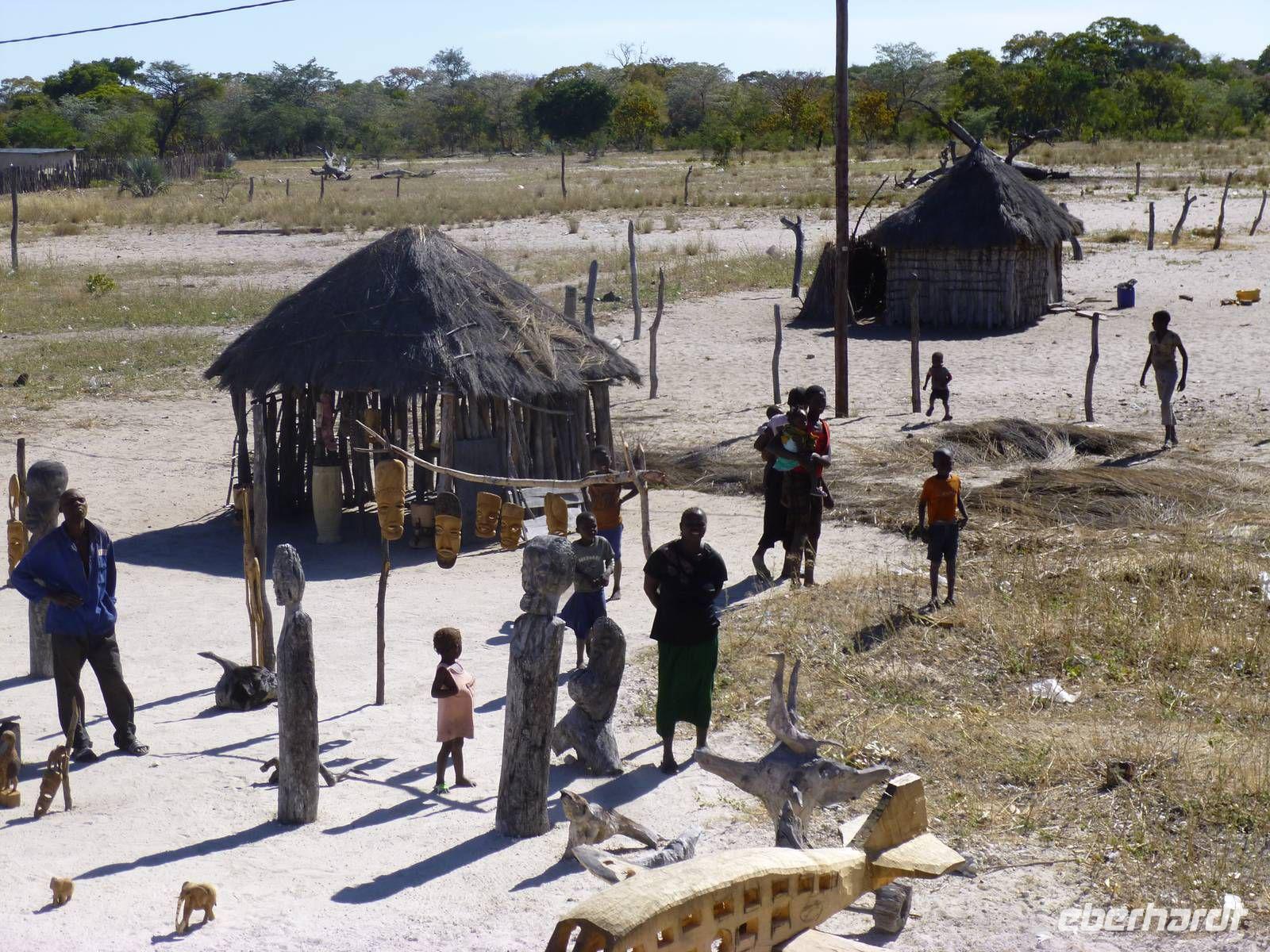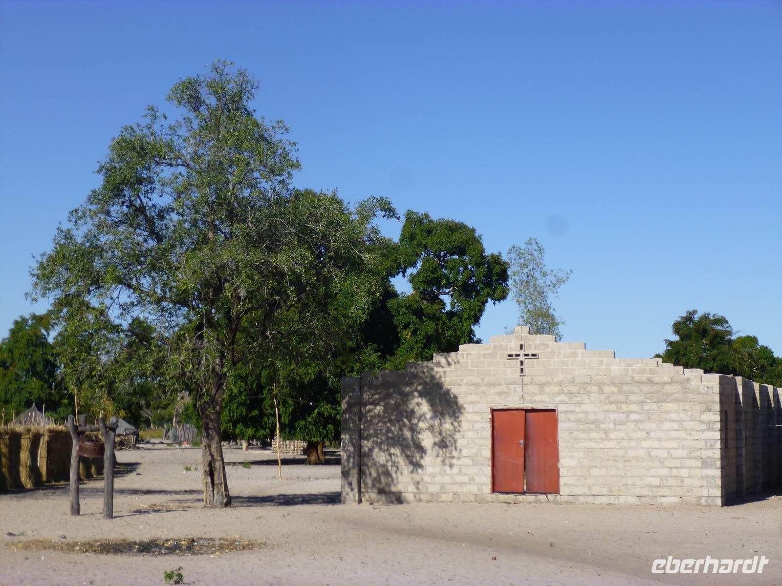 Unser erstes Ziel ist Grootfontein, wo wir die letzten Einkäufe tätigen. Wir fahren vorbei an mehreren Hektar Farmland, wo vor allem Wild gezüchtet wird. Wir erreichen das Kavankoland und kommen wieder in besiedeltes Gebiet und die Landschaft wird zunehmend afrikanisch. Strohgedeckte Rundhütten aus Lehm stehen in kleinen Siedlungen unweit der Straße. Auch Gemüsegärten sind zwischen den Siedlungen zu sehen. Am Straßenrand sitzen Holzschnitzer, die ihre Schnitzarbeiten anbieten. Wir erreichen Rundu und besuchen die Familie von Jonas. Seine Frau und die Kinder erwarteten uns schon. Er verfügt über ein kleines Haus und setzt seine Arbeit als Missionar in seiner Gemeinde fort. Das nächste Ziel ist der Bau einer Kirche.