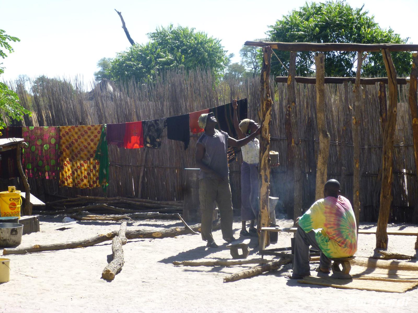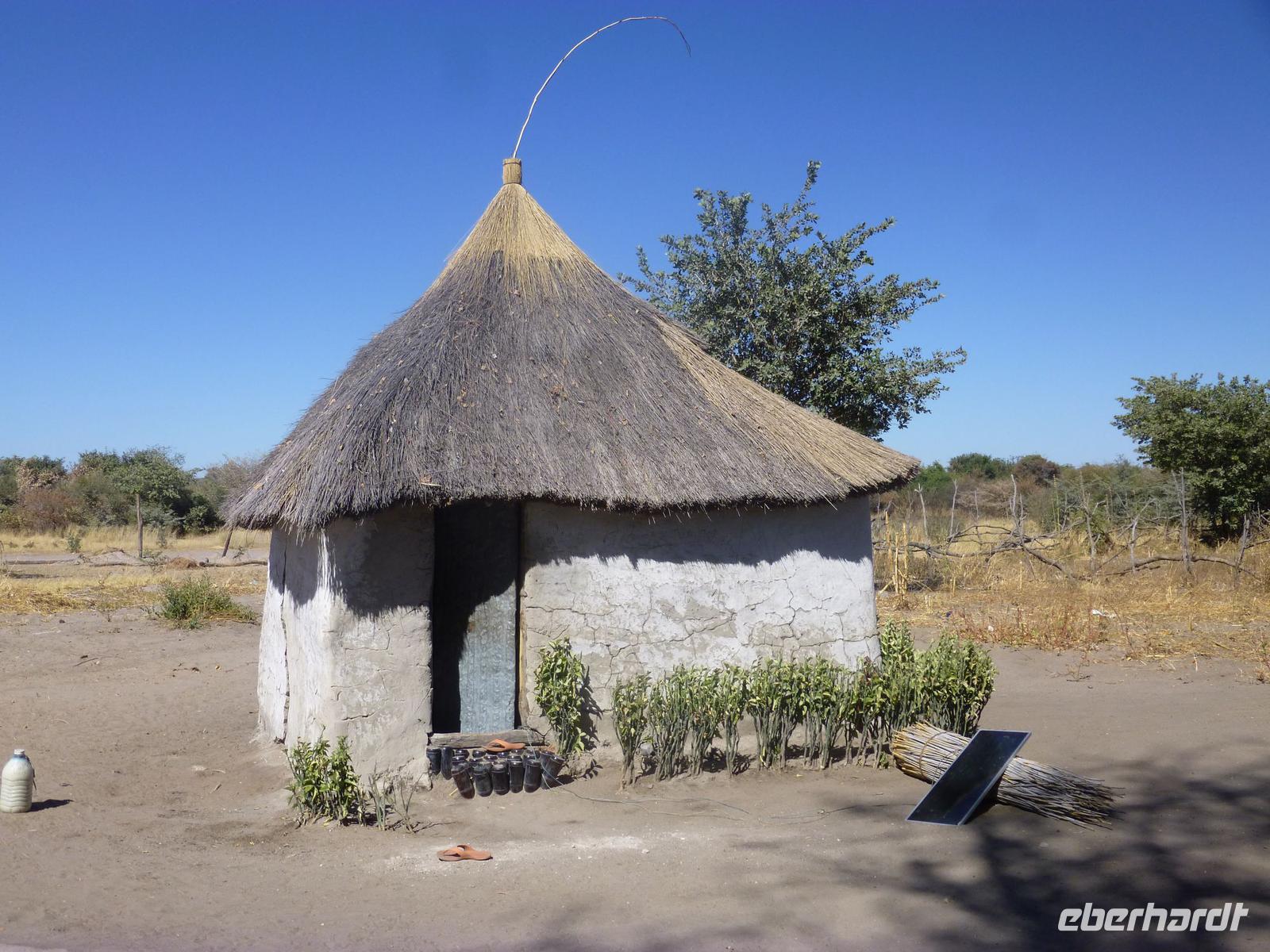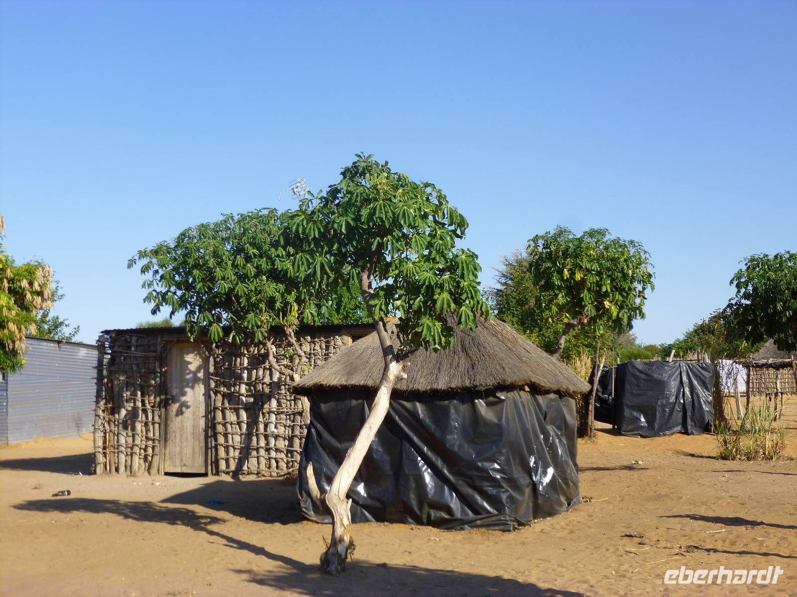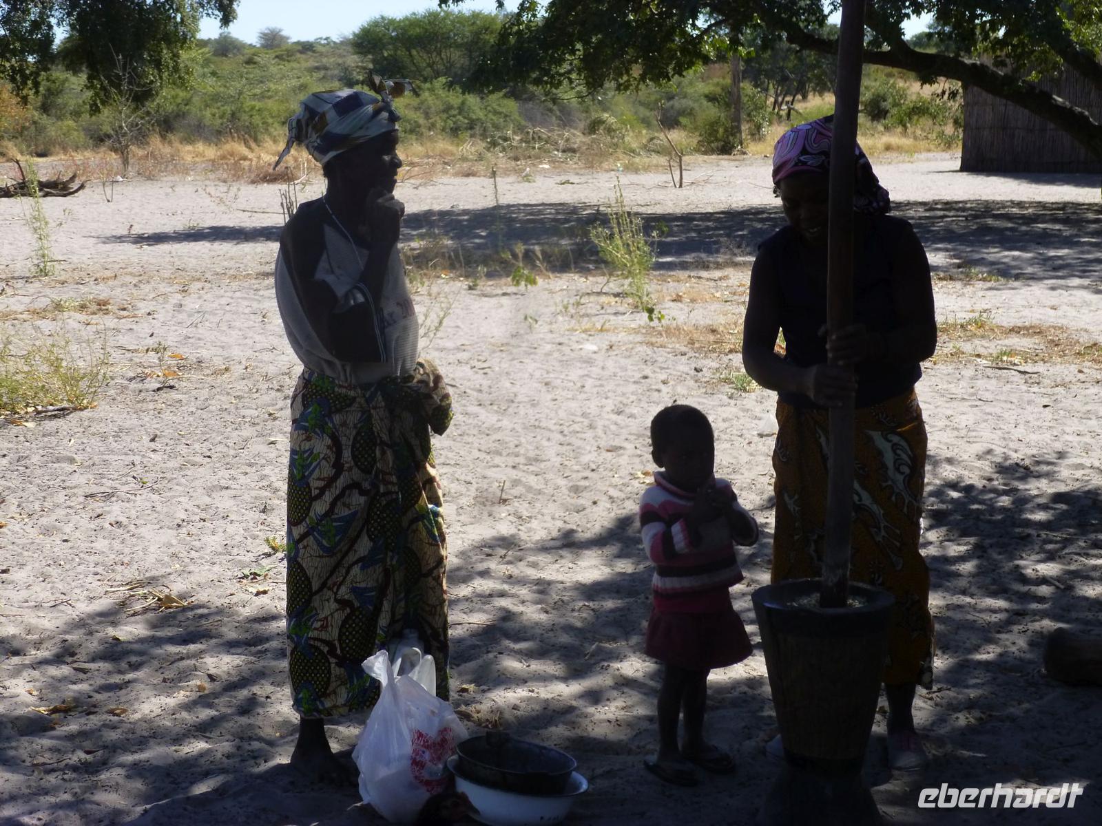Unser erstes Ziel ist Grootfontein, wo wir die letzten Einkäufe tätigen. Wir fahren vorbei an mehreren Hektar Farmland, wo vor allem Wild gezüchtet wird. Wir erreichen das Kavankoland und kommen wieder in besiedeltes Gebiet und die Landschaft wird zunehmend afrikanisch. Strohgedeckte Rundhütten aus Lehm stehen in kleinen Siedlungen unweit der Straße. Auch Gemüsegärten sind zwischen den Siedlungen zu sehen. Am Straßenrand sitzen Holzschnitzer, die ihre Schnitzarbeiten anbieten. Wir erreichen Rundu und besuchen die Familie von Jonas. Seine Frau und die Kinder erwarteten uns schon. Er verfügt über ein kleines Haus und setzt seine Arbeit als Missionar in seiner Gemeinde fort. Das nächste Ziel ist der Bau einer Kirche.