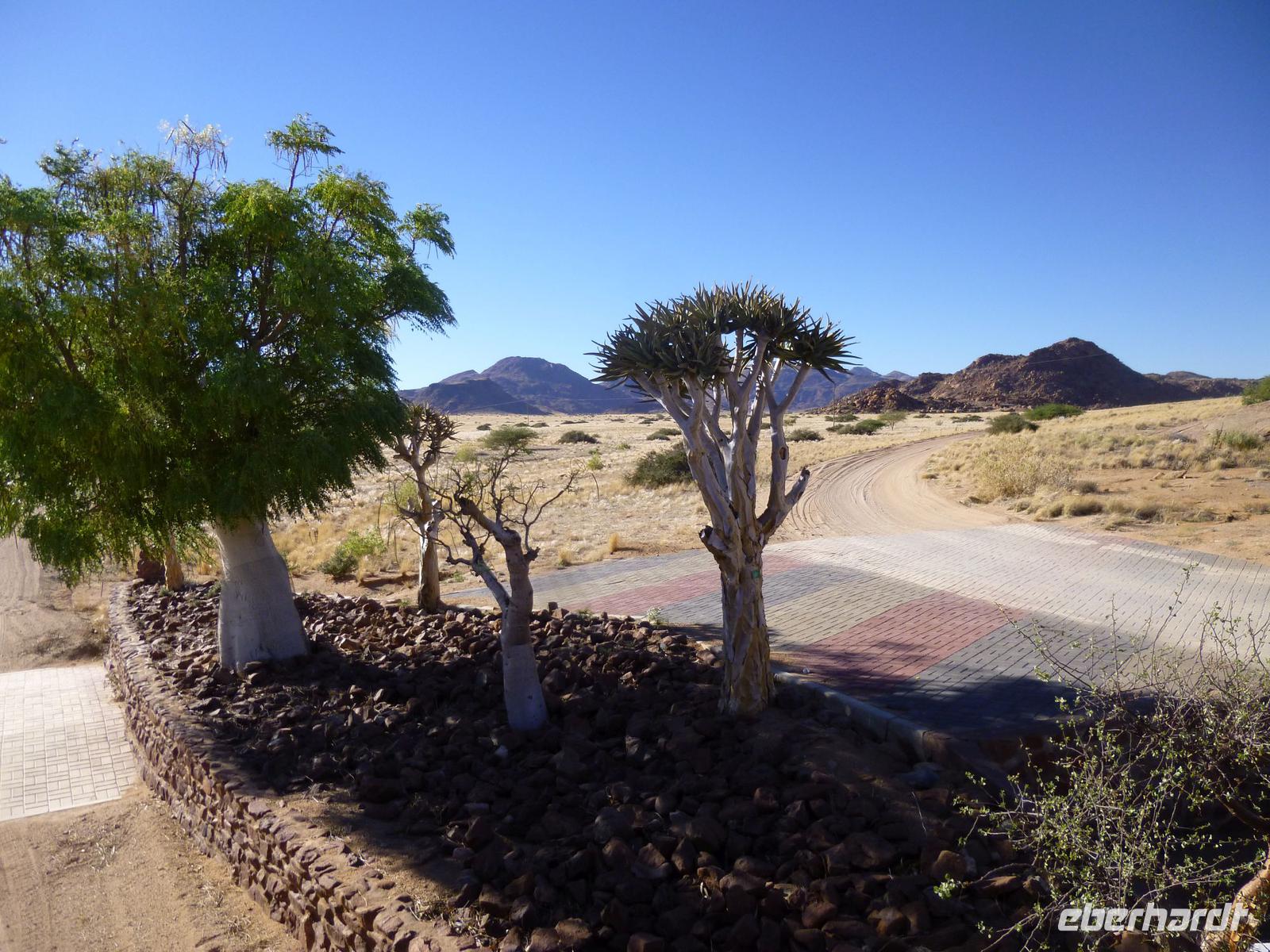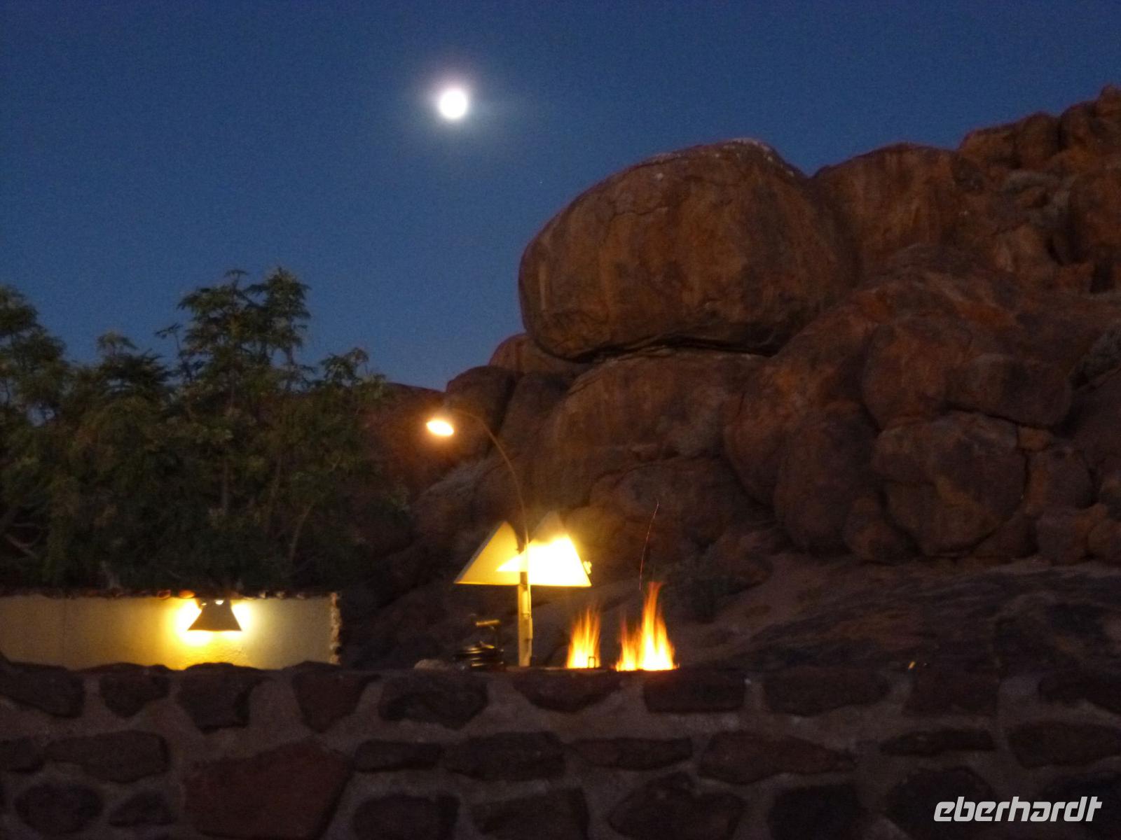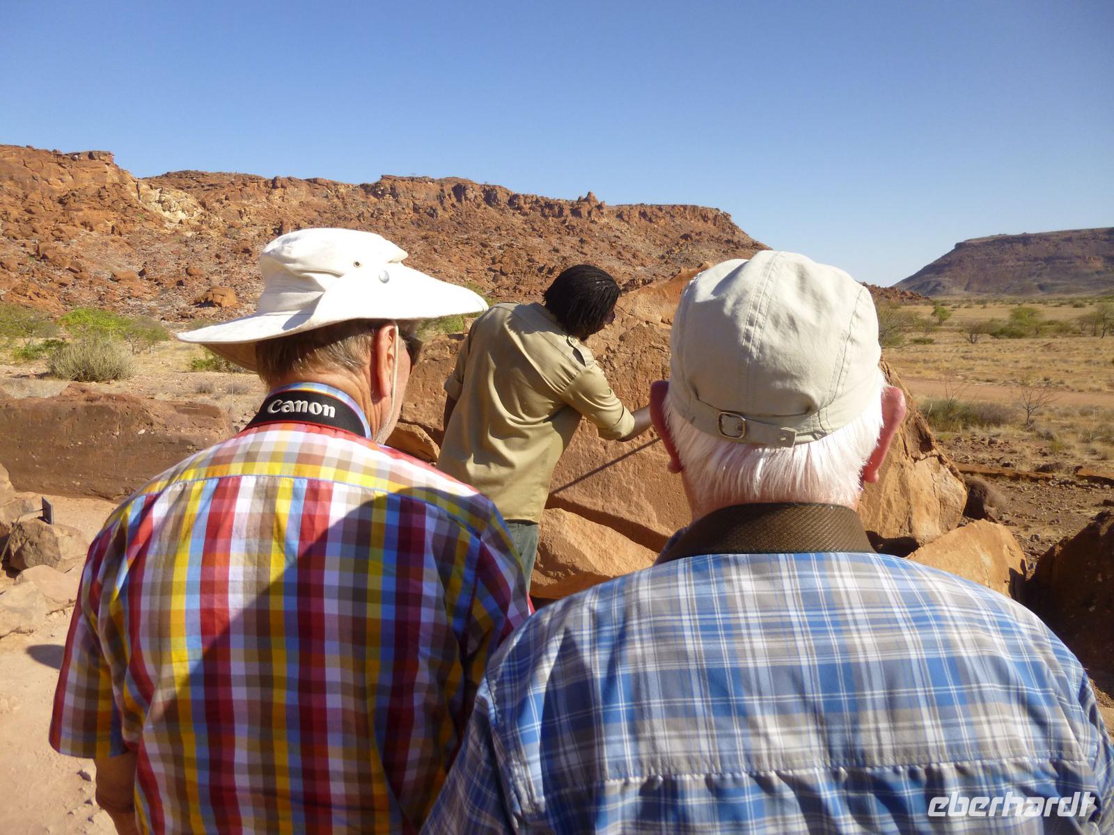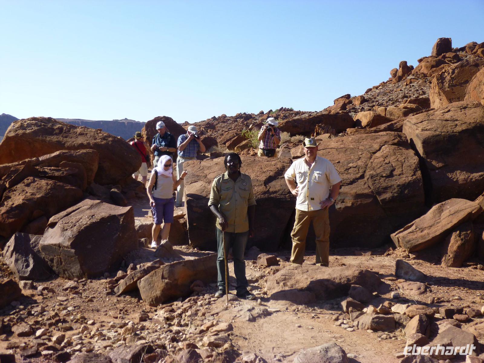 Von weiten haben wir den höchsten Berg Namibias, den Brandberg (2573 m), gesehen. Besonders beliebt bei Wanderern und Bergsteigern. Nun fahren wir in das Herz des Damaralandes, nach Twyfelfontain. Einige unternehmen mit einem einheimischen Führer einen Rundgang. Er gibt Informationen über die Entstehung und die Zeichnungen und Malereien. Auf den Felsplatten von Twyfelfontain befinden sich mehr als 2000 Gravuren und Malereien. Seit 2007 gehören sie zum Weltkulturerbe der UNESCO. Die Felsgravuren sind 1000 bis 6000 Jahre alt. Felsmalereien und Felsgravuren gehörten zu den Ritualen der früheren Jäger und Sammler (Damara), die in dieser Region lebten. Die Gravuren stellen Nashörner, Elefanten, Giraffen und Strauße dar. Wir sehen viele Mopanebäume, die beliebt bei Elefanten und Menschen sind. Den Elefanten dienen sie zur Nahrungsaufnahme und den Menschen als Brennholz. Die Blätter sind Nahrung für eine Raupe, die auf Grund ihres hohen Proteingehaltes geröstet und gegessen werden. In der Damara-Mopane-Lodge wurden wir schon erwartet.