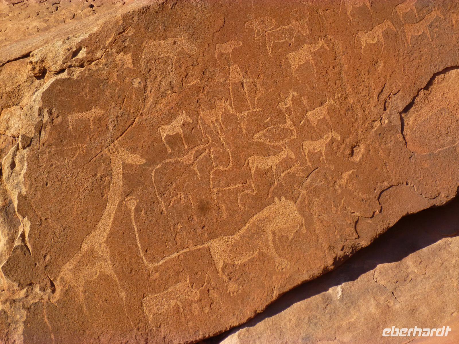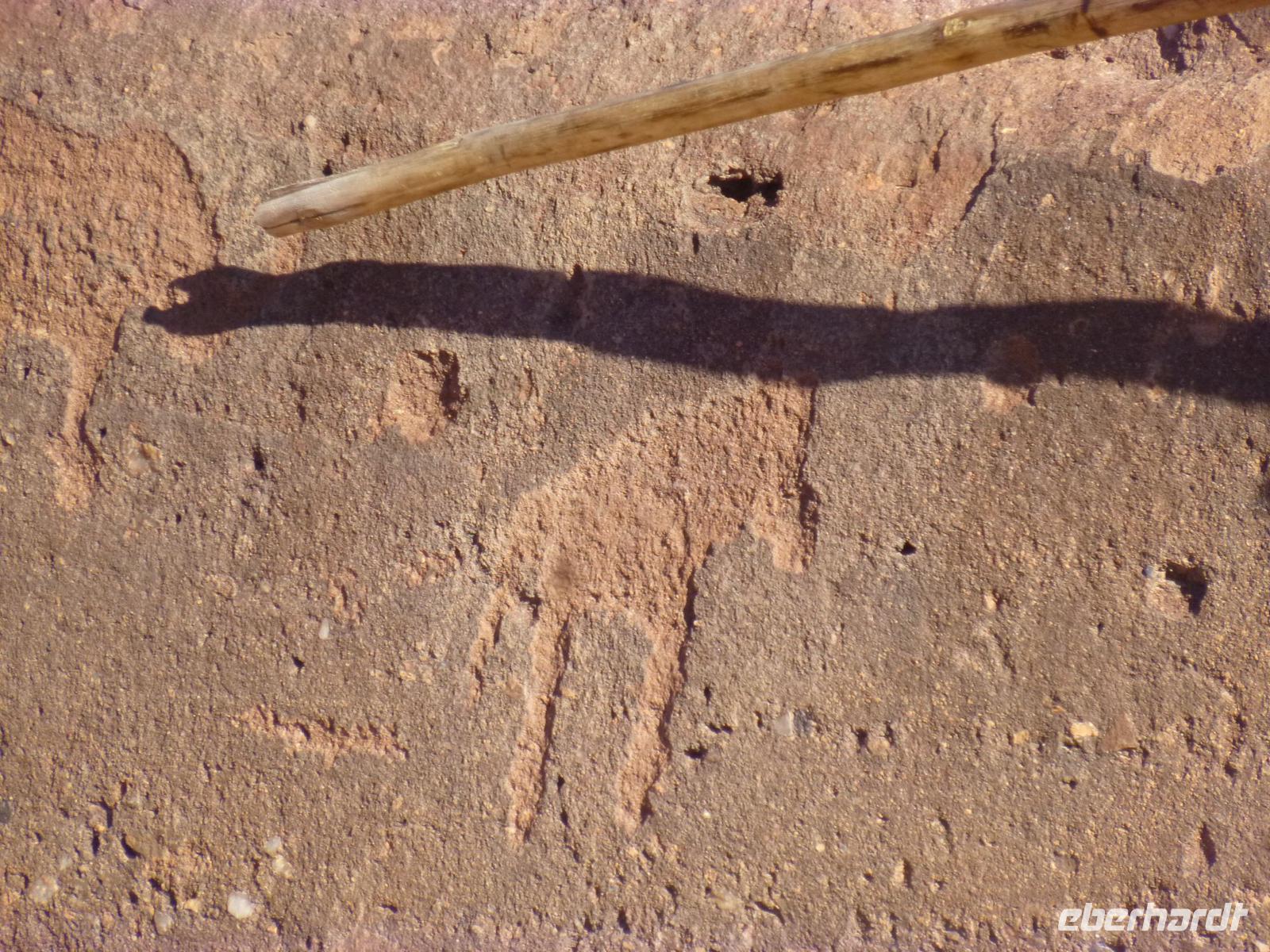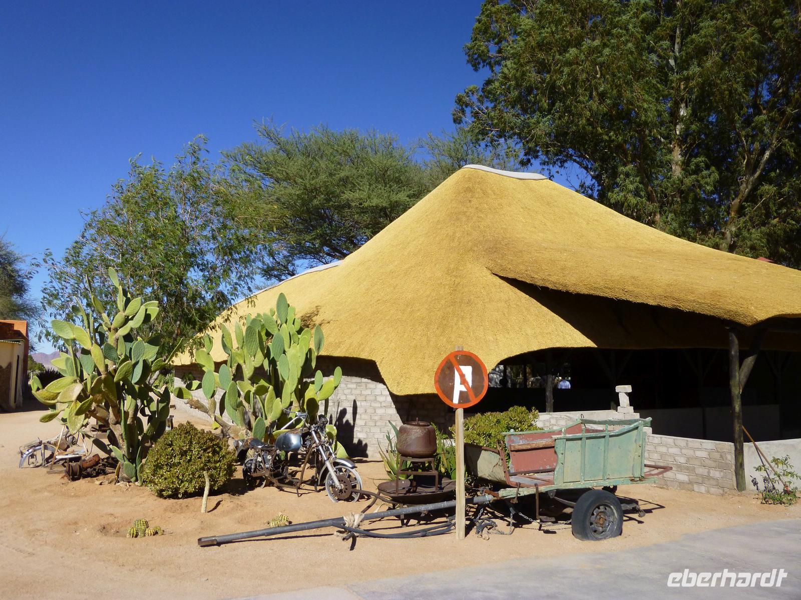 Von weiten haben wir den höchsten Berg Namibias, den Brandberg (2573 m), gesehen. Besonders beliebt bei Wanderern und Bergsteigern. Nun fahren wir in das Herz des Damaralandes, nach Twyfelfontain. Einige unternehmen mit einem einheimischen Führer einen Rundgang. Er gibt Informationen über die Entstehung und die Zeichnungen und Malereien. Auf den Felsplatten von Twyfelfontain befinden sich mehr als 2000 Gravuren und Malereien. Seit 2007 gehören sie zum Weltkulturerbe der UNESCO. Die Felsgravuren sind 1000 bis 6000 Jahre alt. Felsmalereien und Felsgravuren gehörten zu den Ritualen der früheren Jäger und Sammler (Damara), die in dieser Region lebten. Die Gravuren stellen Nashörner, Elefanten, Giraffen und Strauße dar. Wir sehen viele Mopanebäume, die beliebt bei Elefanten und Menschen sind. Den Elefanten dienen sie zur Nahrungsaufnahme und den Menschen als Brennholz. Die Blätter sind Nahrung für eine Raupe, die auf Grund ihres hohen Proteingehaltes geröstet und gegessen werden. In der Damara-Mopane-Lodge wurden wir schon erwartet.