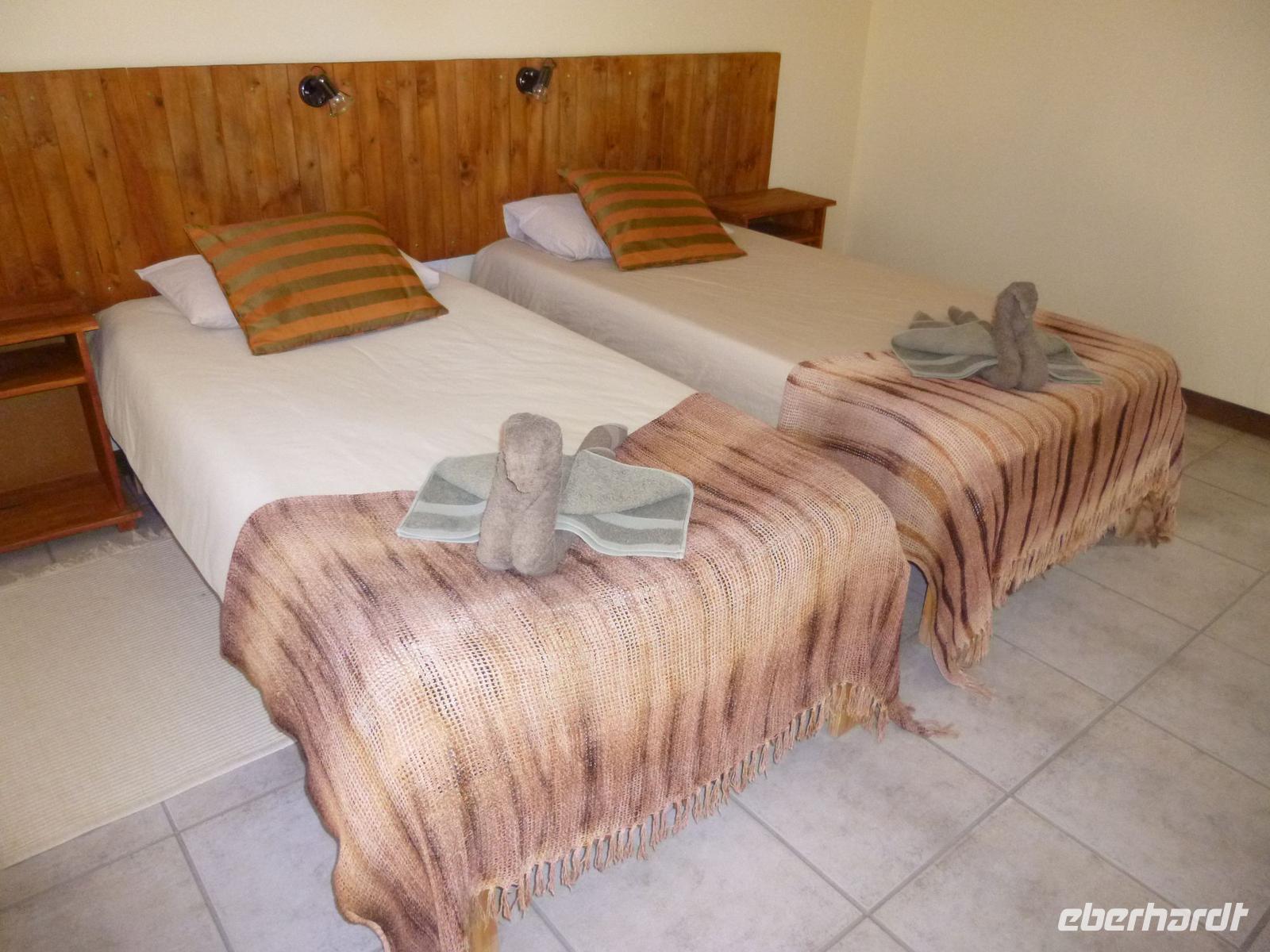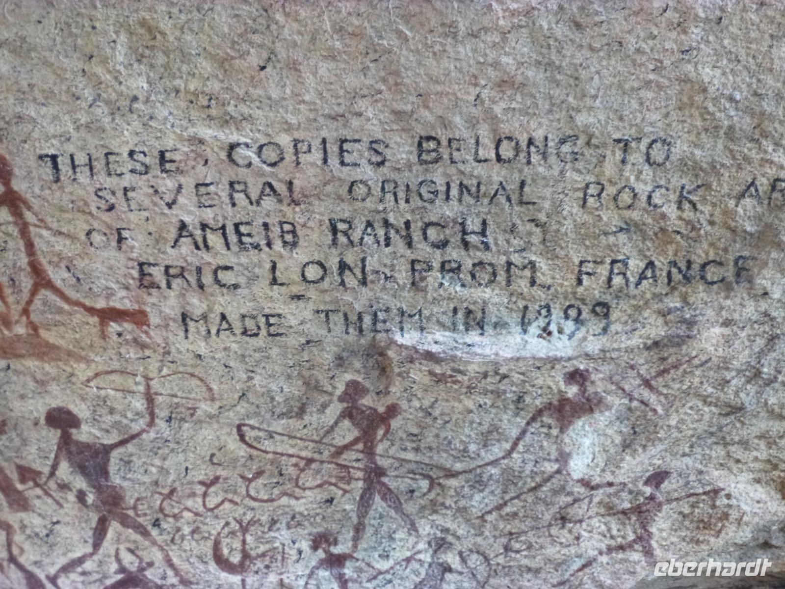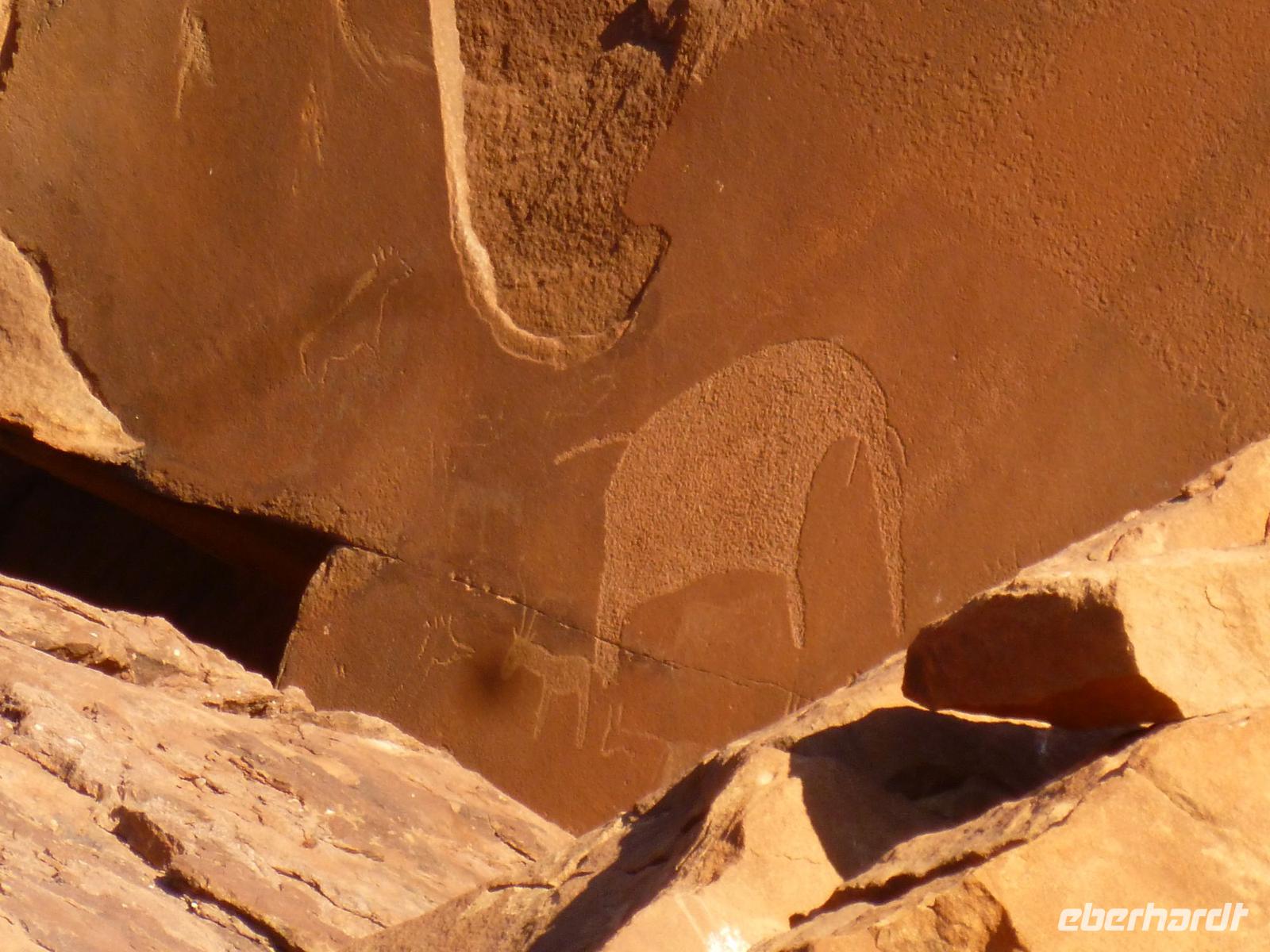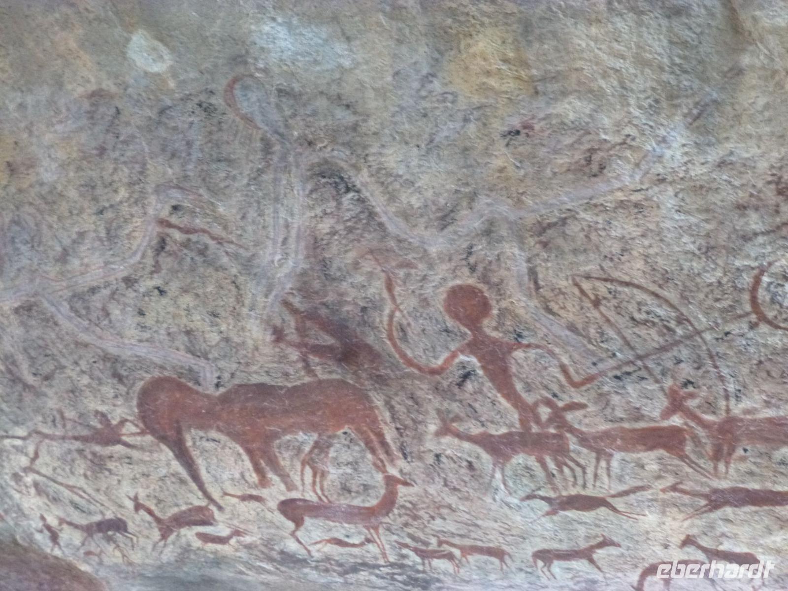 Von weiten haben wir den höchsten Berg Namibias, den Brandberg (2573 m), gesehen. Besonders beliebt bei Wanderern und Bergsteigern. Nun fahren wir in das Herz des Damaralandes, nach Twyfelfontain. Einige unternehmen mit einem einheimischen Führer einen Rundgang. Er gibt Informationen über die Entstehung und die Zeichnungen und Malereien. Auf den Felsplatten von Twyfelfontain befinden sich mehr als 2000 Gravuren und Malereien. Seit 2007 gehören sie zum Weltkulturerbe der UNESCO. Die Felsgravuren sind 1000 bis 6000 Jahre alt. Felsmalereien und Felsgravuren gehörten zu den Ritualen der früheren Jäger und Sammler (Damara), die in dieser Region lebten. Die Gravuren stellen Nashörner, Elefanten, Giraffen und Strauße dar. Wir sehen viele Mopanebäume, die beliebt bei Elefanten und Menschen sind. Den Elefanten dienen sie zur Nahrungsaufnahme und den Menschen als Brennholz. Die Blätter sind Nahrung für eine Raupe, die auf Grund ihres hohen Proteingehaltes geröstet und gegessen werden. In der Damara-Mopane-Lodge wurden wir schon erwartet.