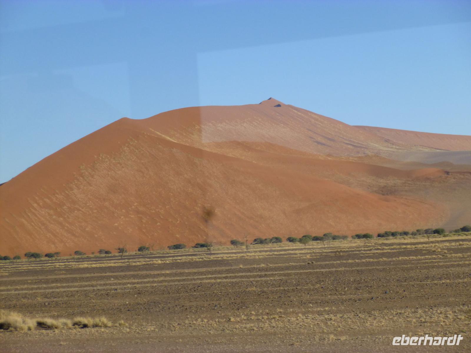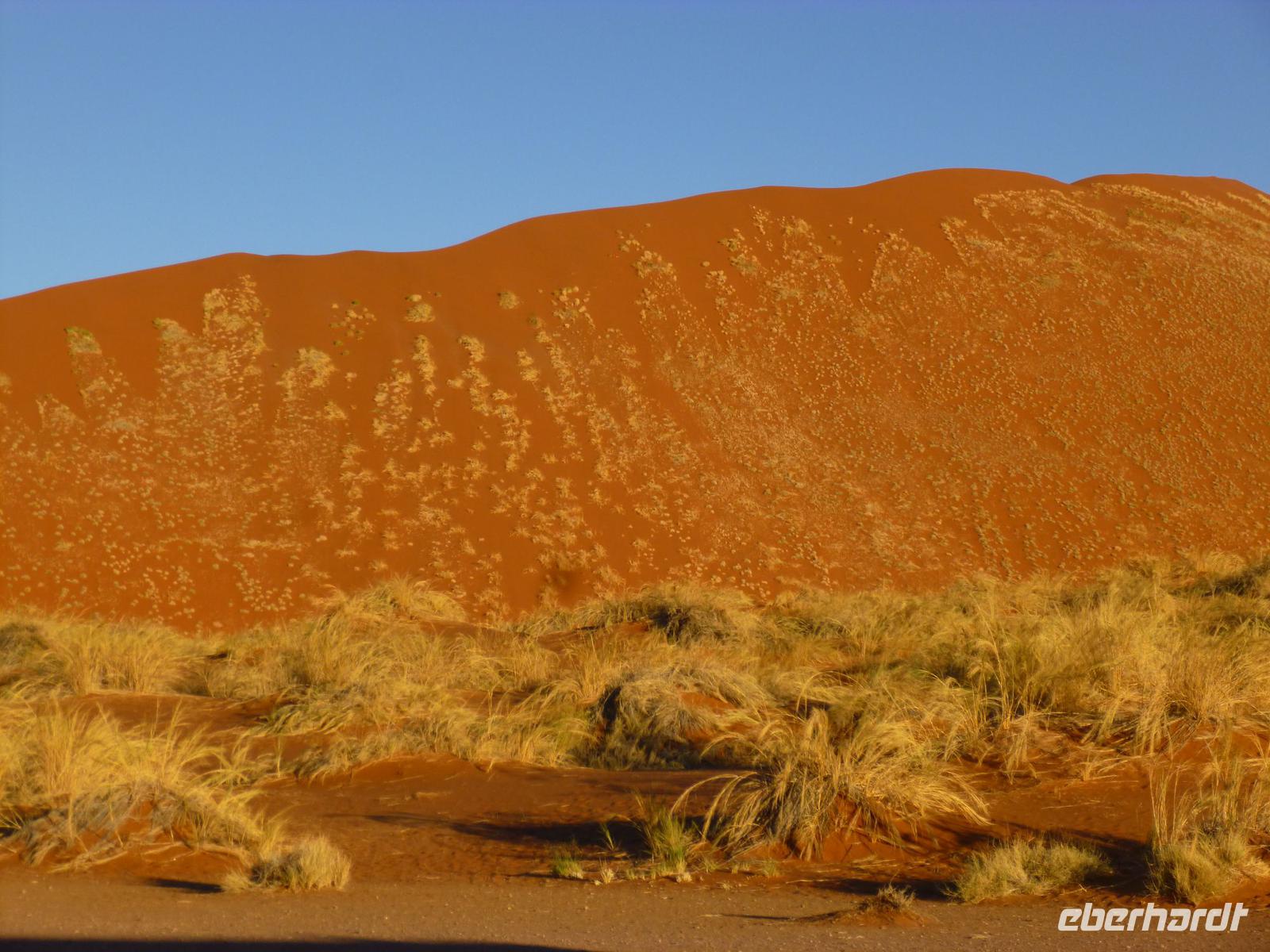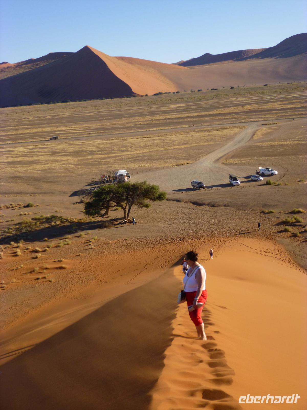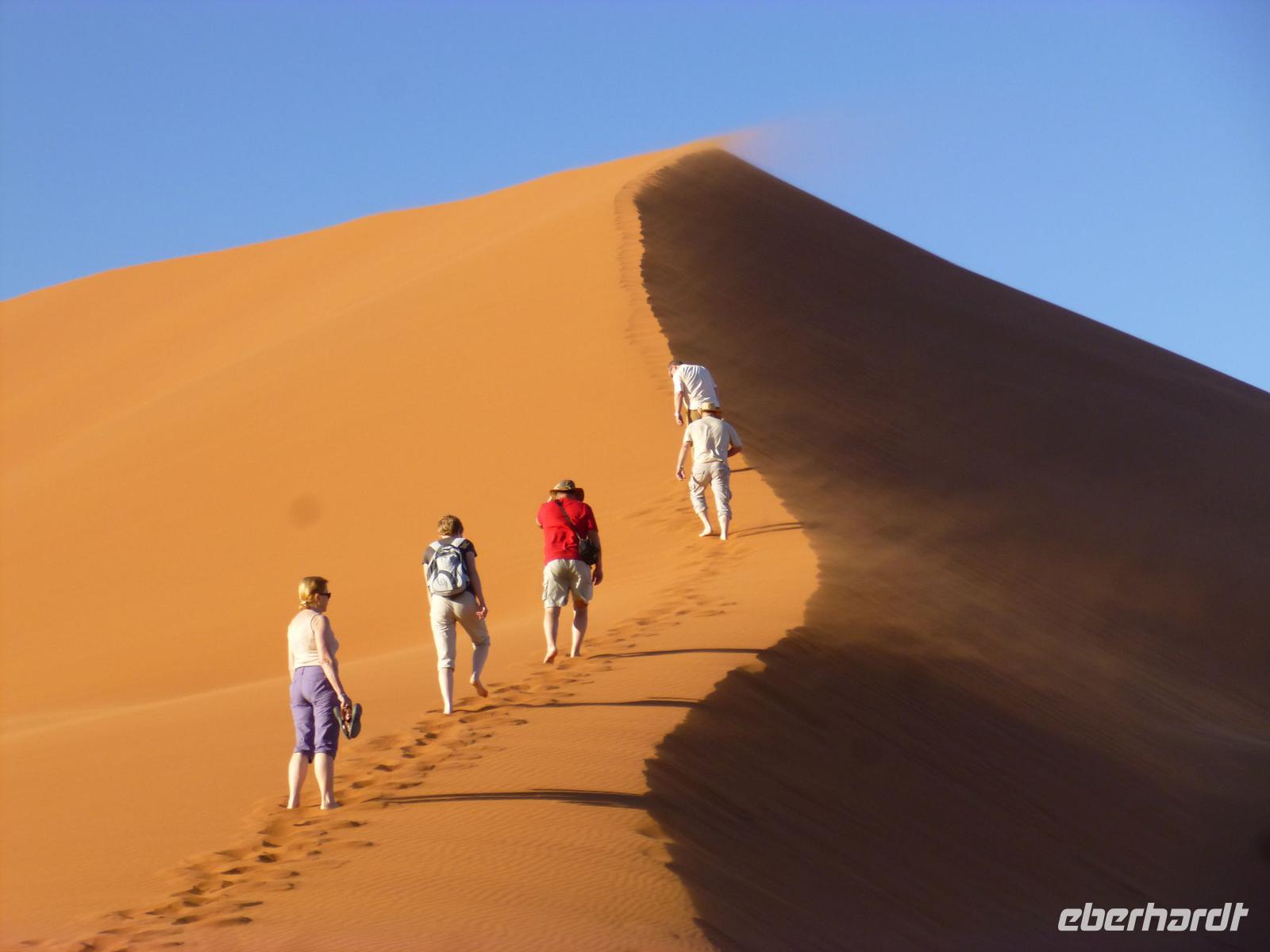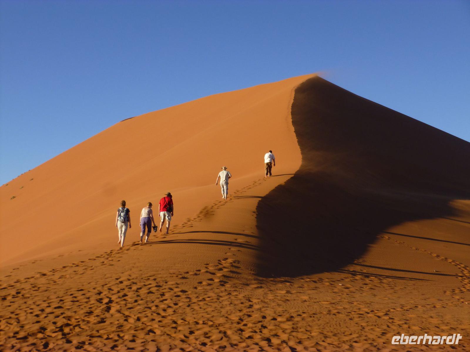 Heute mussten wir zeitig aufstehen, denn wir besuchten im Namib Naukluft Park das Sussusvlei. Die Namib ist die älteste Wüste der Welt. Leider öffnete der Nationalpark erst nach Sonnenaufgang. Wir fuhren entlang des trockenen Flusses Tsauchab und erreichten das Eingangstor. Außer den roten Sandwellen sahen wir geheimnisvolle Kreise, die Feenkreise. Bisher gibt es noch keine Erklärung für dieses Phänomen. Die Düne 45 war unser erstes Ziel. Einige nahmen den etwas beschwerlichen Weg zum „Gipfel" der Düne in Angriff. Die Entfernung bis dahin wird immer unterschätzt und erschwert wurde er durch den Wind, der eine kräftige Brise schickte. Es bot sich ein einzigartiger Panorama über die Dünen. Jetzt war es Zeit, unser Frühstück einzunehmen. Wir saßen unterhalb der Düne mit einem Blick über die Dünenlandschaft. Nach dieser Stärkung fuhren wir zum Parkplatz, wo wir auf Geländefahrzeuge mit Allradantrieb umsteigen mussten. Nach 5 Kilometern sahen wir das Amphitheater des roten Sandgebirges von Sosussvlei. Der mächtige Dünengürtel blockiert den Fluss Tsauchab. In der Regenzeit bildet sich unterhalb der Dünen ein großer See, der viele Tiere anlockt. Doch dieses Jahr war sehr trocken. Außer einigen Vögeln waren nur noch Oryxantilopen, Namibias Wappentier zu sehen. Die Antilope ist an das heiße Wüstenklima angepasst. Sie kommt das ganze Jahr über ohne Wasser aus, da sie einen niedrigen Stoffwechsel hat, also nur wenig Nahrung und Flüssigkeit benötigt. Wir besuchen anschließend den Sesriem-Canyon. Die enge Schlucht entstand, als der Tsauchab-Fluss sich einen Weg durch den Kalkstein bahnte. Wir verlassen den Park und fahren entlang der Naukluft-Berge. Diese sind ein sicheres Rückzuggebiet für Tiere, da es dort ganzjährig gefüllte Felsenpools gibt. Wir erreichen die Namib-Naukluft-Lodge. Nach einem kleinen Anstieg in die Felsen konnten wir einen sehr schönen Sonnenuntergang bewundern. Bei einem guten Grillbuffet ließen wir den Tag ausklingen.