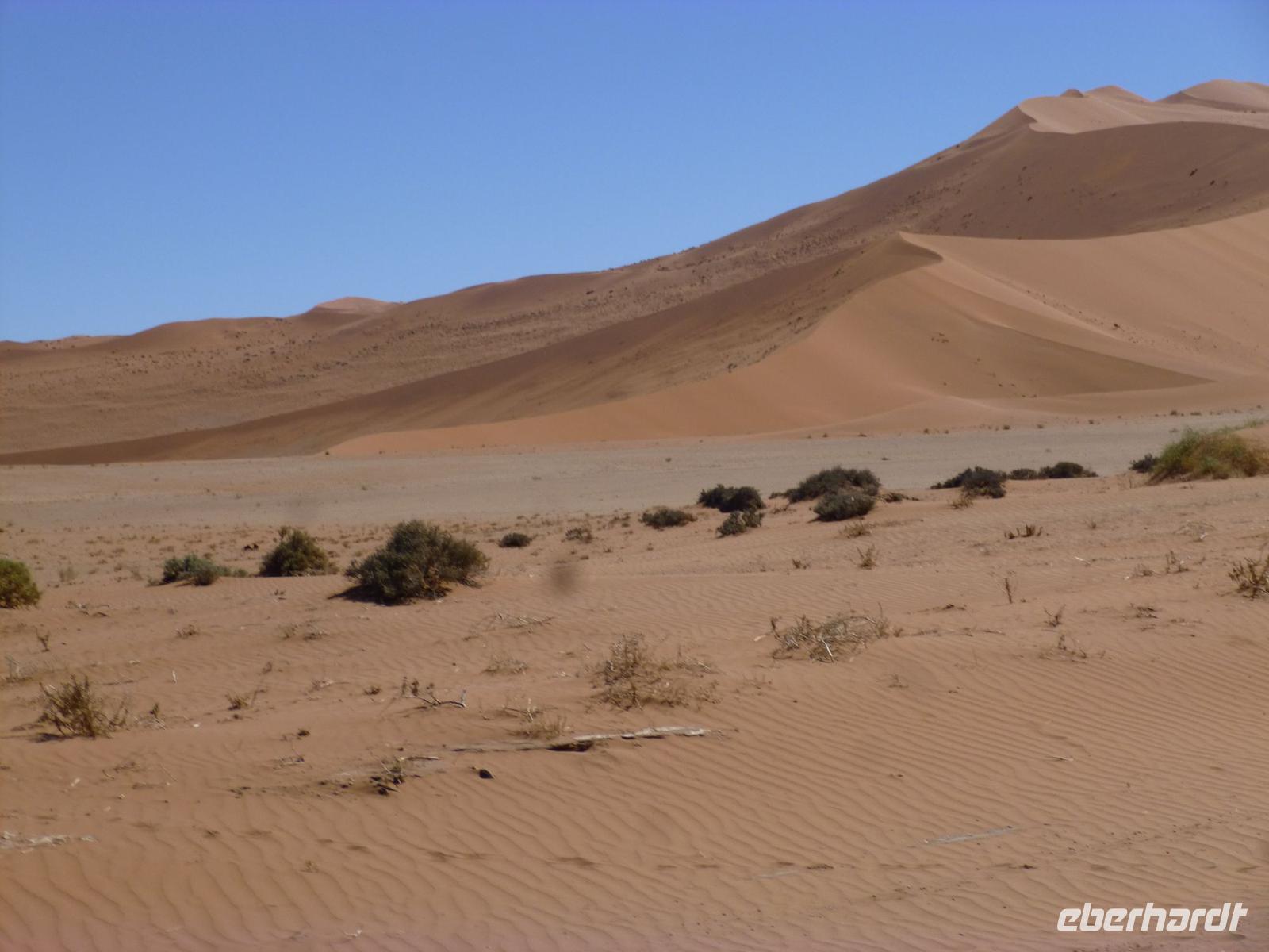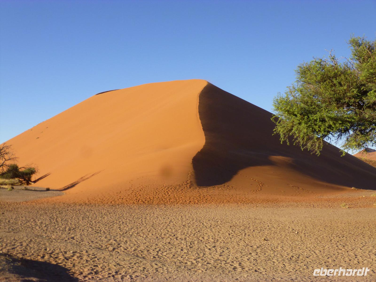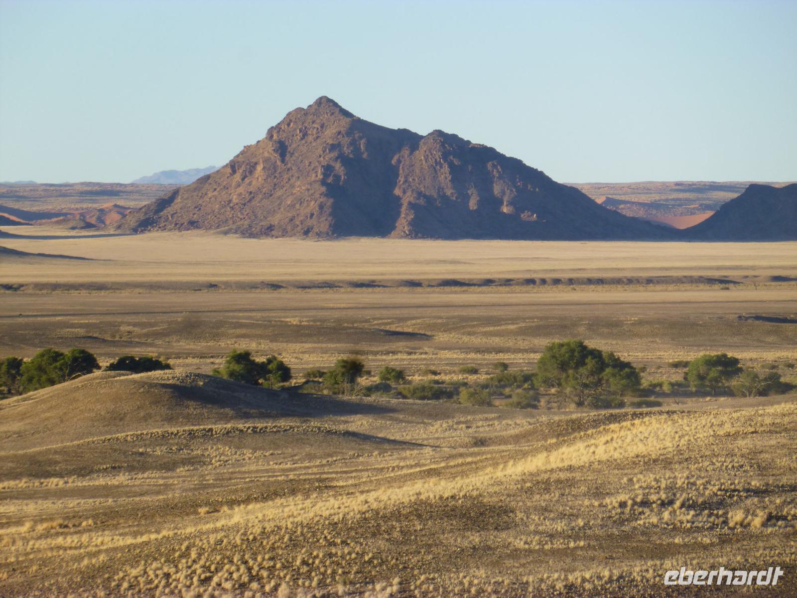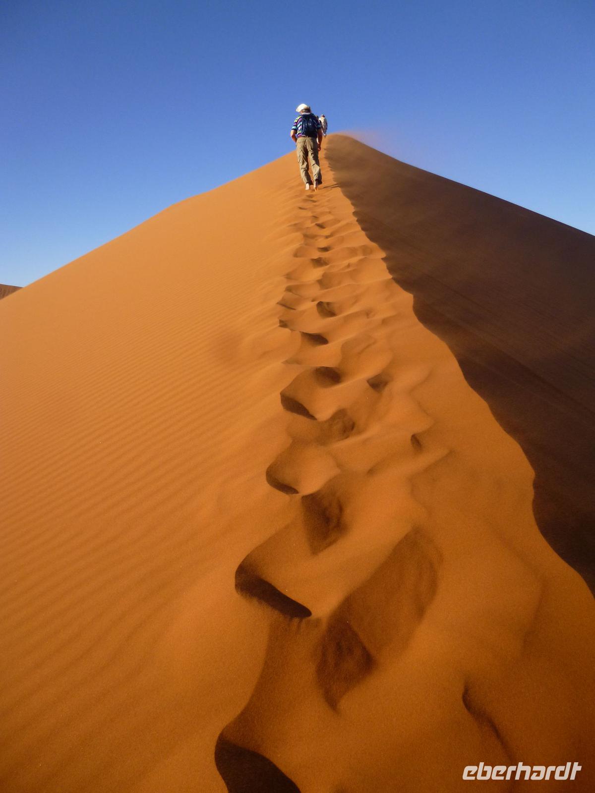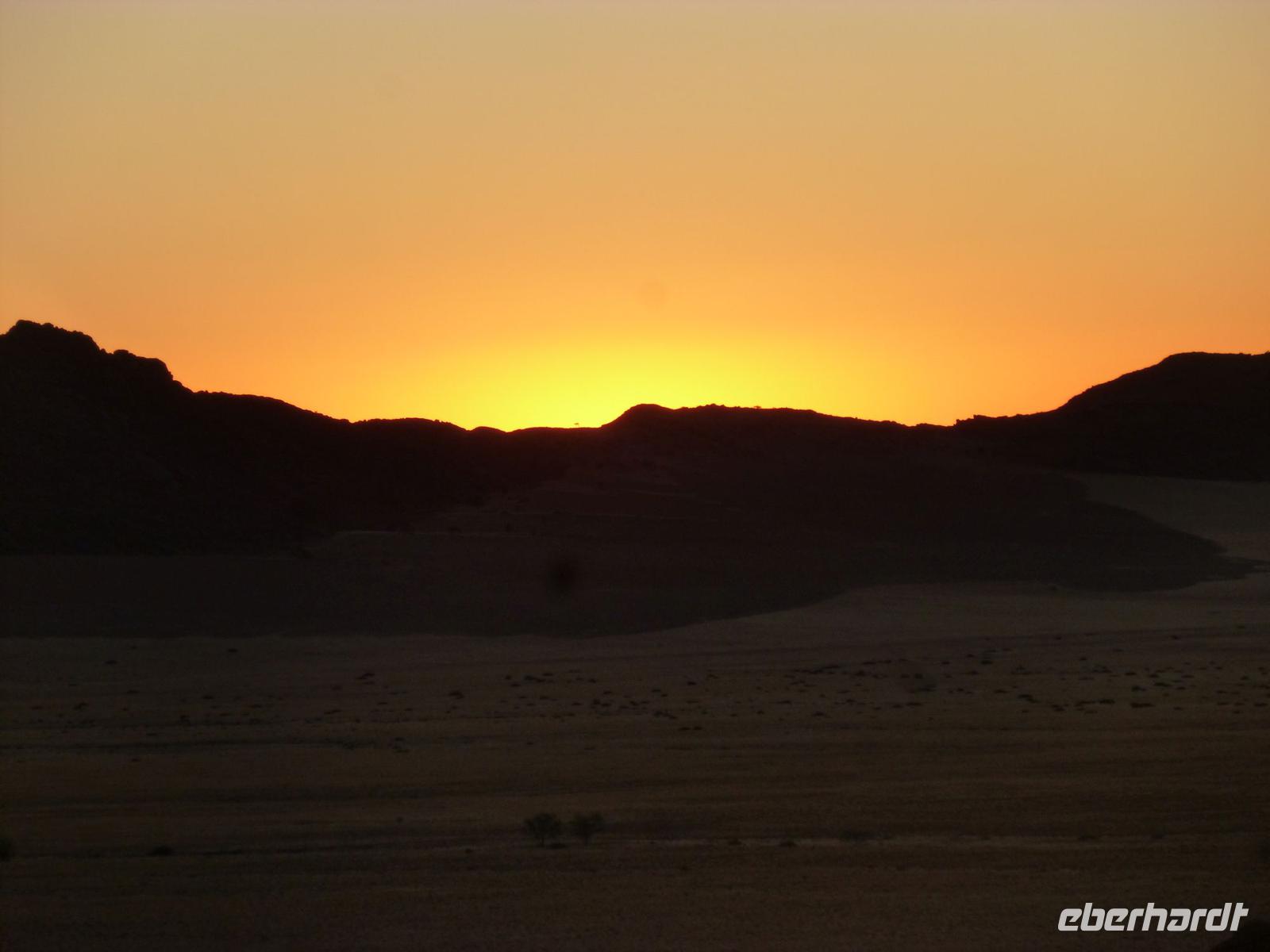 Heute mussten wir zeitig aufstehen, denn wir besuchten im Namib Naukluft Park das Sussusvlei. Die Namib ist die älteste Wüste der Welt. Leider öffnete der Nationalpark erst nach Sonnenaufgang. Wir fuhren entlang des trockenen Flusses Tsauchab und erreichten das Eingangstor. Außer den roten Sandwellen sahen wir geheimnisvolle Kreise, die Feenkreise. Bisher gibt es noch keine Erklärung für dieses Phänomen. Die Düne 45 war unser erstes Ziel. Einige nahmen den etwas beschwerlichen Weg zum „Gipfel" der Düne in Angriff. Die Entfernung bis dahin wird immer unterschätzt und erschwert wurde er durch den Wind, der eine kräftige Brise schickte. Es bot sich ein einzigartiger Panorama über die Dünen. Jetzt war es Zeit, unser Frühstück einzunehmen. Wir saßen unterhalb der Düne mit einem Blick über die Dünenlandschaft. Nach dieser Stärkung fuhren wir zum Parkplatz, wo wir auf Geländefahrzeuge mit Allradantrieb umsteigen mussten. Nach 5 Kilometern sahen wir das Amphitheater des roten Sandgebirges von Sosussvlei. Der mächtige Dünengürtel blockiert den Fluss Tsauchab. In der Regenzeit bildet sich unterhalb der Dünen ein großer See, der viele Tiere anlockt. Doch dieses Jahr war sehr trocken. Außer einigen Vögeln waren nur noch Oryxantilopen, Namibias Wappentier zu sehen. Die Antilope ist an das heiße Wüstenklima angepasst. Sie kommt das ganze Jahr über ohne Wasser aus, da sie einen niedrigen Stoffwechsel hat, also nur wenig Nahrung und Flüssigkeit benötigt. Wir besuchen anschließend den Sesriem-Canyon. Die enge Schlucht entstand, als der Tsauchab-Fluss sich einen Weg durch den Kalkstein bahnte. Wir verlassen den Park und fahren entlang der Naukluft-Berge. Diese sind ein sicheres Rückzuggebiet für Tiere, da es dort ganzjährig gefüllte Felsenpools gibt. Wir erreichen die Namib-Naukluft-Lodge. Nach einem kleinen Anstieg in die Felsen konnten wir einen sehr schönen Sonnenuntergang bewundern. Bei einem guten Grillbuffet ließen wir den Tag ausklingen.