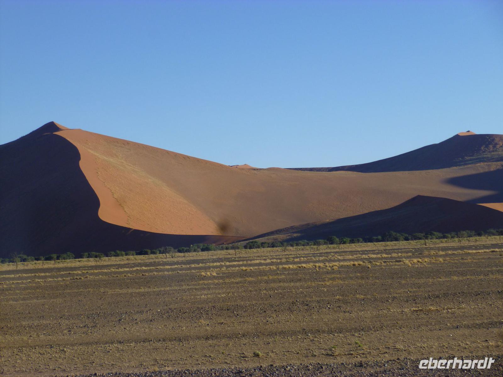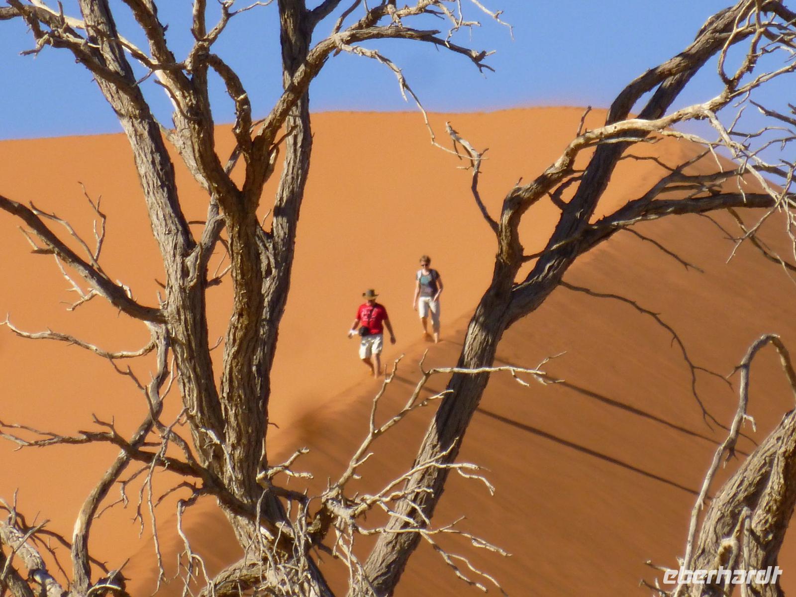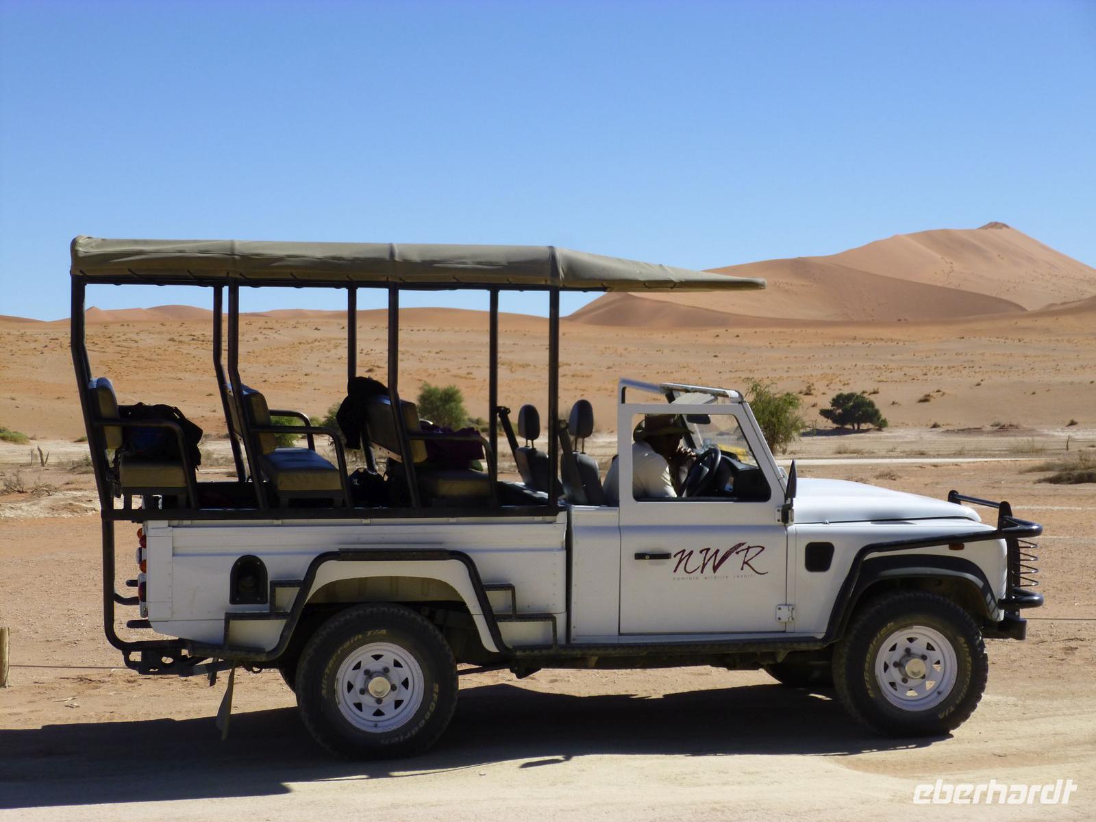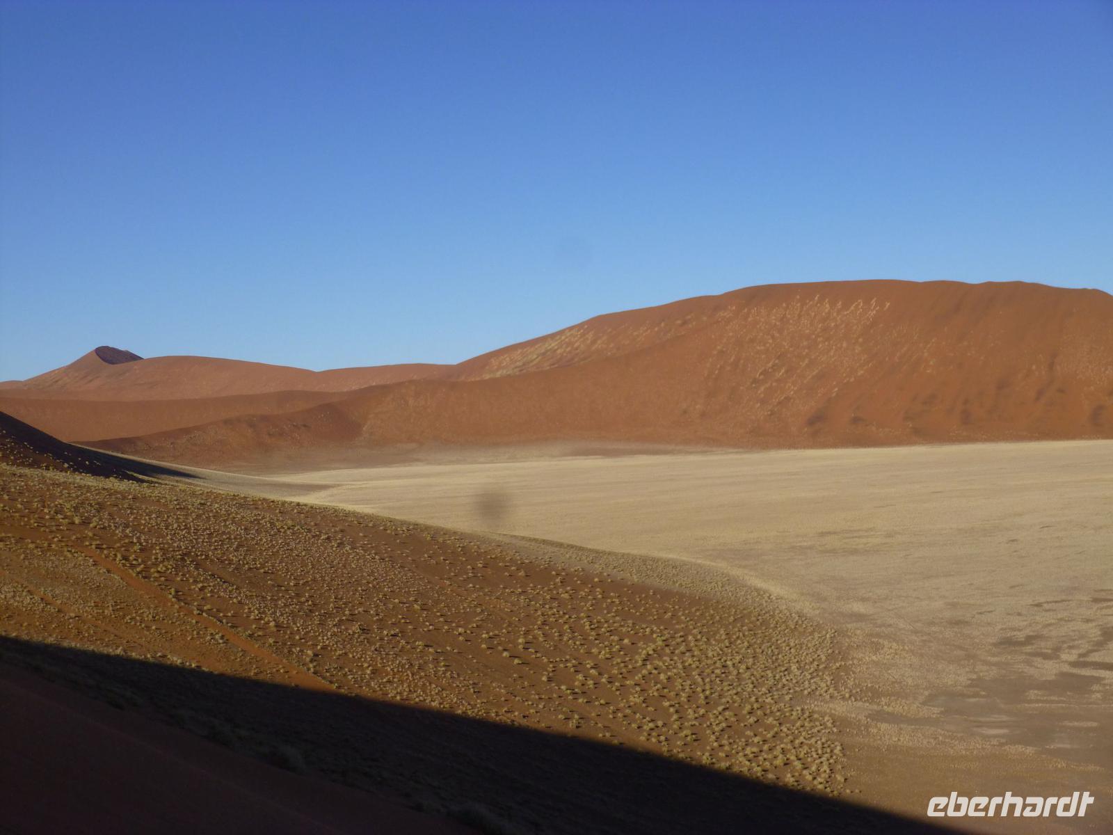 Heute mussten wir zeitig aufstehen, denn wir besuchten im Namib Naukluft Park das Sussusvlei. Die Namib ist die älteste Wüste der Welt. Leider öffnete der Nationalpark erst nach Sonnenaufgang. Wir fuhren entlang des trockenen Flusses Tsauchab und erreichten das Eingangstor. Außer den roten Sandwellen sahen wir geheimnisvolle Kreise, die Feenkreise. Bisher gibt es noch keine Erklärung für dieses Phänomen. Die Düne 45 war unser erstes Ziel. Einige nahmen den etwas beschwerlichen Weg zum „Gipfel" der Düne in Angriff. Die Entfernung bis dahin wird immer unterschätzt und erschwert wurde er durch den Wind, der eine kräftige Brise schickte. Es bot sich ein einzigartiger Panorama über die Dünen. Jetzt war es Zeit, unser Frühstück einzunehmen. Wir saßen unterhalb der Düne mit einem Blick über die Dünenlandschaft. Nach dieser Stärkung fuhren wir zum Parkplatz, wo wir auf Geländefahrzeuge mit Allradantrieb umsteigen mussten. Nach 5 Kilometern sahen wir das Amphitheater des roten Sandgebirges von Sosussvlei. Der mächtige Dünengürtel blockiert den Fluss Tsauchab. In der Regenzeit bildet sich unterhalb der Dünen ein großer See, der viele Tiere anlockt. Doch dieses Jahr war sehr trocken. Außer einigen Vögeln waren nur noch Oryxantilopen, Namibias Wappentier zu sehen. Die Antilope ist an das heiße Wüstenklima angepasst. Sie kommt das ganze Jahr über ohne Wasser aus, da sie einen niedrigen Stoffwechsel hat, also nur wenig Nahrung und Flüssigkeit benötigt. Wir besuchen anschließend den Sesriem-Canyon. Die enge Schlucht entstand, als der Tsauchab-Fluss sich einen Weg durch den Kalkstein bahnte. Wir verlassen den Park und fahren entlang der Naukluft-Berge. Diese sind ein sicheres Rückzuggebiet für Tiere, da es dort ganzjährig gefüllte Felsenpools gibt. Wir erreichen die Namib-Naukluft-Lodge. Nach einem kleinen Anstieg in die Felsen konnten wir einen sehr schönen Sonnenuntergang bewundern. Bei einem guten Grillbuffet ließen wir den Tag ausklingen.