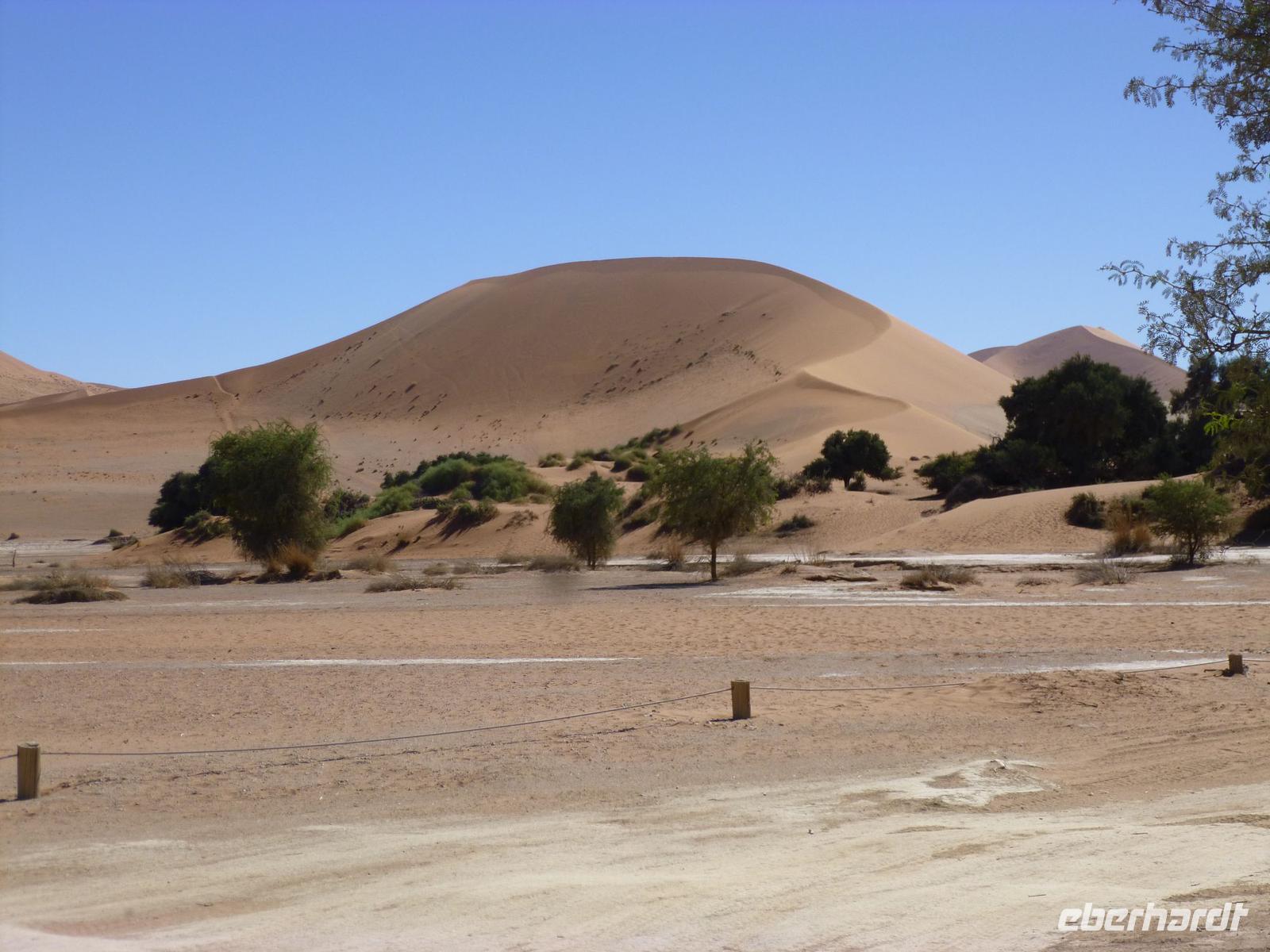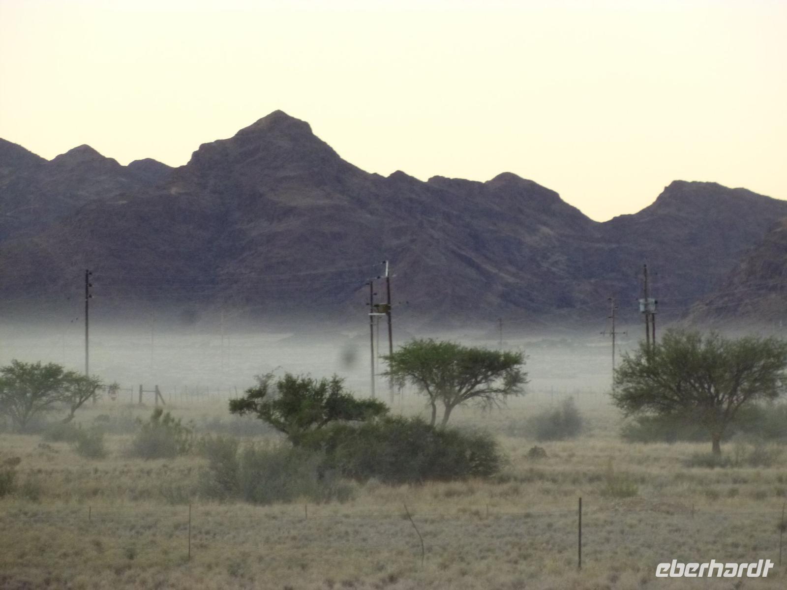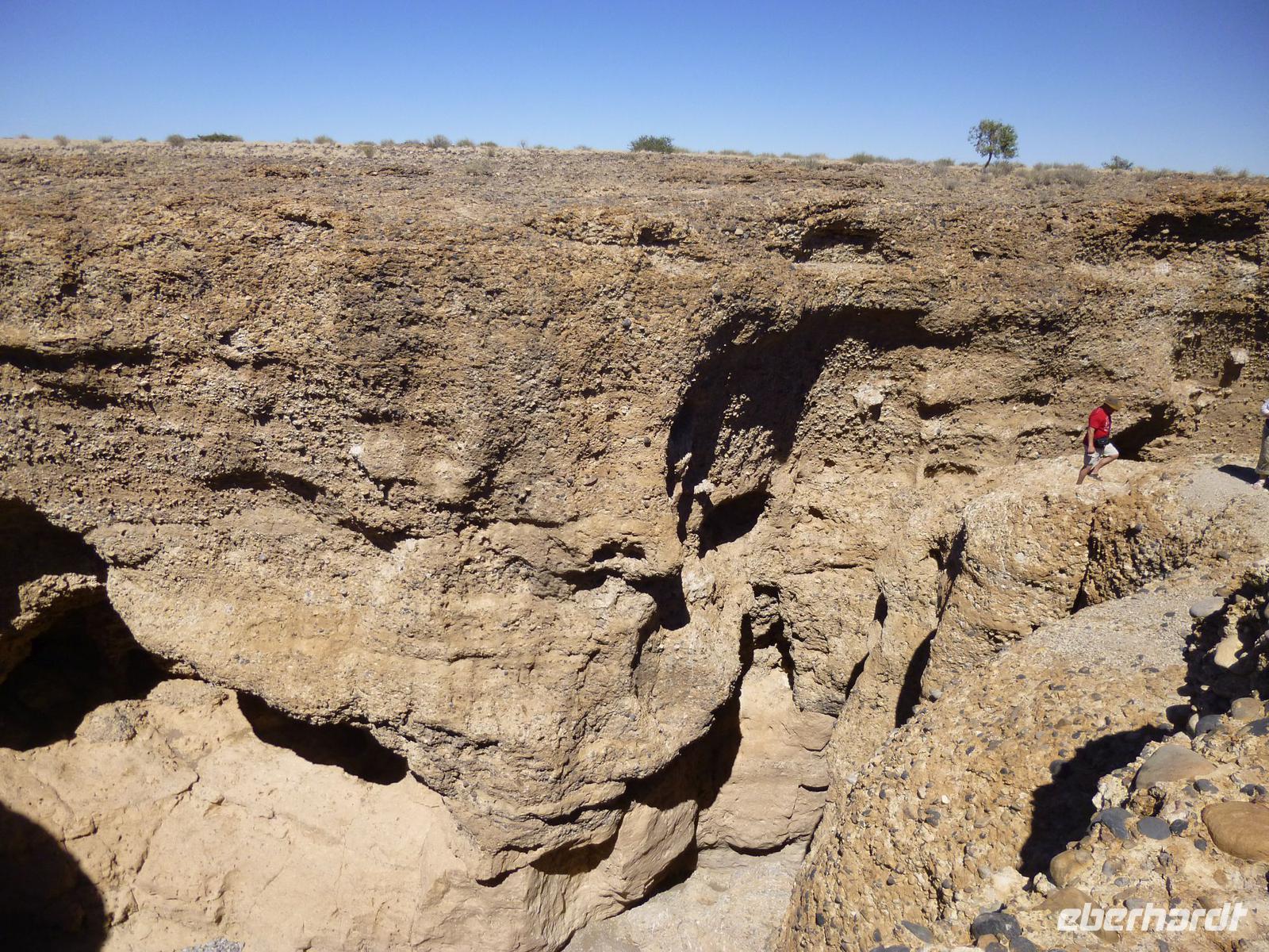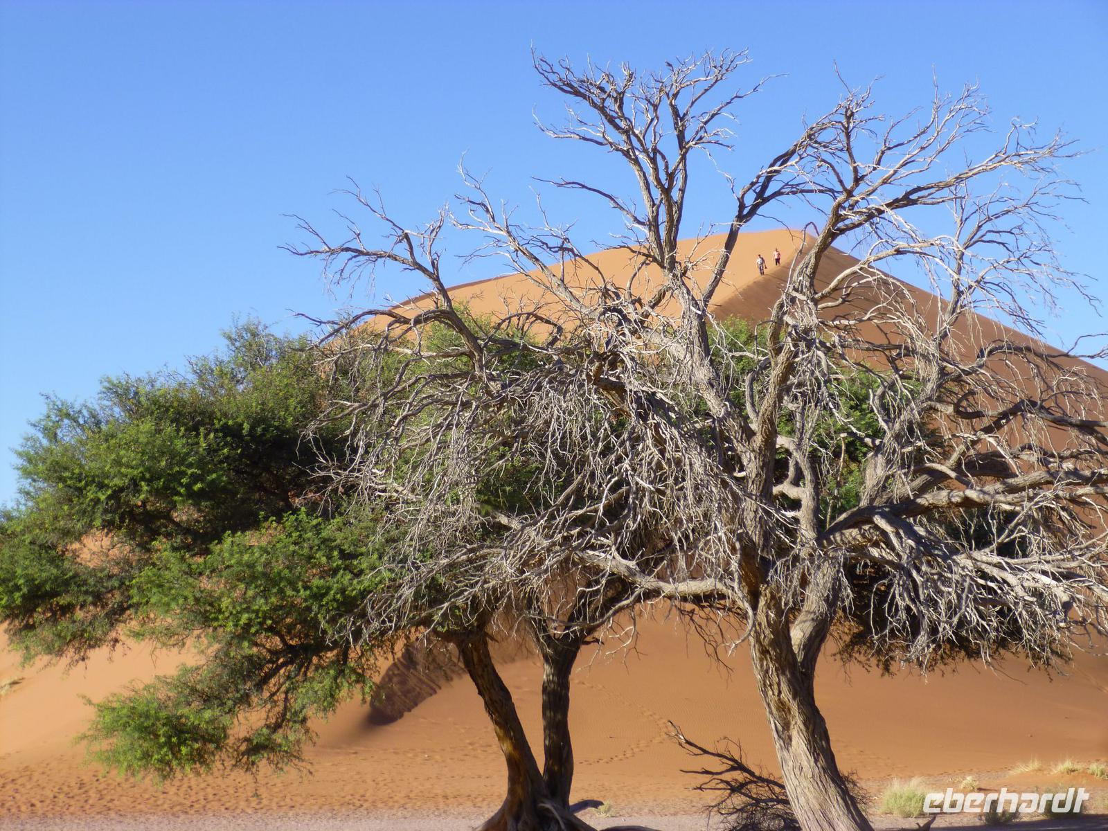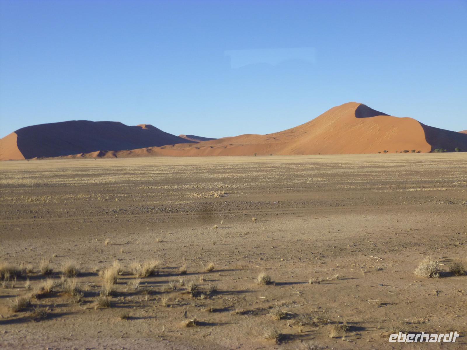 Heute mussten wir zeitig aufstehen, denn wir besuchten im Namib Naukluft Park das Sussusvlei. Die Namib ist die älteste Wüste der Welt. Leider öffnete der Nationalpark erst nach Sonnenaufgang. Wir fuhren entlang des trockenen Flusses Tsauchab und erreichten das Eingangstor. Außer den roten Sandwellen sahen wir geheimnisvolle Kreise, die Feenkreise. Bisher gibt es noch keine Erklärung für dieses Phänomen. Die Düne 45 war unser erstes Ziel. Einige nahmen den etwas beschwerlichen Weg zum „Gipfel" der Düne in Angriff. Die Entfernung bis dahin wird immer unterschätzt und erschwert wurde er durch den Wind, der eine kräftige Brise schickte. Es bot sich ein einzigartiger Panorama über die Dünen. Jetzt war es Zeit, unser Frühstück einzunehmen. Wir saßen unterhalb der Düne mit einem Blick über die Dünenlandschaft. Nach dieser Stärkung fuhren wir zum Parkplatz, wo wir auf Geländefahrzeuge mit Allradantrieb umsteigen mussten. Nach 5 Kilometern sahen wir das Amphitheater des roten Sandgebirges von Sosussvlei. Der mächtige Dünengürtel blockiert den Fluss Tsauchab. In der Regenzeit bildet sich unterhalb der Dünen ein großer See, der viele Tiere anlockt. Doch dieses Jahr war sehr trocken. Außer einigen Vögeln waren nur noch Oryxantilopen, Namibias Wappentier zu sehen. Die Antilope ist an das heiße Wüstenklima angepasst. Sie kommt das ganze Jahr über ohne Wasser aus, da sie einen niedrigen Stoffwechsel hat, also nur wenig Nahrung und Flüssigkeit benötigt. Wir besuchen anschließend den Sesriem-Canyon. Die enge Schlucht entstand, als der Tsauchab-Fluss sich einen Weg durch den Kalkstein bahnte. Wir verlassen den Park und fahren entlang der Naukluft-Berge. Diese sind ein sicheres Rückzuggebiet für Tiere, da es dort ganzjährig gefüllte Felsenpools gibt. Wir erreichen die Namib-Naukluft-Lodge. Nach einem kleinen Anstieg in die Felsen konnten wir einen sehr schönen Sonnenuntergang bewundern. Bei einem guten Grillbuffet ließen wir den Tag ausklingen.
