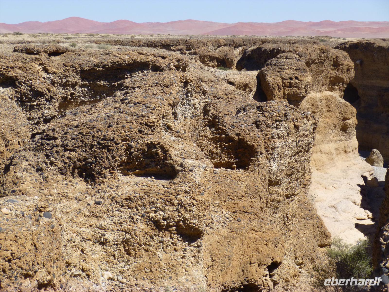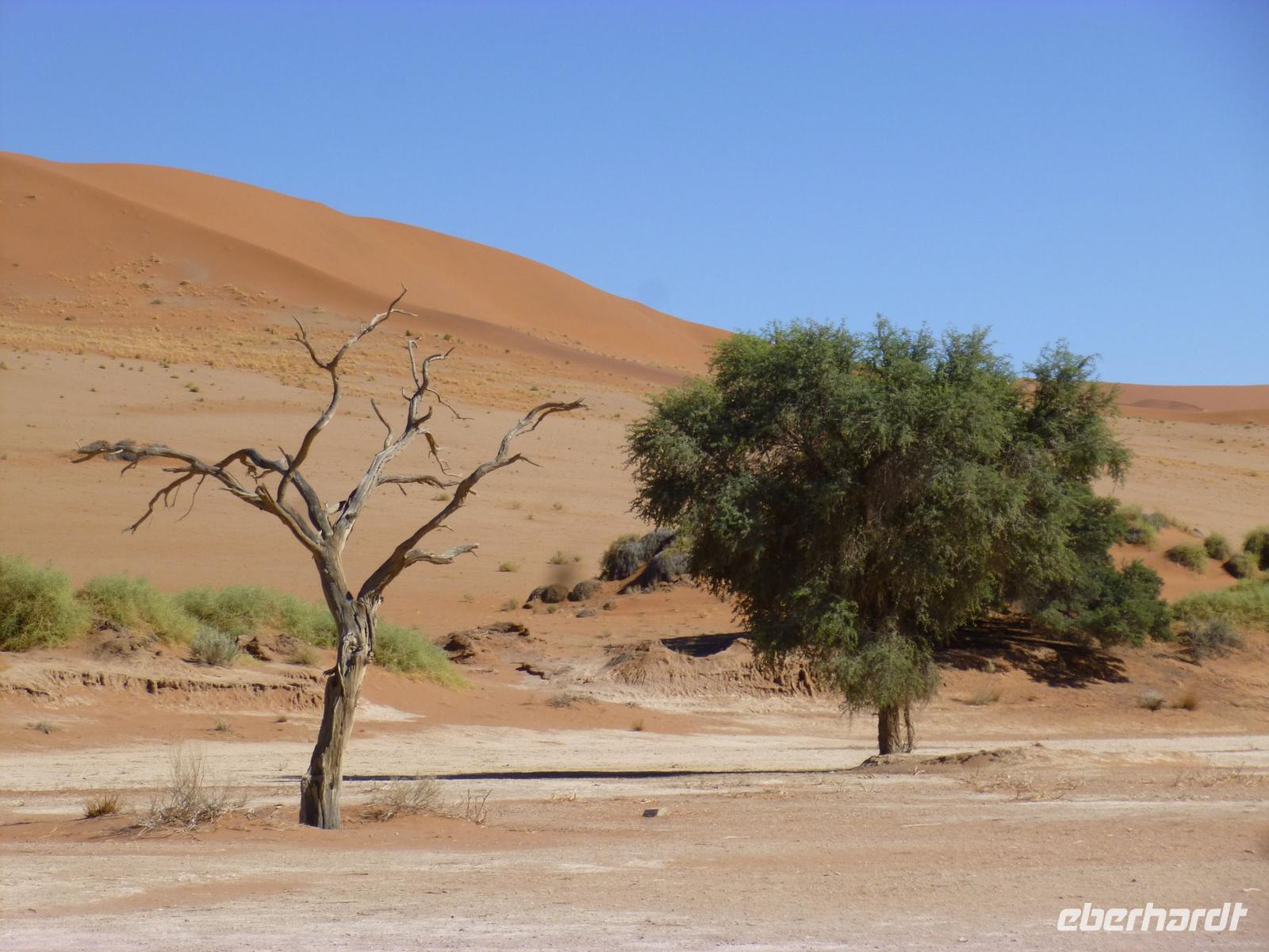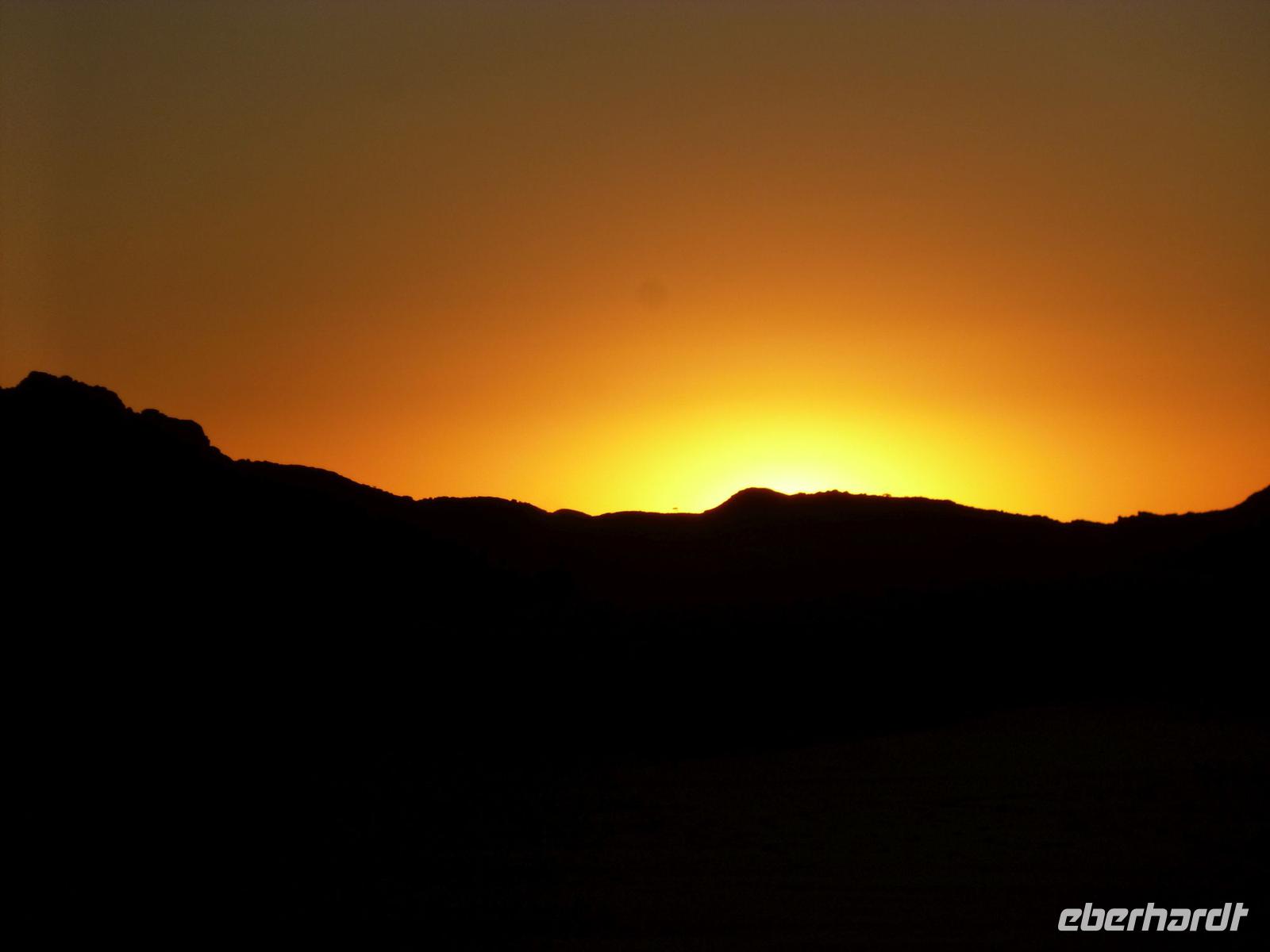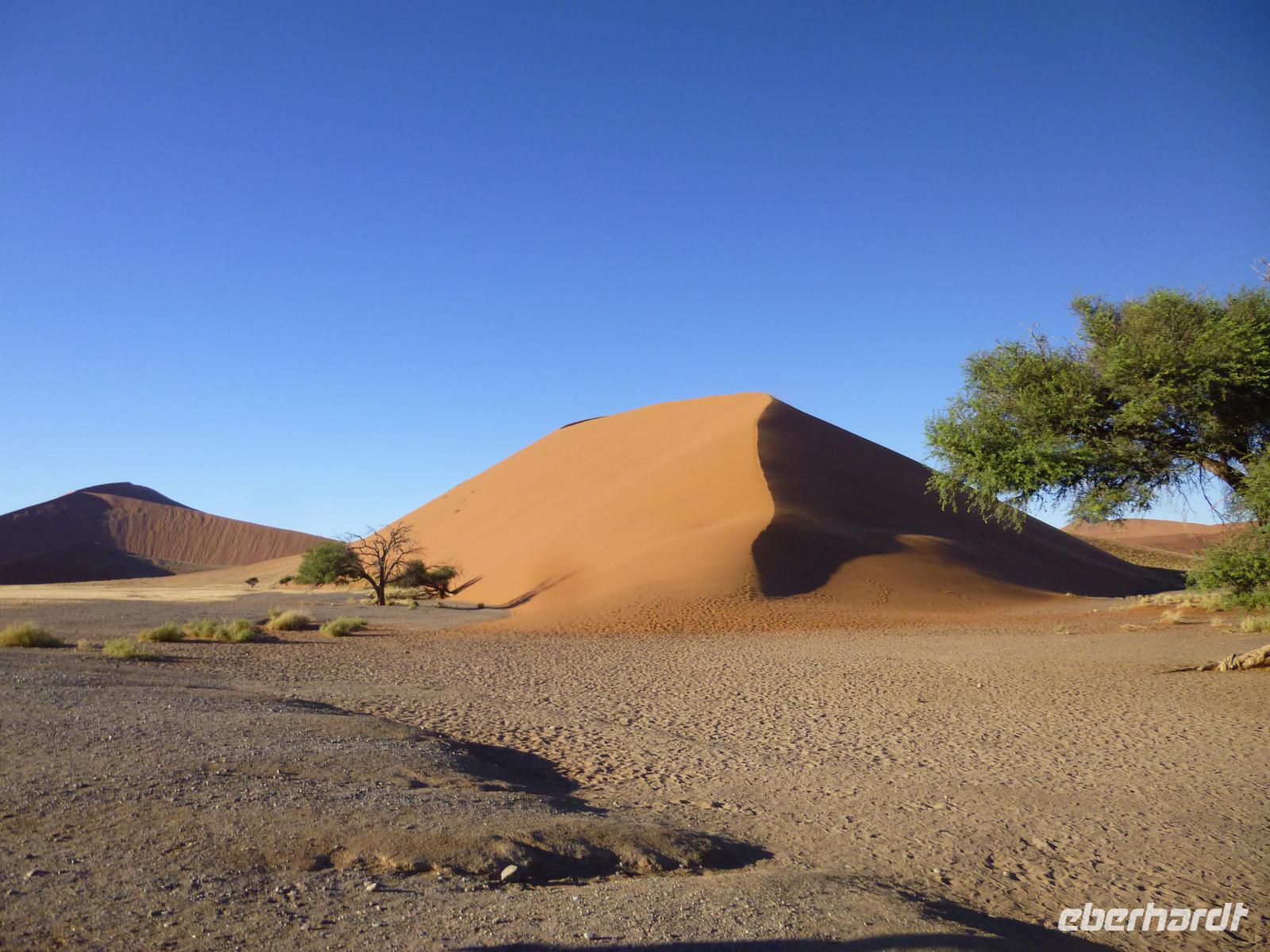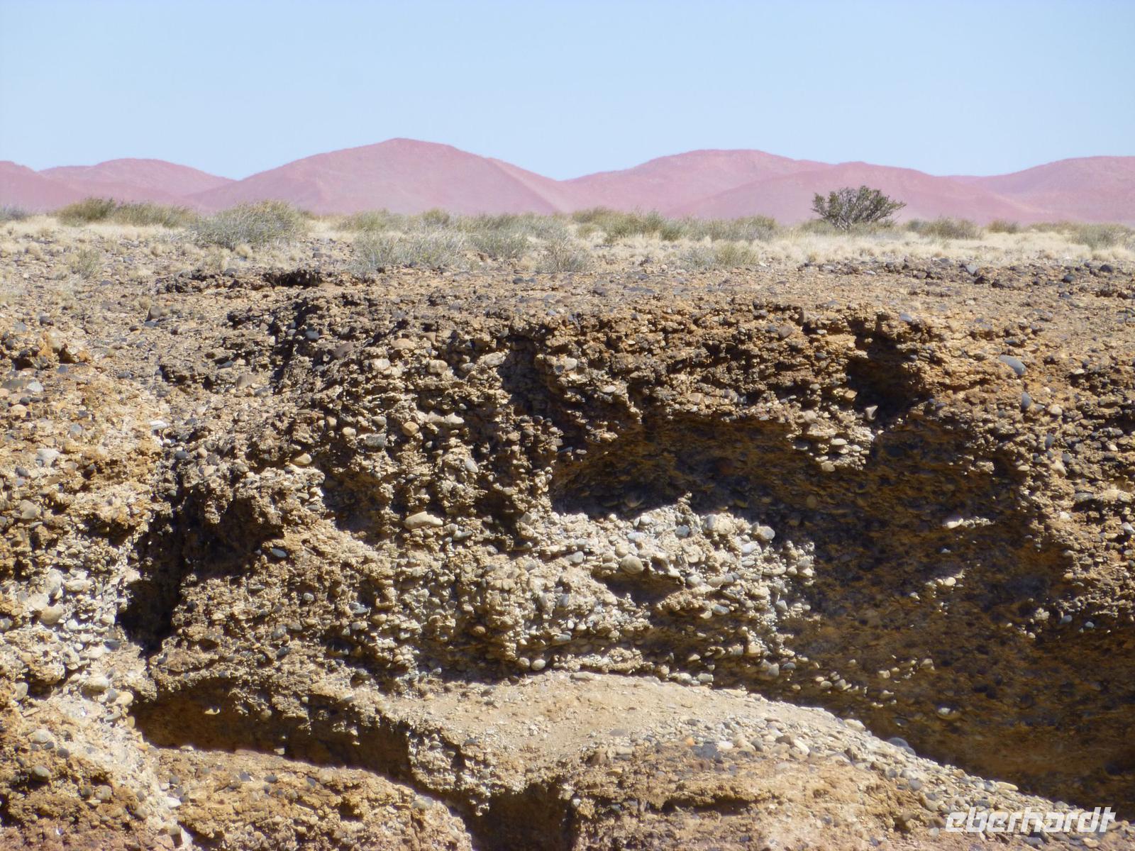 Heute mussten wir zeitig aufstehen, denn wir besuchten im Namib Naukluft Park das Sussusvlei. Die Namib ist die älteste Wüste der Welt. Leider öffnete der Nationalpark erst nach Sonnenaufgang. Wir fuhren entlang des trockenen Flusses Tsauchab und erreichten das Eingangstor. Außer den roten Sandwellen sahen wir geheimnisvolle Kreise, die Feenkreise. Bisher gibt es noch keine Erklärung für dieses Phänomen. Die Düne 45 war unser erstes Ziel. Einige nahmen den etwas beschwerlichen Weg zum „Gipfel" der Düne in Angriff. Die Entfernung bis dahin wird immer unterschätzt und erschwert wurde er durch den Wind, der eine kräftige Brise schickte. Es bot sich ein einzigartiger Panorama über die Dünen. Jetzt war es Zeit, unser Frühstück einzunehmen. Wir saßen unterhalb der Düne mit einem Blick über die Dünenlandschaft. Nach dieser Stärkung fuhren wir zum Parkplatz, wo wir auf Geländefahrzeuge mit Allradantrieb umsteigen mussten. Nach 5 Kilometern sahen wir das Amphitheater des roten Sandgebirges von Sosussvlei. Der mächtige Dünengürtel blockiert den Fluss Tsauchab. In der Regenzeit bildet sich unterhalb der Dünen ein großer See, der viele Tiere anlockt. Doch dieses Jahr war sehr trocken. Außer einigen Vögeln waren nur noch Oryxantilopen, Namibias Wappentier zu sehen. Die Antilope ist an das heiße Wüstenklima angepasst. Sie kommt das ganze Jahr über ohne Wasser aus, da sie einen niedrigen Stoffwechsel hat, also nur wenig Nahrung und Flüssigkeit benötigt. Wir besuchen anschließend den Sesriem-Canyon. Die enge Schlucht entstand, als der Tsauchab-Fluss sich einen Weg durch den Kalkstein bahnte. Wir verlassen den Park und fahren entlang der Naukluft-Berge. Diese sind ein sicheres Rückzuggebiet für Tiere, da es dort ganzjährig gefüllte Felsenpools gibt. Wir erreichen die Namib-Naukluft-Lodge. Nach einem kleinen Anstieg in die Felsen konnten wir einen sehr schönen Sonnenuntergang bewundern. Bei einem guten Grillbuffet ließen wir den Tag ausklingen.