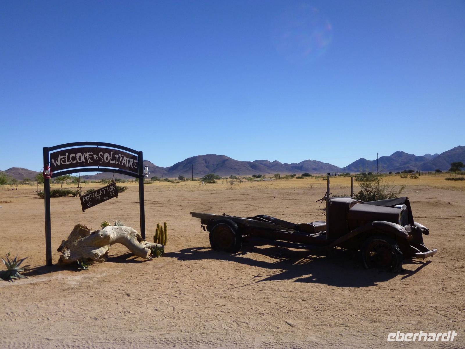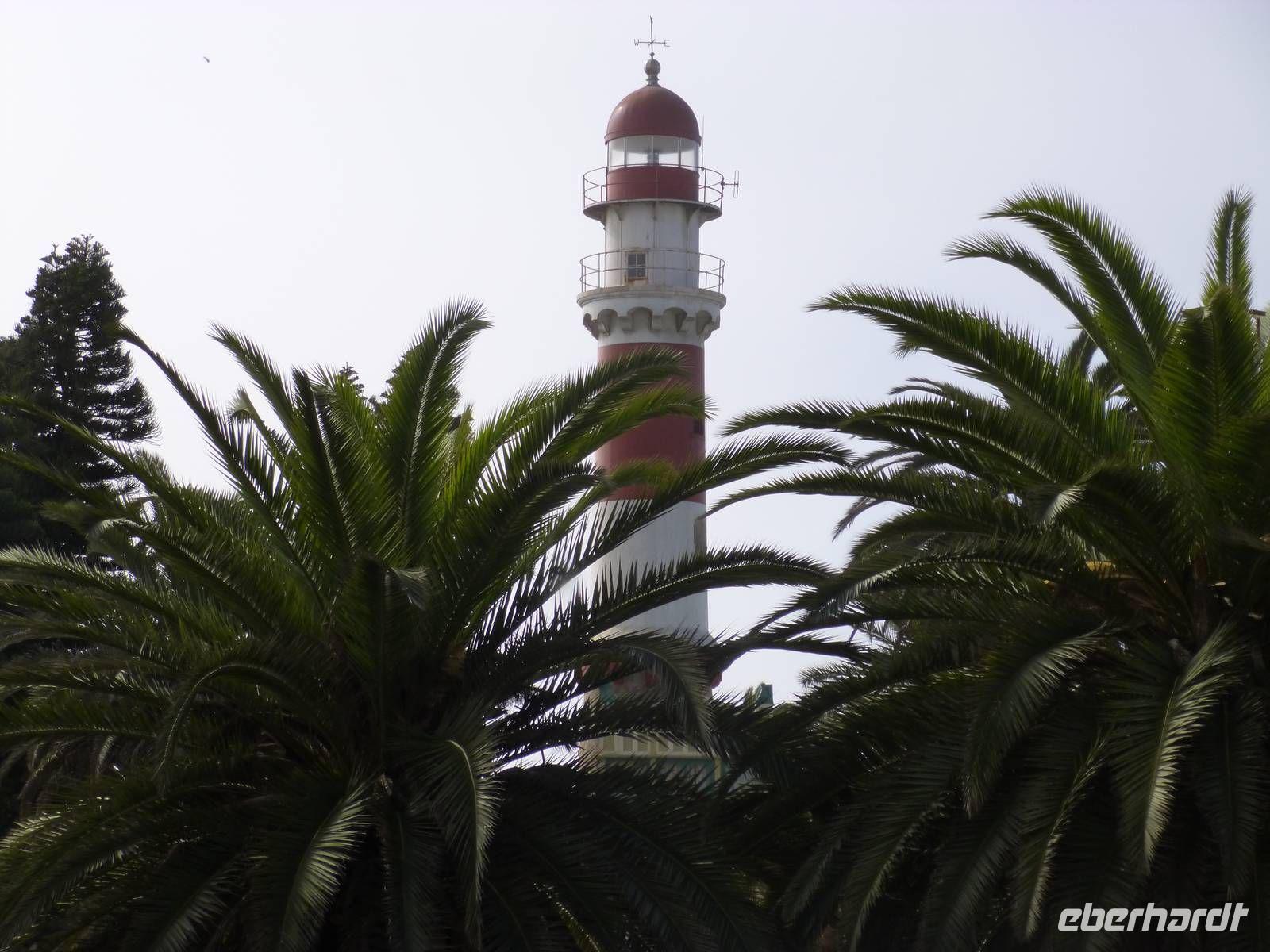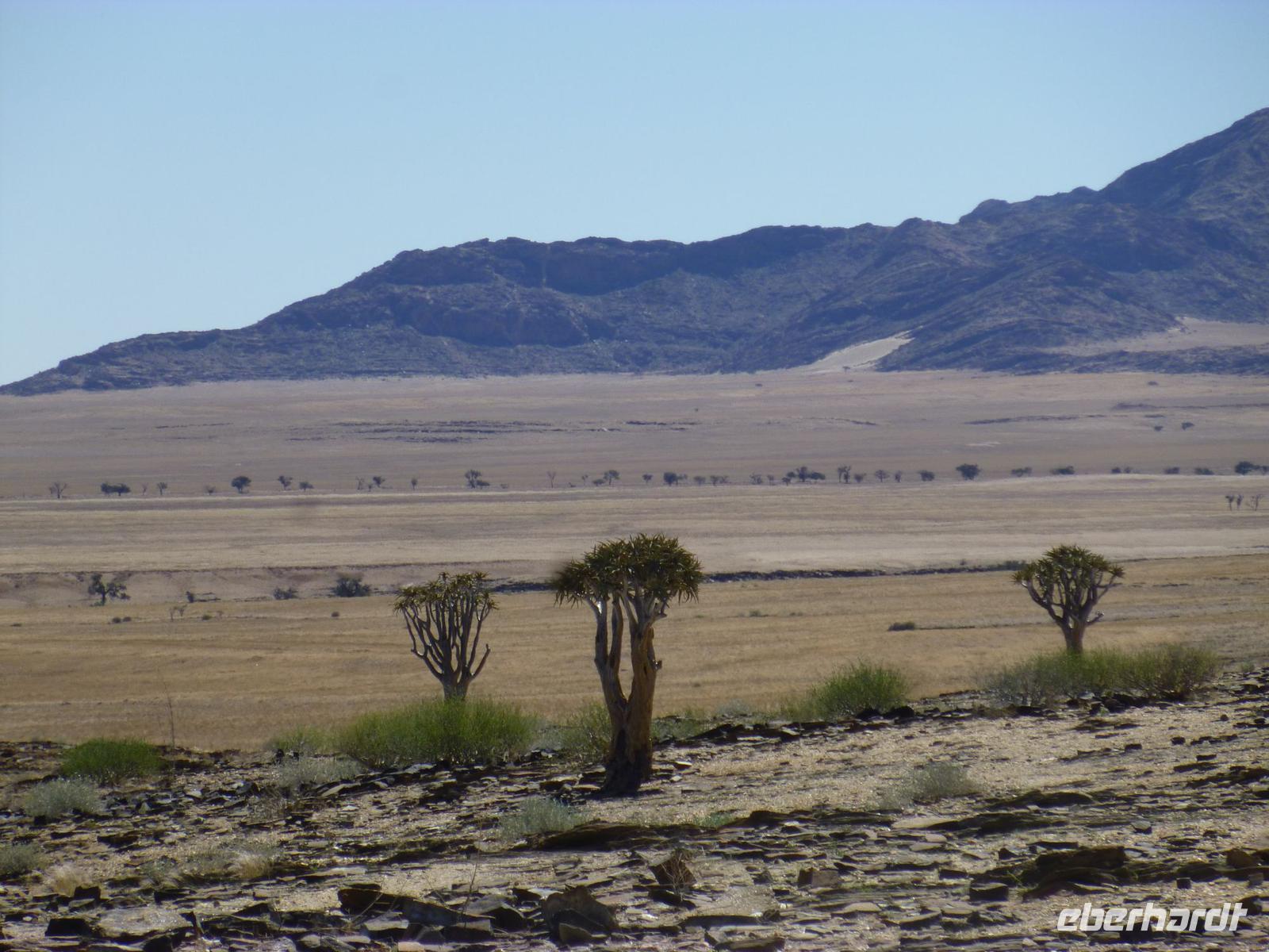Bevor wir unsere Lodge verlassen, sehen wir noch einen Köcherbaum. Er ist allerdings kein Baum, sondern eine Aloen-Art. Früher wurden aus den Ästen Pfeilköcher geschnitzt. Die Bäume können über 200 Jahre alt werden und können eine Höhe von 8 Metern erreichen. Schon von weitem sehen wir Solitair. Neben alten Autofracks, einer Tankstelle und einer Lodge ist Solitair besonders für seinen frischen Apfelkuchen bekannt. Auch wenn man keinen Hunger hat, kauft sich jeder eine Kostprobe. Wir durchfahren den Kuiseb-Pass, ein Flussbett. Dahinter befindet sich der Kuiseb-Canyon. Bekannt wurde der Canyon durch die beiden deutschen Geologen Henno Martin und Hermann Korn, die während des Zweiten Weltkrieges dahin flüchteten, um dem Krieg zu entgehen. Sie lebten in der Namib und dem Canyon über 2 Jahre unter primitivsten Bedingungen. Verewigt wurden ihre Erlebnisse in dem Buch „Wenn es Krieg gibt, gehe ich in die Wüste". Die weite Strecke geht immer gerade aus und wirkt trostlos. Endlich erreichen wir die Atlantikküste und Walvis Bay, den einzigen Tiefseehafen Namibias. Wir spazieren entlang der Promenade und beobachten die Flamingos. Entlang der Küste erreichten wir Swakopmund und unternahmen eine Stadtrundfahrt. Da unser Hotel direkt in der Stadt lag, unternahmen wir noch einen Einkaufsbummel und erlebten an der Landungsbrücke einen schönen Sonnenuntergang.