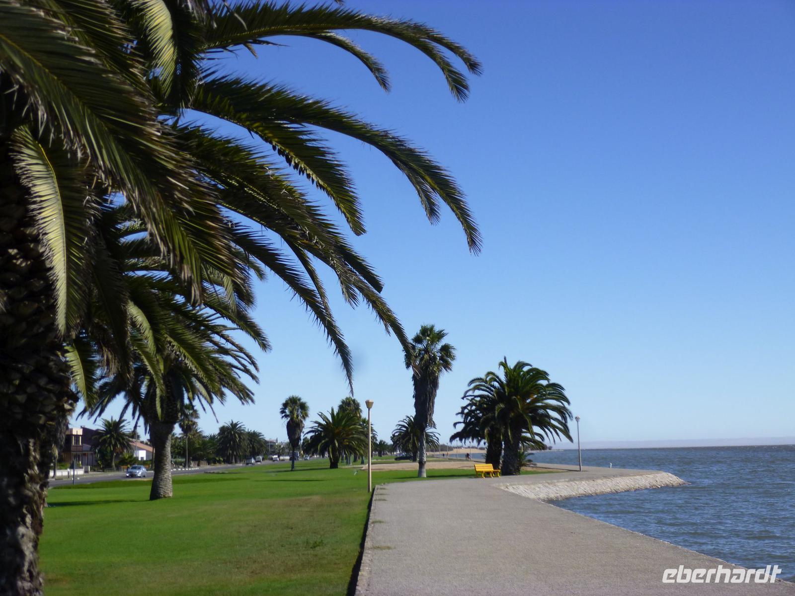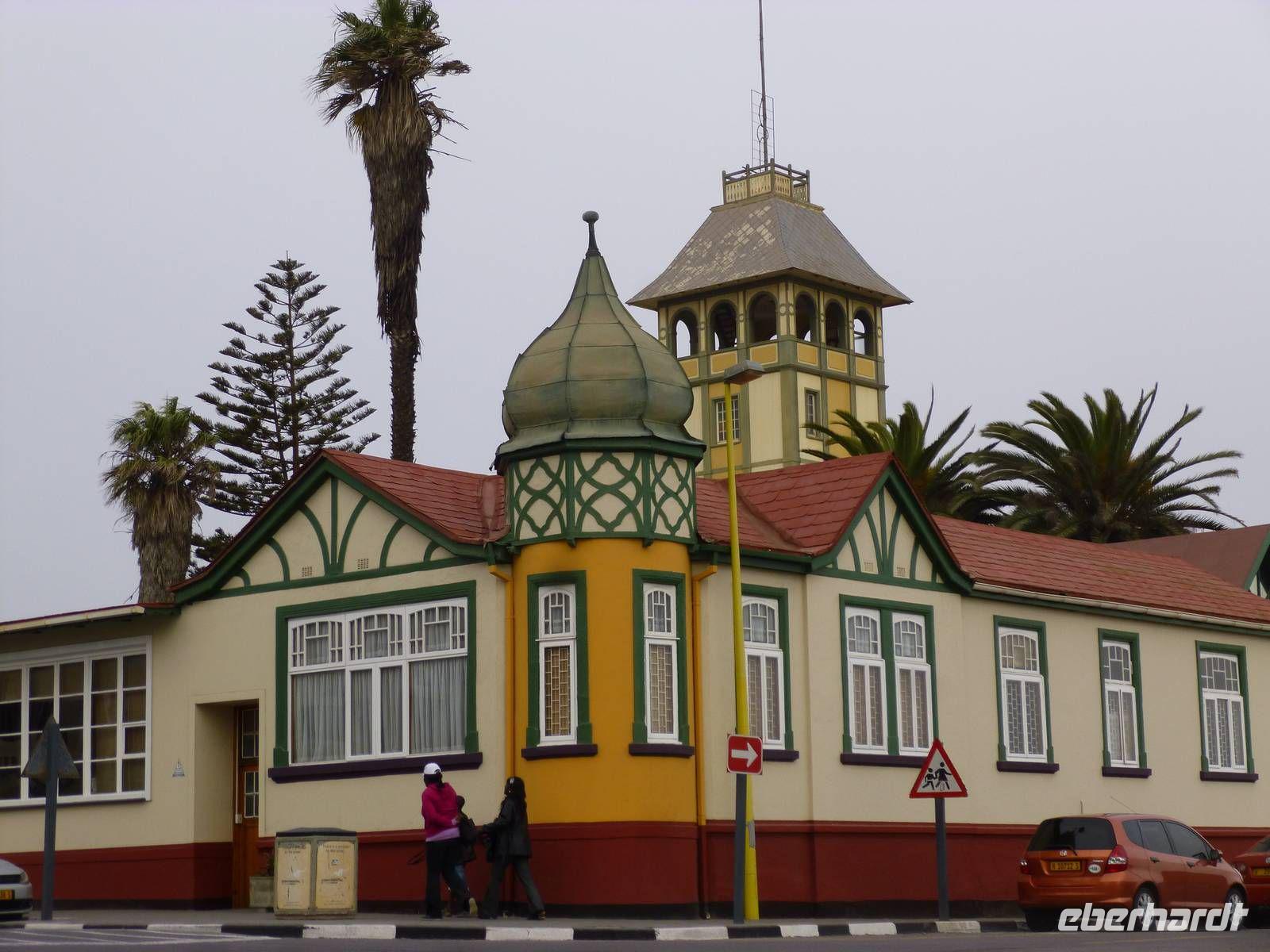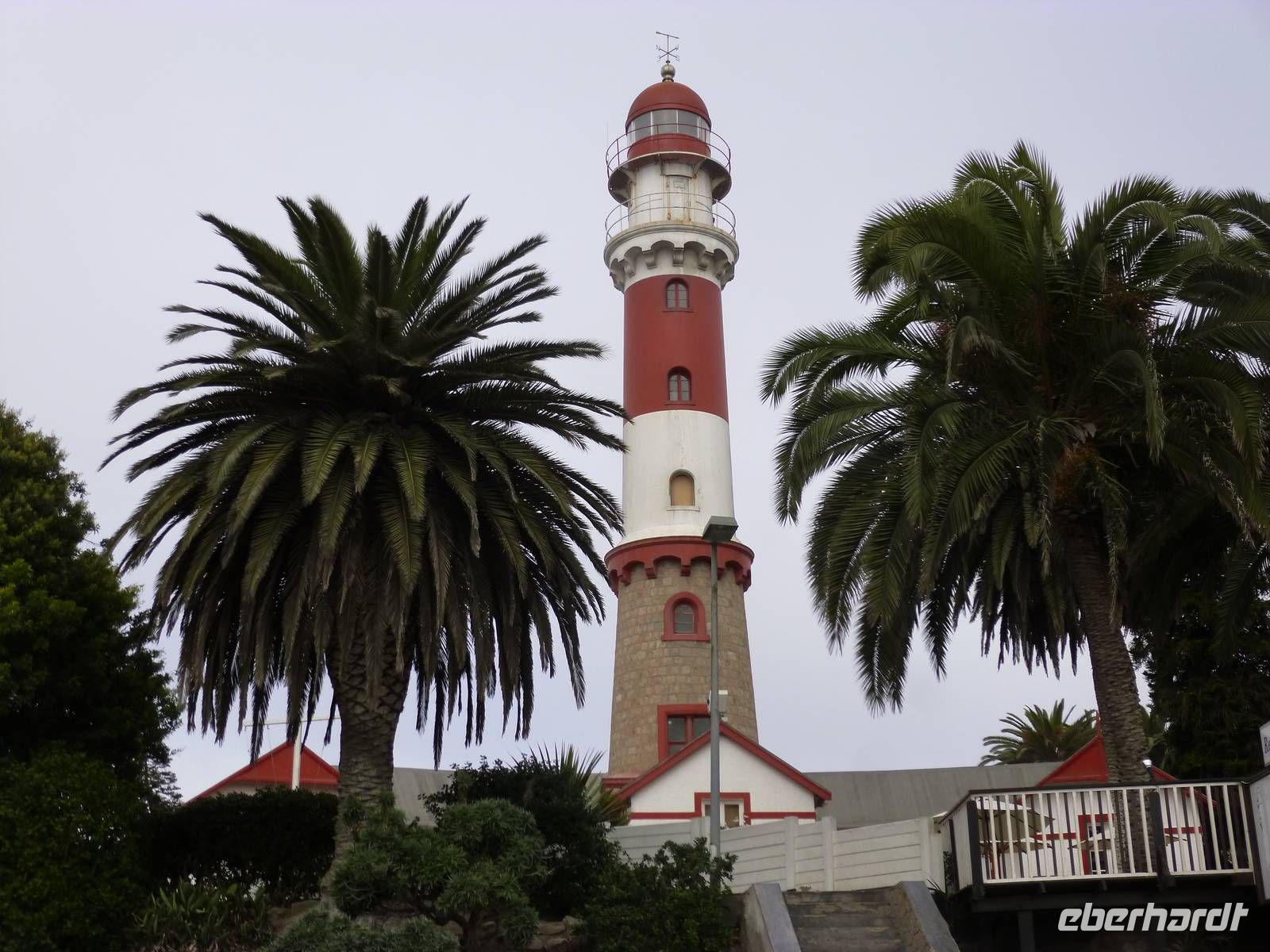 Bevor wir unsere Lodge verlassen, sehen wir noch einen Köcherbaum. Er ist allerdings kein Baum, sondern eine Aloen-Art. Früher wurden aus den Ästen Pfeilköcher geschnitzt. Die Bäume können über 200 Jahre alt werden und können eine Höhe von 8 Metern erreichen. Schon von weitem sehen wir Solitair. Neben alten Autofracks, einer Tankstelle und einer Lodge ist Solitair besonders für seinen frischen Apfelkuchen bekannt. Auch wenn man keinen Hunger hat, kauft sich jeder eine Kostprobe. Wir durchfahren den Kuiseb-Pass, ein Flussbett. Dahinter befindet sich der Kuiseb-Canyon. Bekannt wurde der Canyon durch die beiden deutschen Geologen Henno Martin und Hermann Korn, die während des Zweiten Weltkrieges dahin flüchteten, um dem Krieg zu entgehen. Sie lebten in der Namib und dem Canyon über 2 Jahre unter primitivsten Bedingungen. Verewigt wurden ihre Erlebnisse in dem Buch „Wenn es Krieg gibt, gehe ich in die Wüste". Die weite Strecke geht immer gerade aus und wirkt trostlos. Endlich erreichen wir die Atlantikküste und Walvis Bay, den einzigen Tiefseehafen Namibias. Wir spazieren entlang der Promenade und beobachten die Flamingos. Entlang der Küste erreichten wir Swakopmund und unternahmen eine Stadtrundfahrt. Da unser Hotel direkt in der Stadt lag, unternahmen wir noch einen Einkaufsbummel und erlebten an der Landungsbrücke einen schönen Sonnenuntergang.
