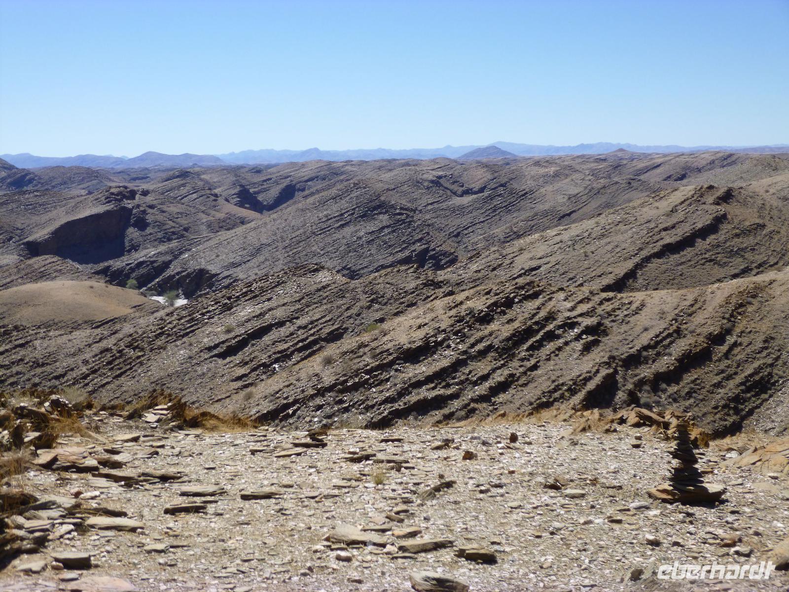 Schon von weitem sahen wir das markante Spitzkoppenmassiv, das "Matterhorn Namibias". Die Granitformationen zwischen der Kleinen Spitzkoppe (1580m) und der Großen Spitzkoppe (1728m) gehören zur Erongo-Bergregion und sind sehr verwittert. Während einer kleinen Wanderung bestaunen wir die skurrilen Felsformationen - wie riesige Kugeln und Brücken.