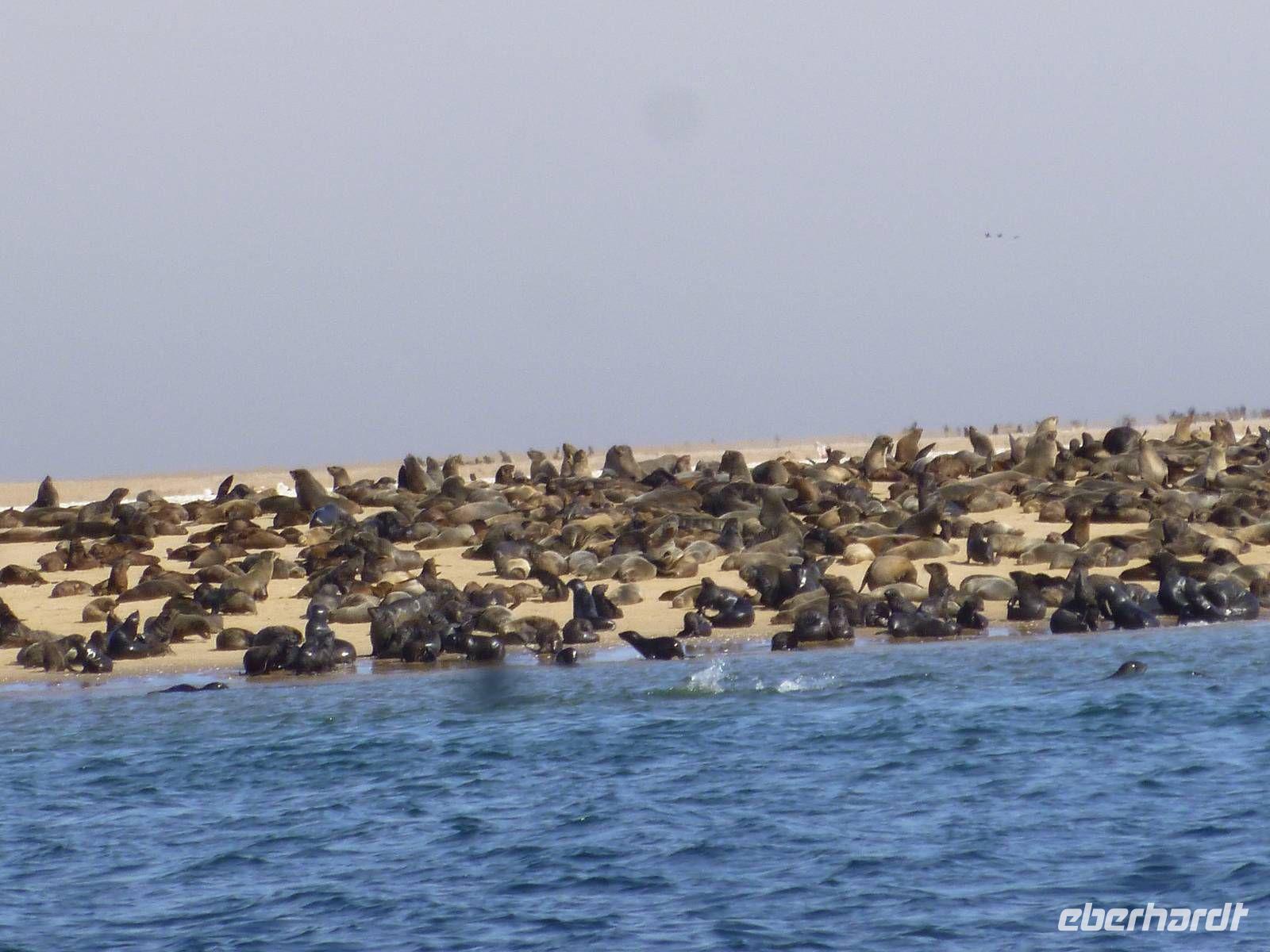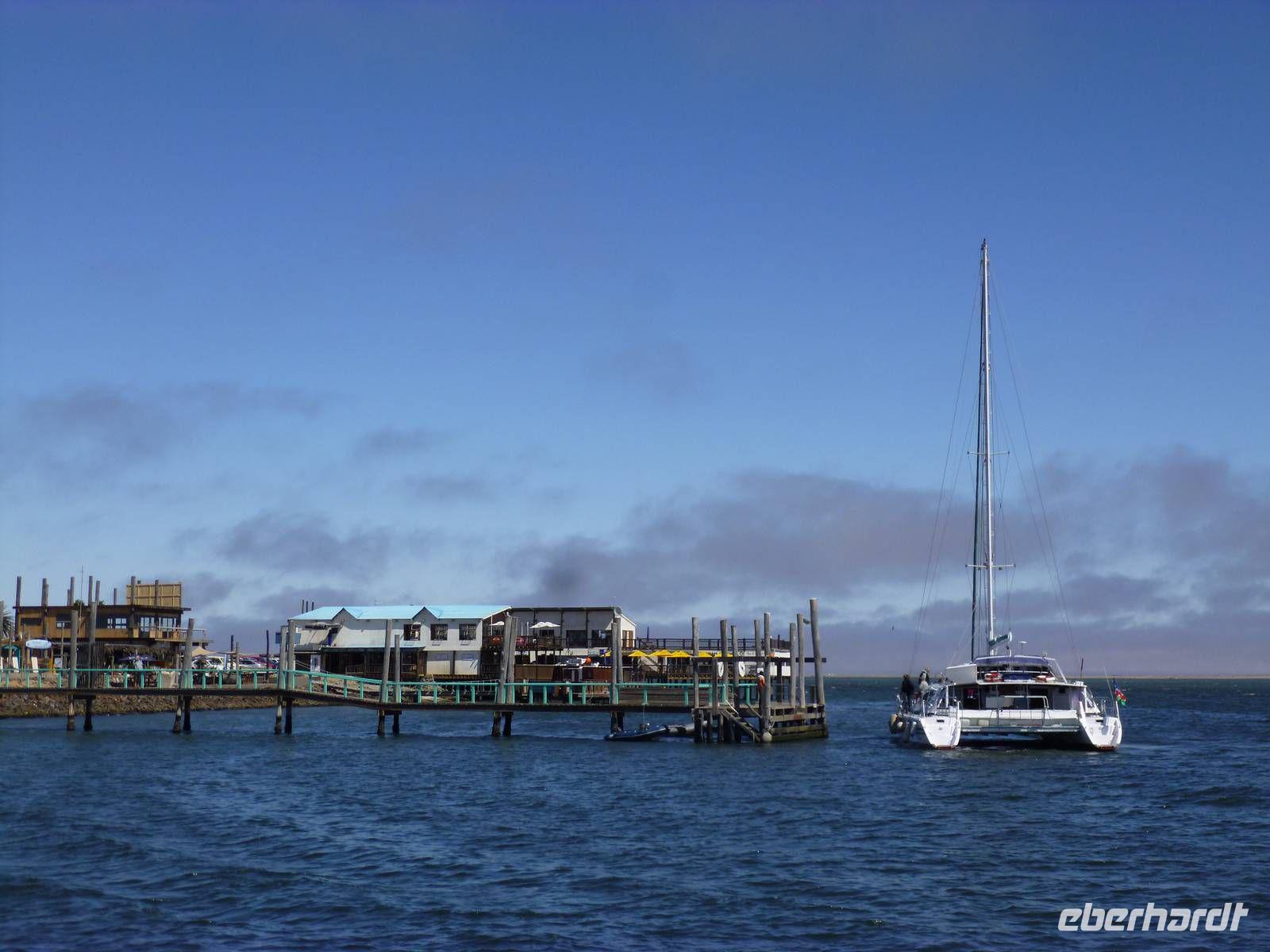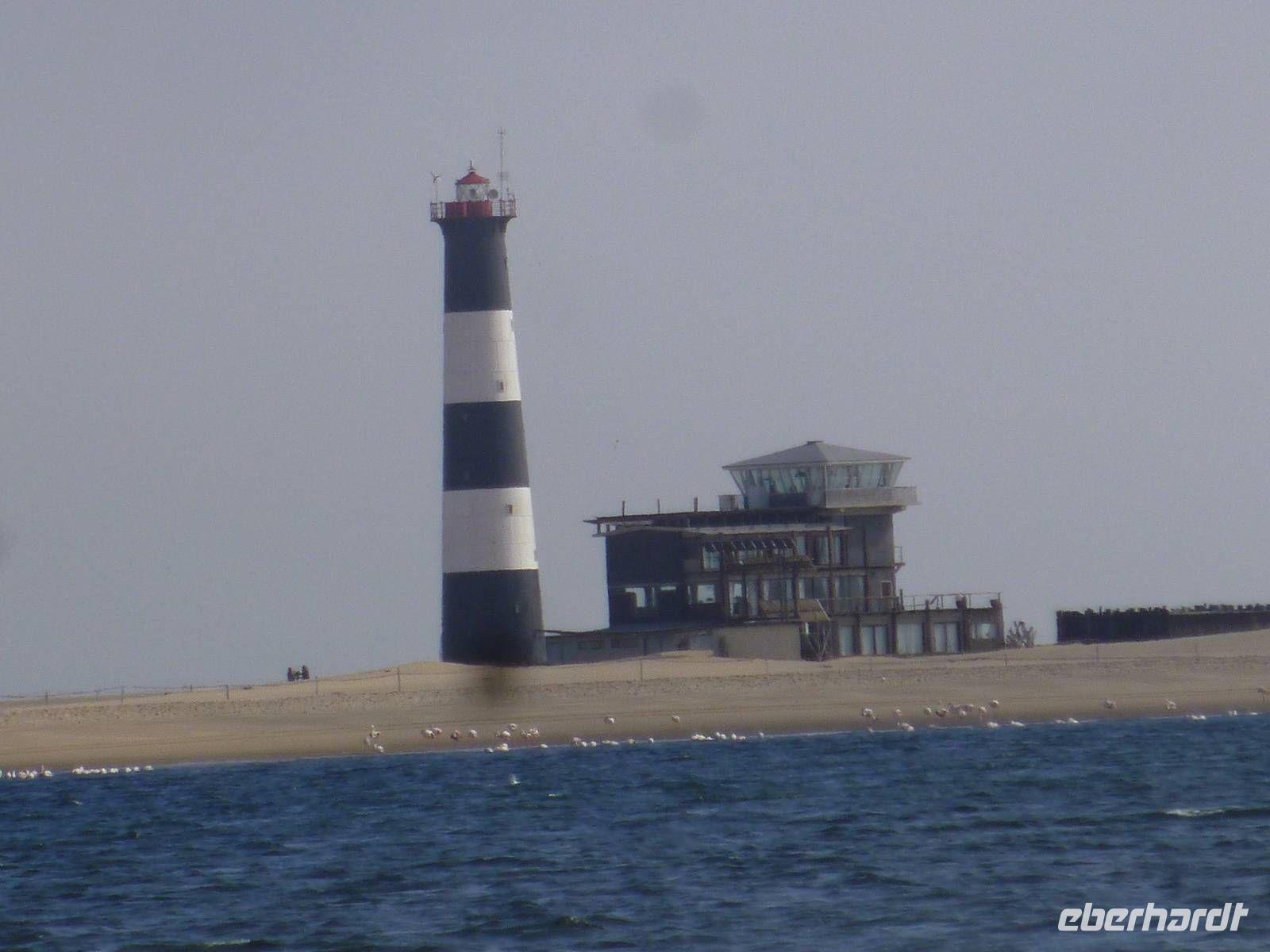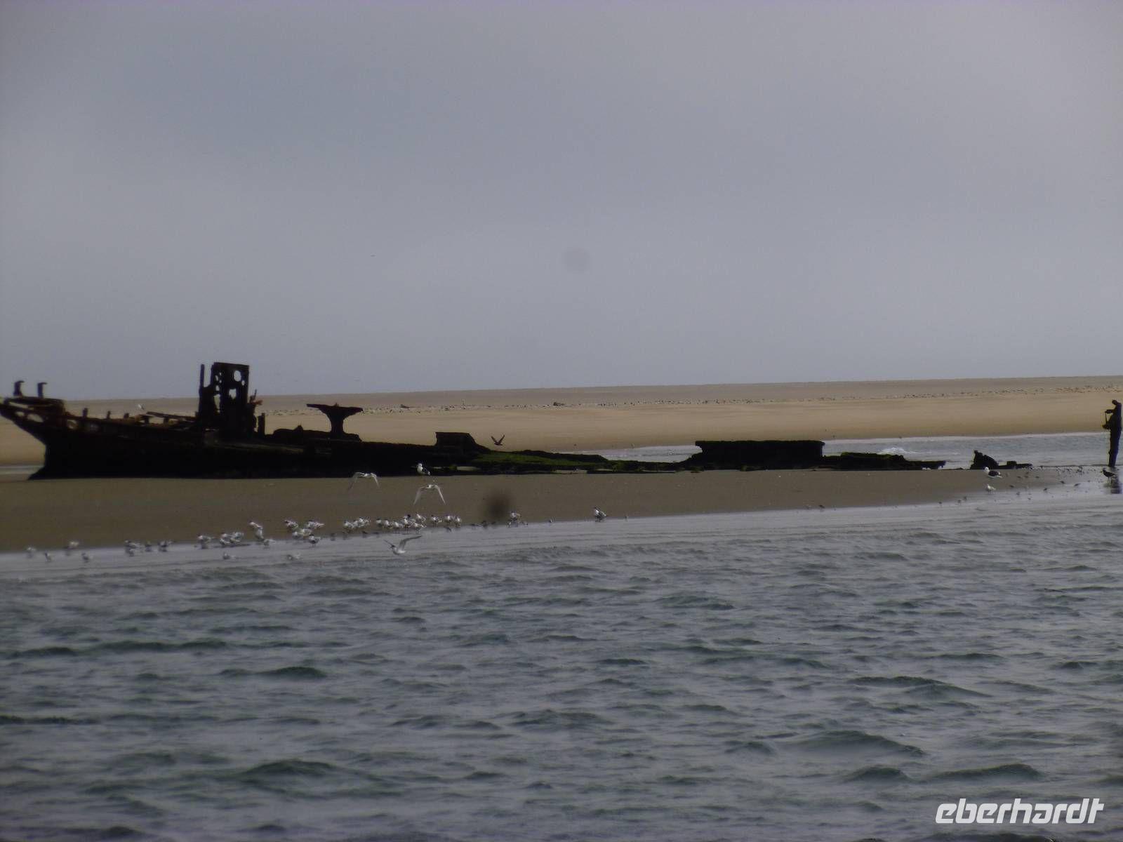 Auch heute hieß es wieder früh aufstehen. Wir fuhren zur Walvis-Bay. Wegen der Wale in den Küstengewässern haben Walfänger seit Anfang des 18. Jahrhunderts hier gerne Station gemacht. Wir begeben uns auf einen Katamaran und fahren entlang der Lagune die vom offenen Meer durch eine Landzunge geschützt ist. Wir erreichen den nördlichsten Punkt - Pelican-Point, mit Leuchtturm, einem alten Frack und einer Robbenkolonie. Unterwegs wurden uns Getränke und kleine Snacks gereicht. Kurz bevor wir wieder anlegen, wird eine Robbe mit Fisch an Deck gelockt. An Land konnten wir auch Pelikane betrachten. Zurück in Swakopmund, wurden einige am Hotel abgeholt und begaben sich auf einen Rundflug über die Atlantikküste und über die Namib-Wüste. Diejenigen, die nicht mit flogen, gingen bummeln oder ins Café "Anton", um die Spezialität Schwarzwälder Kirchtorte zu probieren. Auf Grund von Nebel mussten wir heute auf einen erneuten Sonnenuntergang verzichten.
