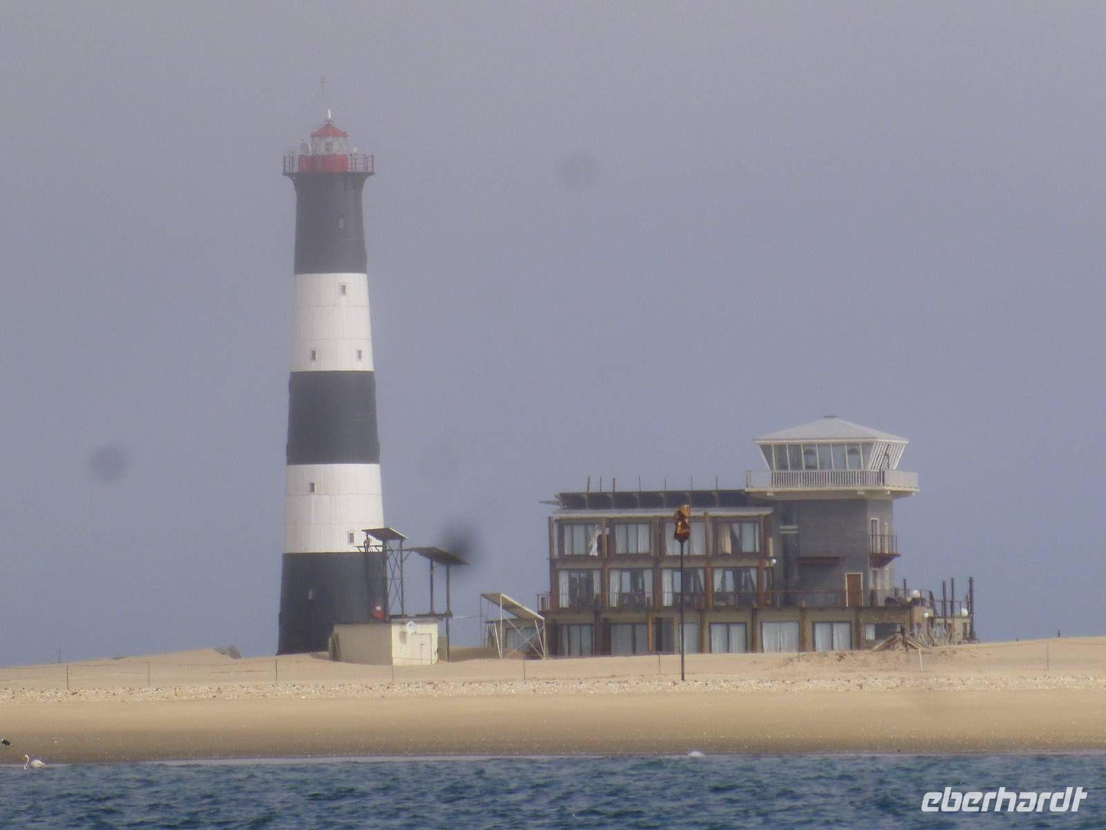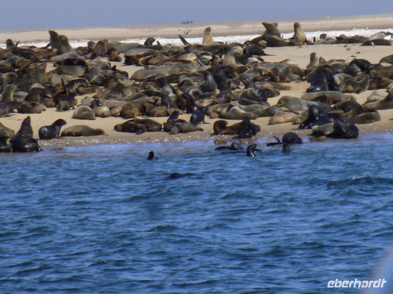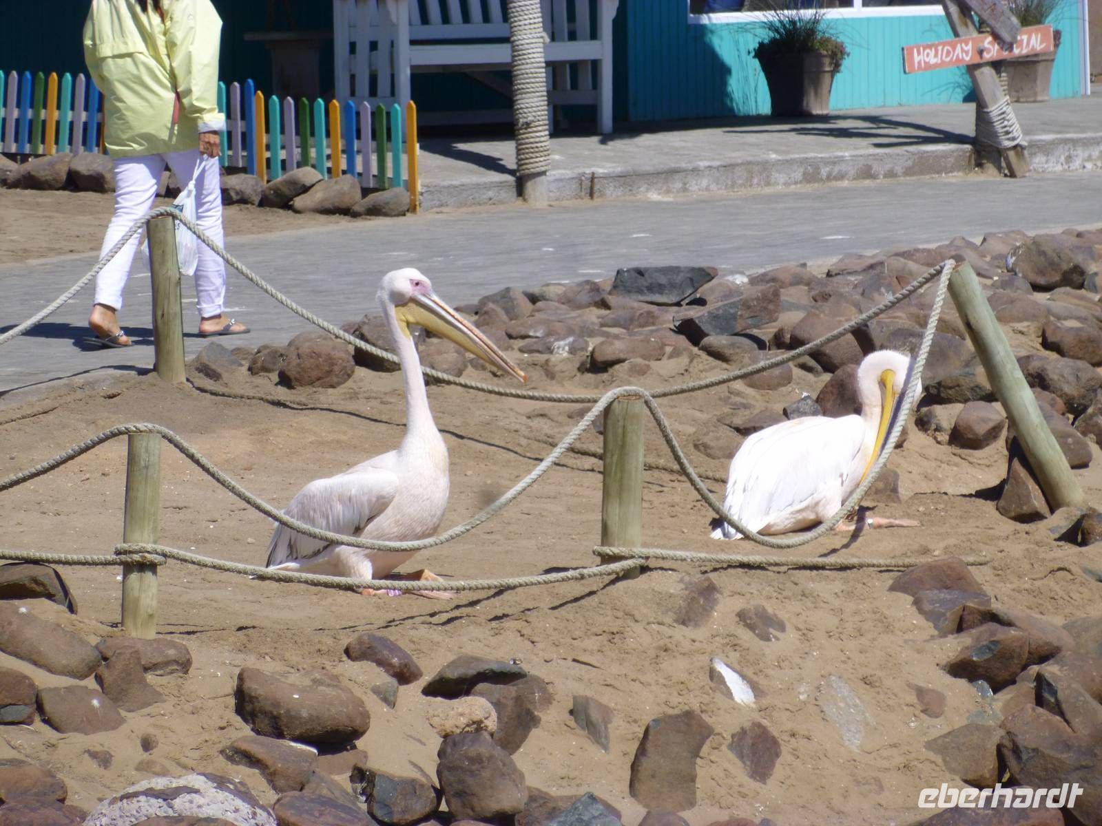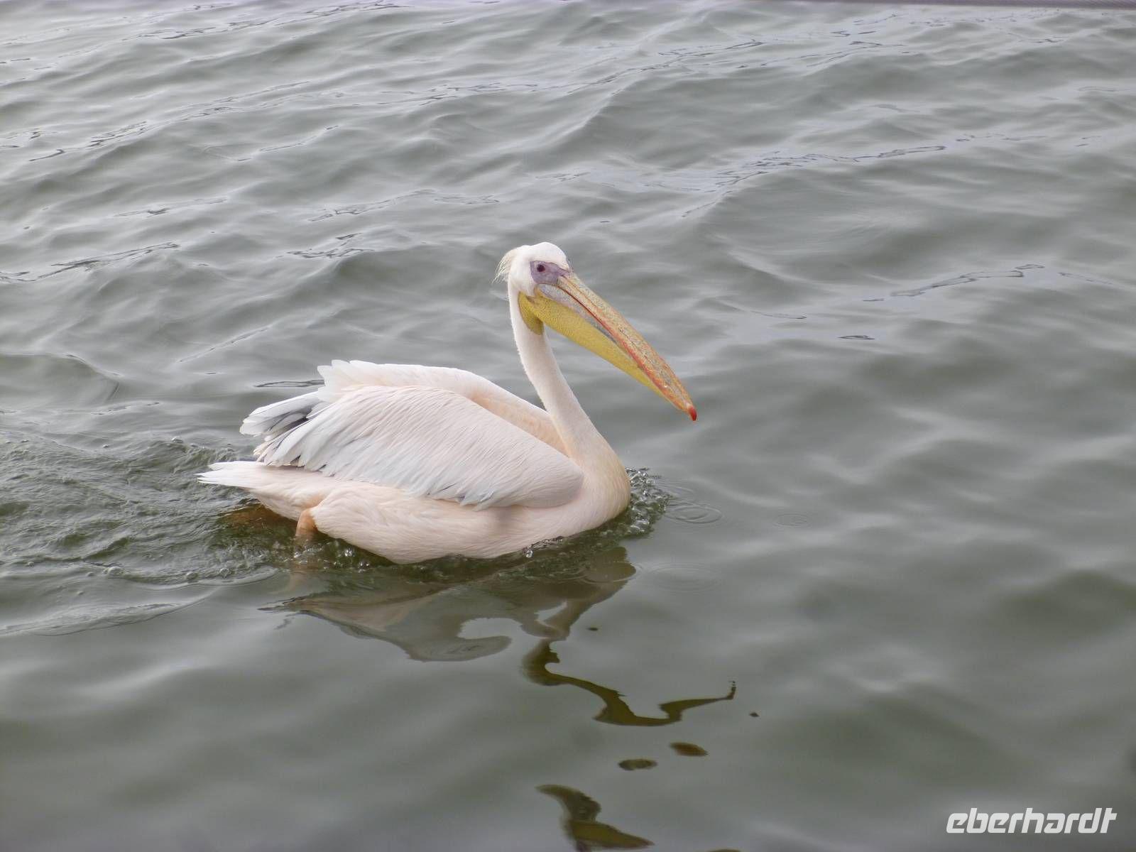 Auch heute hieß es wieder früh aufstehen. Wir fuhren zur Walvis-Bay. Wegen der Wale in den Küstengewässern haben Walfänger seit Anfang des 18. Jahrhunderts hier gerne Station gemacht. Wir begeben uns auf einen Katamaran und fahren entlang der Lagune die vom offenen Meer durch eine Landzunge geschützt ist. Wir erreichen den nördlichsten Punkt - Pelican-Point, mit Leuchtturm, einem alten Frack und einer Robbenkolonie. Unterwegs wurden uns Getränke und kleine Snacks gereicht. Kurz bevor wir wieder anlegen, wird eine Robbe mit Fisch an Deck gelockt. An Land konnten wir auch Pelikane betrachten. Zurück in Swakopmund, wurden einige am Hotel abgeholt und begaben sich auf einen Rundflug über die Atlantikküste und über die Namib-Wüste. Diejenigen, die nicht mit flogen, gingen bummeln oder ins Café "Anton", um die Spezialität Schwarzwälder Kirchtorte zu probieren. Auf Grund von Nebel mussten wir heute auf einen erneuten Sonnenuntergang verzichten.