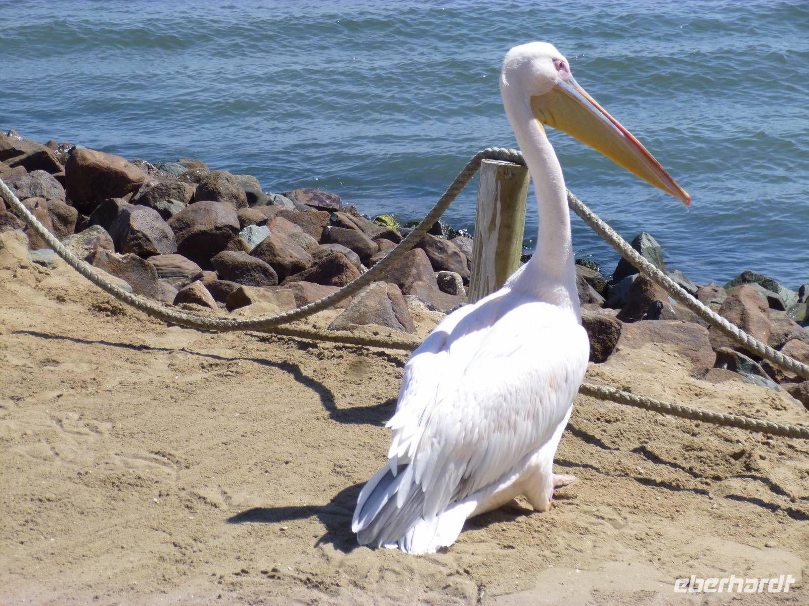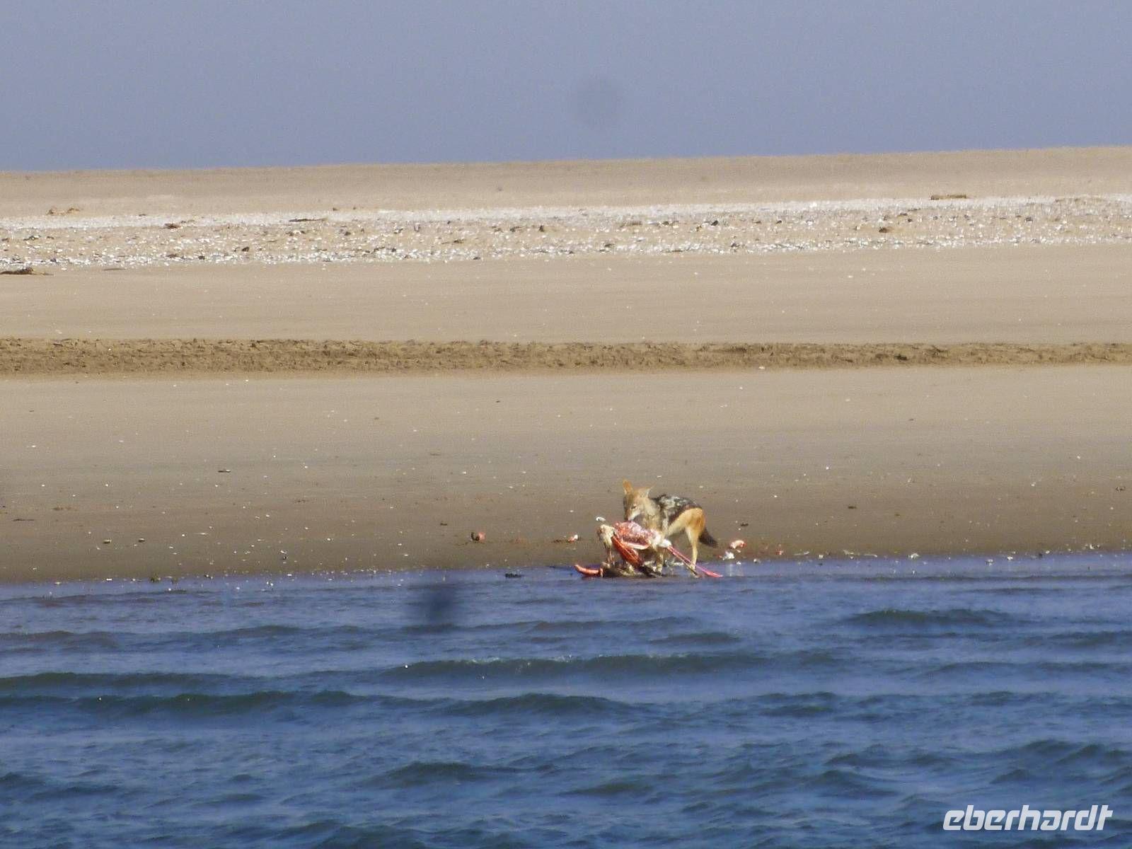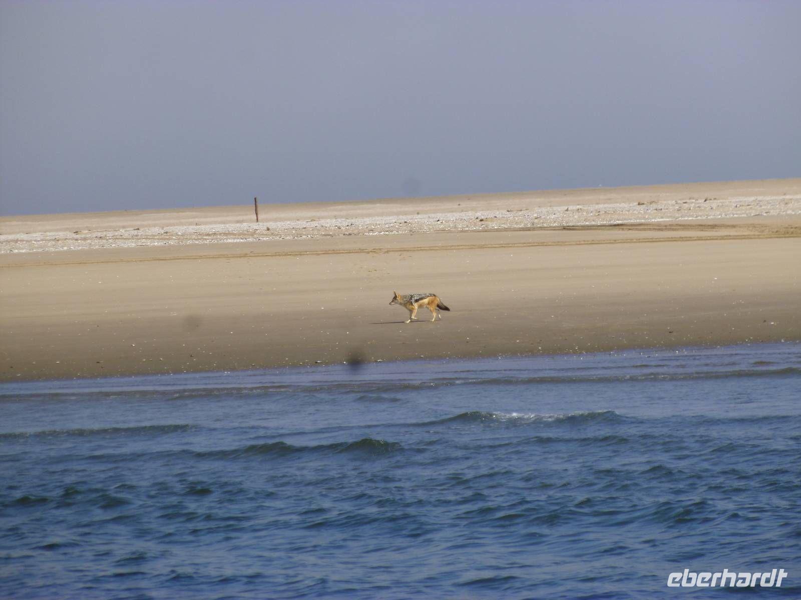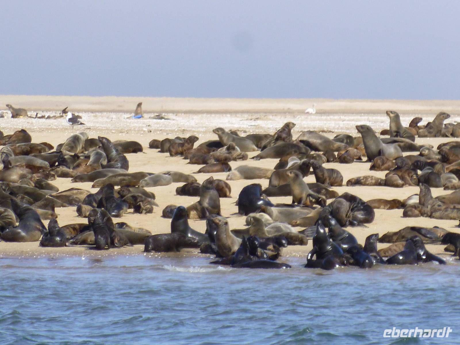 Auch heute hieß es wieder früh aufstehen. Wir fuhren zur Walvis-Bay. Wegen der Wale in den Küstengewässern haben Walfänger seit Anfang des 18. Jahrhunderts hier gerne Station gemacht. Wir begeben uns auf einen Katamaran und fahren entlang der Lagune die vom offenen Meer durch eine Landzunge geschützt ist. Wir erreichen den nördlichsten Punkt - Pelican-Point, mit Leuchtturm, einem alten Frack und einer Robbenkolonie. Unterwegs wurden uns Getränke und kleine Snacks gereicht. Kurz bevor wir wieder anlegen, wird eine Robbe mit Fisch an Deck gelockt. An Land konnten wir auch Pelikane betrachten. Zurück in Swakopmund, wurden einige am Hotel abgeholt und begaben sich auf einen Rundflug über die Atlantikküste und über die Namib-Wüste. Diejenigen, die nicht mit flogen, gingen bummeln oder ins Café "Anton", um die Spezialität Schwarzwälder Kirchtorte zu probieren. Auf Grund von Nebel mussten wir heute auf einen erneuten Sonnenuntergang verzichten.