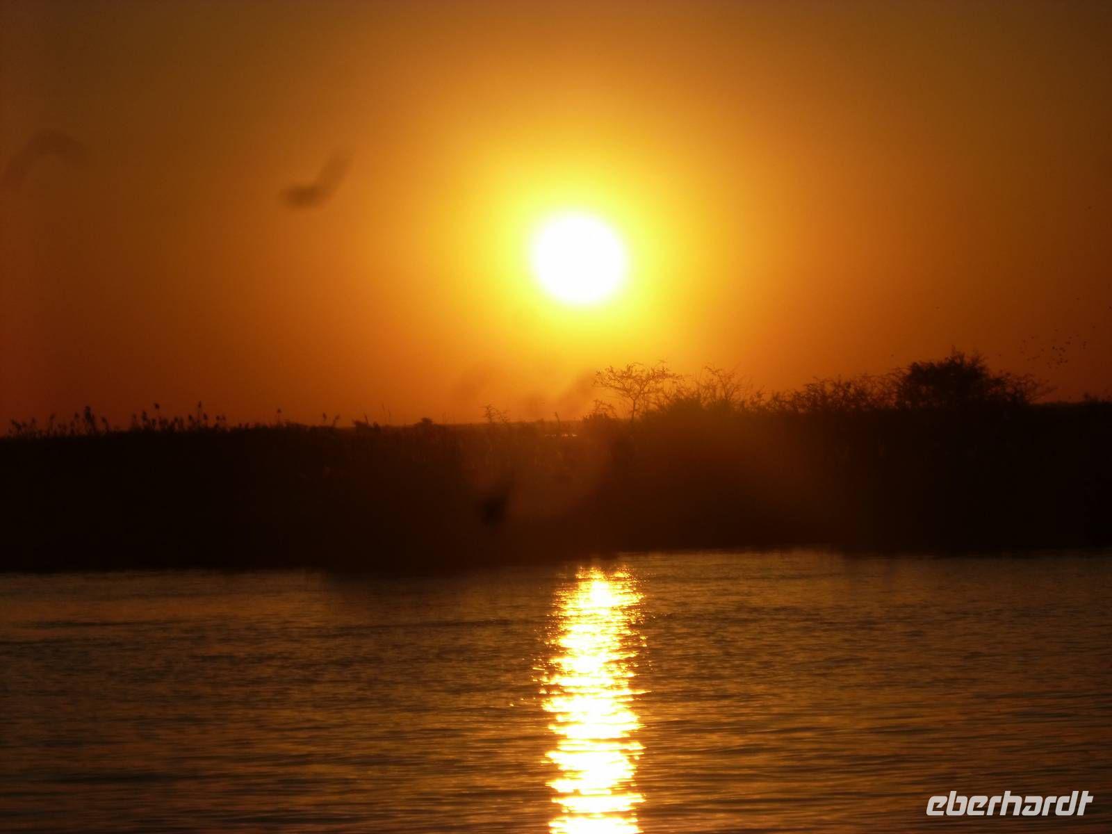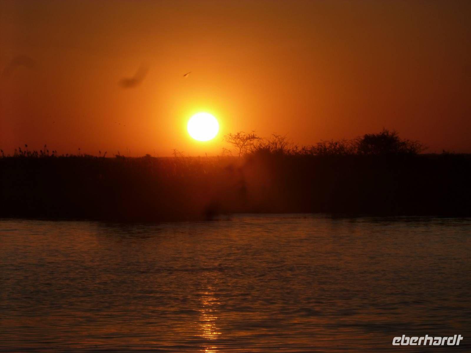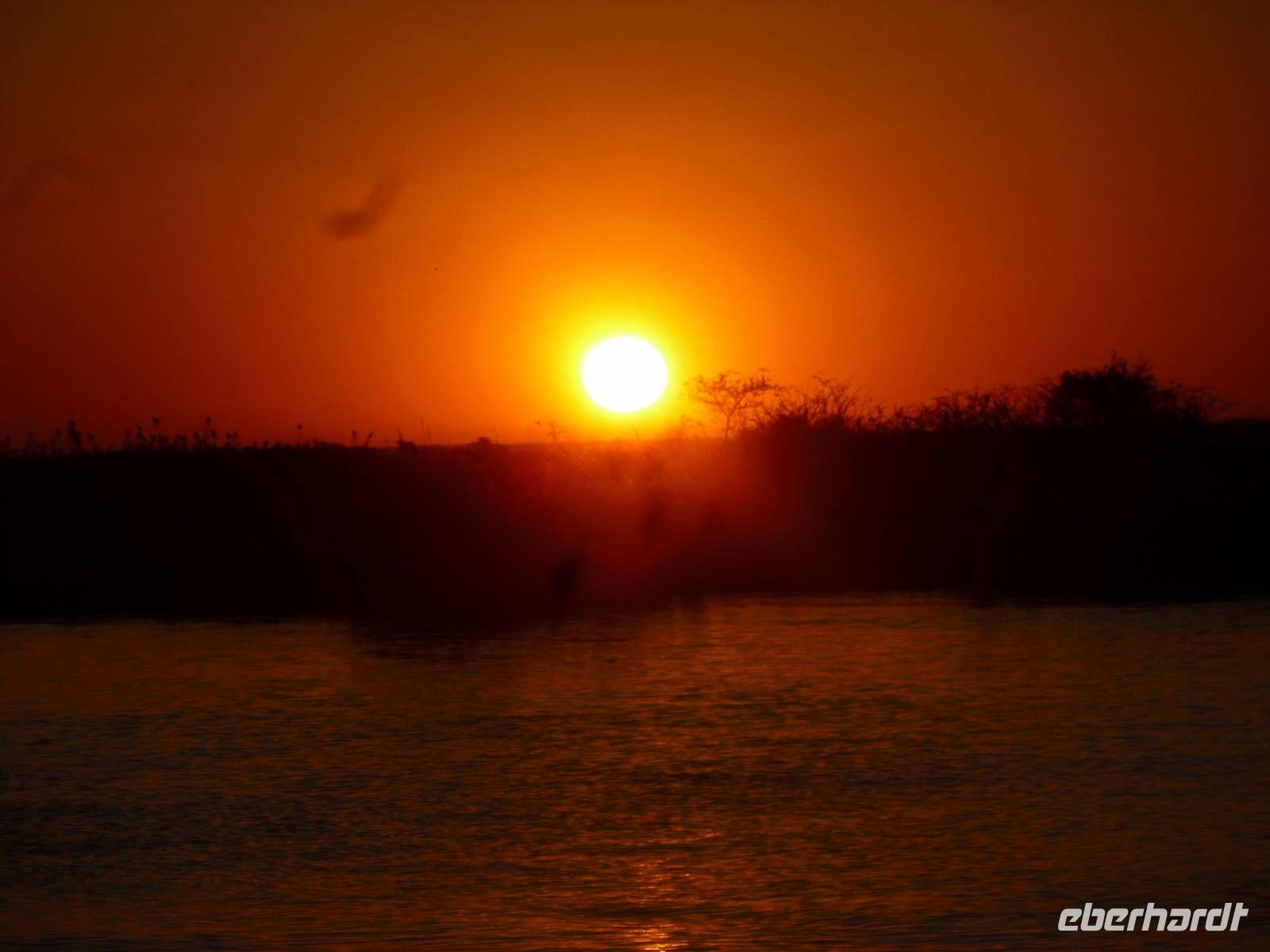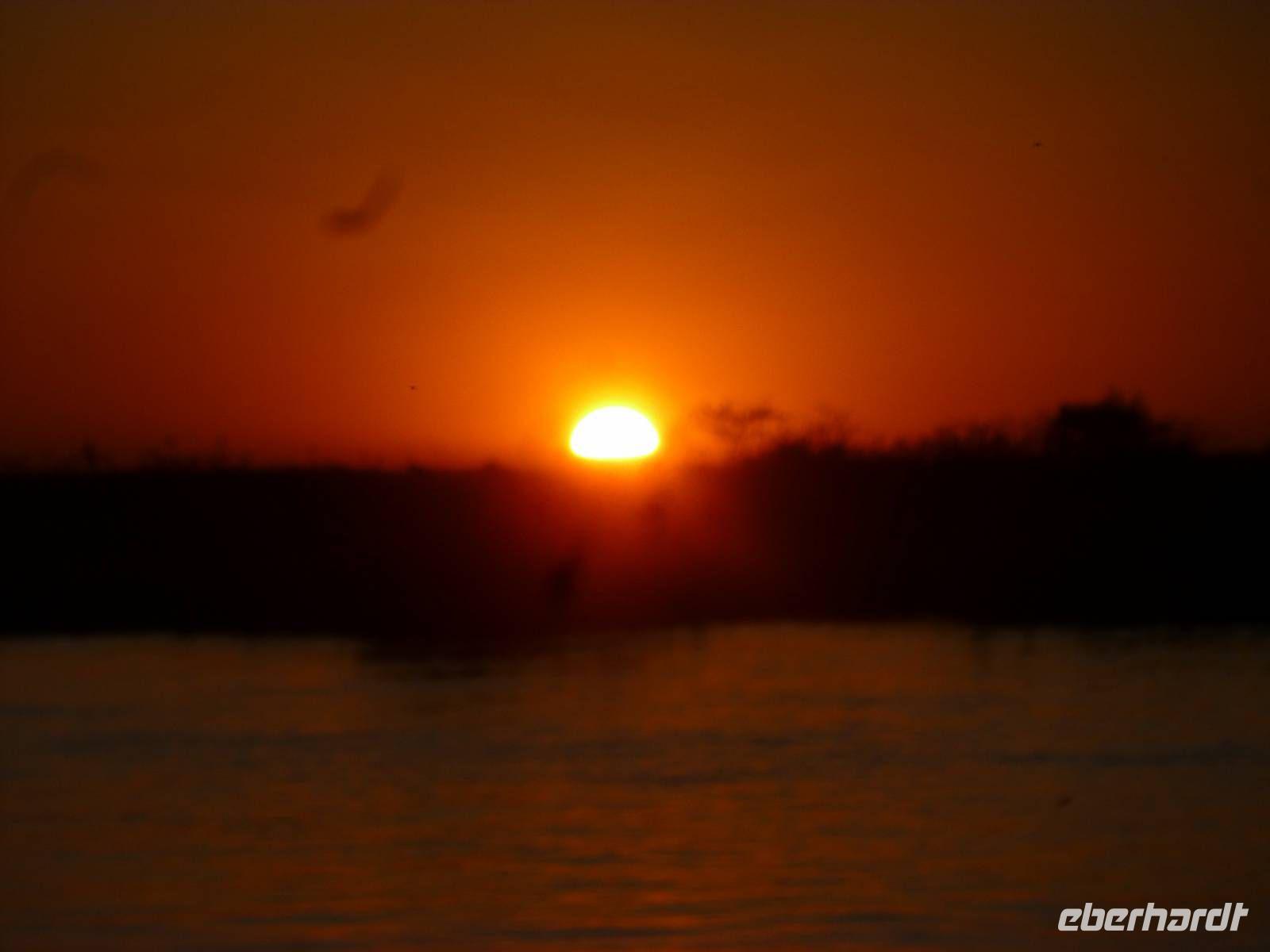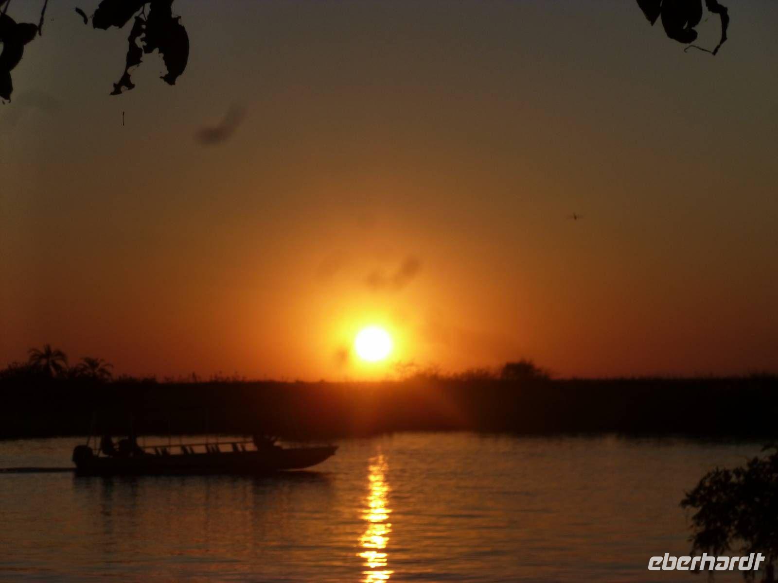Wir unternehmen einen Spaziergang entlang des Deltaufers. Nach der Besichtigung eines Affenbrotbaumes bestiegen wir den Bus und fuhren zum Homstage von Sharon die in der "Namushasha Lodge" arbeitet. Leider war Sie nicht anwesend, den Sie wurde zum lernen in ein Camp nach Etoscha geschickt. Im Village unternehmen wir eine Führung durch das Dorf mit Erklärungen über das Leben der Menschen. Wir konnten in eine Rundhütte schauen und sahen wie mit der Hand der Mais zermahlen wird. Dieter probierte es auch aus und musste feststellen, dass dies sehr anstrengend ist. Einige Tänze und Musik wurden vor geführt und erläutert. Wir sahen in die Kochtöpfe, die Vorratskammer und das Haus von Sharons Schwester. Am Nachmittag erwartete uns ein Boot für unsere Wildlife-Fahrt durch das Delta. Wir stiegen um in den Monstertruck und fuhren zu einer Safari in den Mudumu Nationalpark. Es waren kaum Tiere zu sehen. Erst am Hufeisensee war eine Elefantenherde zu beobachten. Nach einer kleinen Stärkung am Ufer des Sees fuhren wir zurück zum Boot. Die Elefantenherde kam zurück, doch wir mußten zum Boot zurück. Auf der Rückfahrt legten wir immer wieder einen Halt ein. Weitere Elefantenherden und Paviane umzingelten unseren Truck. Auch die Tsetsebee-Antilope, die schnellste Antilope der Welt läuft uns vor die Kamera. Zum Abschluss des Tages erleben wir einen wunderschönen Sonnenuntergang.