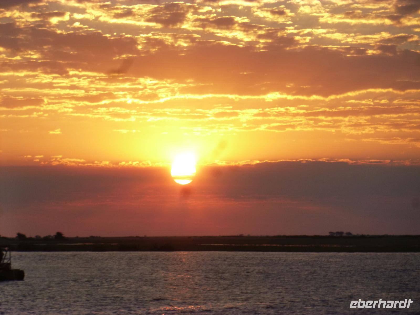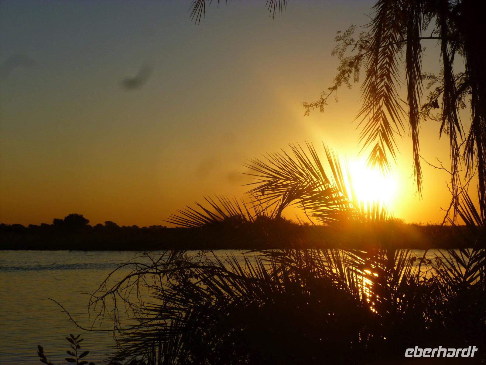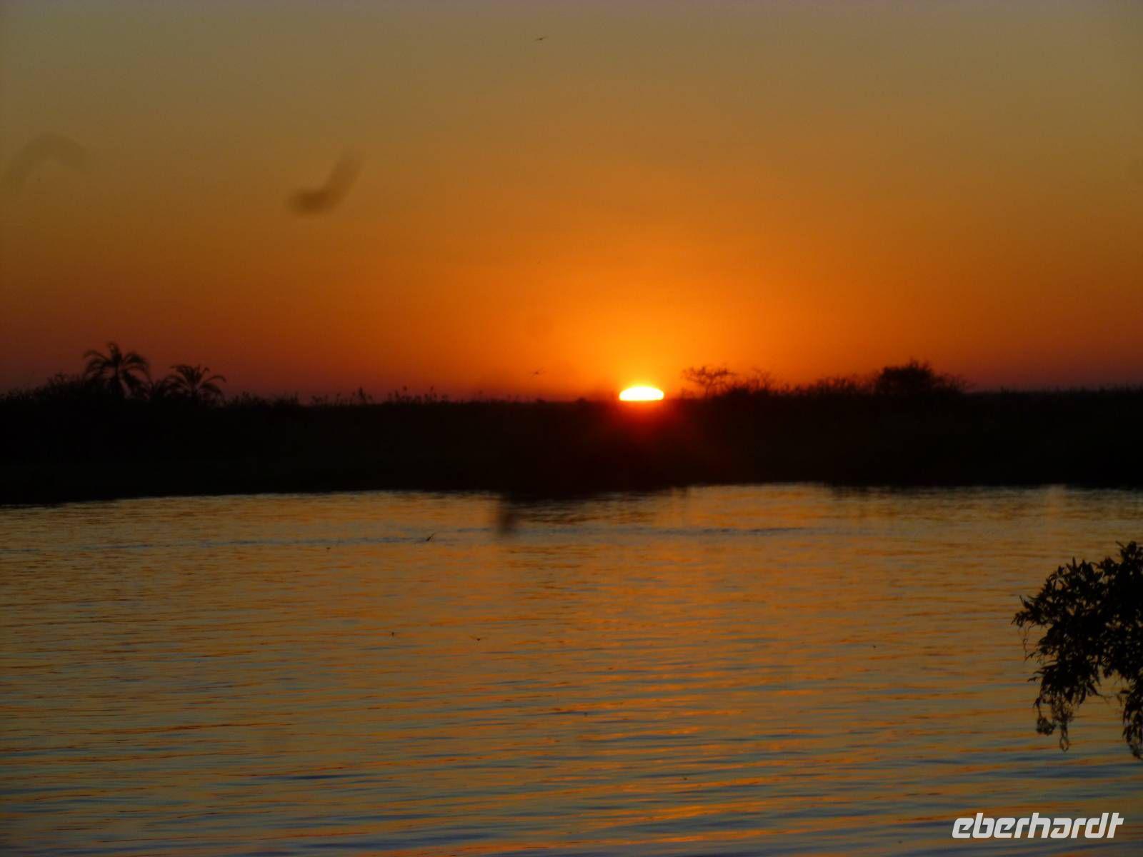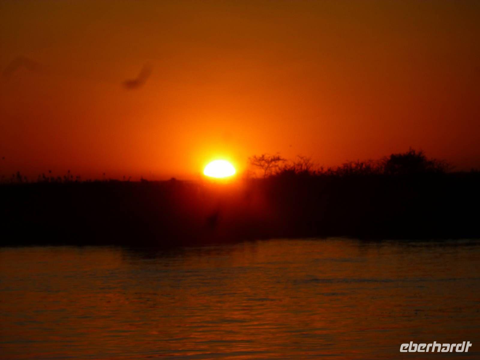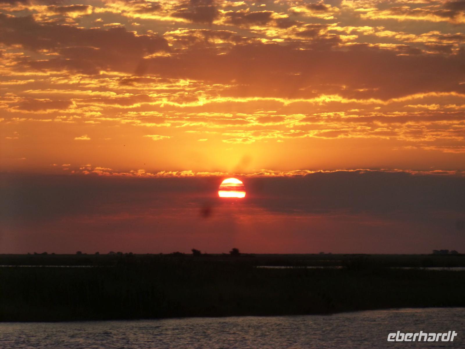 Wir unternehmen einen Spaziergang entlang des Deltaufers. Nach der Besichtigung eines Affenbrotbaumes bestiegen wir den Bus und fuhren zum Homstage von Sharon die in der "Namushasha Lodge" arbeitet. Leider war Sie nicht anwesend, den Sie wurde zum lernen in ein Camp nach Etoscha geschickt. Im Village unternehmen wir eine Führung durch das Dorf mit Erklärungen über das Leben der Menschen. Wir konnten in eine Rundhütte schauen und sahen wie mit der Hand der Mais zermahlen wird. Dieter probierte es auch aus und musste feststellen, dass dies sehr anstrengend ist. Einige Tänze und Musik wurden vor geführt und erläutert. Wir sahen in die Kochtöpfe, die Vorratskammer und das Haus von Sharons Schwester. Am Nachmittag erwartete uns ein Boot für unsere Wildlife-Fahrt durch das Delta. Wir stiegen um in den Monstertruck und fuhren zu einer Safari in den Mudumu Nationalpark. Es waren kaum Tiere zu sehen. Erst am Hufeisensee war eine Elefantenherde zu beobachten. Nach einer kleinen Stärkung am Ufer des Sees fuhren wir zurück zum Boot. Die Elefantenherde kam zurück, doch wir mußten zum Boot zurück. Auf der Rückfahrt legten wir immer wieder einen Halt ein. Weitere Elefantenherden und Paviane umzingelten unseren Truck. Auch die Tsetsebee-Antilope, die schnellste Antilope der Welt läuft uns vor die Kamera. Zum Abschluss des Tages erleben wir einen wunderschönen Sonnenuntergang.