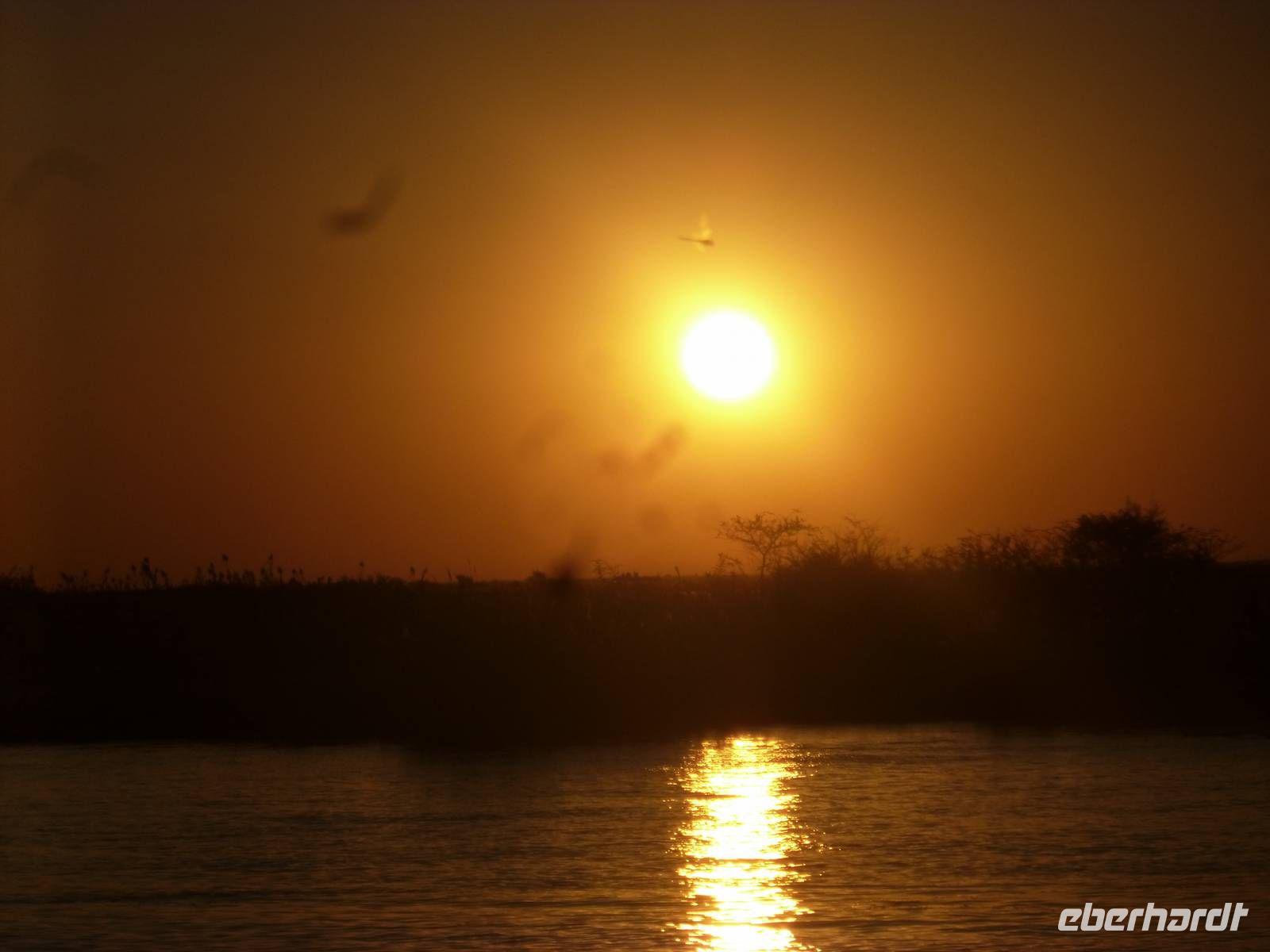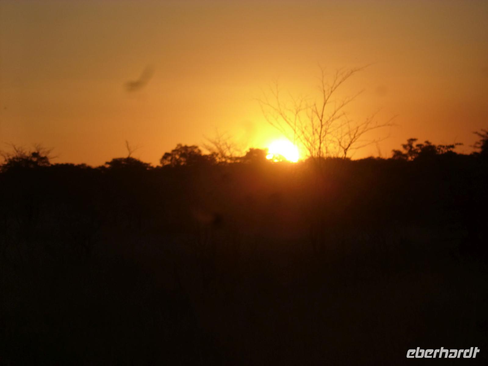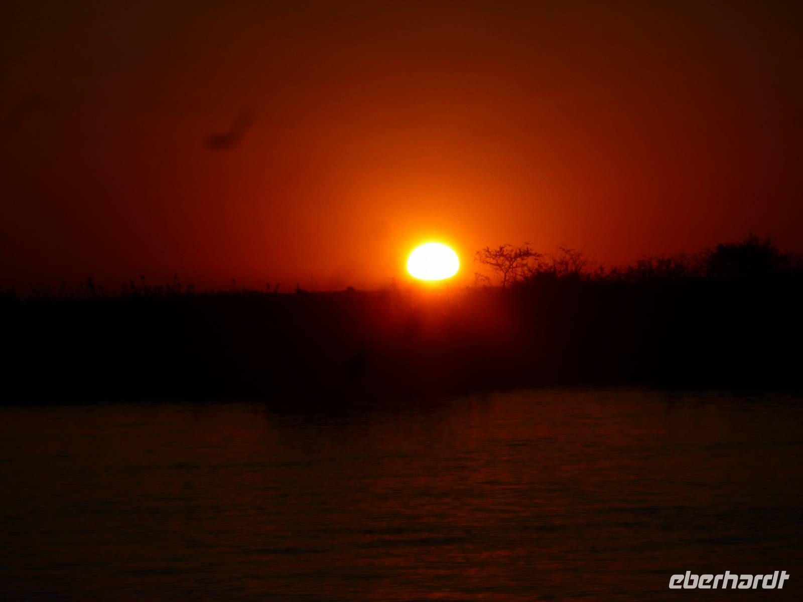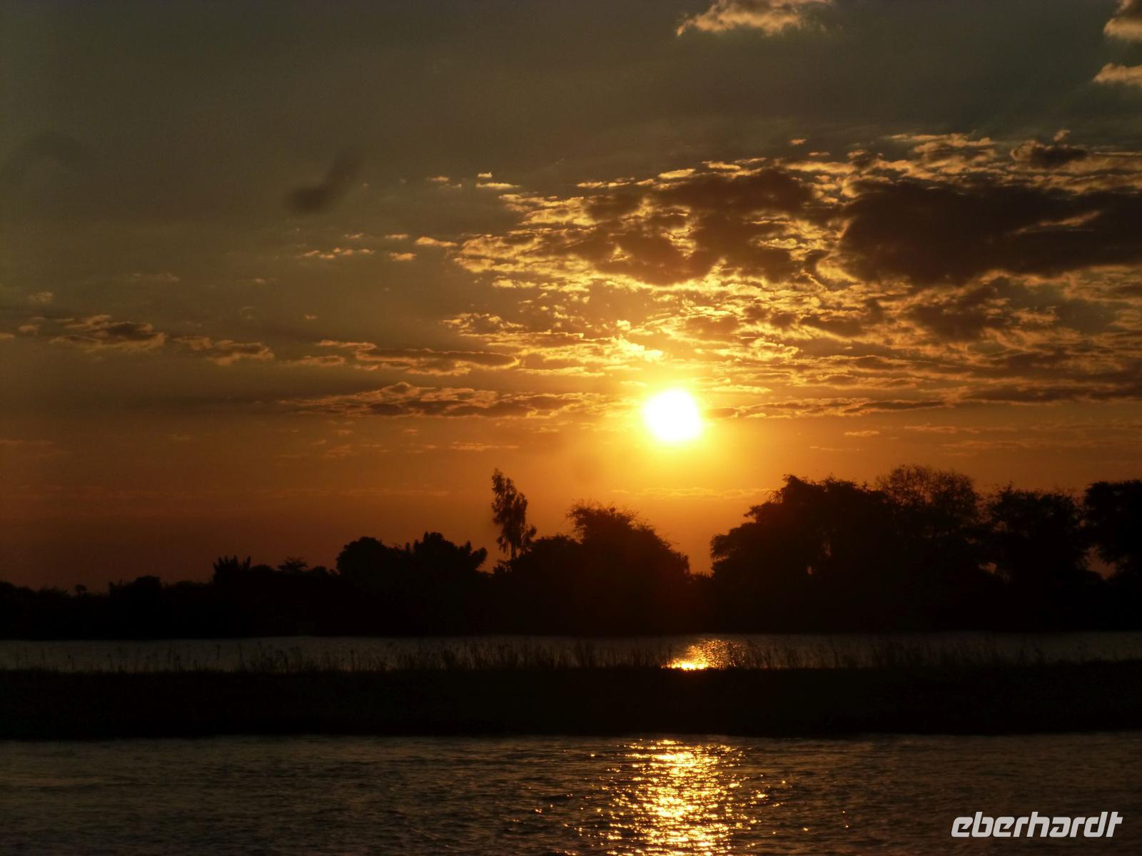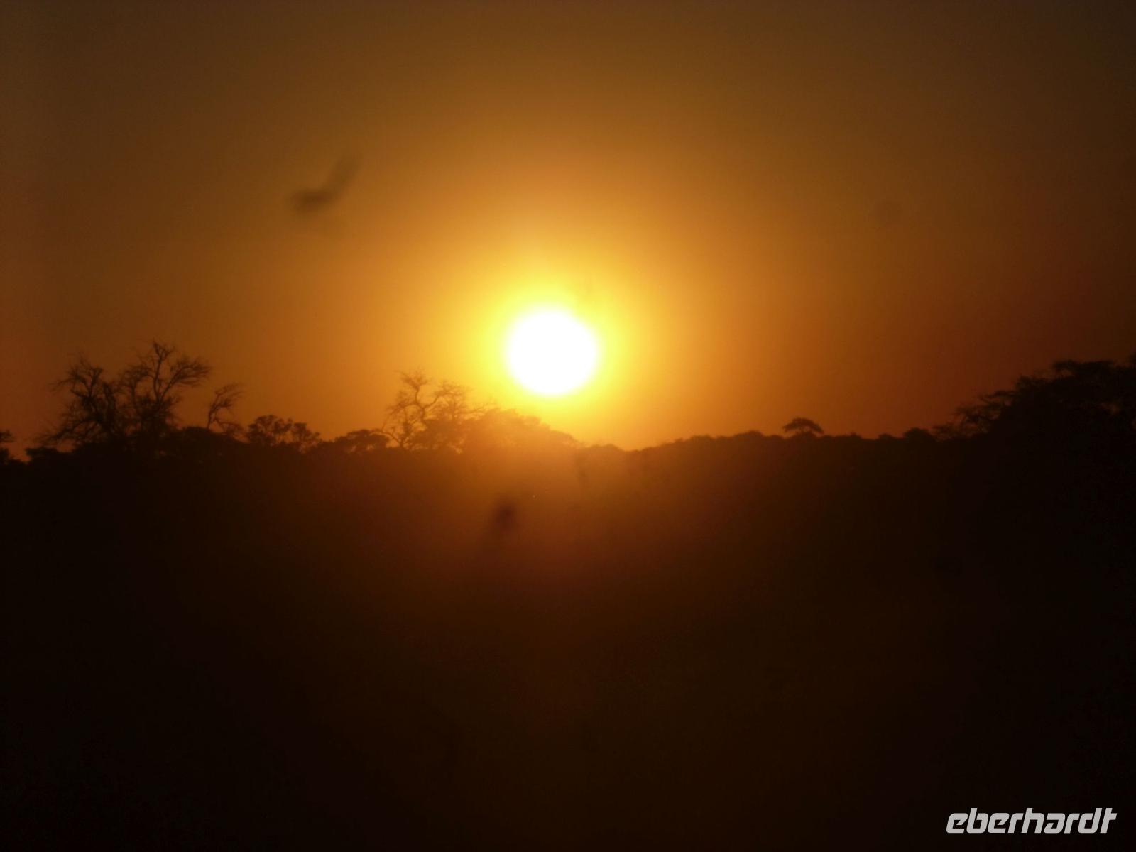 Wir unternehmen einen Spaziergang entlang des Deltaufers. Nach der Besichtigung eines Affenbrotbaumes bestiegen wir den Bus und fuhren zum Homstage von Sharon die in der "Namushasha Lodge" arbeitet. Leider war Sie nicht anwesend, den Sie wurde zum lernen in ein Camp nach Etoscha geschickt. Im Village unternehmen wir eine Führung durch das Dorf mit Erklärungen über das Leben der Menschen. Wir konnten in eine Rundhütte schauen und sahen wie mit der Hand der Mais zermahlen wird. Dieter probierte es auch aus und musste feststellen, dass dies sehr anstrengend ist. Einige Tänze und Musik wurden vor geführt und erläutert. Wir sahen in die Kochtöpfe, die Vorratskammer und das Haus von Sharons Schwester. Am Nachmittag erwartete uns ein Boot für unsere Wildlife-Fahrt durch das Delta. Wir stiegen um in den Monstertruck und fuhren zu einer Safari in den Mudumu Nationalpark. Es waren kaum Tiere zu sehen. Erst am Hufeisensee war eine Elefantenherde zu beobachten. Nach einer kleinen Stärkung am Ufer des Sees fuhren wir zurück zum Boot. Die Elefantenherde kam zurück, doch wir mußten zum Boot zurück. Auf der Rückfahrt legten wir immer wieder einen Halt ein. Weitere Elefantenherden und Paviane umzingelten unseren Truck. Auch die Tsetsebee-Antilope, die schnellste Antilope der Welt läuft uns vor die Kamera. Zum Abschluss des Tages erleben wir einen wunderschönen Sonnenuntergang.