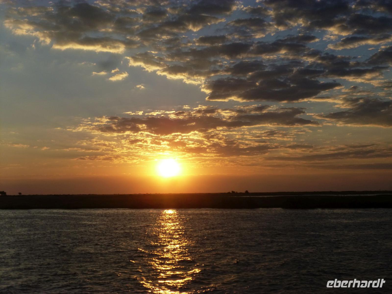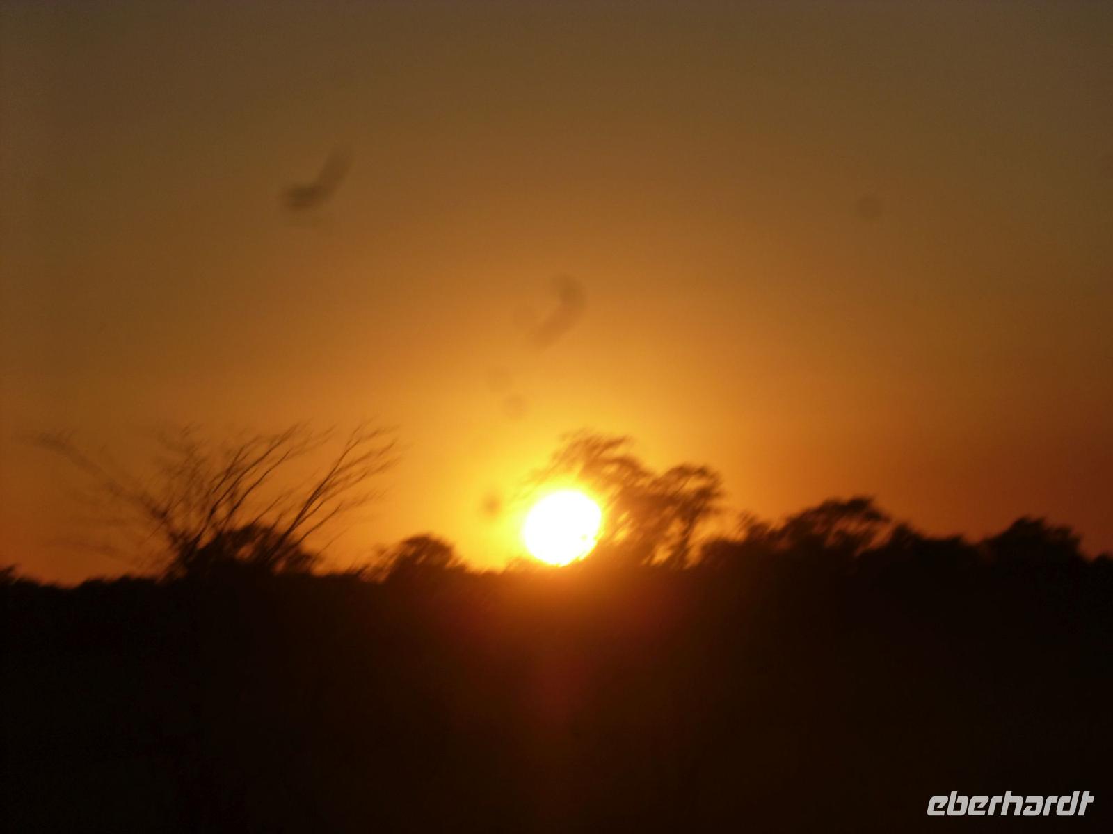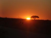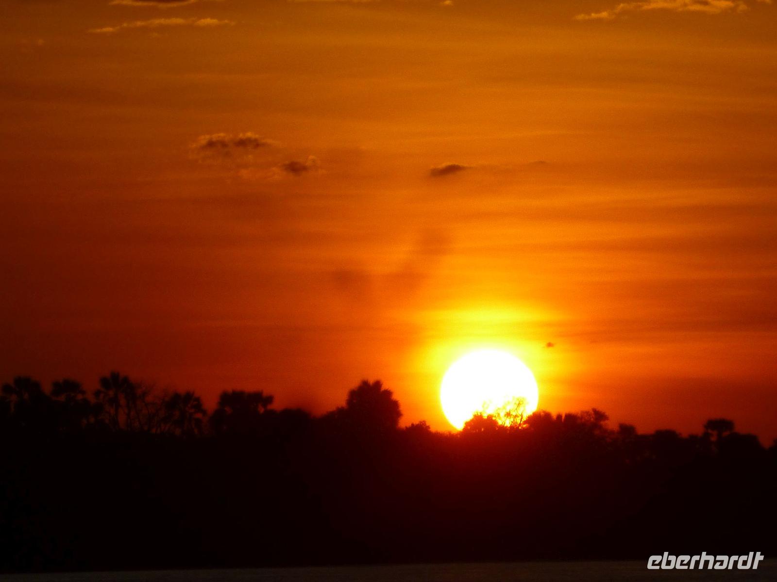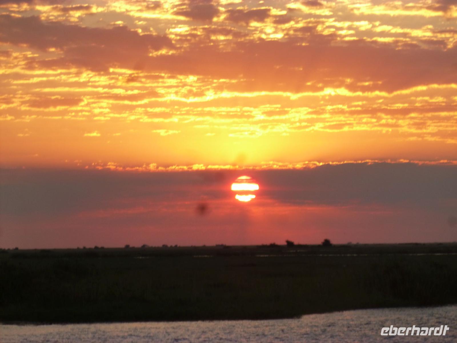 Wir unternehmen einen Spaziergang entlang des Deltaufers. Nach der Besichtigung eines Affenbrotbaumes bestiegen wir den Bus und fuhren zum Homstage von Sharon die in der "Namushasha Lodge" arbeitet. Leider war Sie nicht anwesend, den Sie wurde zum lernen in ein Camp nach Etoscha geschickt. Im Village unternehmen wir eine Führung durch das Dorf mit Erklärungen über das Leben der Menschen. Wir konnten in eine Rundhütte schauen und sahen wie mit der Hand der Mais zermahlen wird. Dieter probierte es auch aus und musste feststellen, dass dies sehr anstrengend ist. Einige Tänze und Musik wurden vor geführt und erläutert. Wir sahen in die Kochtöpfe, die Vorratskammer und das Haus von Sharons Schwester. Am Nachmittag erwartete uns ein Boot für unsere Wildlife-Fahrt durch das Delta. Wir stiegen um in den Monstertruck und fuhren zu einer Safari in den Mudumu Nationalpark. Es waren kaum Tiere zu sehen. Erst am Hufeisensee war eine Elefantenherde zu beobachten. Nach einer kleinen Stärkung am Ufer des Sees fuhren wir zurück zum Boot. Die Elefantenherde kam zurück, doch wir mußten zum Boot zurück. Auf der Rückfahrt legten wir immer wieder einen Halt ein. Weitere Elefantenherden und Paviane umzingelten unseren Truck. Auch die Tsetsebee-Antilope, die schnellste Antilope der Welt läuft uns vor die Kamera. Zum Abschluss des Tages erleben wir einen wunderschönen Sonnenuntergang.