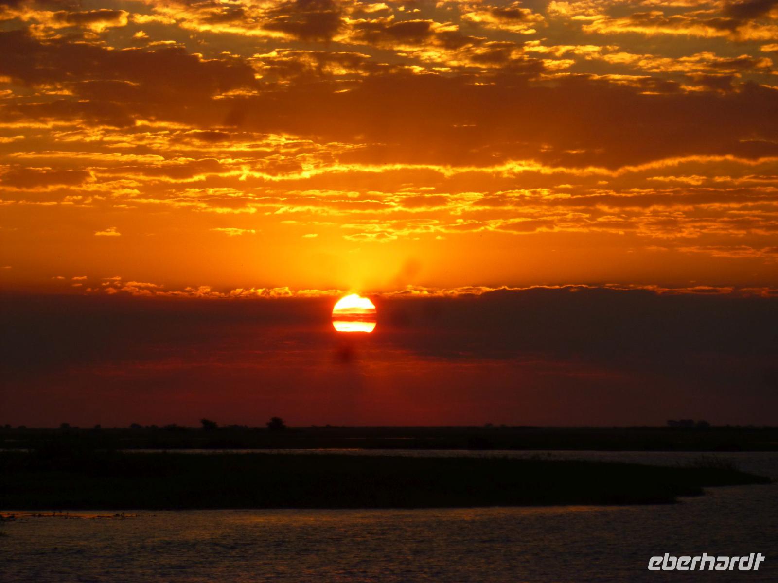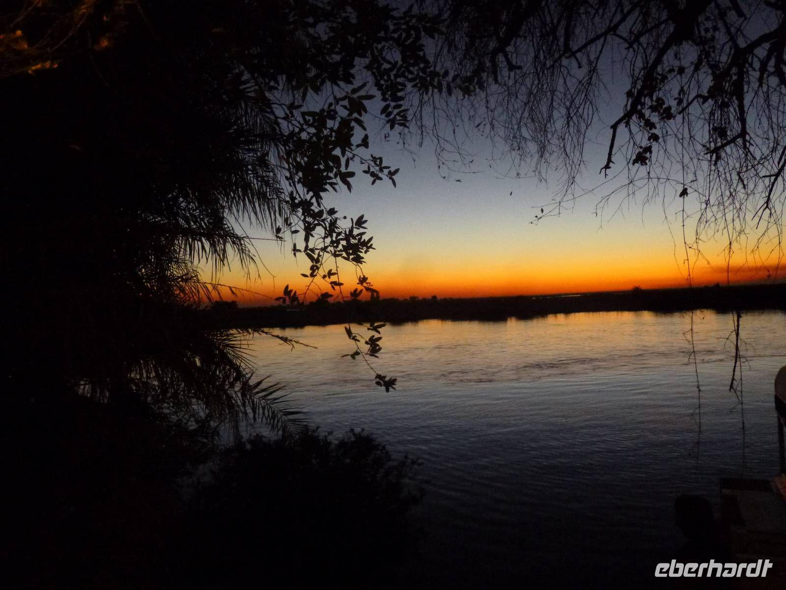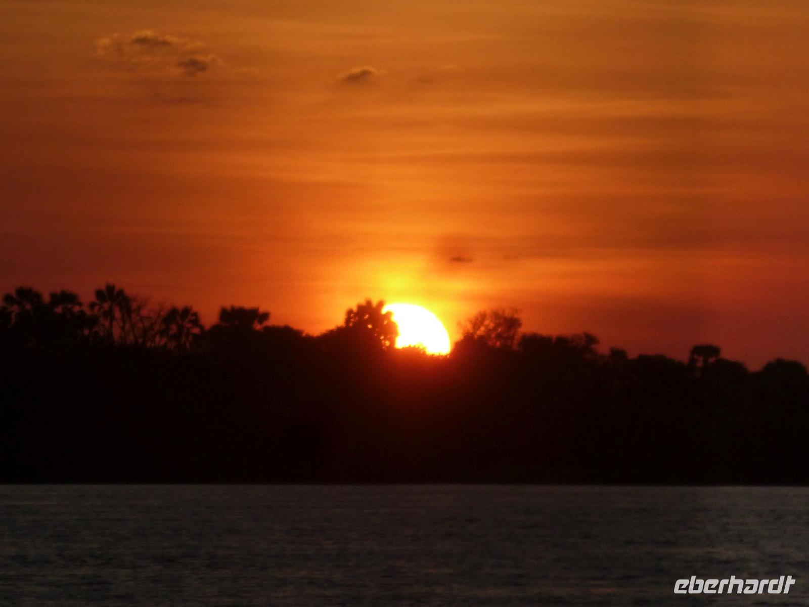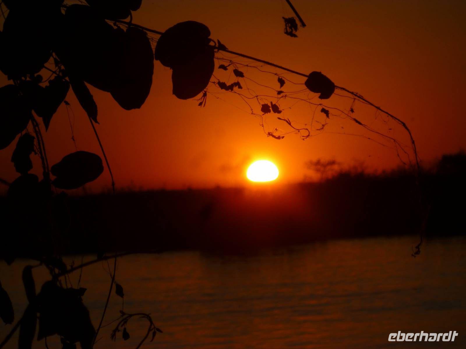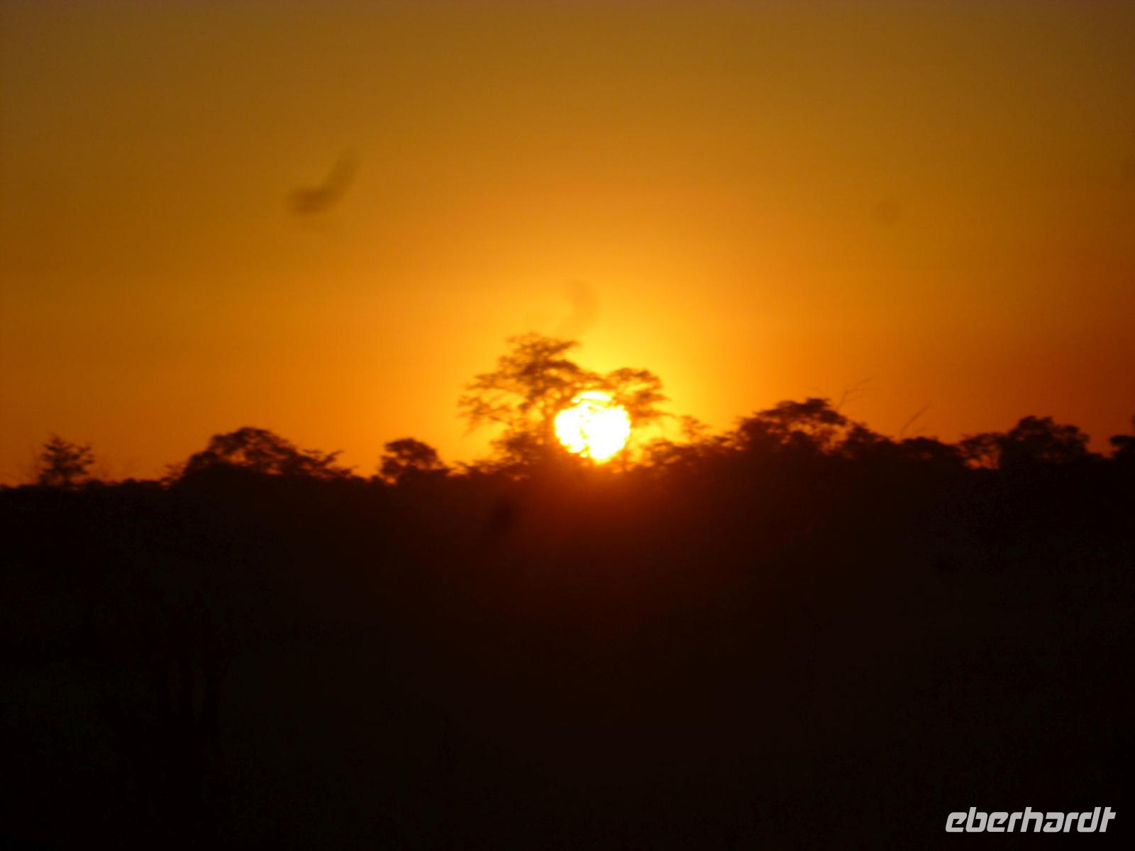 Wir unternehmen einen Spaziergang entlang des Deltaufers. Nach der Besichtigung eines Affenbrotbaumes bestiegen wir den Bus und fuhren zum Homstage von Sharon die in der "Namushasha Lodge" arbeitet. Leider war Sie nicht anwesend, den Sie wurde zum lernen in ein Camp nach Etoscha geschickt. Im Village unternehmen wir eine Führung durch das Dorf mit Erklärungen über das Leben der Menschen. Wir konnten in eine Rundhütte schauen und sahen wie mit der Hand der Mais zermahlen wird. Dieter probierte es auch aus und musste feststellen, dass dies sehr anstrengend ist. Einige Tänze und Musik wurden vor geführt und erläutert. Wir sahen in die Kochtöpfe, die Vorratskammer und das Haus von Sharons Schwester. Am Nachmittag erwartete uns ein Boot für unsere Wildlife-Fahrt durch das Delta. Wir stiegen um in den Monstertruck und fuhren zu einer Safari in den Mudumu Nationalpark. Es waren kaum Tiere zu sehen. Erst am Hufeisensee war eine Elefantenherde zu beobachten. Nach einer kleinen Stärkung am Ufer des Sees fuhren wir zurück zum Boot. Die Elefantenherde kam zurück, doch wir mußten zum Boot zurück. Auf der Rückfahrt legten wir immer wieder einen Halt ein. Weitere Elefantenherden und Paviane umzingelten unseren Truck. Auch die Tsetsebee-Antilope, die schnellste Antilope der Welt läuft uns vor die Kamera. Zum Abschluss des Tages erleben wir einen wunderschönen Sonnenuntergang.