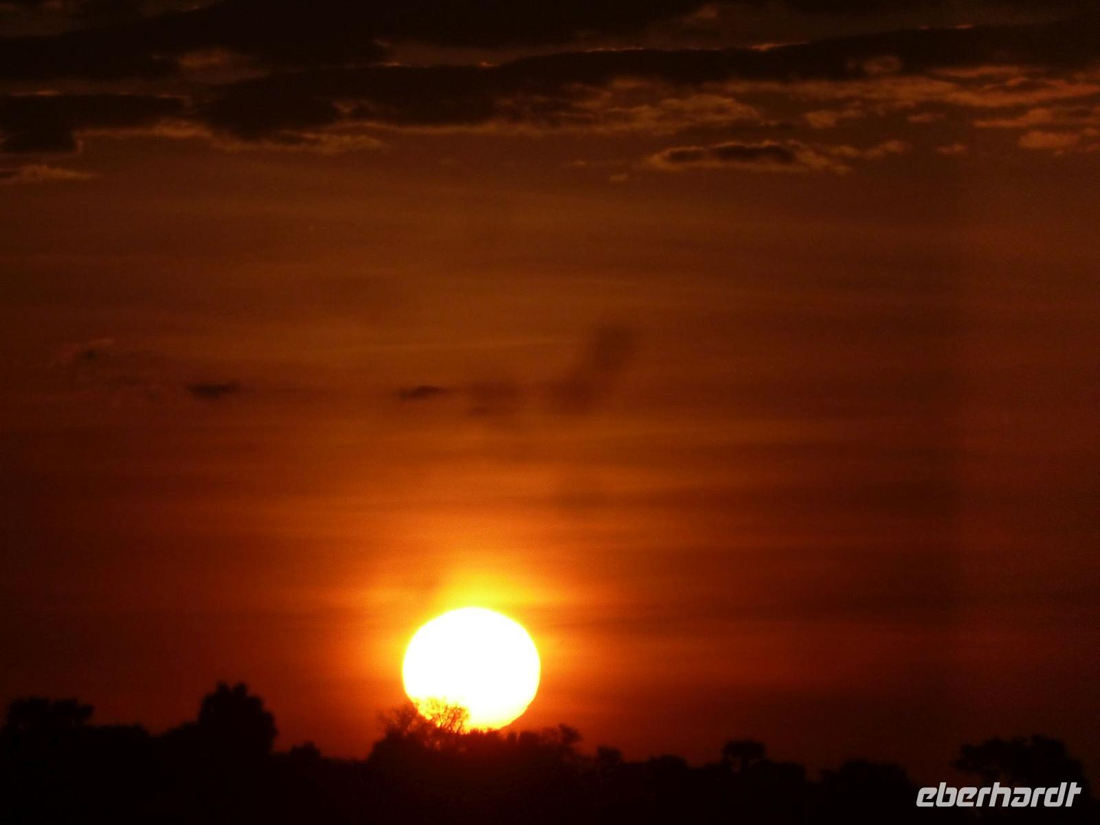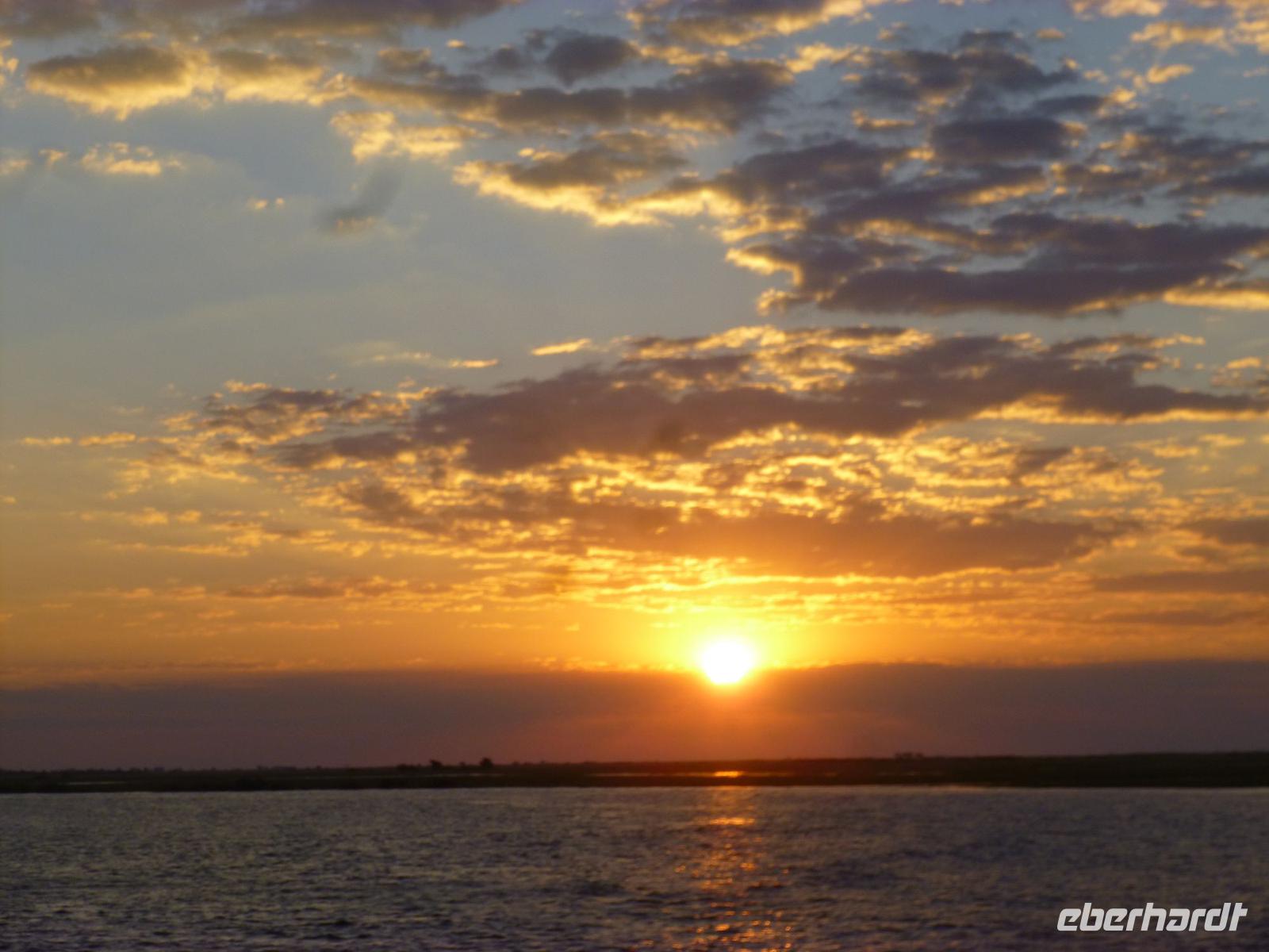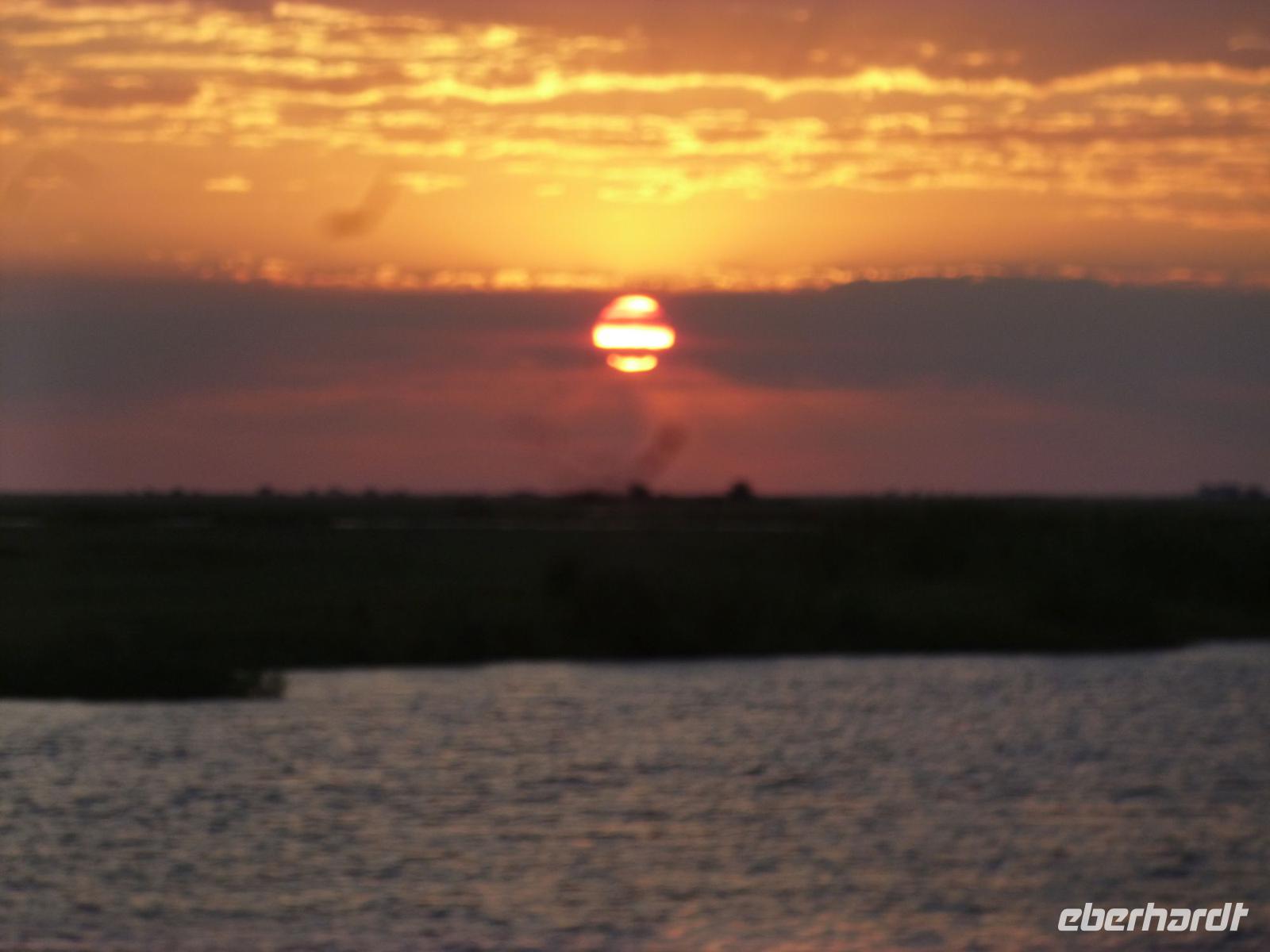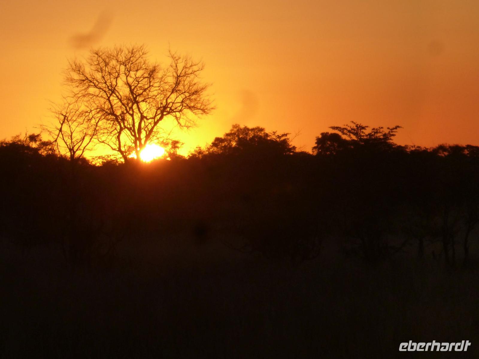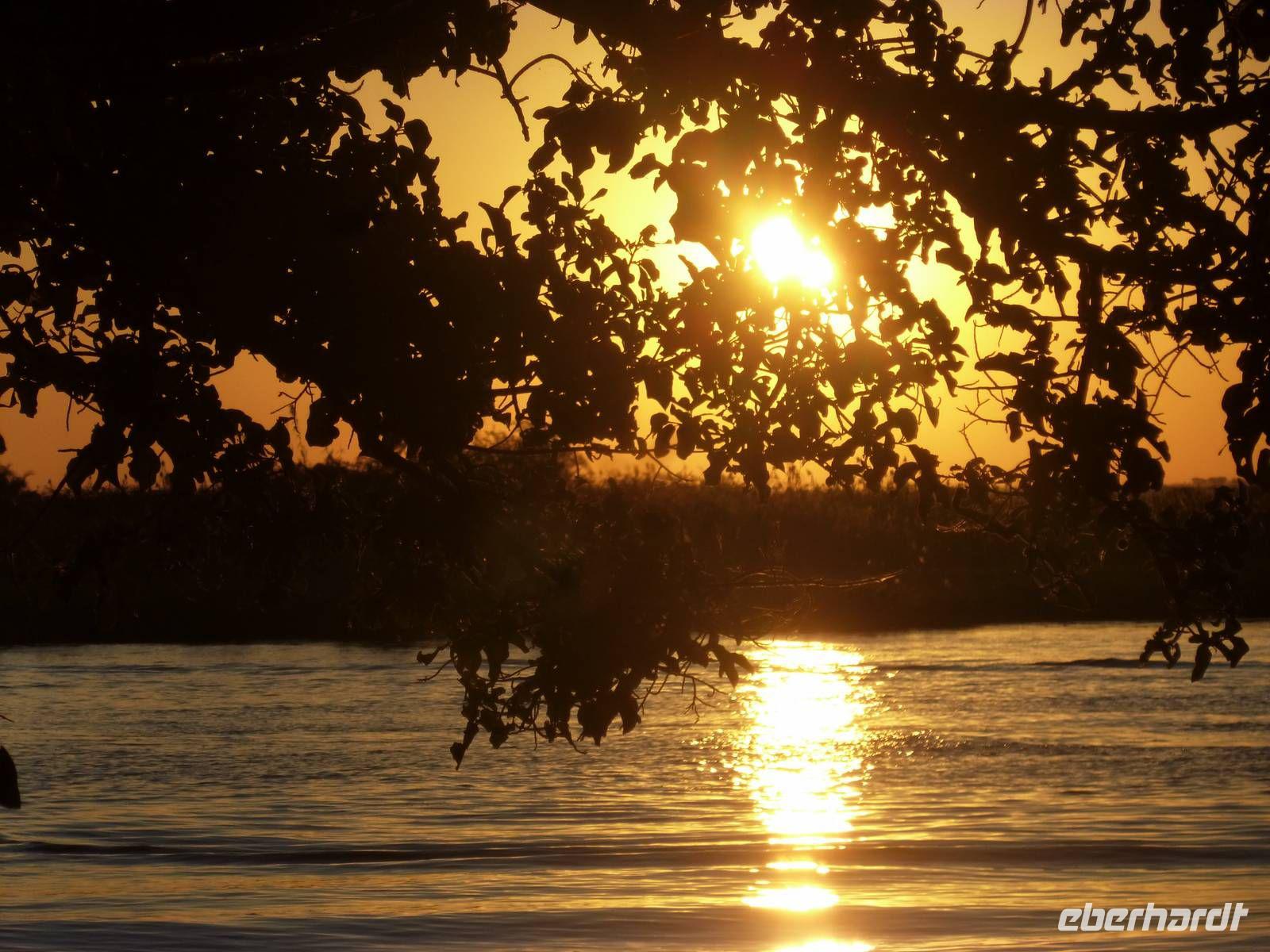 Wir unternehmen einen Spaziergang entlang des Deltaufers. Nach der Besichtigung eines Affenbrotbaumes bestiegen wir den Bus und fuhren zum Homstage von Sharon die in der "Namushasha Lodge" arbeitet. Leider war Sie nicht anwesend, den Sie wurde zum lernen in ein Camp nach Etoscha geschickt. Im Village unternehmen wir eine Führung durch das Dorf mit Erklärungen über das Leben der Menschen. Wir konnten in eine Rundhütte schauen und sahen wie mit der Hand der Mais zermahlen wird. Dieter probierte es auch aus und musste feststellen, dass dies sehr anstrengend ist. Einige Tänze und Musik wurden vor geführt und erläutert. Wir sahen in die Kochtöpfe, die Vorratskammer und das Haus von Sharons Schwester. Am Nachmittag erwartete uns ein Boot für unsere Wildlife-Fahrt durch das Delta. Wir stiegen um in den Monstertruck und fuhren zu einer Safari in den Mudumu Nationalpark. Es waren kaum Tiere zu sehen. Erst am Hufeisensee war eine Elefantenherde zu beobachten. Nach einer kleinen Stärkung am Ufer des Sees fuhren wir zurück zum Boot. Die Elefantenherde kam zurück, doch wir mußten zum Boot zurück. Auf der Rückfahrt legten wir immer wieder einen Halt ein. Weitere Elefantenherden und Paviane umzingelten unseren Truck. Auch die Tsetsebee-Antilope, die schnellste Antilope der Welt läuft uns vor die Kamera. Zum Abschluss des Tages erleben wir einen wunderschönen Sonnenuntergang.