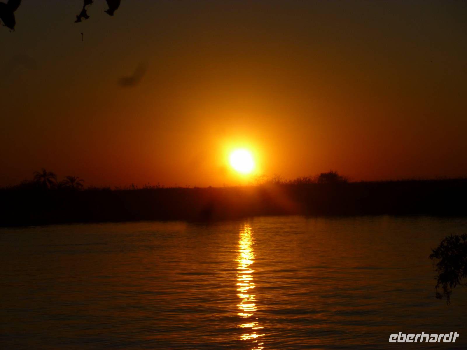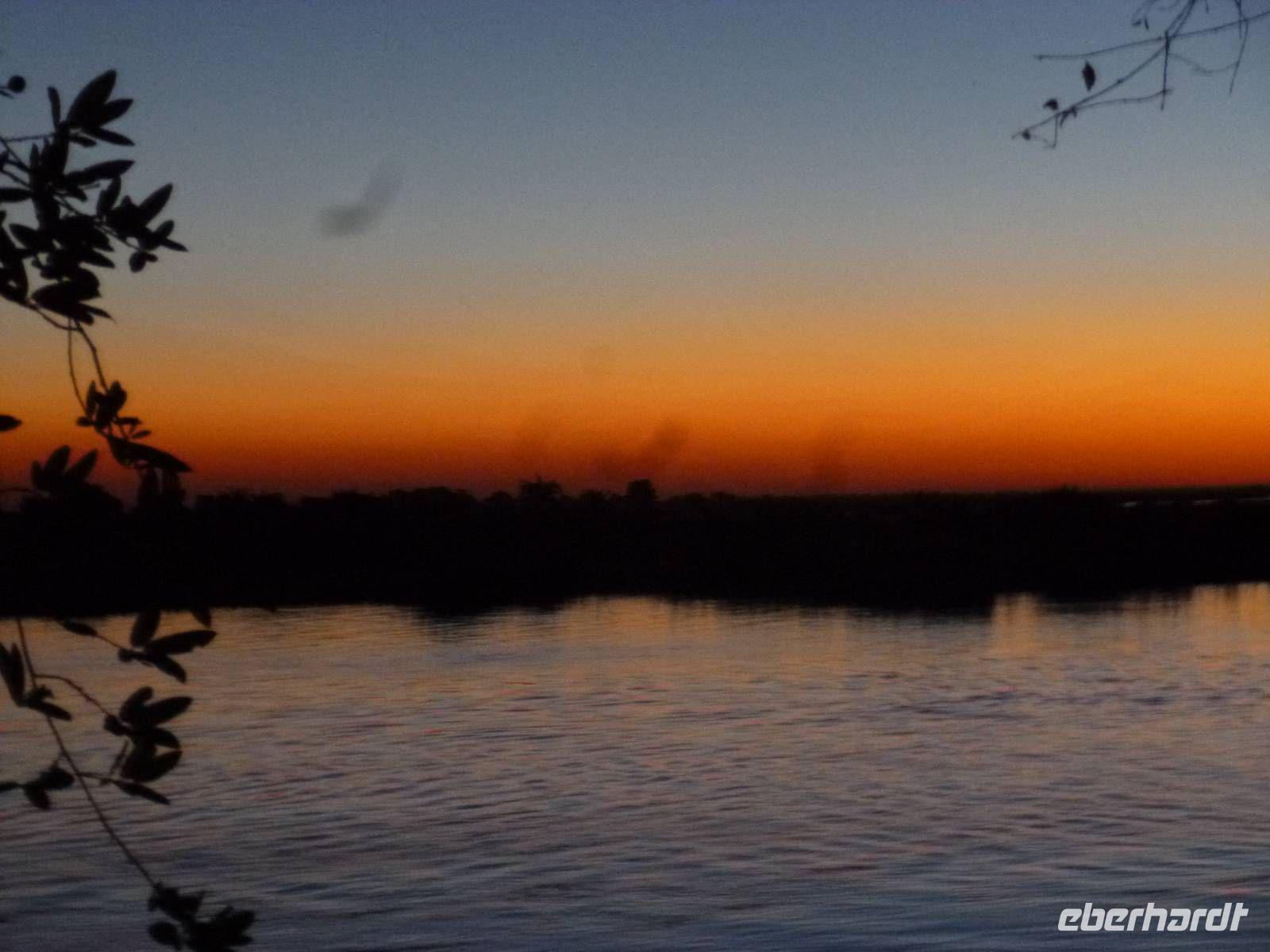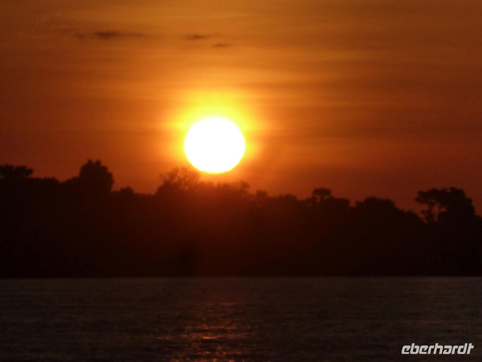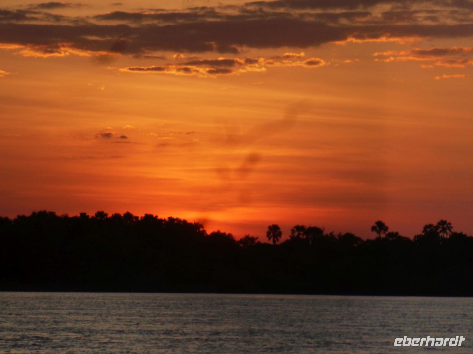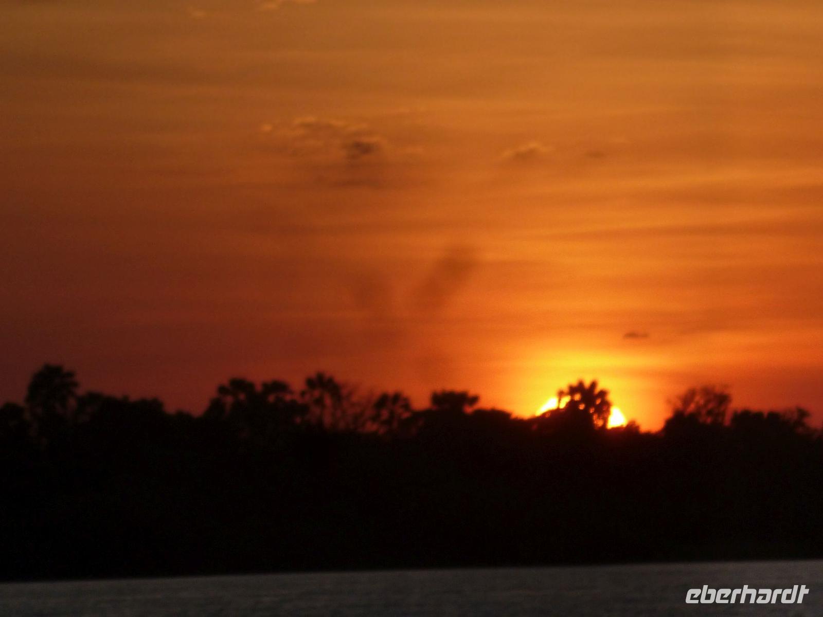 Wir unternehmen einen Spaziergang entlang des Deltaufers. Nach der Besichtigung eines Affenbrotbaumes bestiegen wir den Bus und fuhren zum Homstage von Sharon die in der "Namushasha Lodge" arbeitet. Leider war Sie nicht anwesend, den Sie wurde zum lernen in ein Camp nach Etoscha geschickt. Im Village unternehmen wir eine Führung durch das Dorf mit Erklärungen über das Leben der Menschen. Wir konnten in eine Rundhütte schauen und sahen wie mit der Hand der Mais zermahlen wird. Dieter probierte es auch aus und musste feststellen, dass dies sehr anstrengend ist. Einige Tänze und Musik wurden vor geführt und erläutert. Wir sahen in die Kochtöpfe, die Vorratskammer und das Haus von Sharons Schwester. Am Nachmittag erwartete uns ein Boot für unsere Wildlife-Fahrt durch das Delta. Wir stiegen um in den Monstertruck und fuhren zu einer Safari in den Mudumu Nationalpark. Es waren kaum Tiere zu sehen. Erst am Hufeisensee war eine Elefantenherde zu beobachten. Nach einer kleinen Stärkung am Ufer des Sees fuhren wir zurück zum Boot. Die Elefantenherde kam zurück, doch wir mußten zum Boot zurück. Auf der Rückfahrt legten wir immer wieder einen Halt ein. Weitere Elefantenherden und Paviane umzingelten unseren Truck. Auch die Tsetsebee-Antilope, die schnellste Antilope der Welt läuft uns vor die Kamera. Zum Abschluss des Tages erleben wir einen wunderschönen Sonnenuntergang.
