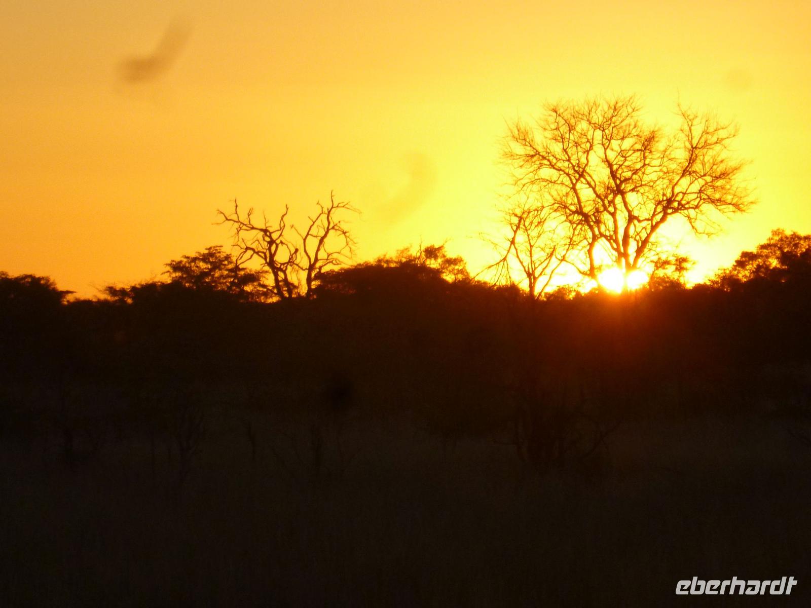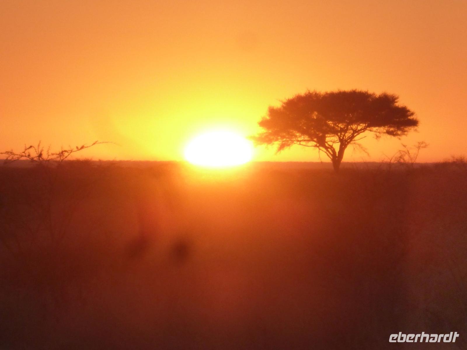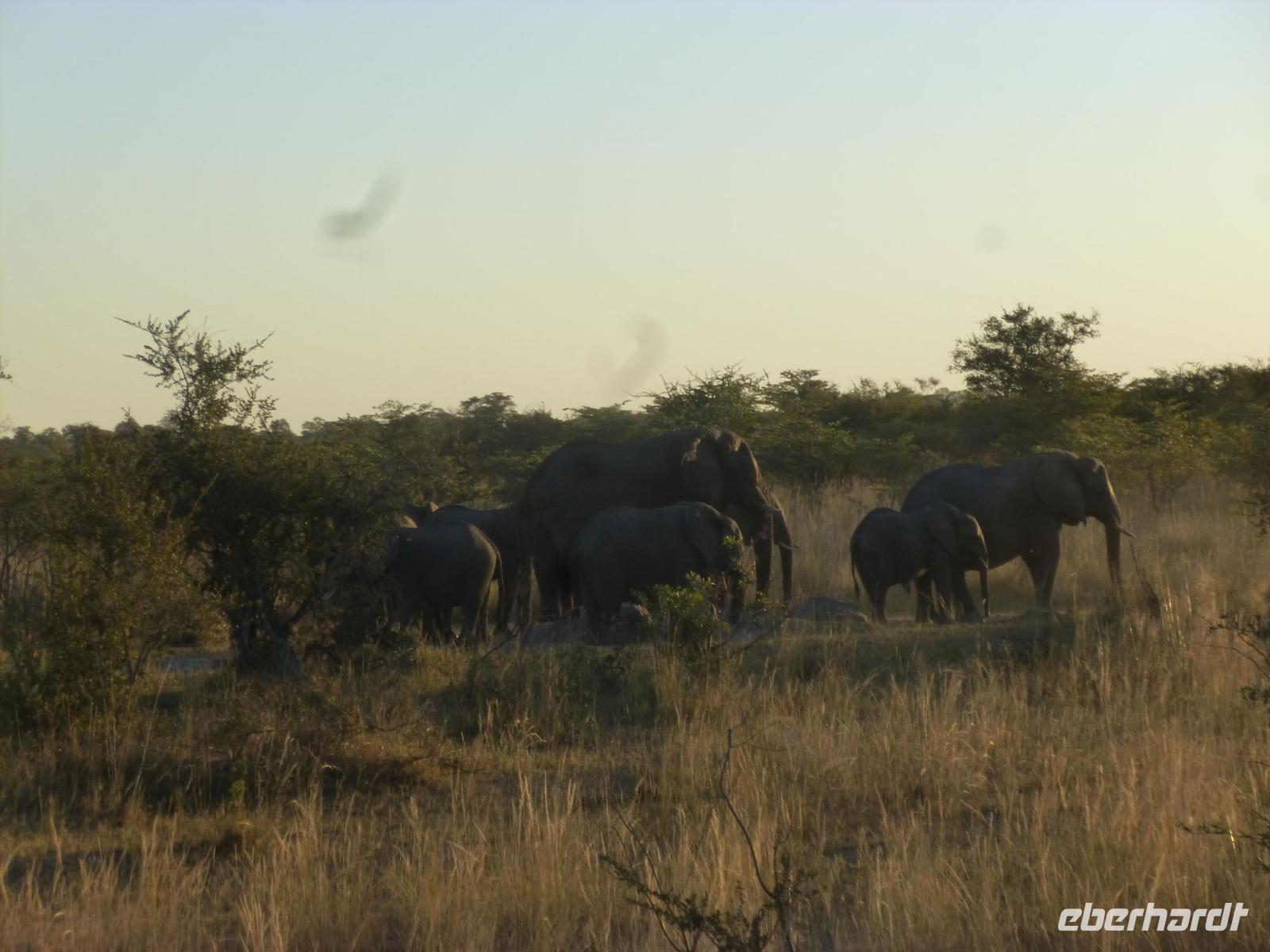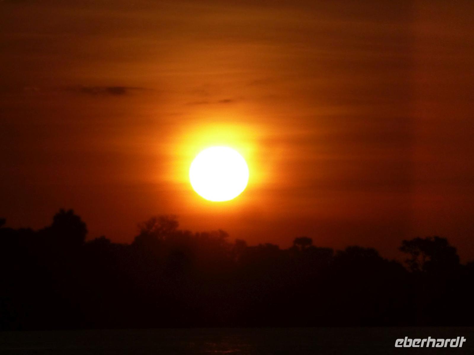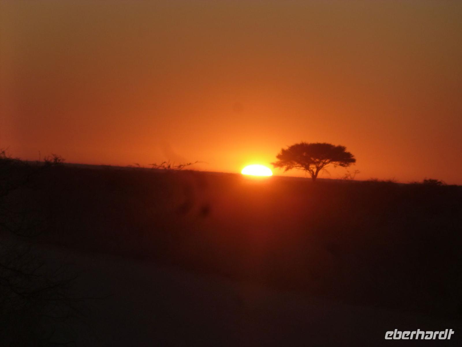 Wir unternehmen einen Spaziergang entlang des Deltaufers. Nach der Besichtigung eines Affenbrotbaumes bestiegen wir den Bus und fuhren zum Homstage von Sharon die in der "Namushasha Lodge" arbeitet. Leider war Sie nicht anwesend, den Sie wurde zum lernen in ein Camp nach Etoscha geschickt. Im Village unternehmen wir eine Führung durch das Dorf mit Erklärungen über das Leben der Menschen. Wir konnten in eine Rundhütte schauen und sahen wie mit der Hand der Mais zermahlen wird. Dieter probierte es auch aus und musste feststellen, dass dies sehr anstrengend ist. Einige Tänze und Musik wurden vor geführt und erläutert. Wir sahen in die Kochtöpfe, die Vorratskammer und das Haus von Sharons Schwester. Am Nachmittag erwartete uns ein Boot für unsere Wildlife-Fahrt durch das Delta. Wir stiegen um in den Monstertruck und fuhren zu einer Safari in den Mudumu Nationalpark. Es waren kaum Tiere zu sehen. Erst am Hufeisensee war eine Elefantenherde zu beobachten. Nach einer kleinen Stärkung am Ufer des Sees fuhren wir zurück zum Boot. Die Elefantenherde kam zurück, doch wir mußten zum Boot zurück. Auf der Rückfahrt legten wir immer wieder einen Halt ein. Weitere Elefantenherden und Paviane umzingelten unseren Truck. Auch die Tsetsebee-Antilope, die schnellste Antilope der Welt läuft uns vor die Kamera. Zum Abschluss des Tages erleben wir einen wunderschönen Sonnenuntergang.