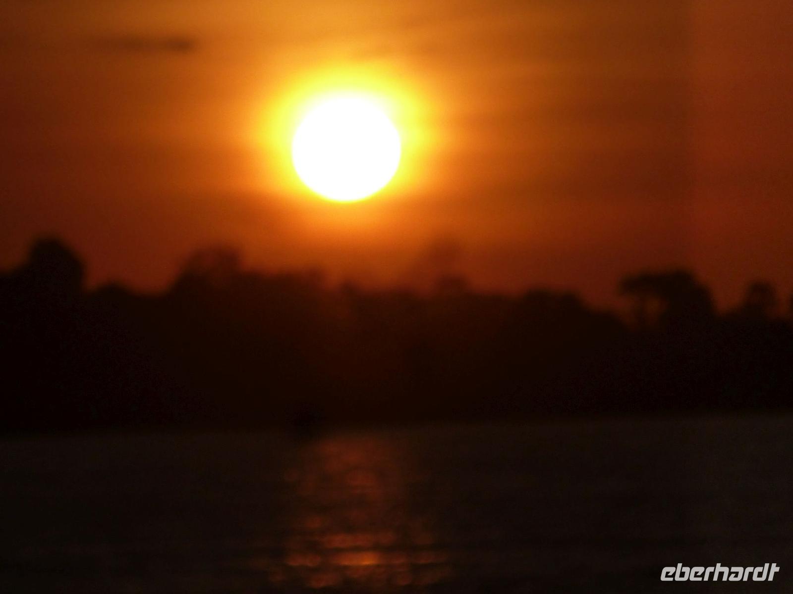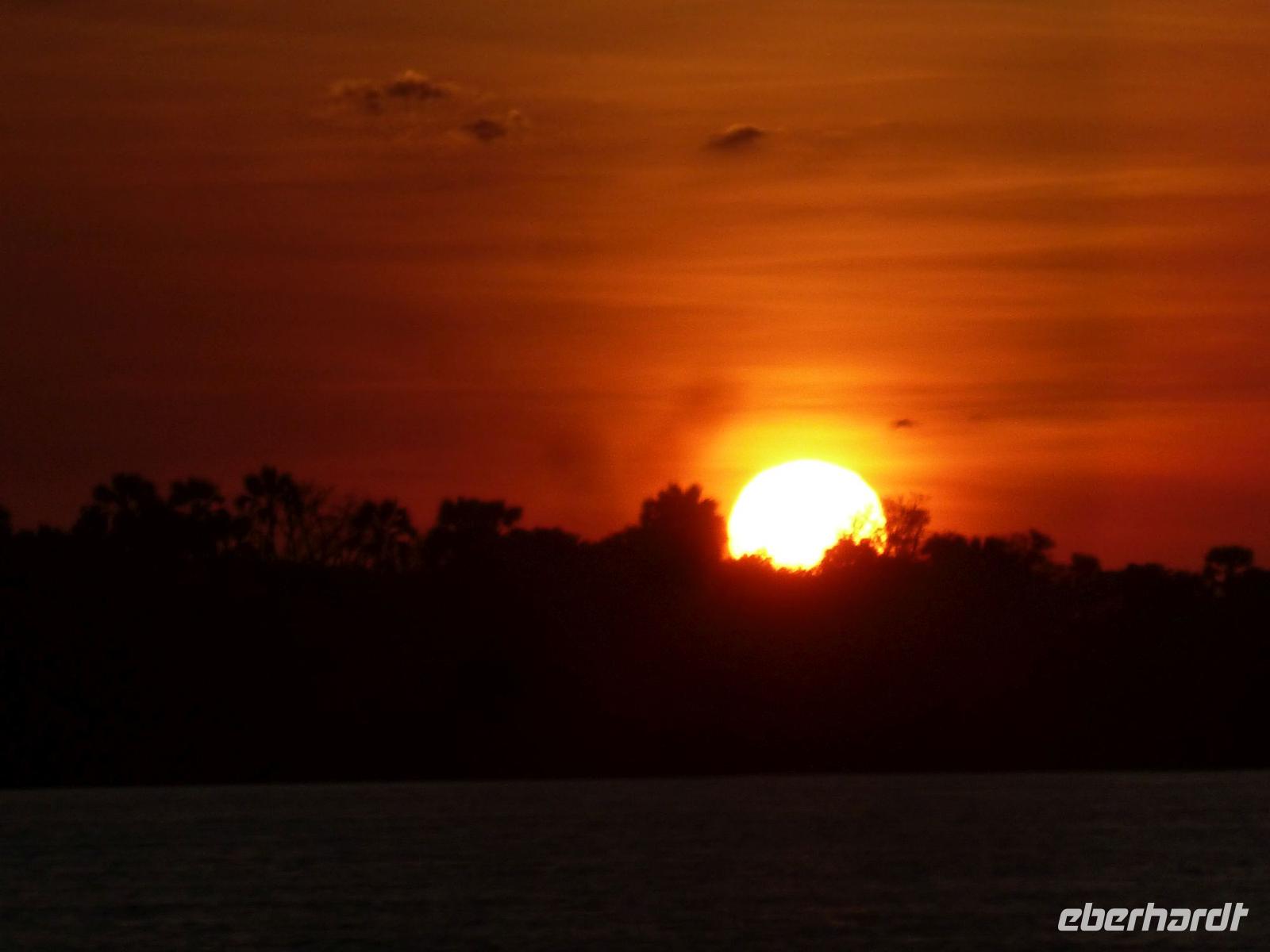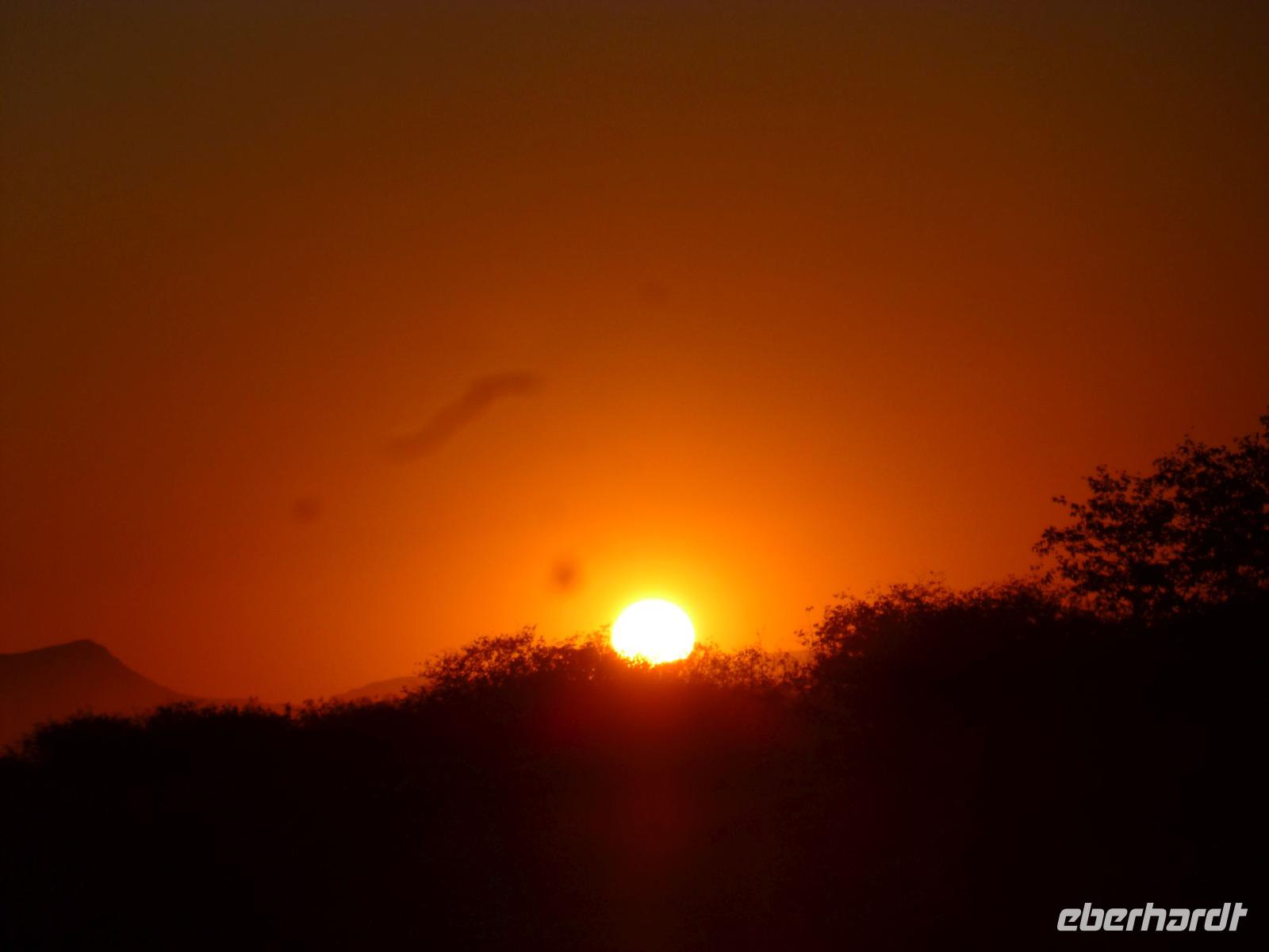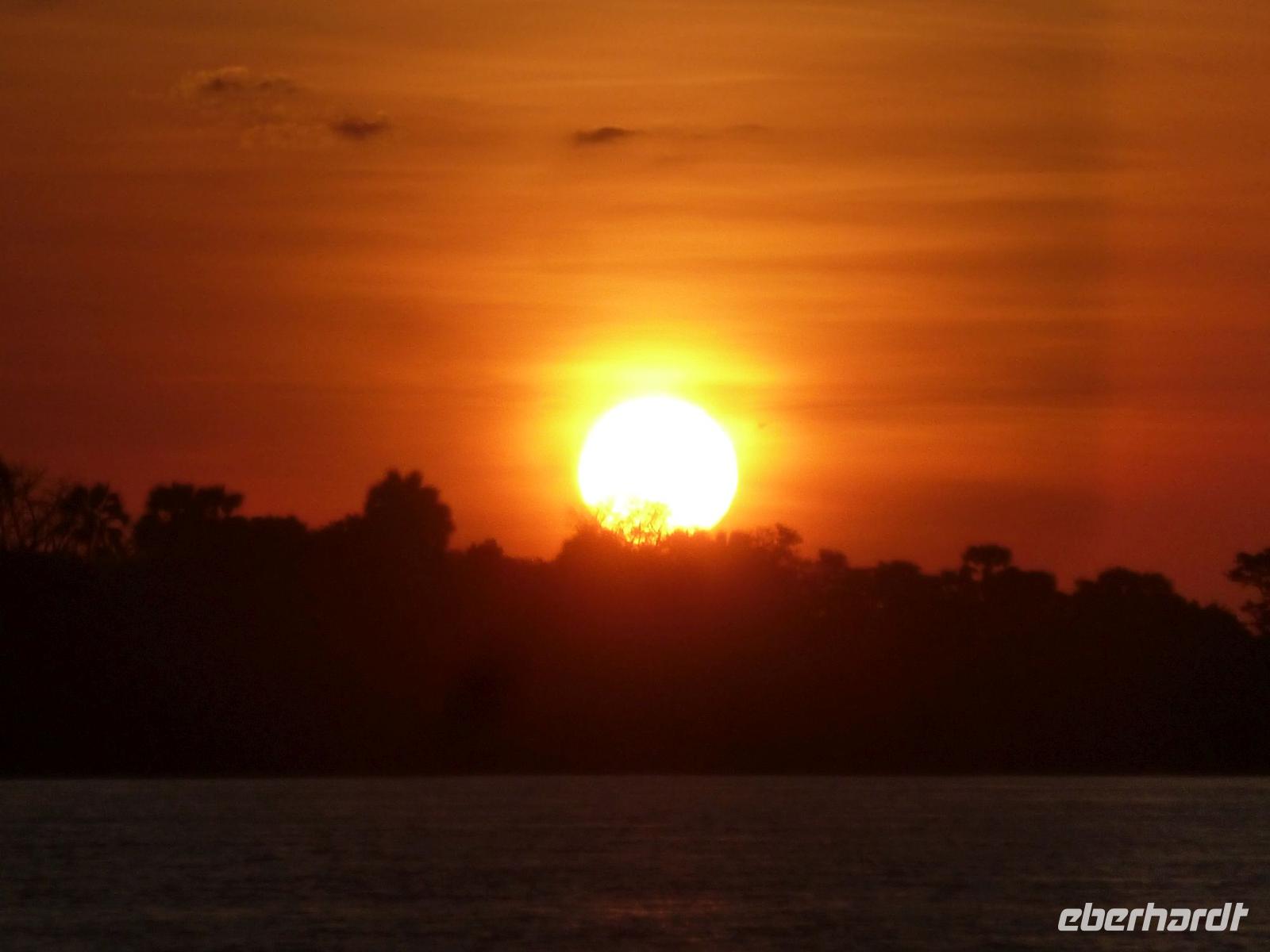 Wir unternehmen einen Spaziergang entlang des Deltaufers. Nach der Besichtigung eines Affenbrotbaumes bestiegen wir den Bus und fuhren zum Homstage von Sharon die in der "Namushasha Lodge" arbeitet. Leider war Sie nicht anwesend, den Sie wurde zum lernen in ein Camp nach Etoscha geschickt. Im Village unternehmen wir eine Führung durch das Dorf mit Erklärungen über das Leben der Menschen. Wir konnten in eine Rundhütte schauen und sahen wie mit der Hand der Mais zermahlen wird. Dieter probierte es auch aus und musste feststellen, dass dies sehr anstrengend ist. Einige Tänze und Musik wurden vor geführt und erläutert. Wir sahen in die Kochtöpfe, die Vorratskammer und das Haus von Sharons Schwester. Am Nachmittag erwartete uns ein Boot für unsere Wildlife-Fahrt durch das Delta. Wir stiegen um in den Monstertruck und fuhren zu einer Safari in den Mudumu Nationalpark. Es waren kaum Tiere zu sehen. Erst am Hufeisensee war eine Elefantenherde zu beobachten. Nach einer kleinen Stärkung am Ufer des Sees fuhren wir zurück zum Boot. Die Elefantenherde kam zurück, doch wir mußten zum Boot zurück. Auf der Rückfahrt legten wir immer wieder einen Halt ein. Weitere Elefantenherden und Paviane umzingelten unseren Truck. Auch die Tsetsebee-Antilope, die schnellste Antilope der Welt läuft uns vor die Kamera. Zum Abschluss des Tages erleben wir einen wunderschönen Sonnenuntergang.