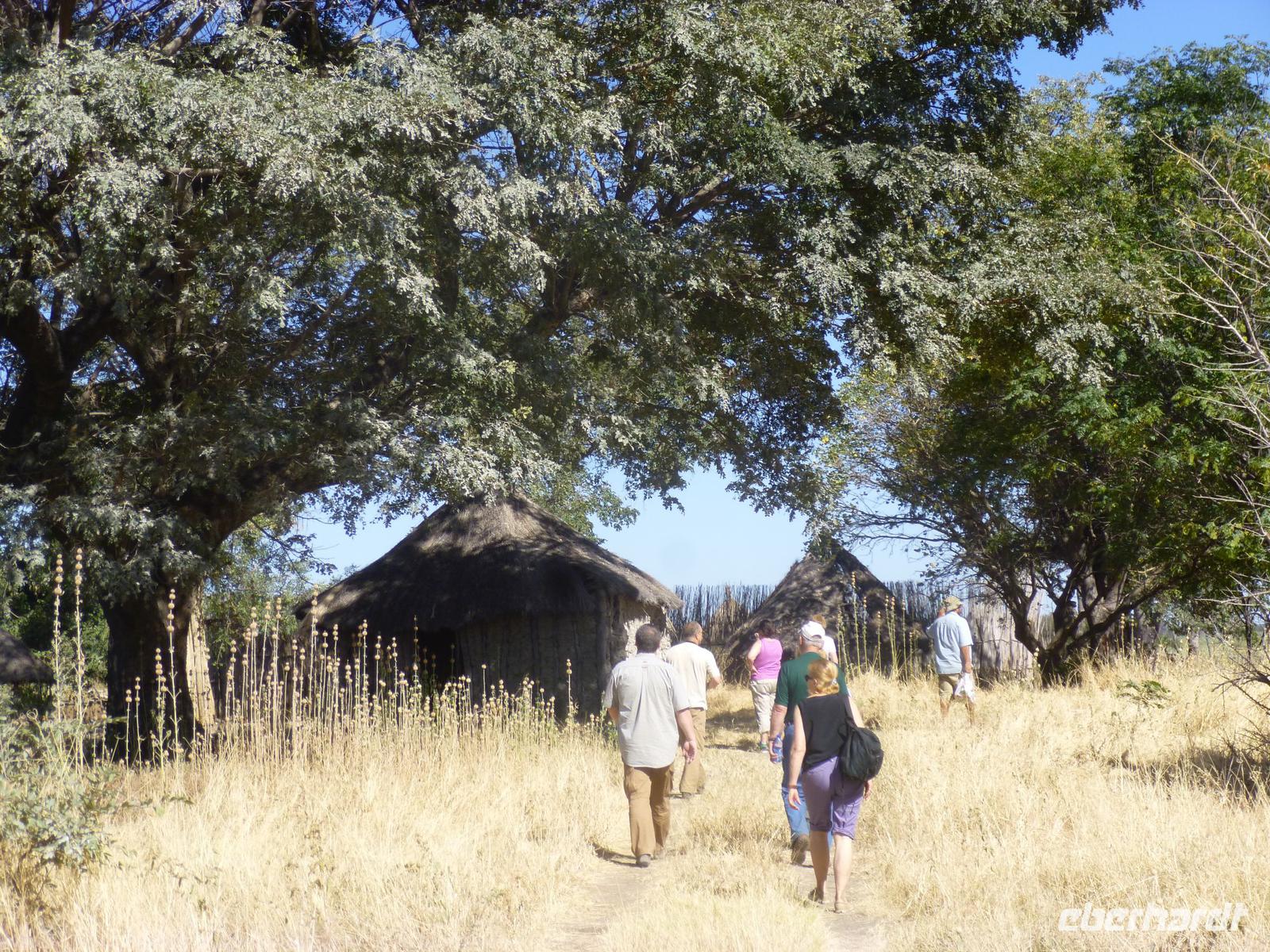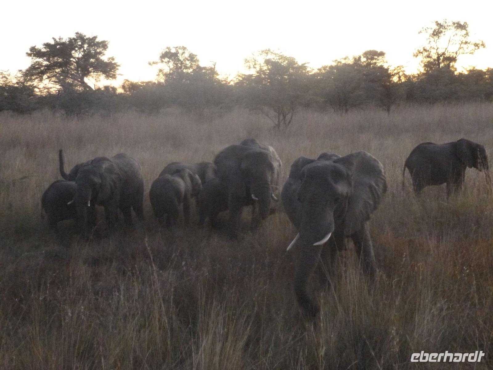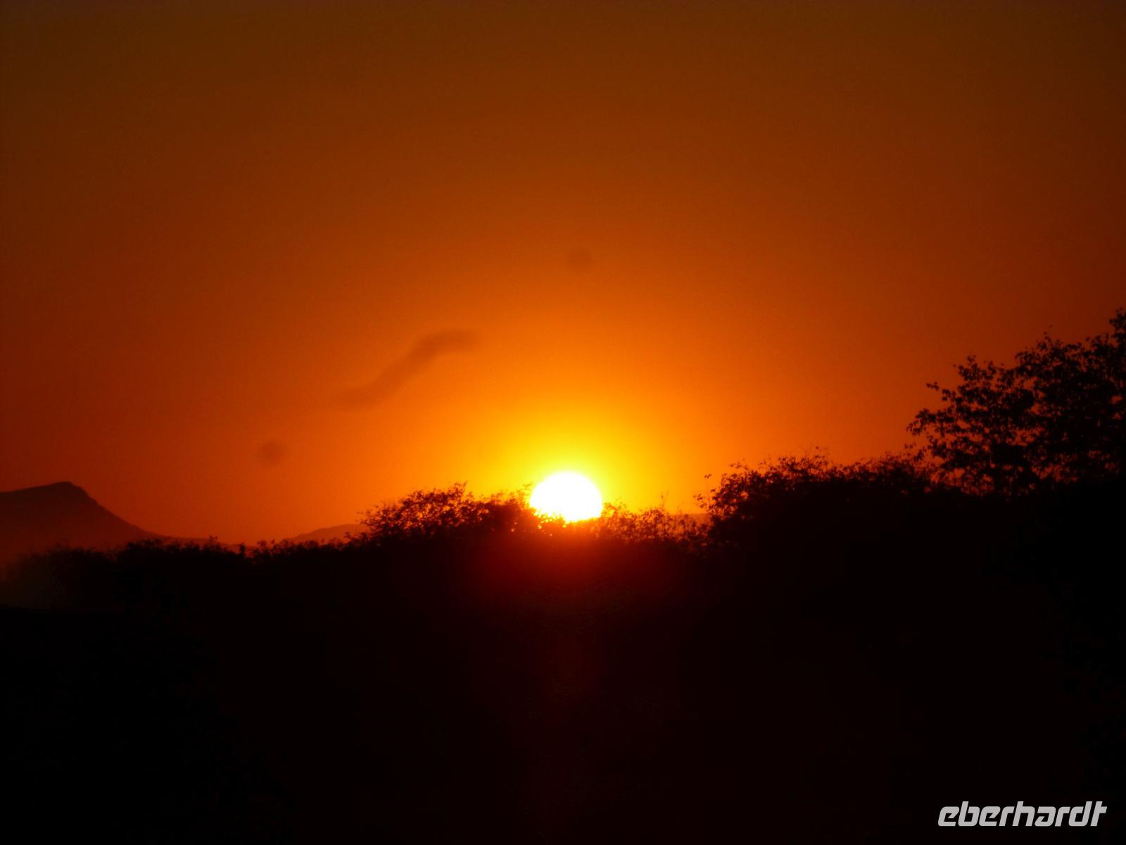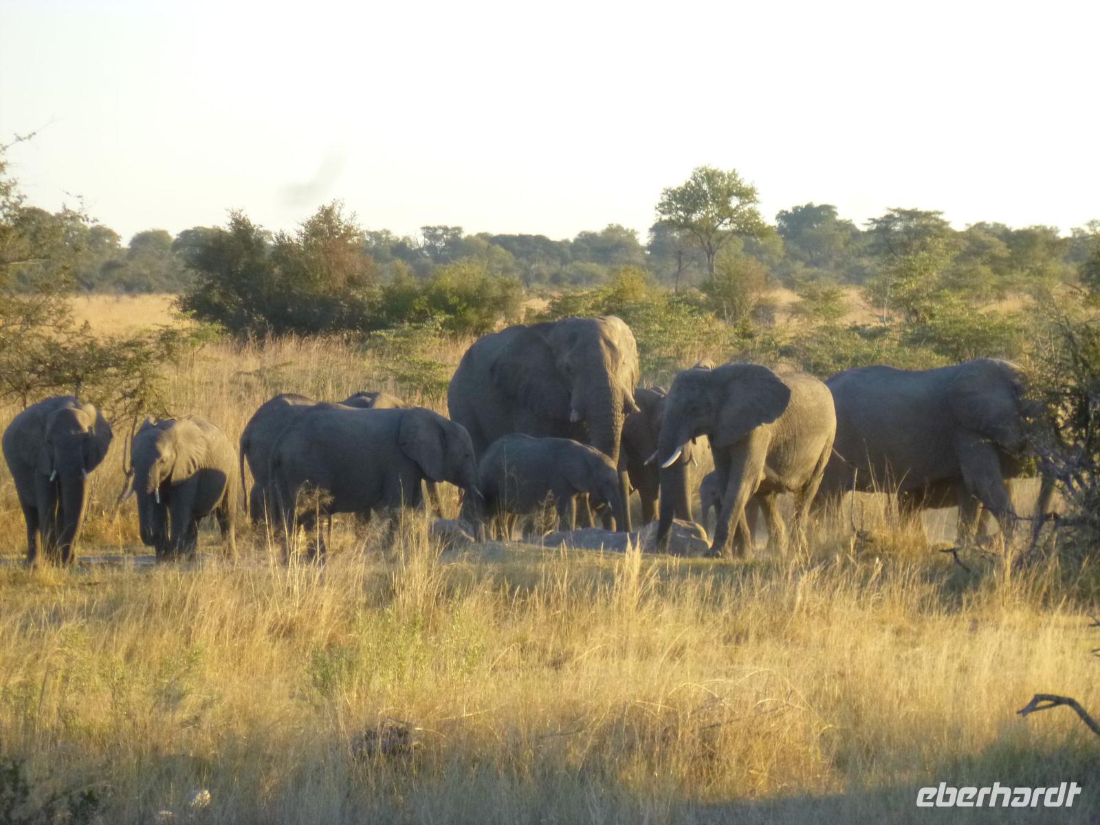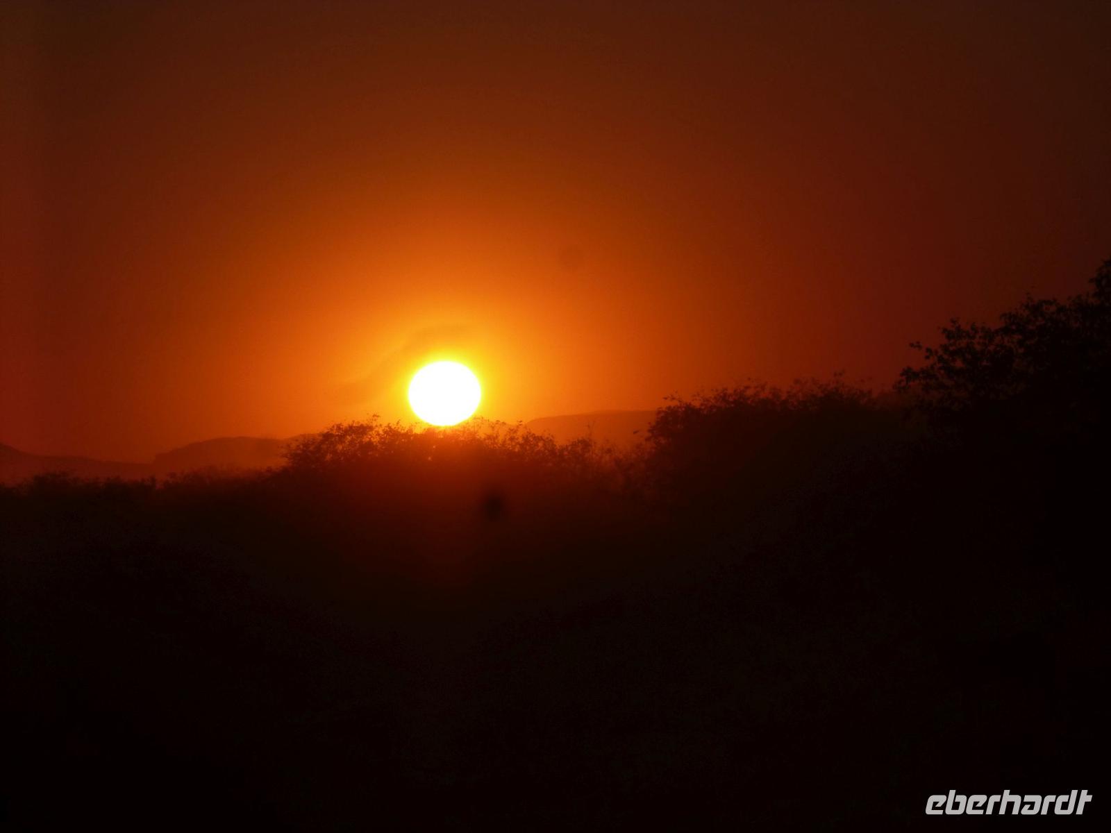 Wir unternehmen einen Spaziergang entlang des Deltaufers. Nach der Besichtigung eines Affenbrotbaumes bestiegen wir den Bus und fuhren zum Homstage von Sharon die in der "Namushasha Lodge" arbeitet. Leider war Sie nicht anwesend, den Sie wurde zum lernen in ein Camp nach Etoscha geschickt. Im Village unternehmen wir eine Führung durch das Dorf mit Erklärungen über das Leben der Menschen. Wir konnten in eine Rundhütte schauen und sahen wie mit der Hand der Mais zermahlen wird. Dieter probierte es auch aus und musste feststellen, dass dies sehr anstrengend ist. Einige Tänze und Musik wurden vor geführt und erläutert. Wir sahen in die Kochtöpfe, die Vorratskammer und das Haus von Sharons Schwester. Am Nachmittag erwartete uns ein Boot für unsere Wildlife-Fahrt durch das Delta. Wir stiegen um in den Monstertruck und fuhren zu einer Safari in den Mudumu Nationalpark. Es waren kaum Tiere zu sehen. Erst am Hufeisensee war eine Elefantenherde zu beobachten. Nach einer kleinen Stärkung am Ufer des Sees fuhren wir zurück zum Boot. Die Elefantenherde kam zurück, doch wir mußten zum Boot zurück. Auf der Rückfahrt legten wir immer wieder einen Halt ein. Weitere Elefantenherden und Paviane umzingelten unseren Truck. Auch die Tsetsebee-Antilope, die schnellste Antilope der Welt läuft uns vor die Kamera. Zum Abschluss des Tages erleben wir einen wunderschönen Sonnenuntergang.