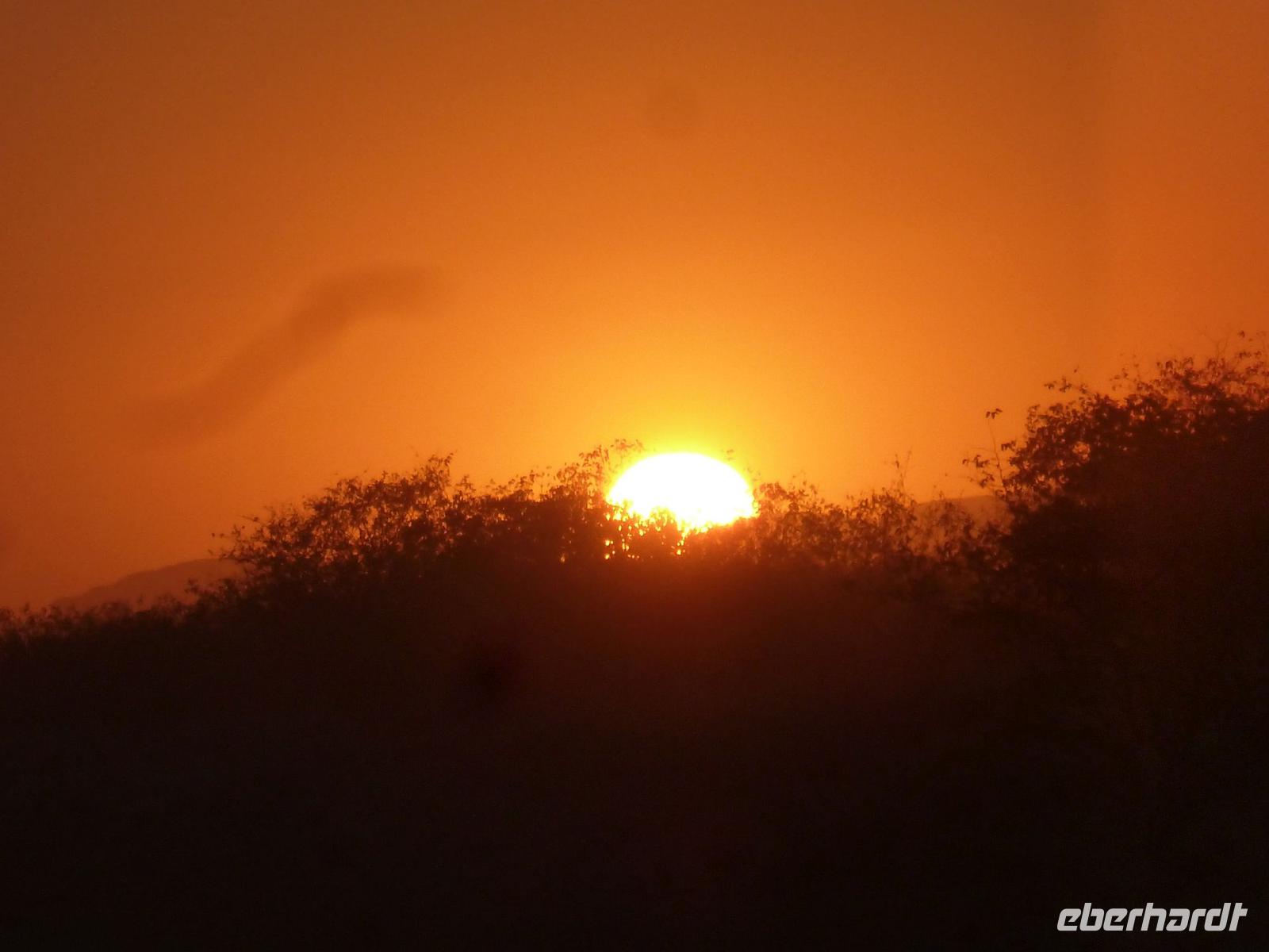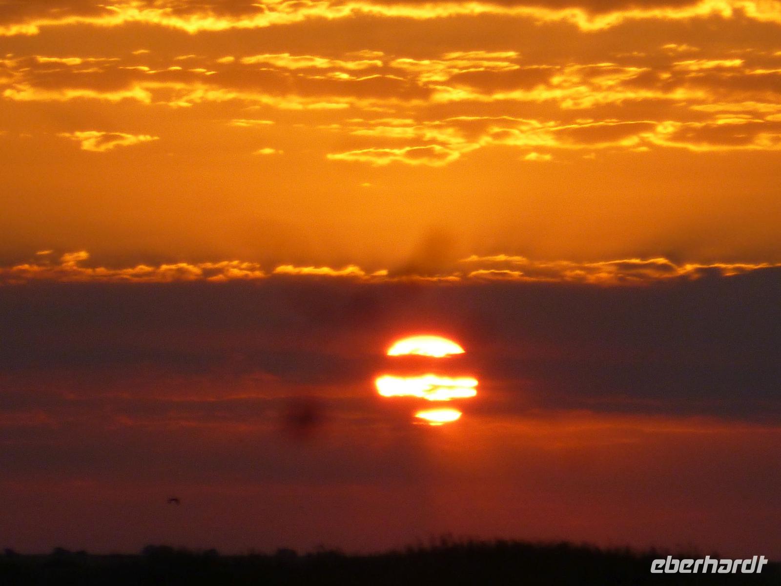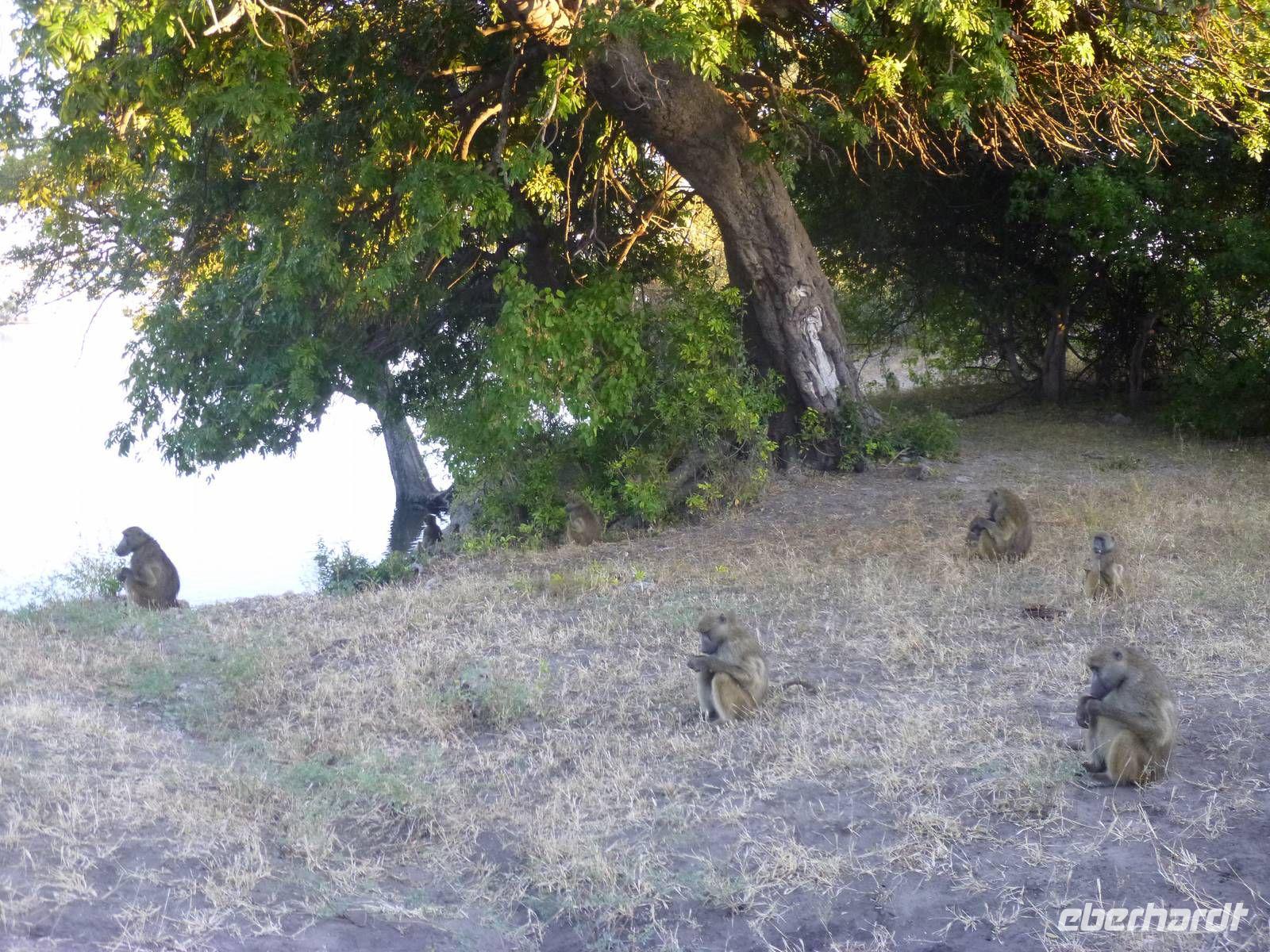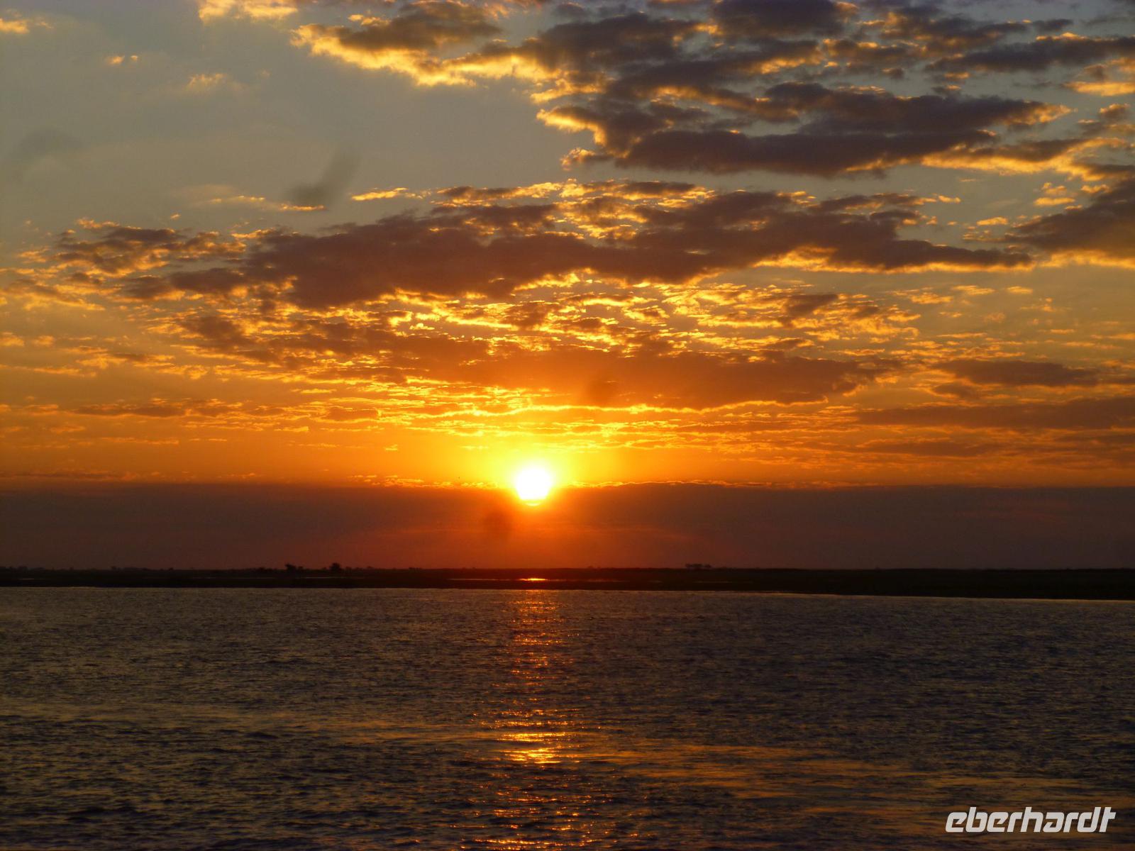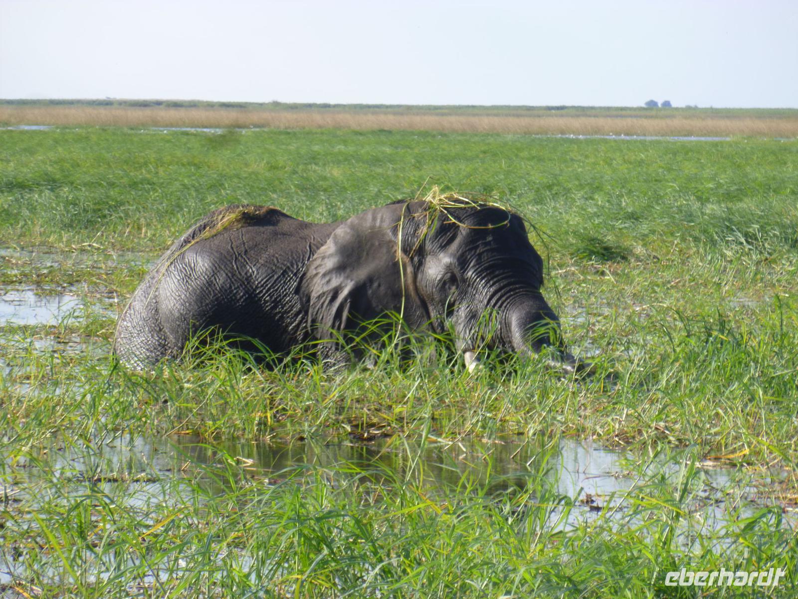 Wir unternehmen einen Spaziergang entlang des Deltaufers. Nach der Besichtigung eines Affenbrotbaumes bestiegen wir den Bus und fuhren zum Homstage von Sharon die in der "Namushasha Lodge" arbeitet. Leider war Sie nicht anwesend, den Sie wurde zum lernen in ein Camp nach Etoscha geschickt. Im Village unternehmen wir eine Führung durch das Dorf mit Erklärungen über das Leben der Menschen. Wir konnten in eine Rundhütte schauen und sahen wie mit der Hand der Mais zermahlen wird. Dieter probierte es auch aus und musste feststellen, dass dies sehr anstrengend ist. Einige Tänze und Musik wurden vor geführt und erläutert. Wir sahen in die Kochtöpfe, die Vorratskammer und das Haus von Sharons Schwester. Am Nachmittag erwartete uns ein Boot für unsere Wildlife-Fahrt durch das Delta. Wir stiegen um in den Monstertruck und fuhren zu einer Safari in den Mudumu Nationalpark. Es waren kaum Tiere zu sehen. Erst am Hufeisensee war eine Elefantenherde zu beobachten. Nach einer kleinen Stärkung am Ufer des Sees fuhren wir zurück zum Boot. Die Elefantenherde kam zurück, doch wir mußten zum Boot zurück. Auf der Rückfahrt legten wir immer wieder einen Halt ein. Weitere Elefantenherden und Paviane umzingelten unseren Truck. Auch die Tsetsebee-Antilope, die schnellste Antilope der Welt läuft uns vor die Kamera. Zum Abschluss des Tages erleben wir einen wunderschönen Sonnenuntergang.