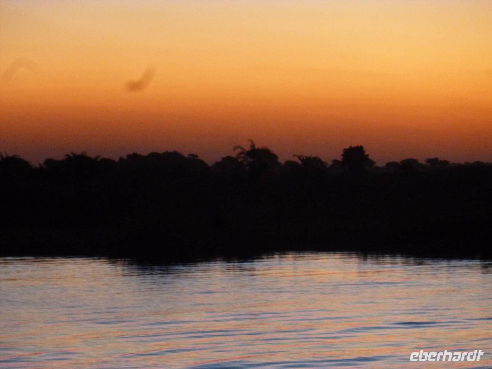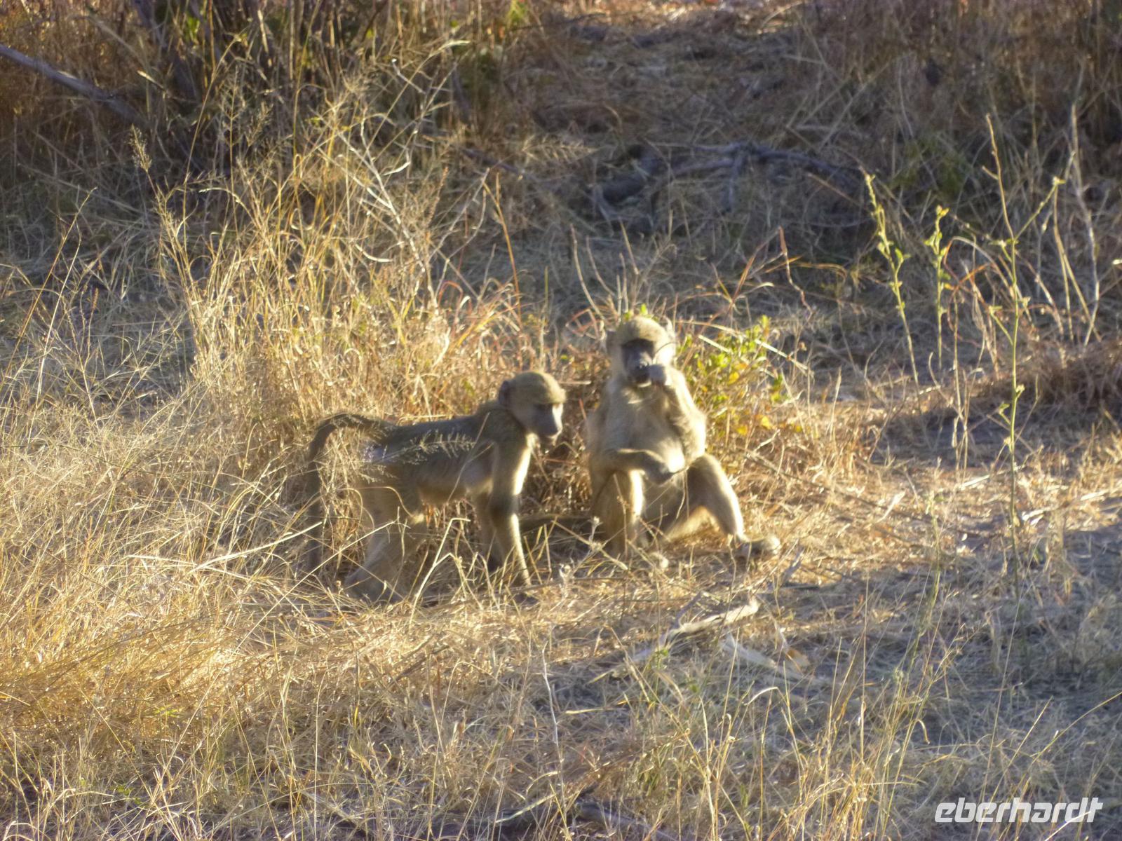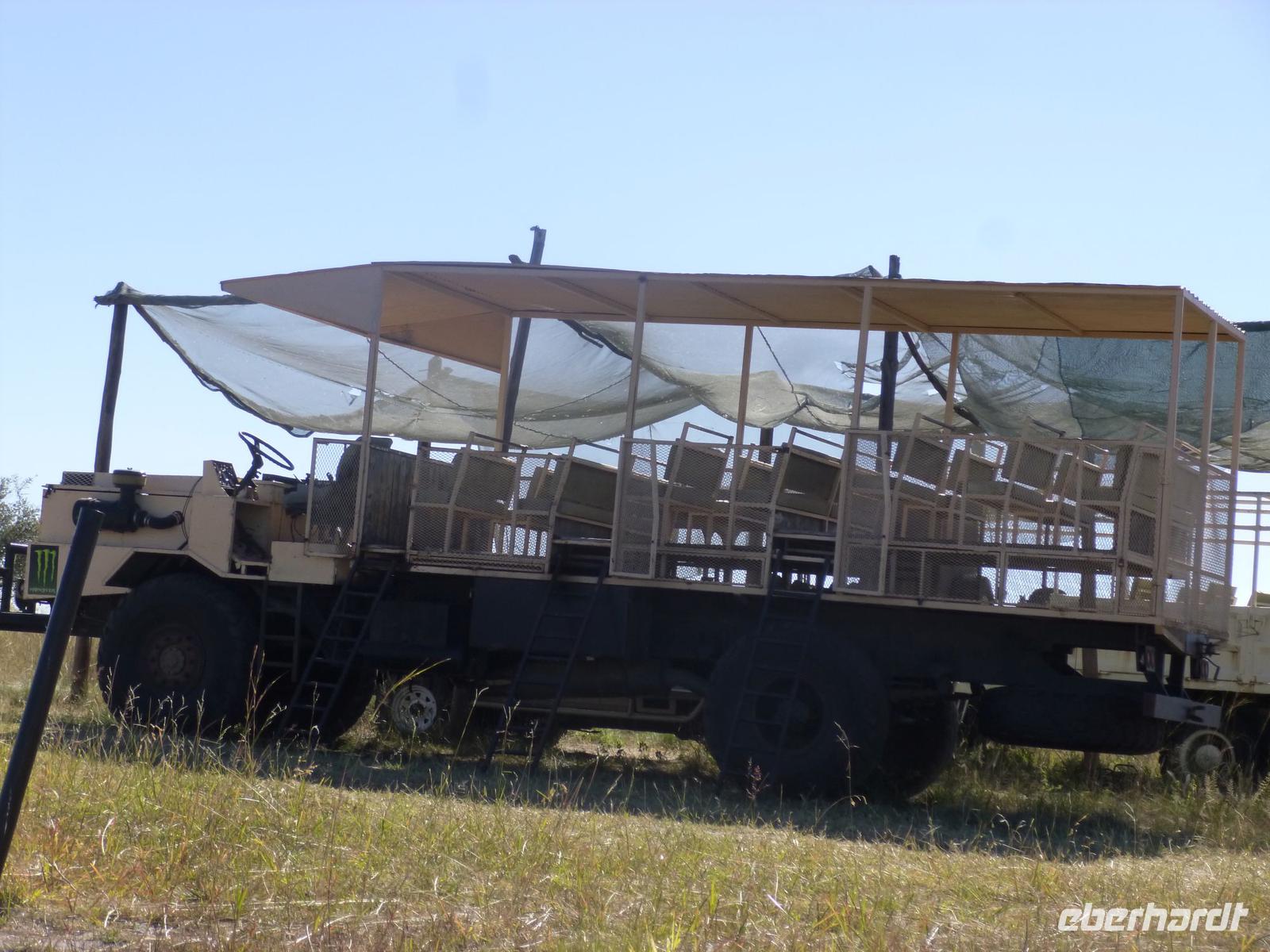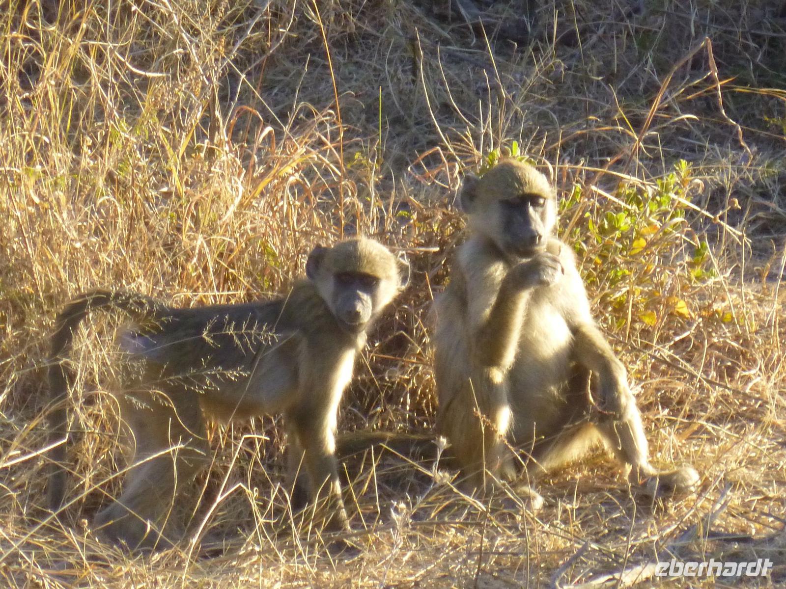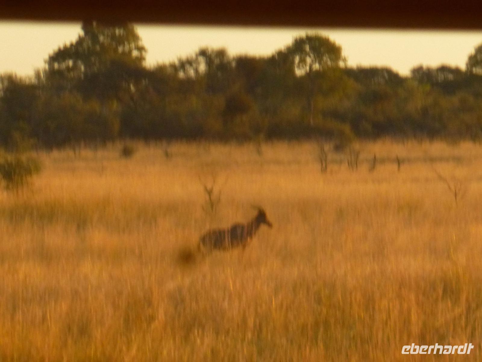 Wir unternehmen einen Spaziergang entlang des Deltaufers. Nach der Besichtigung eines Affenbrotbaumes bestiegen wir den Bus und fuhren zum Homstage von Sharon die in der "Namushasha Lodge" arbeitet. Leider war Sie nicht anwesend, den Sie wurde zum lernen in ein Camp nach Etoscha geschickt. Im Village unternehmen wir eine Führung durch das Dorf mit Erklärungen über das Leben der Menschen. Wir konnten in eine Rundhütte schauen und sahen wie mit der Hand der Mais zermahlen wird. Dieter probierte es auch aus und musste feststellen, dass dies sehr anstrengend ist. Einige Tänze und Musik wurden vor geführt und erläutert. Wir sahen in die Kochtöpfe, die Vorratskammer und das Haus von Sharons Schwester. Am Nachmittag erwartete uns ein Boot für unsere Wildlife-Fahrt durch das Delta. Wir stiegen um in den Monstertruck und fuhren zu einer Safari in den Mudumu Nationalpark. Es waren kaum Tiere zu sehen. Erst am Hufeisensee war eine Elefantenherde zu beobachten. Nach einer kleinen Stärkung am Ufer des Sees fuhren wir zurück zum Boot. Die Elefantenherde kam zurück, doch wir mußten zum Boot zurück. Auf der Rückfahrt legten wir immer wieder einen Halt ein. Weitere Elefantenherden und Paviane umzingelten unseren Truck. Auch die Tsetsebee-Antilope, die schnellste Antilope der Welt läuft uns vor die Kamera. Zum Abschluss des Tages erleben wir einen wunderschönen Sonnenuntergang.
