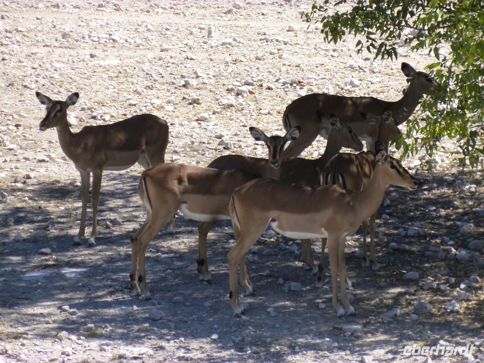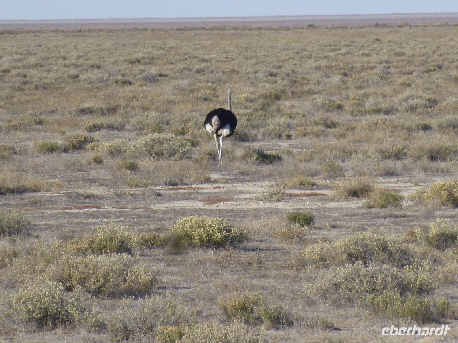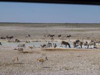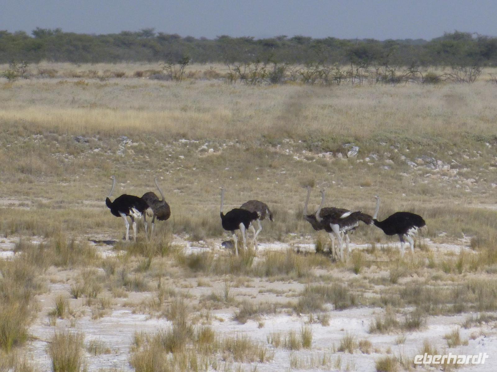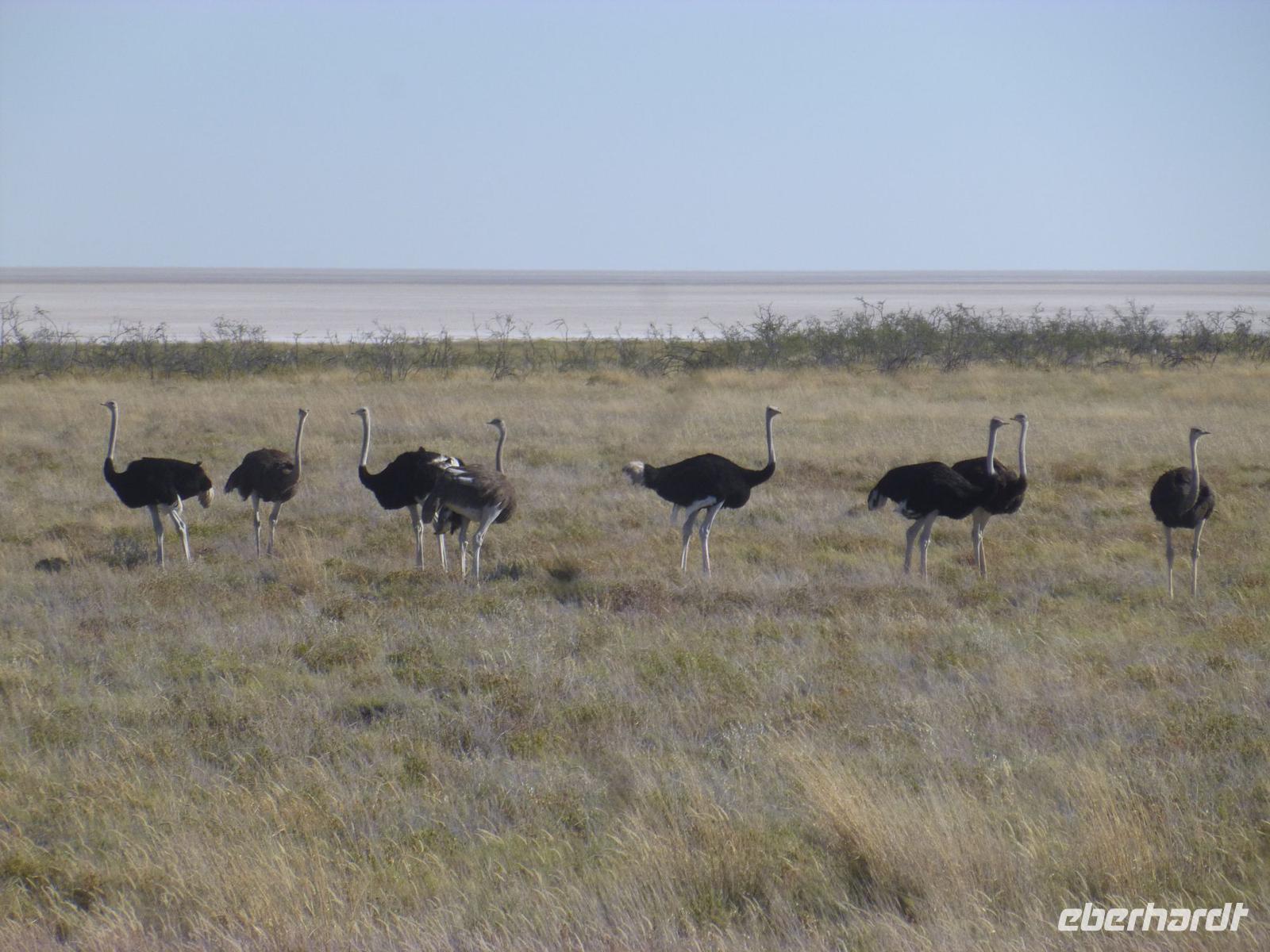 Wir fahren durch den Nationalpark und beobachten einige Tiere wie Sträuße, Zebras, Kuhantilope, Riesentrappe, Kudus und den Sekretär. An einem Wasserloch hatten wir besonders viel Glück endlich haben wir Löwen gesichtet - wir waren happy. Wir erreichen die Etosha-Pfanne, die eigentlich um diese Zeit noch mit Wasser gefüllt ist, durch die große Trockenheit jedoch wie ein großer Salzsee aussieht. In der unendlichen Weite des Sees sahen wir eine Fata Morgana. Man konnte denken, im Hintergrund einen großen See zu entdecken. Wir hielten in Namutoni an einem ehemaligen alten deutschen Fort. Bevor wir den Nationalpark verlassen haben, sahen wir noch die Dikdik-Antilope, die kleinste ihrer Art. Wir besuchten den Otjikotosee. Früher war dieser eine ehemalige Höhle, wo vor einigen Jahren das Dach herunter gestürzt ist und somit ein See entstanden ist. Bevor die deutschen Truppen sich zurück gezogen haben, wurden im See Waffen und Munitionen versengt. Diese wurden 1984 zum Teil geborgen und befinden sich im Museum in Tsuneb.