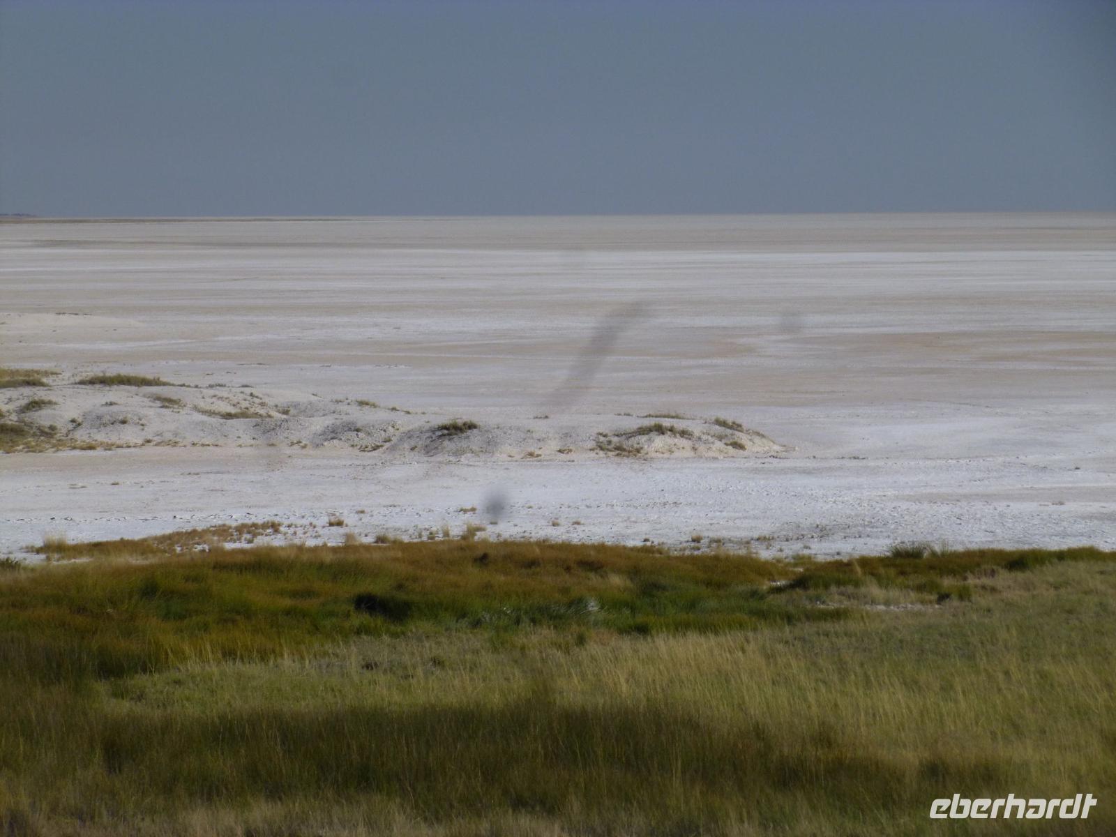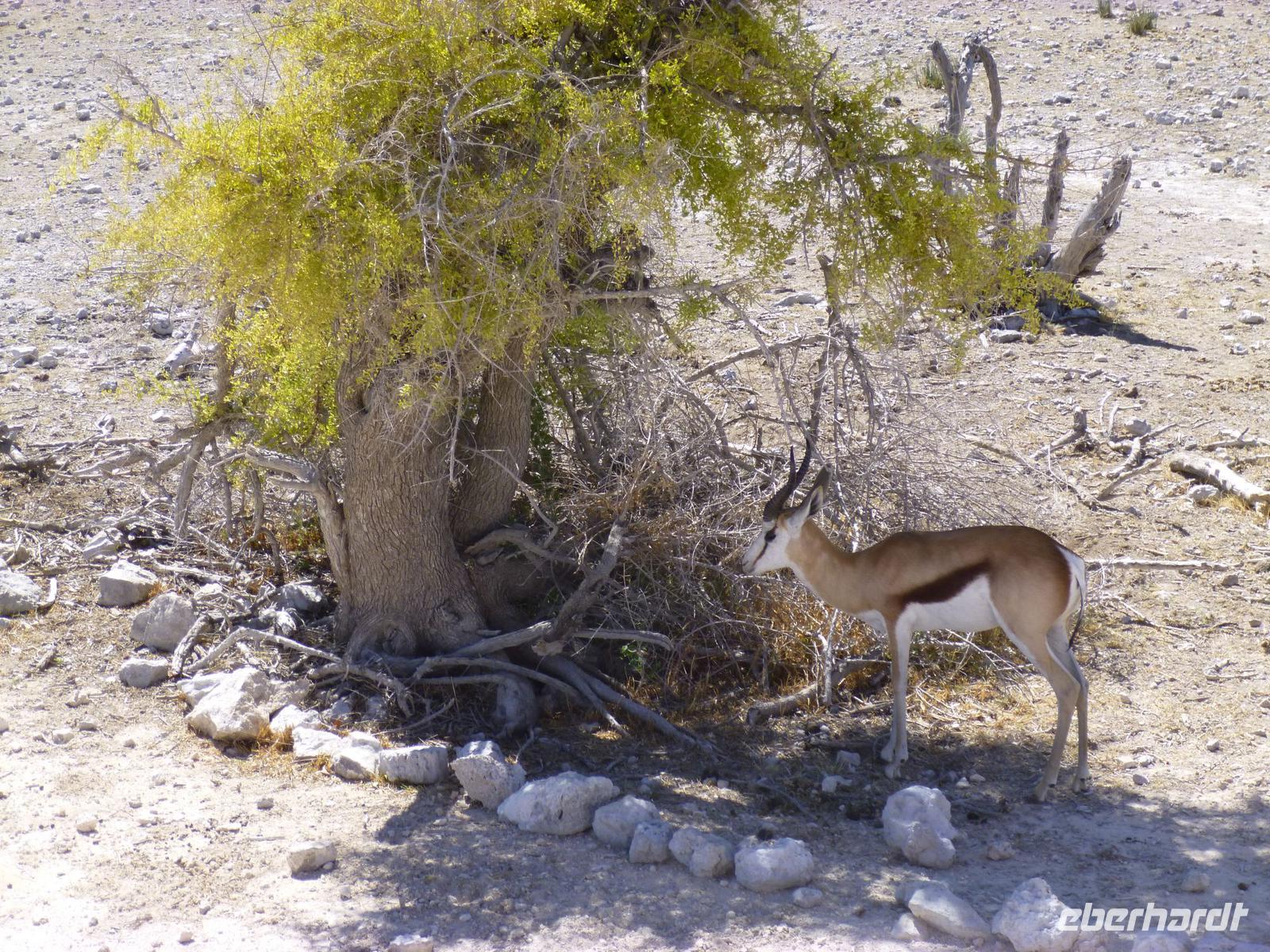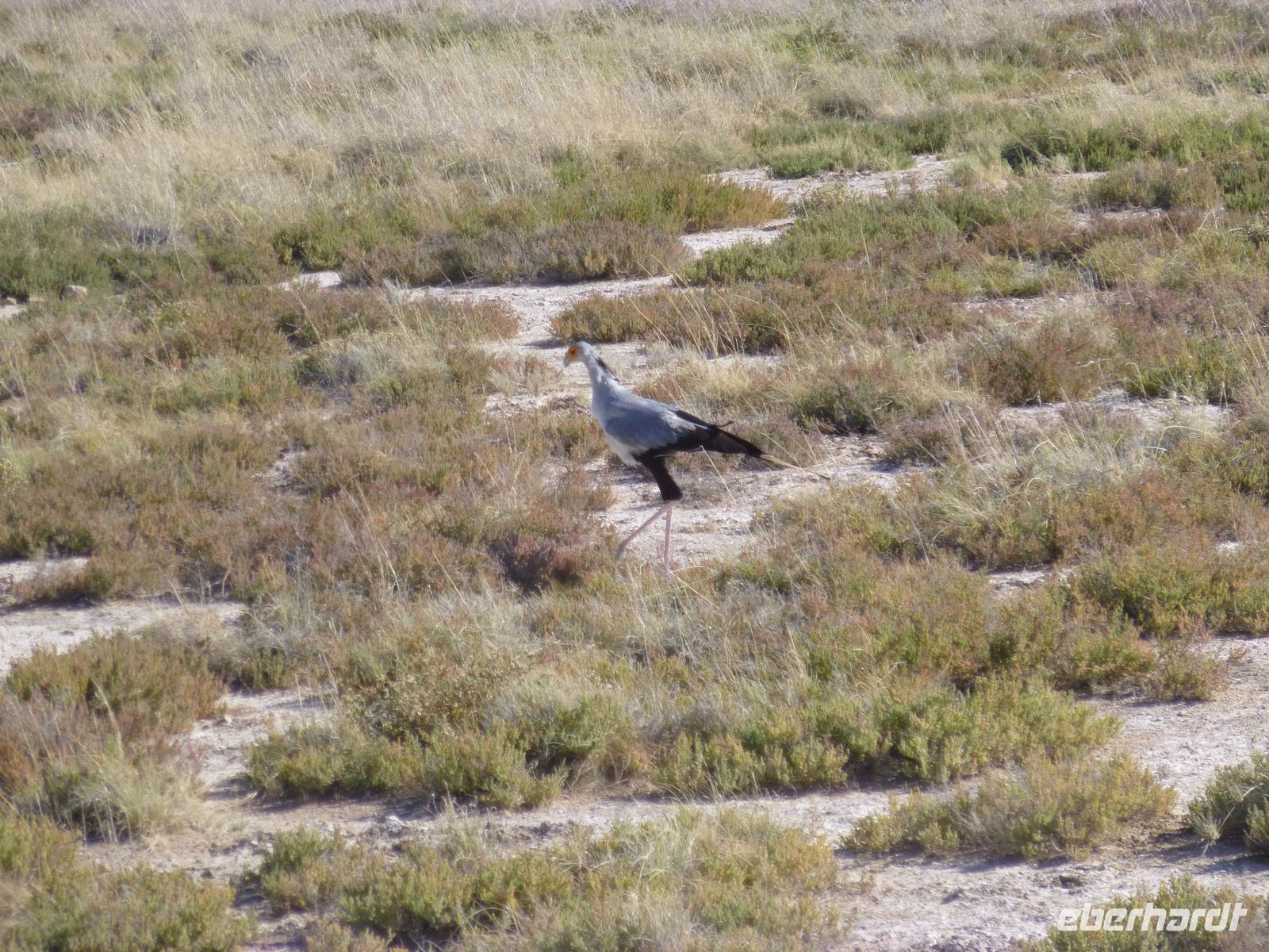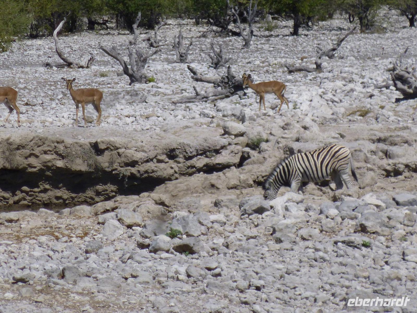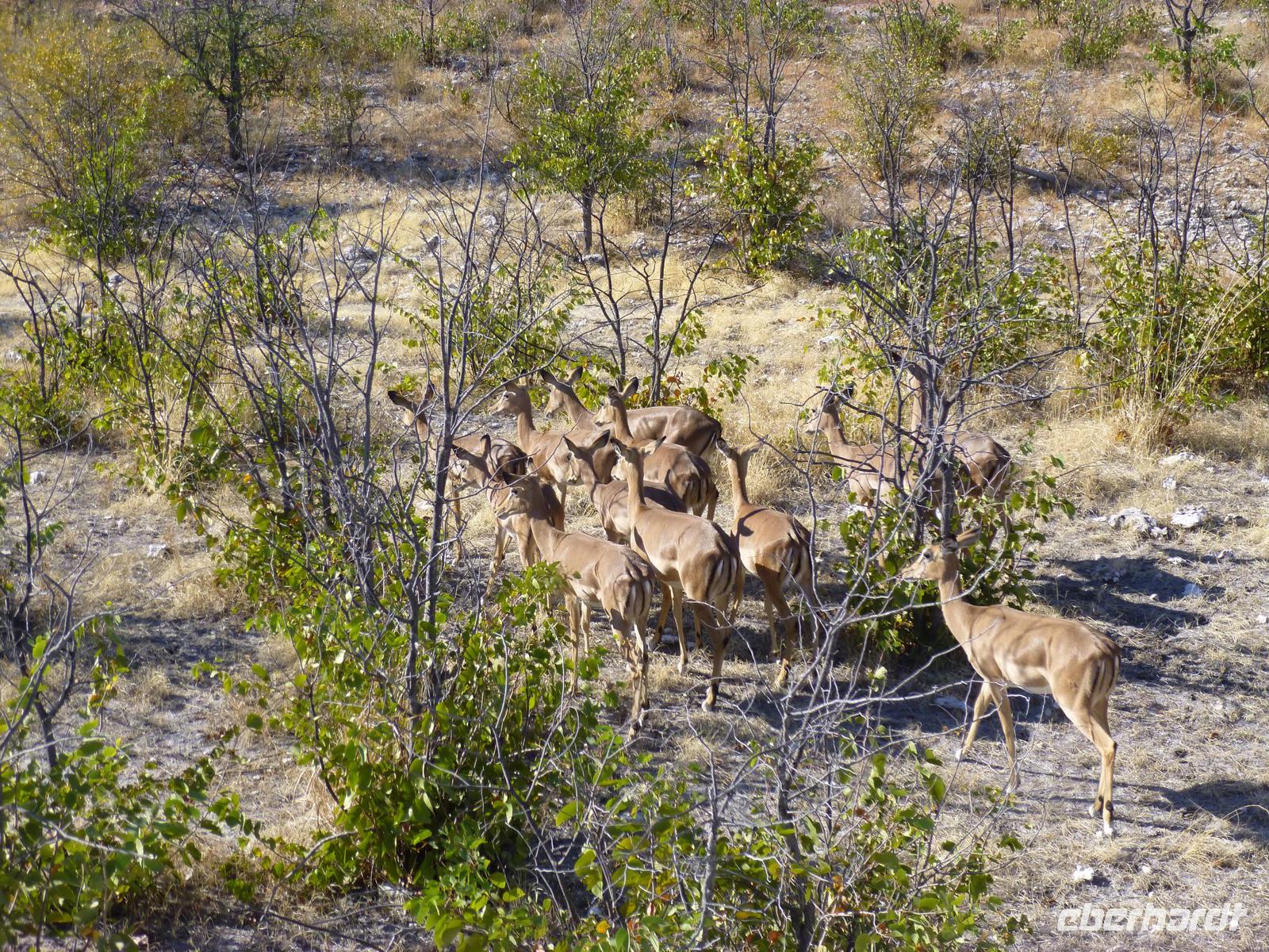 Wir fahren durch den Nationalpark und beobachten einige Tiere wie Sträuße, Zebras, Kuhantilope, Riesentrappe, Kudus und den Sekretär. An einem Wasserloch hatten wir besonders viel Glück endlich haben wir Löwen gesichtet - wir waren happy. Wir erreichen die Etosha-Pfanne, die eigentlich um diese Zeit noch mit Wasser gefüllt ist, durch die große Trockenheit jedoch wie ein großer Salzsee aussieht. In der unendlichen Weite des Sees sahen wir eine Fata Morgana. Man konnte denken, im Hintergrund einen großen See zu entdecken. Wir hielten in Namutoni an einem ehemaligen alten deutschen Fort. Bevor wir den Nationalpark verlassen haben, sahen wir noch die Dikdik-Antilope, die kleinste ihrer Art. Wir besuchten den Otjikotosee. Früher war dieser eine ehemalige Höhle, wo vor einigen Jahren das Dach herunter gestürzt ist und somit ein See entstanden ist. Bevor die deutschen Truppen sich zurück gezogen haben, wurden im See Waffen und Munitionen versengt. Diese wurden 1984 zum Teil geborgen und befinden sich im Museum in Tsuneb.