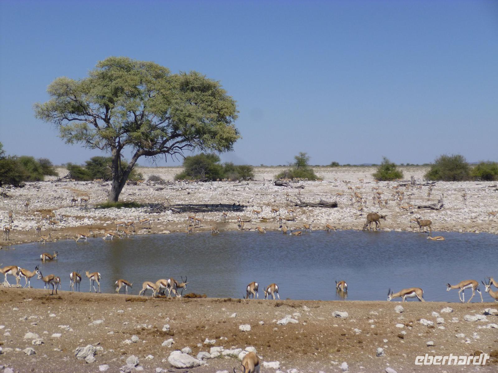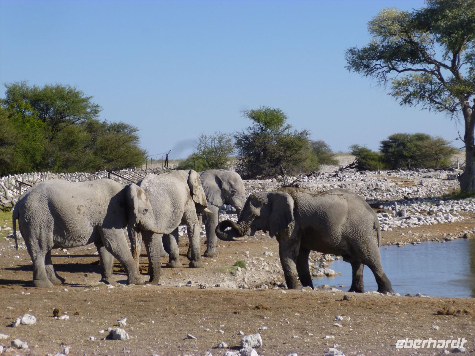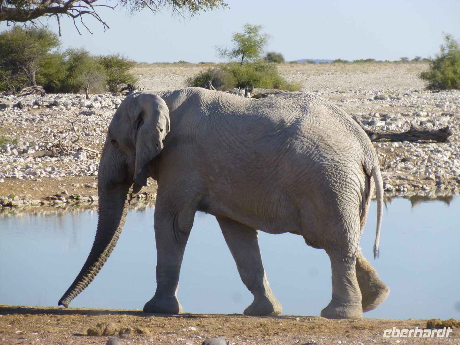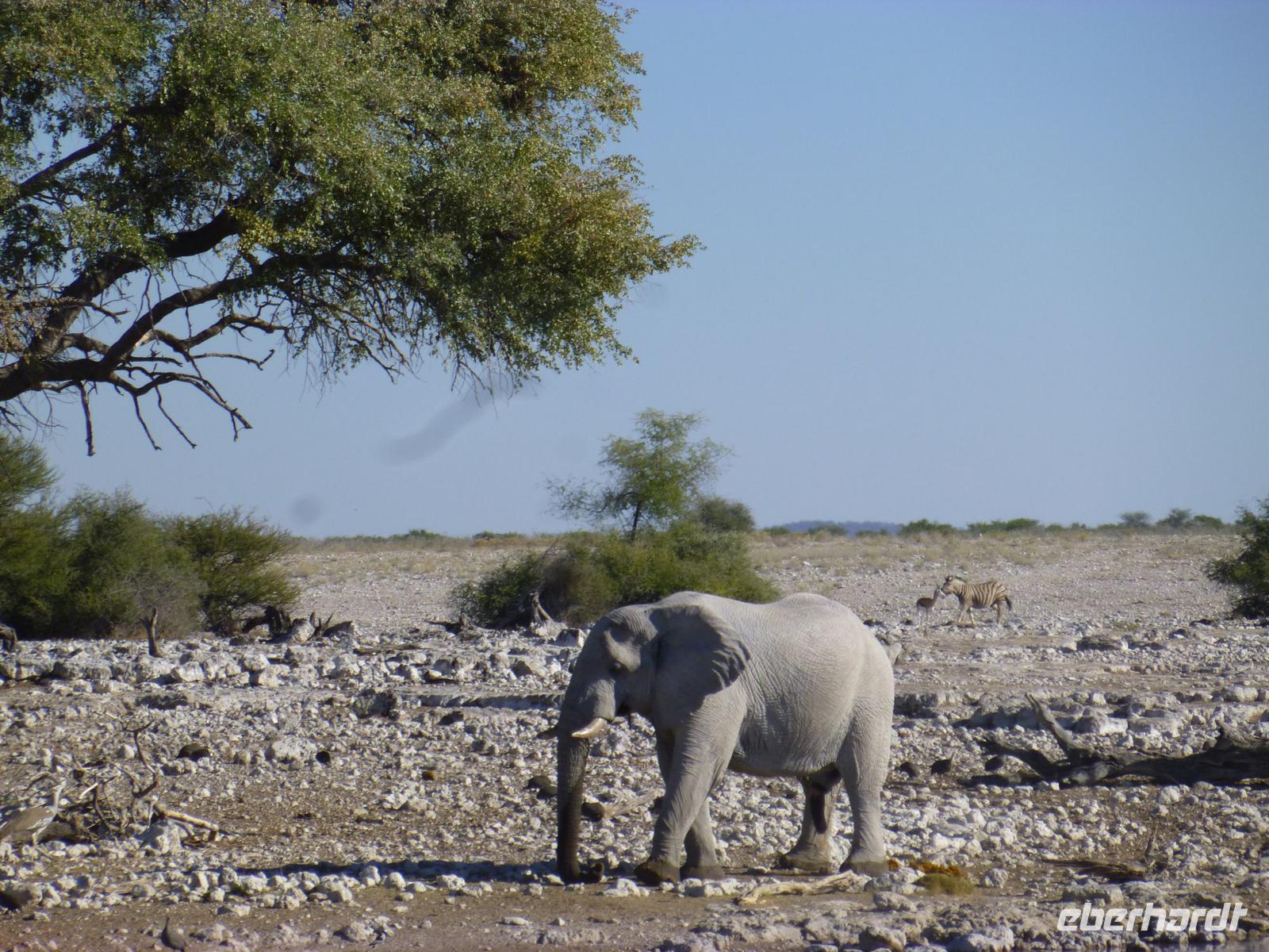 Heute freuen wir uns auf die Fahrt in den Etosha-Nationalpark und hoffentlich viele Tiere. Der Besuch des größten Naturschutzgebietes ist der Höhepunkt jeder Namibia-Reise. Wir erreichen das westliche Tor des Nationalparks. Auf der Fahrt zum "Okaukuejo-Restcamp" sahen wir schon die ersten Giraffen, Zebras, Springböcke und Kudus. Die Besonderheit dieses Restcamps ist das beleuchtete Wasserloch, wo man 24 Stunden die Tiere beobachten kann. Nach unserem Picknick besuchten wir dieses und hatten großes Glück, dass viele Elefanten zu sehen waren. Nach dem Abendessen beobachteten wir auch wieder Elefanten, aber auch Giraffen und Spitzmaulnashörner. Es war wie in einem großen Kino, wo man auf der Terrasse sitzt und ungestört die Tiere beobachten kann.