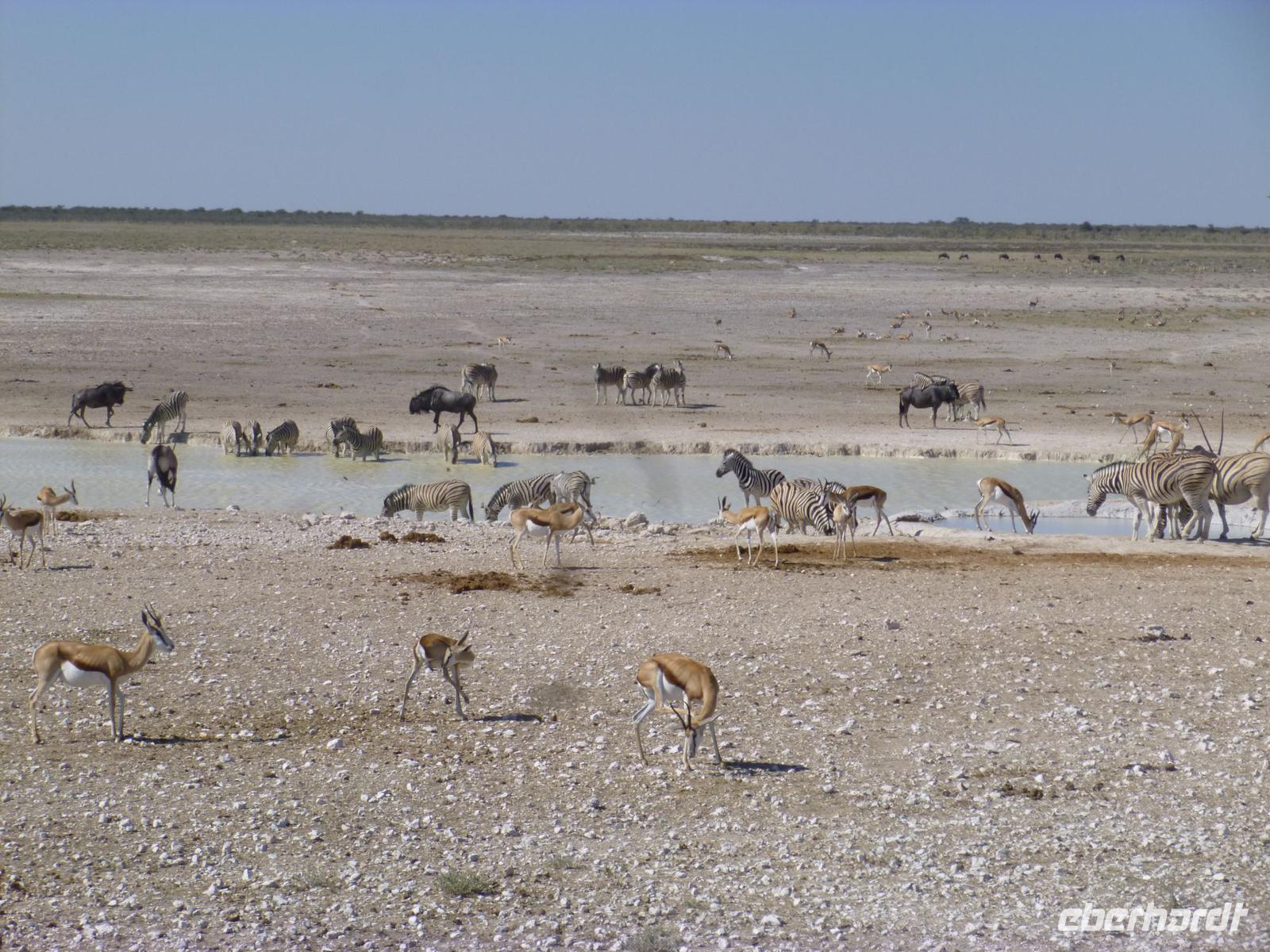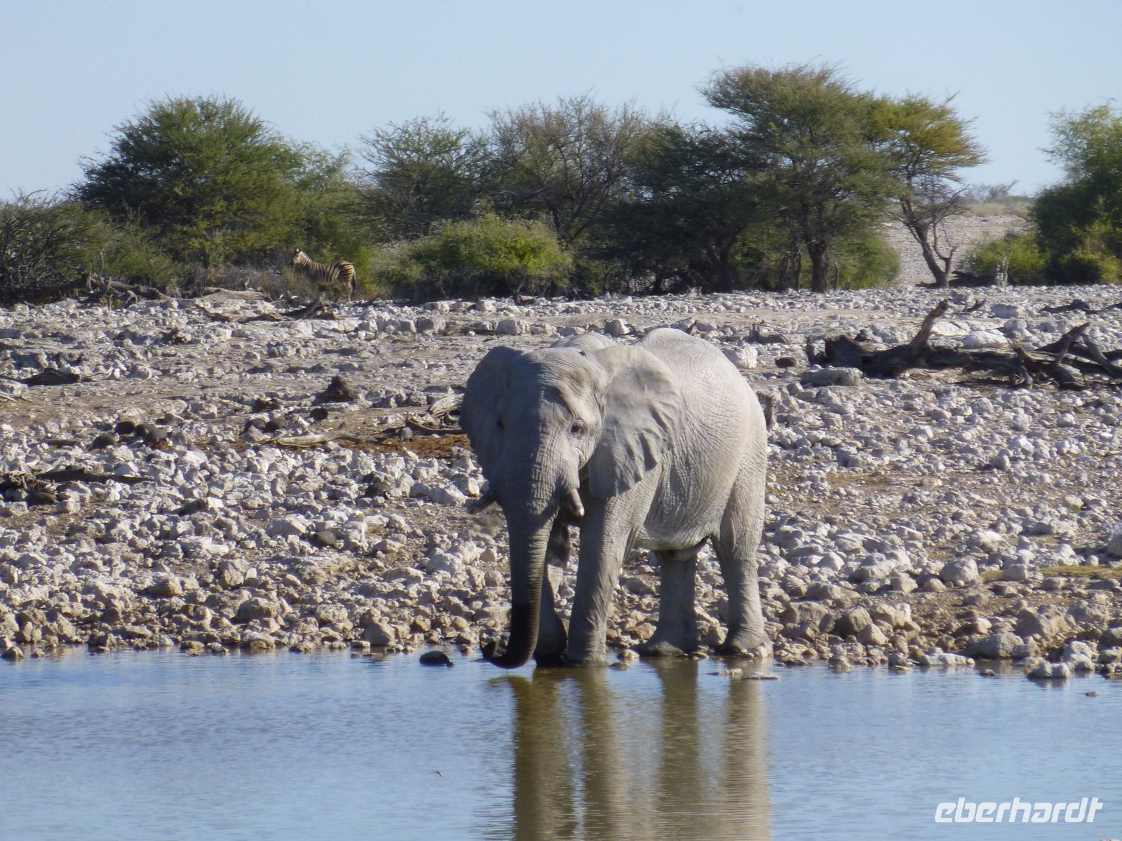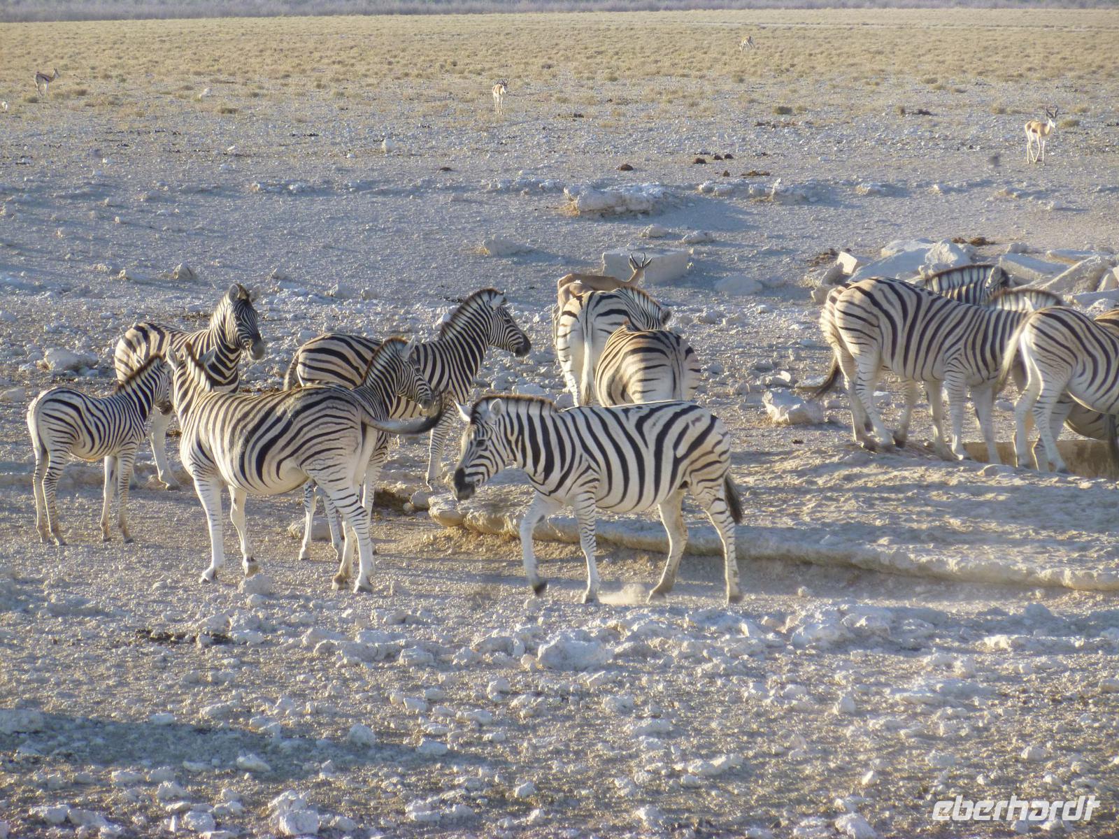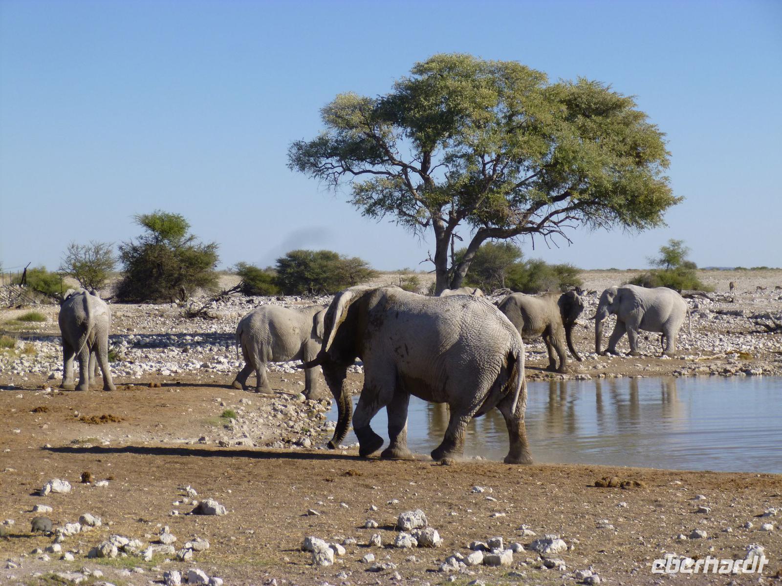 Heute freuen wir uns auf die Fahrt in den Etosha-Nationalpark und hoffentlich viele Tiere. Der Besuch des größten Naturschutzgebietes ist der Höhepunkt jeder Namibia-Reise. Wir erreichen das westliche Tor des Nationalparks. Auf der Fahrt zum "Okaukuejo-Restcamp" sahen wir schon die ersten Giraffen, Zebras, Springböcke und Kudus. Die Besonderheit dieses Restcamps ist das beleuchtete Wasserloch, wo man 24 Stunden die Tiere beobachten kann. Nach unserem Picknick besuchten wir dieses und hatten großes Glück, dass viele Elefanten zu sehen waren. Nach dem Abendessen beobachteten wir auch wieder Elefanten, aber auch Giraffen und Spitzmaulnashörner. Es war wie in einem großen Kino, wo man auf der Terrasse sitzt und ungestört die Tiere beobachten kann.