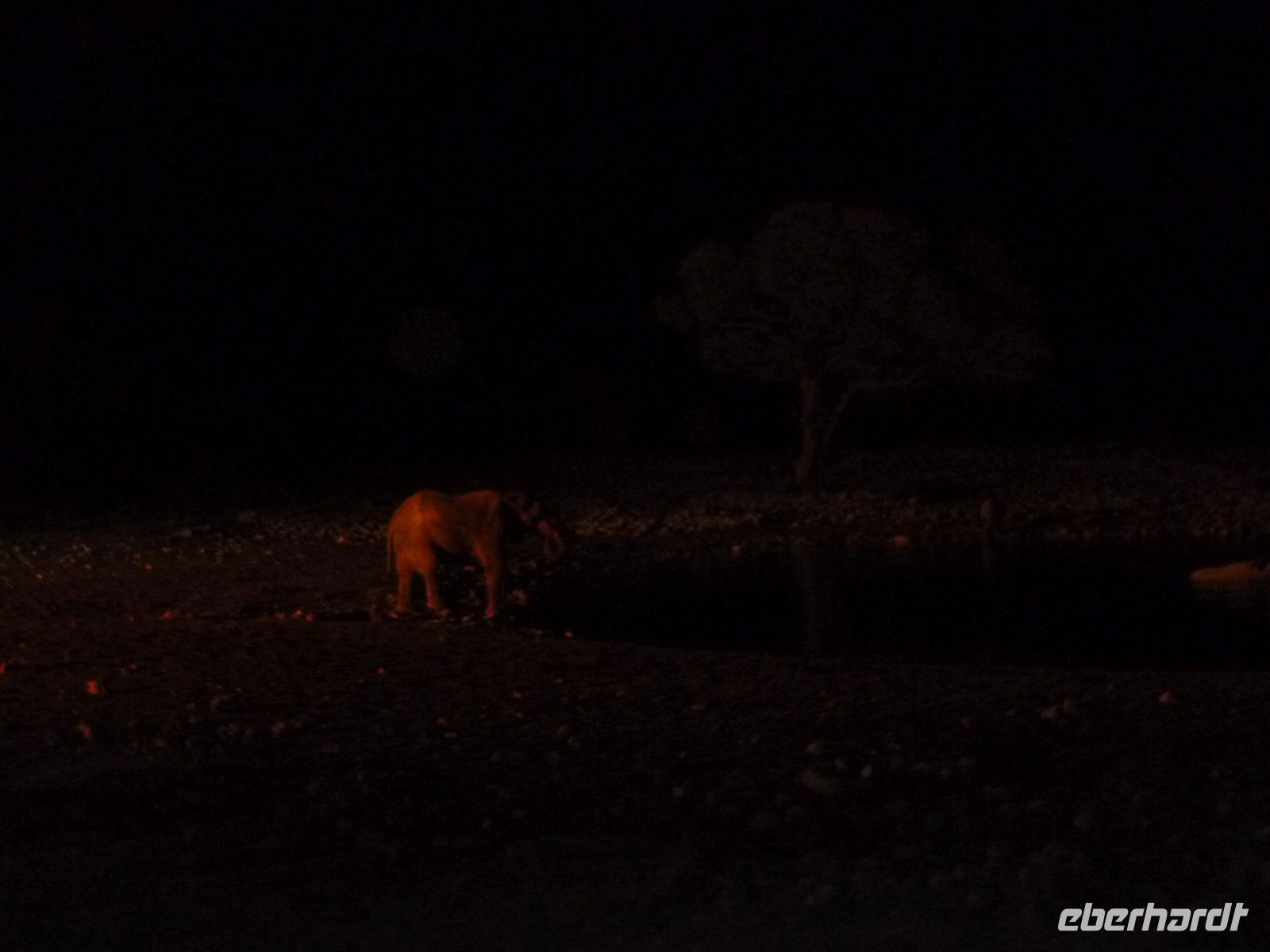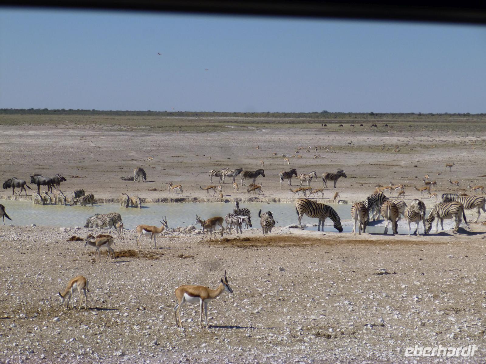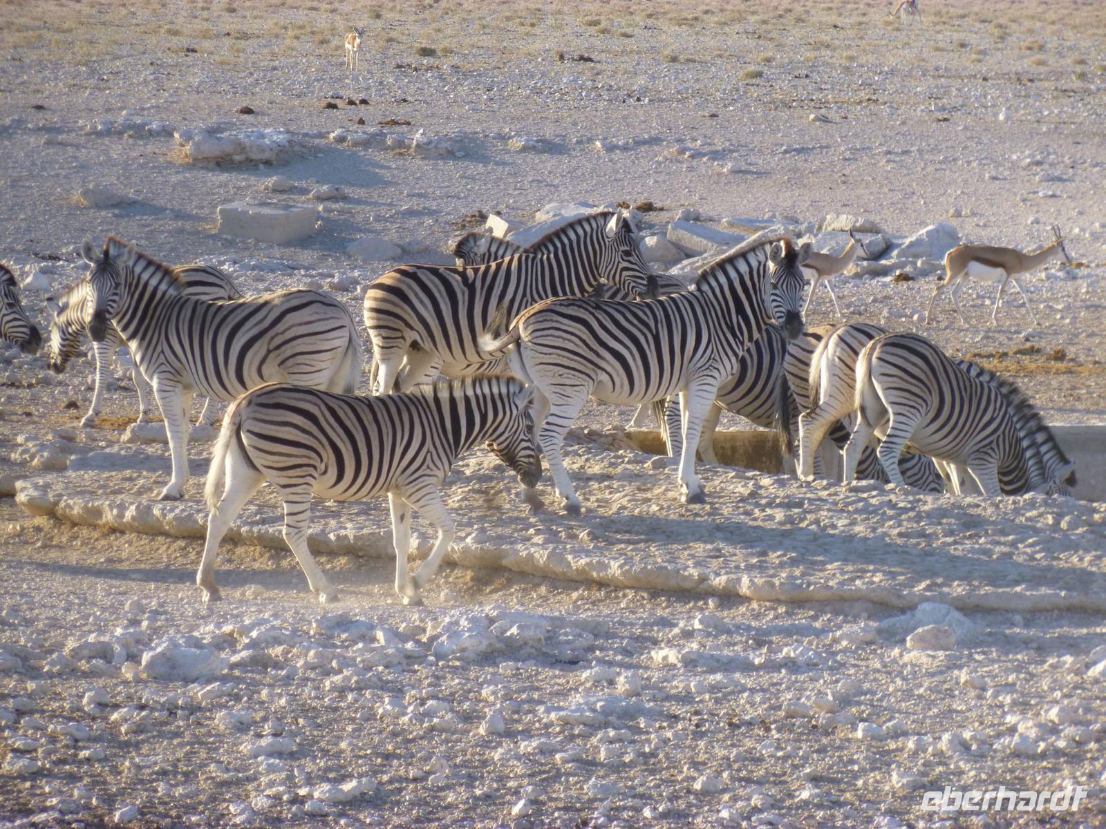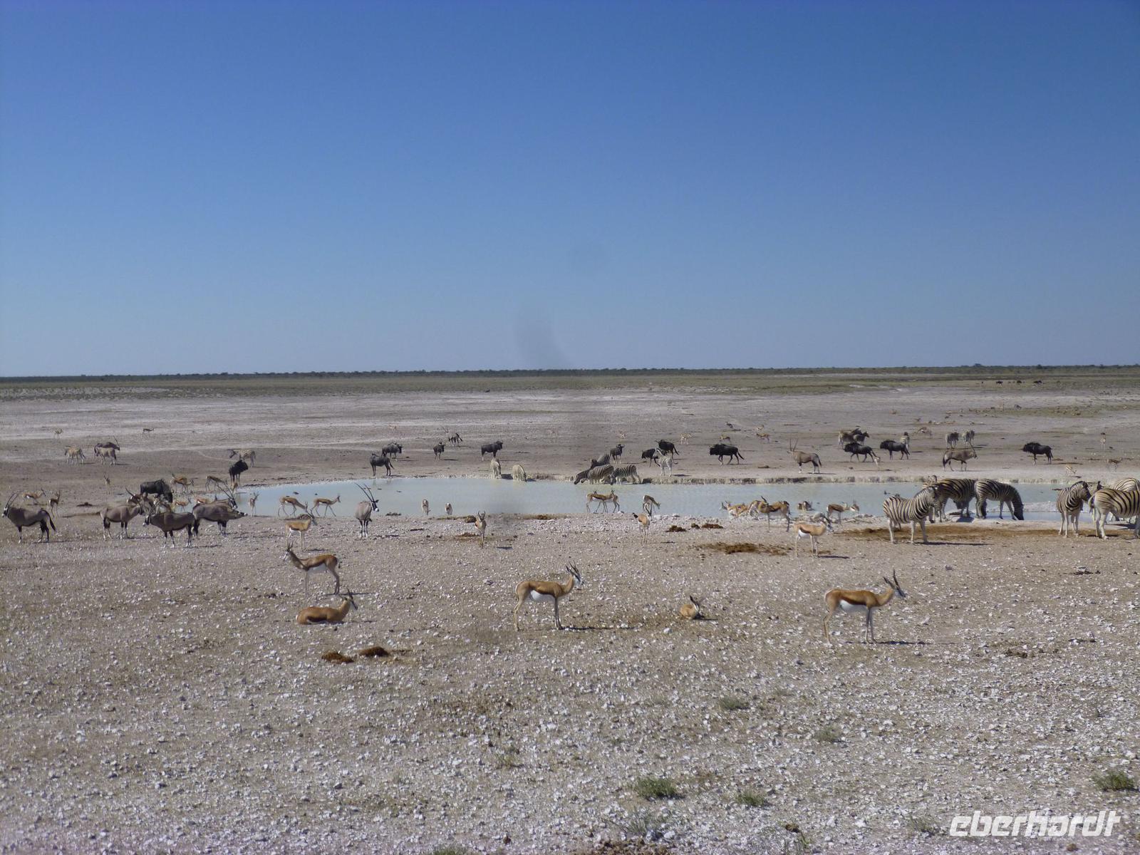 Heute freuen wir uns auf die Fahrt in den Etosha-Nationalpark und hoffentlich viele Tiere. Der Besuch des größten Naturschutzgebietes ist der Höhepunkt jeder Namibia-Reise. Wir erreichen das westliche Tor des Nationalparks. Auf der Fahrt zum "Okaukuejo-Restcamp" sahen wir schon die ersten Giraffen, Zebras, Springböcke und Kudus. Die Besonderheit dieses Restcamps ist das beleuchtete Wasserloch, wo man 24 Stunden die Tiere beobachten kann. Nach unserem Picknick besuchten wir dieses und hatten großes Glück, dass viele Elefanten zu sehen waren. Nach dem Abendessen beobachteten wir auch wieder Elefanten, aber auch Giraffen und Spitzmaulnashörner. Es war wie in einem großen Kino, wo man auf der Terrasse sitzt und ungestört die Tiere beobachten kann.