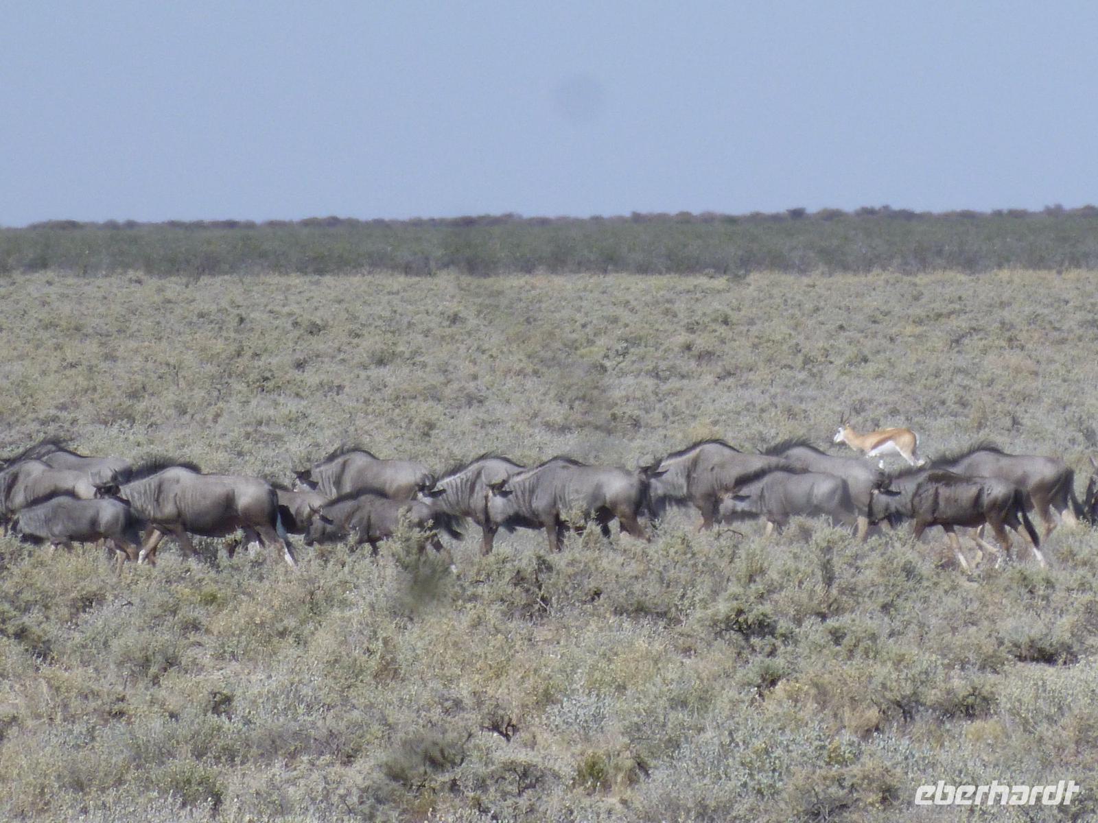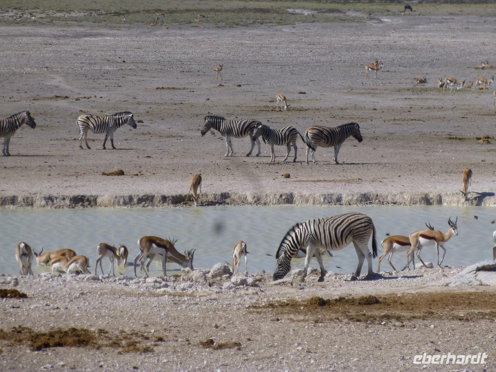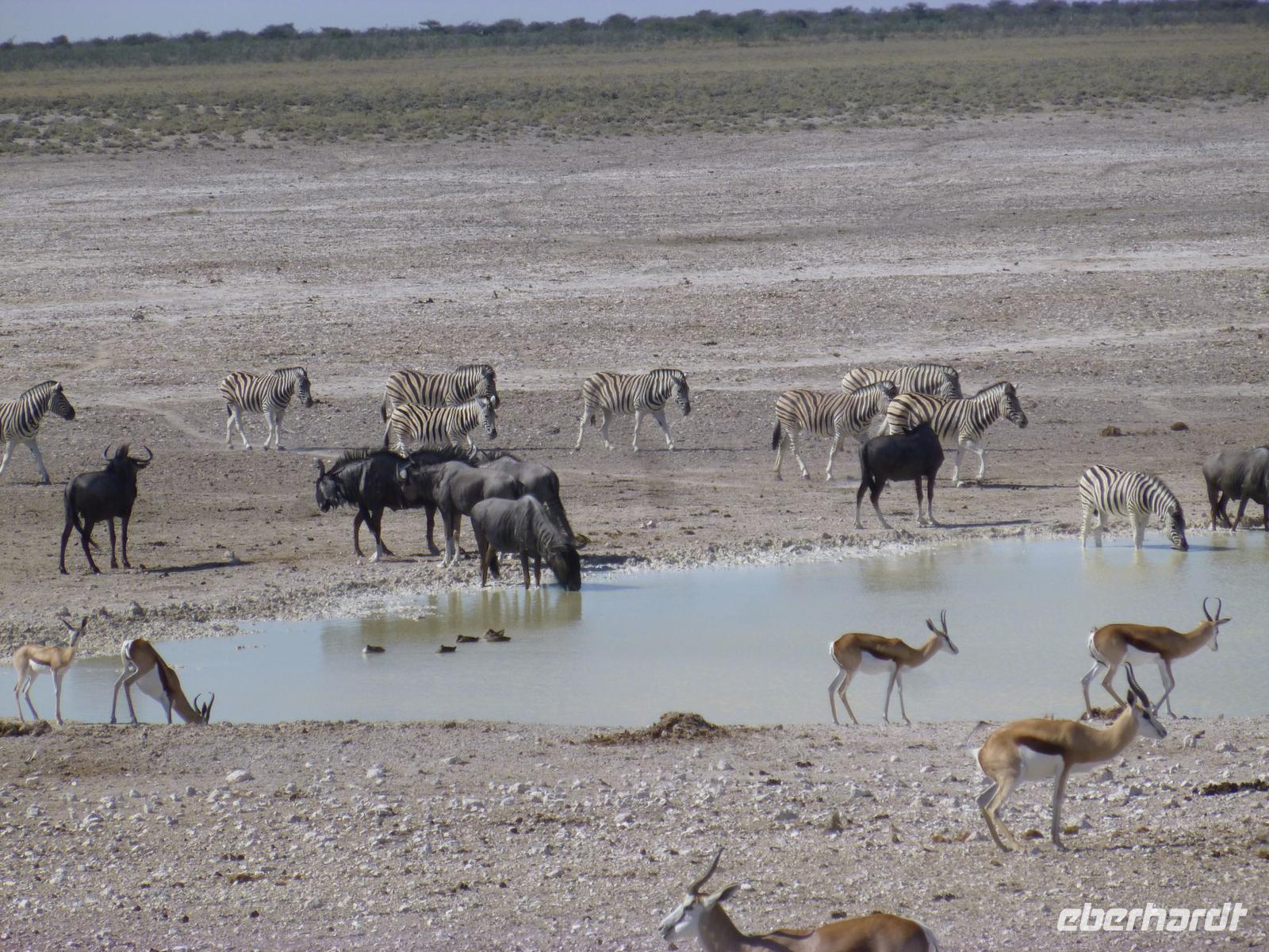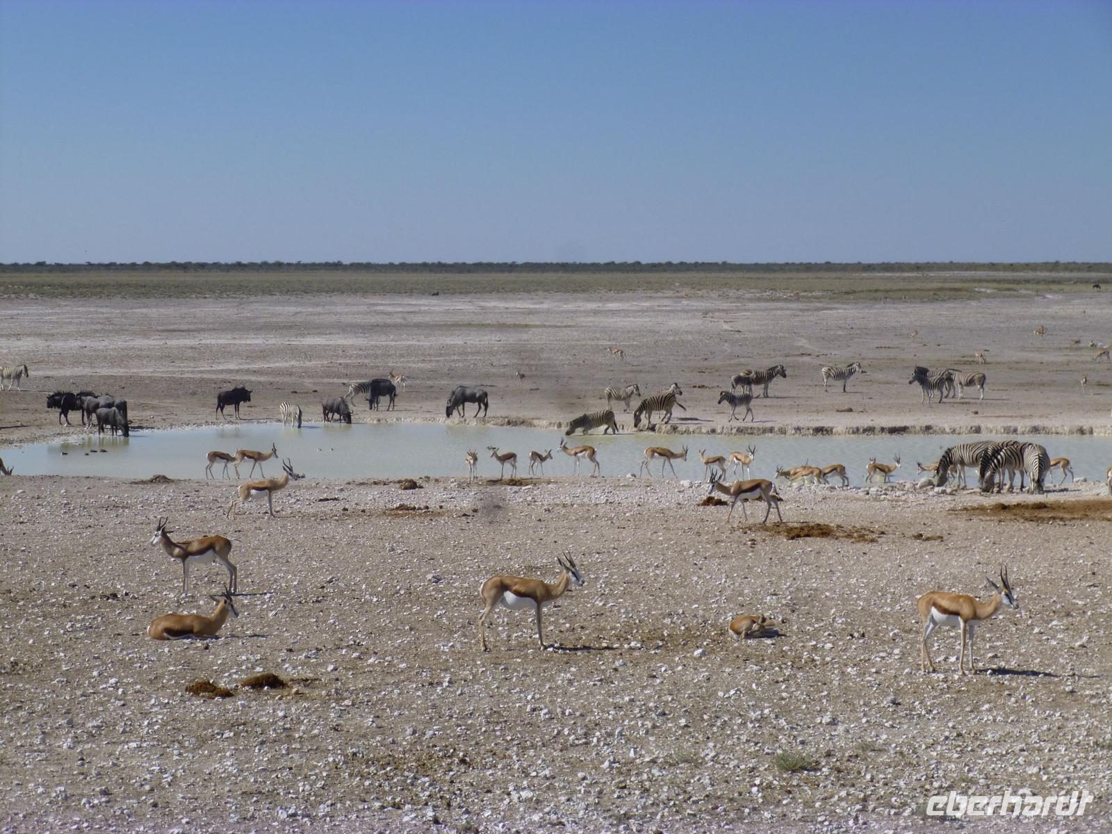 Heute freuen wir uns auf die Fahrt in den Etosha-Nationalpark und hoffentlich viele Tiere. Der Besuch des größten Naturschutzgebietes ist der Höhepunkt jeder Namibia-Reise. Wir erreichen das westliche Tor des Nationalparks. Auf der Fahrt zum "Okaukuejo-Restcamp" sahen wir schon die ersten Giraffen, Zebras, Springböcke und Kudus. Die Besonderheit dieses Restcamps ist das beleuchtete Wasserloch, wo man 24 Stunden die Tiere beobachten kann. Nach unserem Picknick besuchten wir dieses und hatten großes Glück, dass viele Elefanten zu sehen waren. Nach dem Abendessen beobachteten wir auch wieder Elefanten, aber auch Giraffen und Spitzmaulnashörner. Es war wie in einem großen Kino, wo man auf der Terrasse sitzt und ungestört die Tiere beobachten kann.