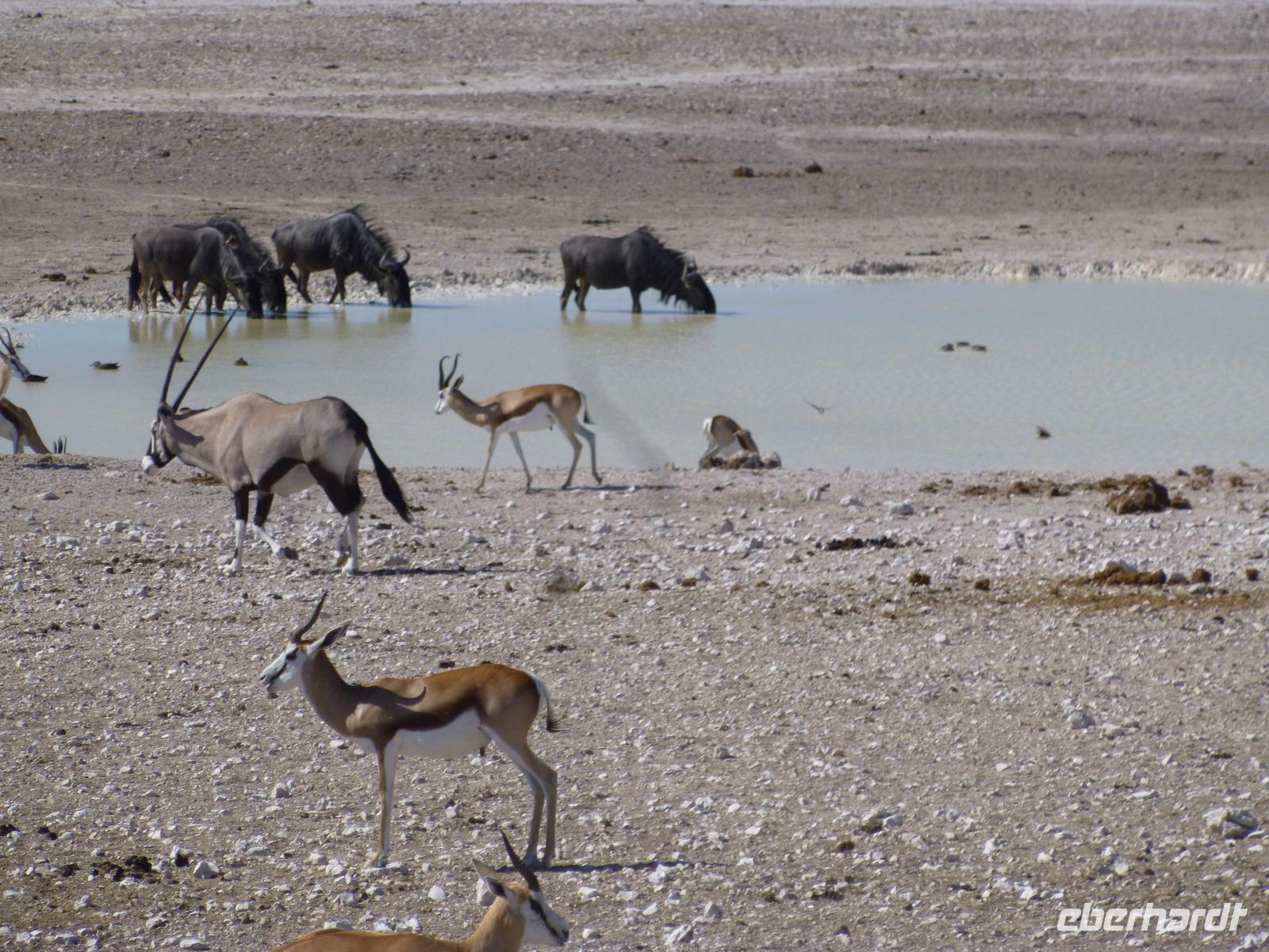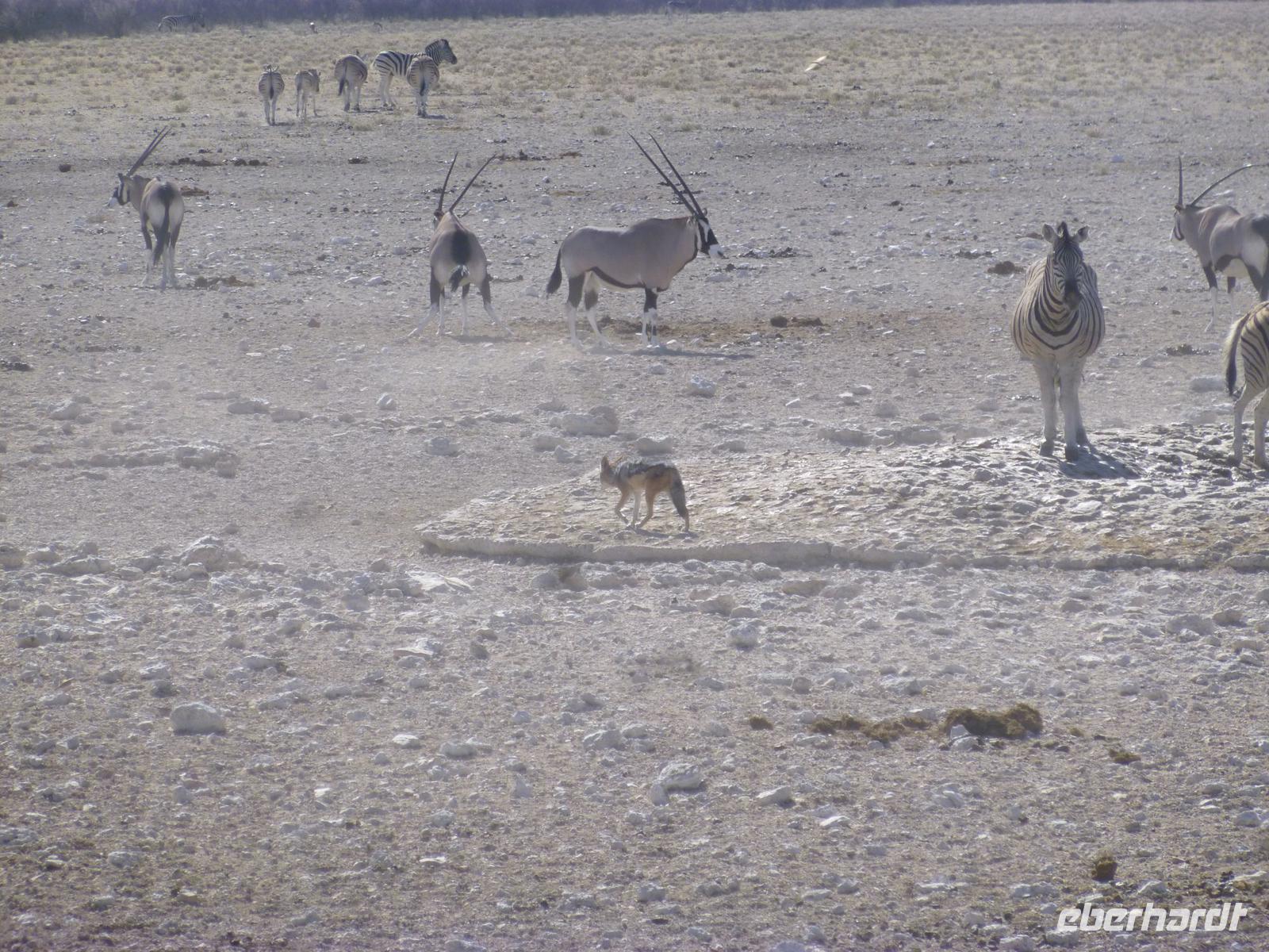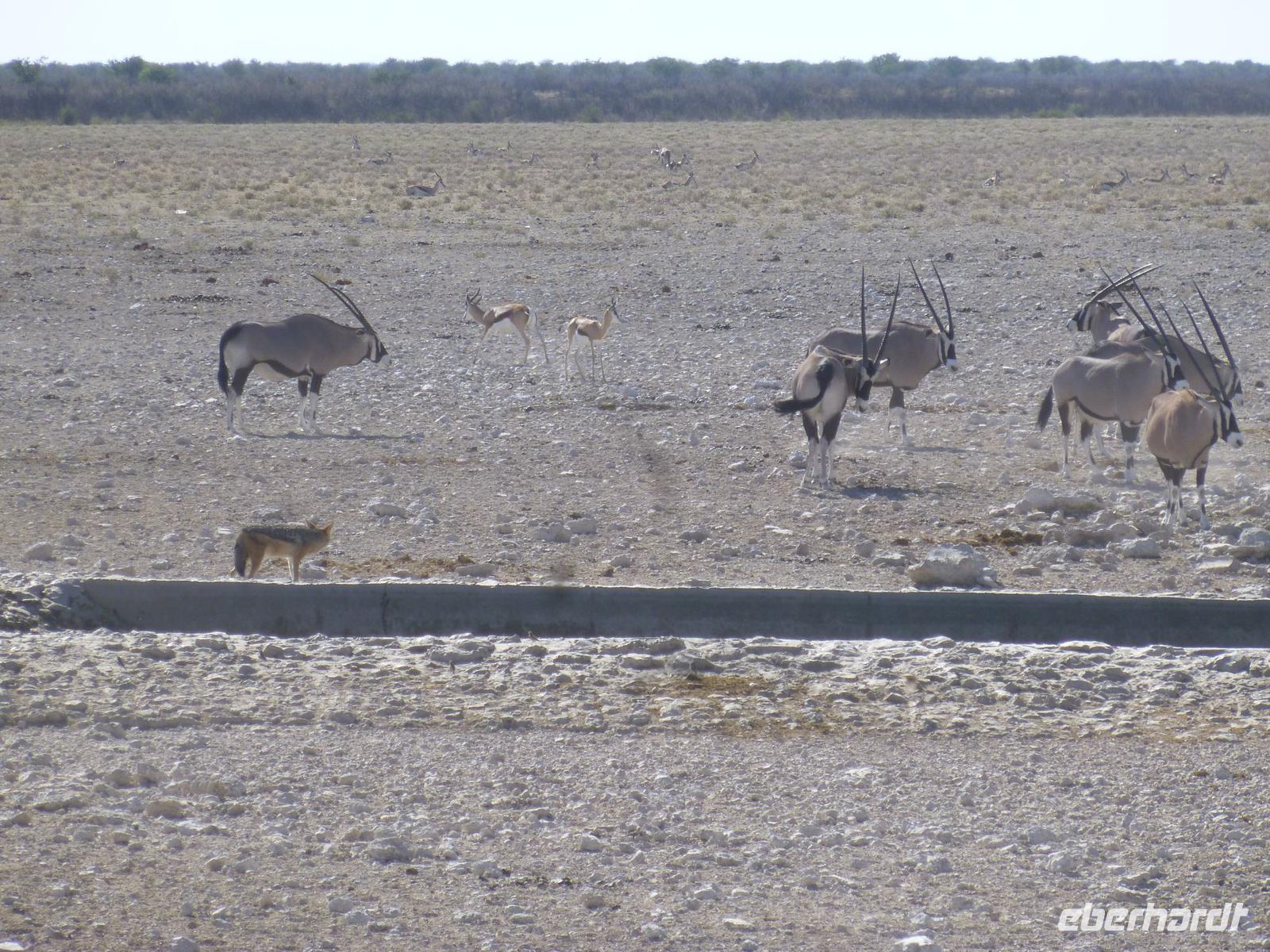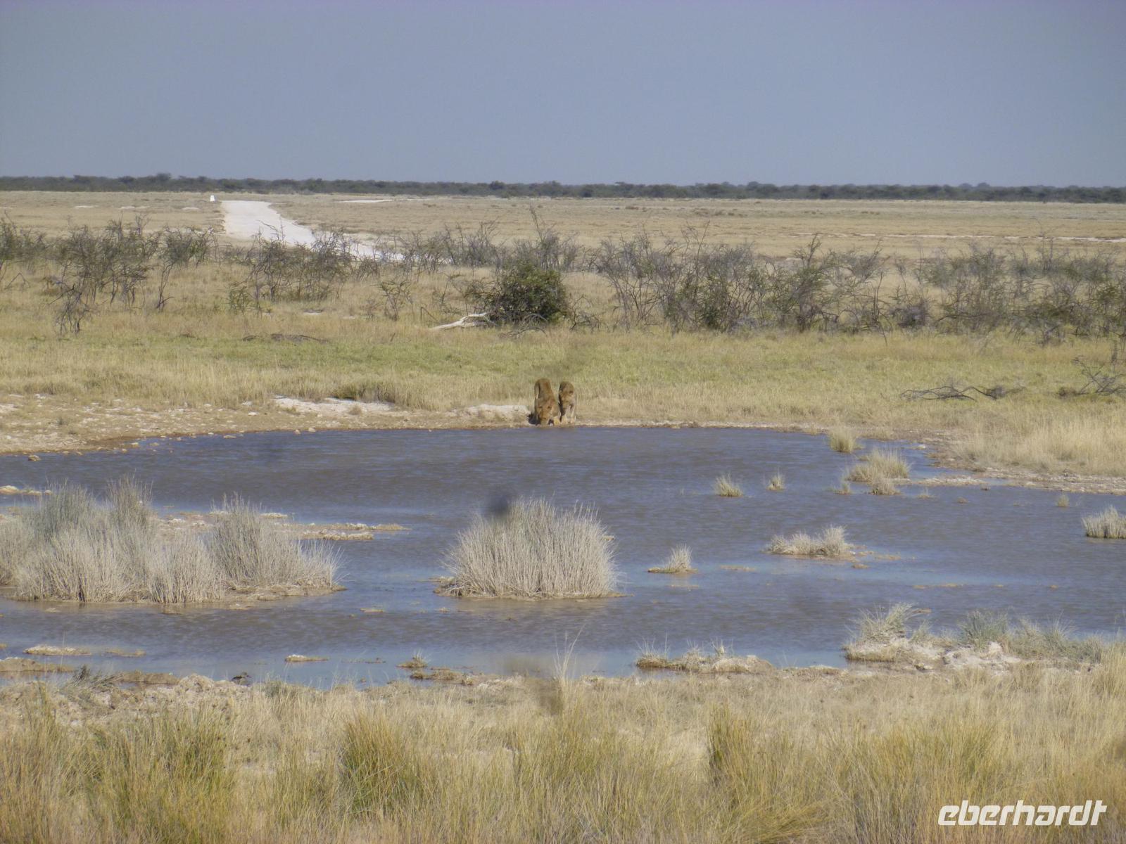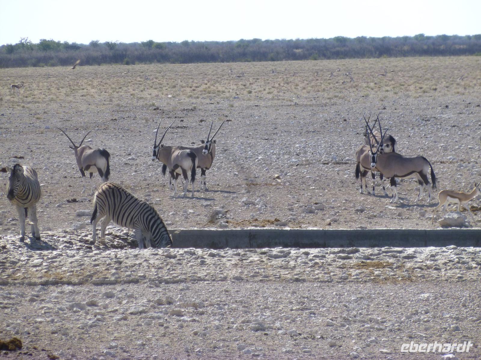 Heute hieß es zeitig aus den Betten. Wir fuhren zu Wildbeobachtungen und wollten vor allem Katzen sehen - leider hatten sie sich versteckt. An den verschiedenen Wasserlöchern legten wir eine Pause ein. Gegen Mittag war an einem der Wasserlöcher viel Betrieb. Zebras, Kudus, Springböcke, Oryx und Hyänen waren zu sehen. Es war eine Augenweide. Auch an unserem Wasserloch konnten wir einige dieser Tiere beobachten. Nachmittags fuhren wir erneut in den Nationalpark - leider auch jetzt keine Löwen. Nach dem Abendessen ging es sofort wieder zum Wasserloch und endlich hatten wir Glück, sieben Löwen kamen gemächlich angelaufen und labten sich an dem Nass. Wenn Löwen in der Nähe sind, trauen sich keine anderen Tiere in die Nähe. Doch nach einiger Zeit kamen die Nashörner und lieferten sich auch noch einen Machtkampf. Eines der Nashörner kam bis fast an den Zaun und stellte sich in verschiedene Positionen, so dass sie jeder ganz nah fotografieren konnte.