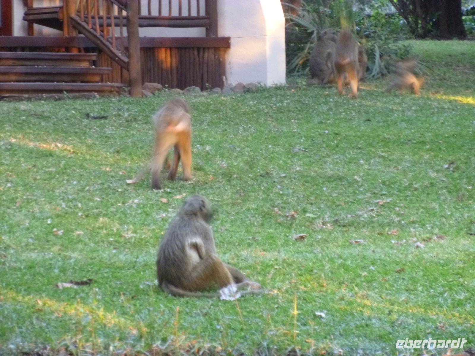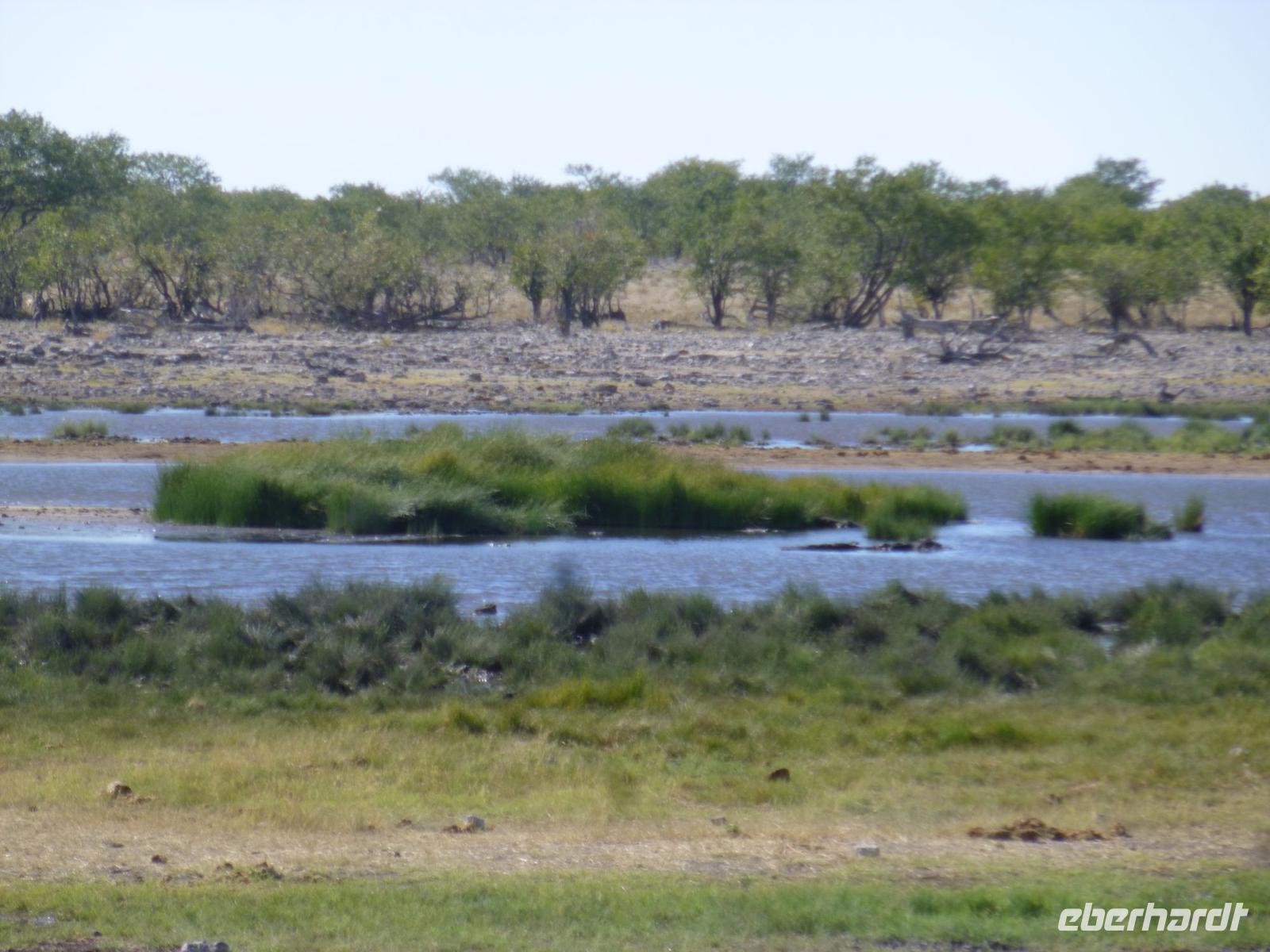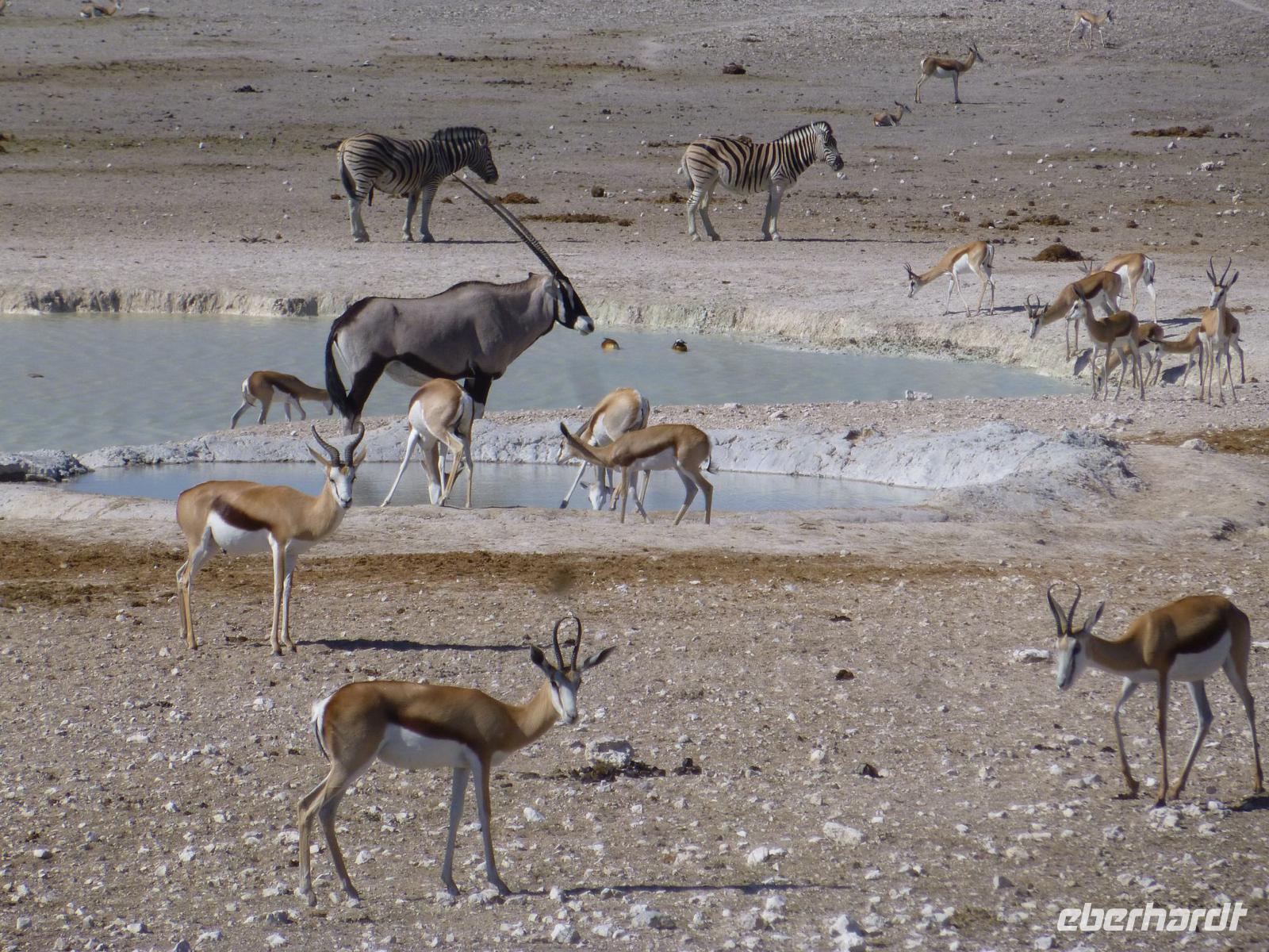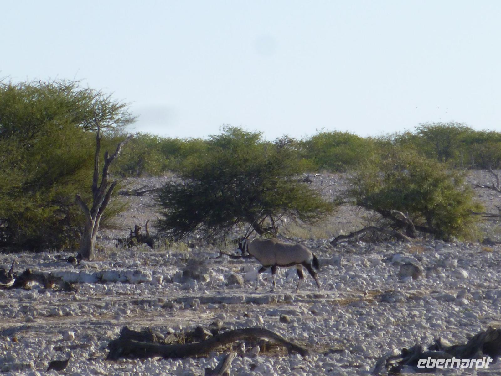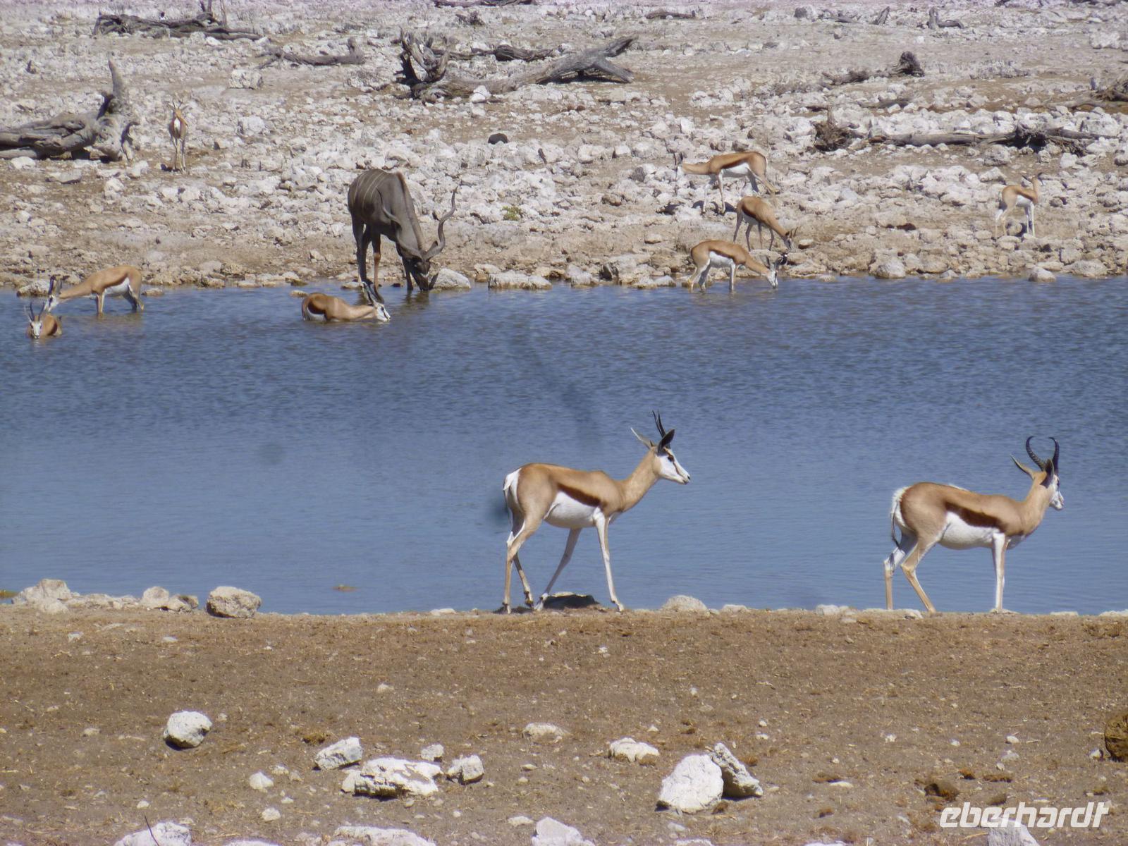 Heute hieß es zeitig aus den Betten. Wir fuhren zu Wildbeobachtungen und wollten vor allem Katzen sehen - leider hatten sie sich versteckt. An den verschiedenen Wasserlöchern legten wir eine Pause ein. Gegen Mittag war an einem der Wasserlöcher viel Betrieb. Zebras, Kudus, Springböcke, Oryx und Hyänen waren zu sehen. Es war eine Augenweide. Auch an unserem Wasserloch konnten wir einige dieser Tiere beobachten. Nachmittags fuhren wir erneut in den Nationalpark - leider auch jetzt keine Löwen. Nach dem Abendessen ging es sofort wieder zum Wasserloch und endlich hatten wir Glück, sieben Löwen kamen gemächlich angelaufen und labten sich an dem Nass. Wenn Löwen in der Nähe sind, trauen sich keine anderen Tiere in die Nähe. Doch nach einiger Zeit kamen die Nashörner und lieferten sich auch noch einen Machtkampf. Eines der Nashörner kam bis fast an den Zaun und stellte sich in verschiedene Positionen, so dass sie jeder ganz nah fotografieren konnte.