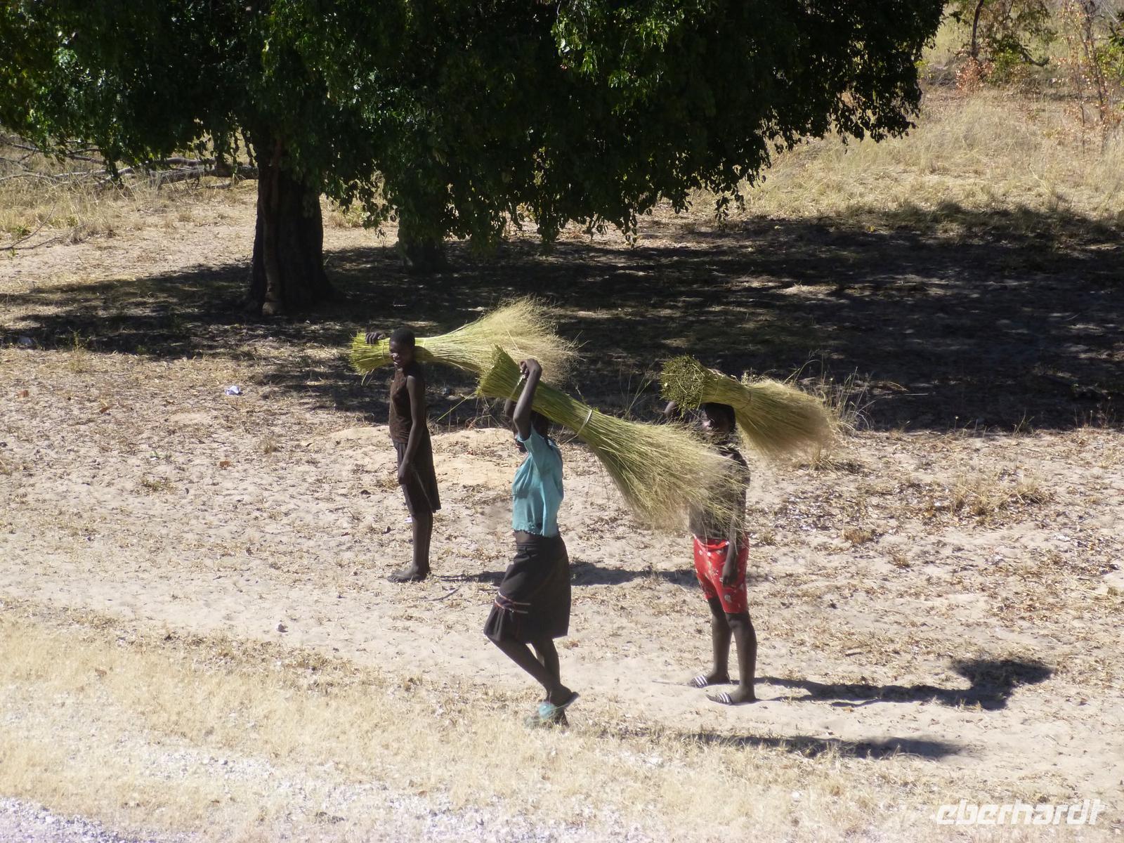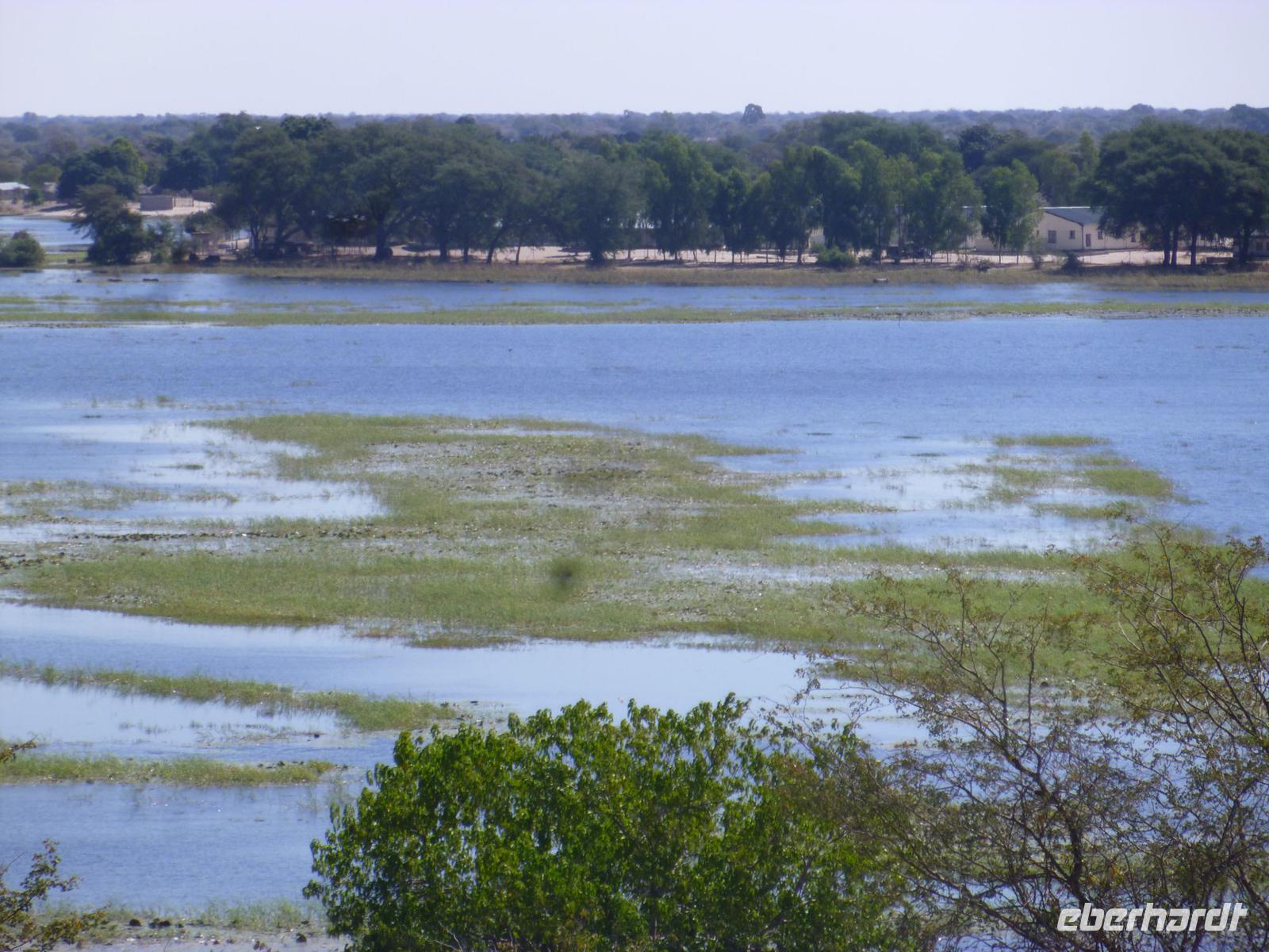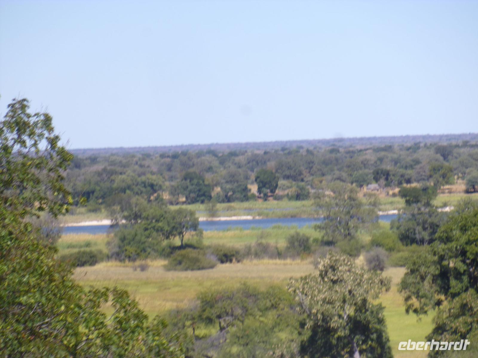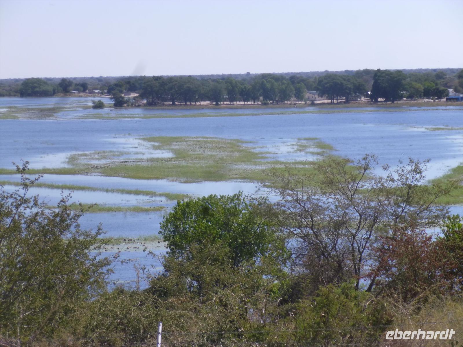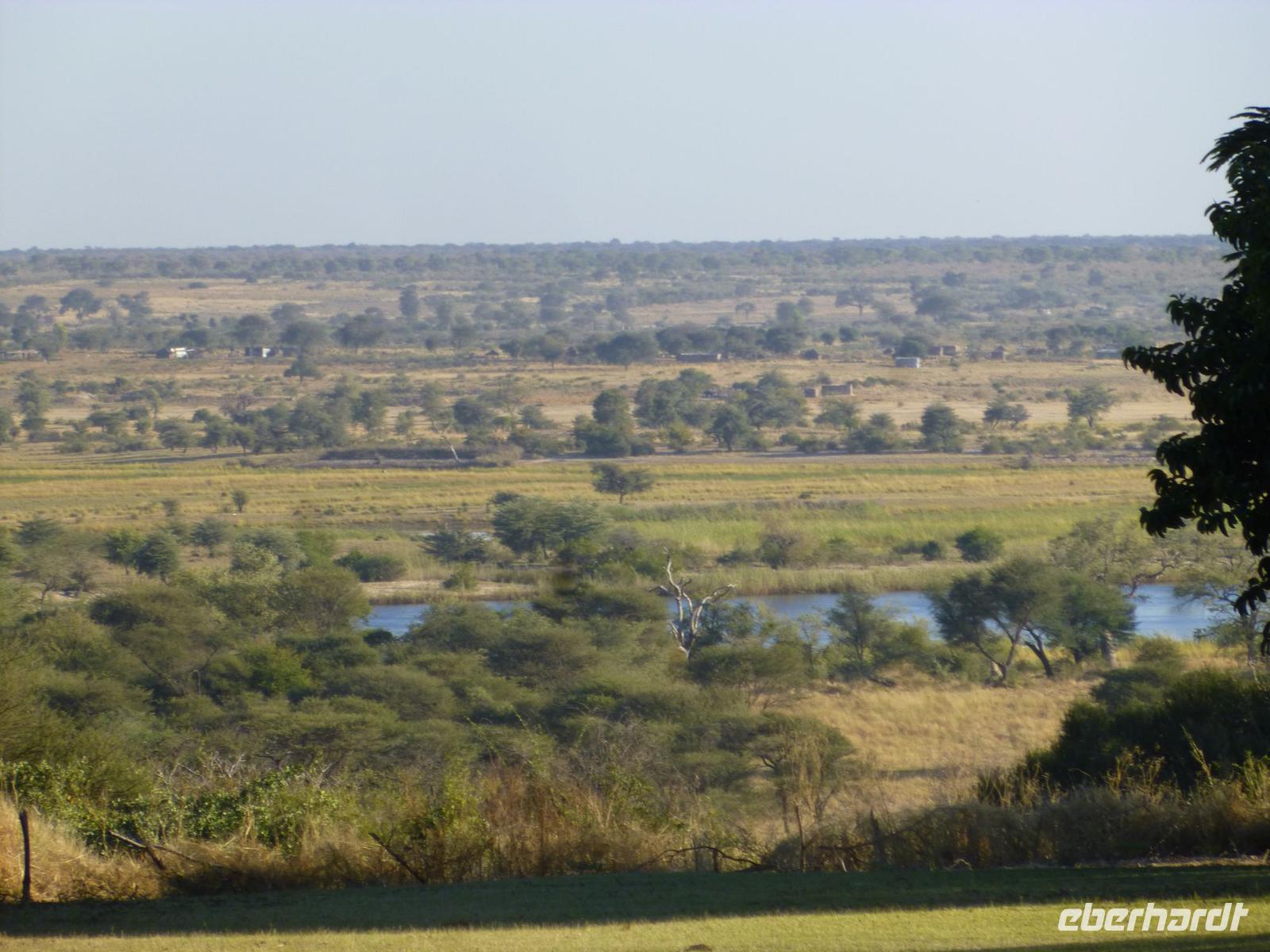 Wir verlassen Rundu und uns erwartet eine lange Fahrt durch den Caprivizipfel. Wieder sehen wir die Runddörfer mit ihren runden Hütten, die meist einer Familie gehören. Sie leben ohne Strom und Wasser. Das Wasser wird von weit her geholt und so beobachten wir Kinder, die mit einem Holzschlitten mit Rindern davor Wasser transportieren. Uns begegnen Frauen, die zum Teil in schönen Kleidern Hirse und andere Lebensmittel in Schalen auf dem Kopf tragen. In dieser Region wird Landwirtschaft betrieben. Vor allem werden Mais und Hirse, aber auch einige Bohnen angebaut. Immer mehr Menschen haben sich hier angesiedelt und damit auch einige Tiere vertrieben. Vor 20 Jahren gab es in Rundu noch Elefanten, die über die Straße liefen und sich jetzt zurück gezogen haben. An der Straße wurden Graspüschel verkauft, die für die Dächer der Häuser verwendet werden. Einige Frauen beobachten wir, die auf dem Kopf dieses Gras trugen. Es ist keine leichte Arbeit, dieses Gras zu schlagen. Auch von einigen Hotels wird es gekauft, um die Dächer in ihren Lodges zu decken. Wir halten in Divundu, um den Kavango-Fluss zu sehen. Wir laufen über die Brücke des Kavango und erreichen den Bwata- Nationalpark. Hier leben die Menschen mit den Tieren, Elefanten und Löwen. Das Gebiet war während des Befreiungskampfes sehr umkämpft und alles war vermint. Noch ein letzter Blick in das Kavangodelta und weiter geht es in den Caprivistreifen.