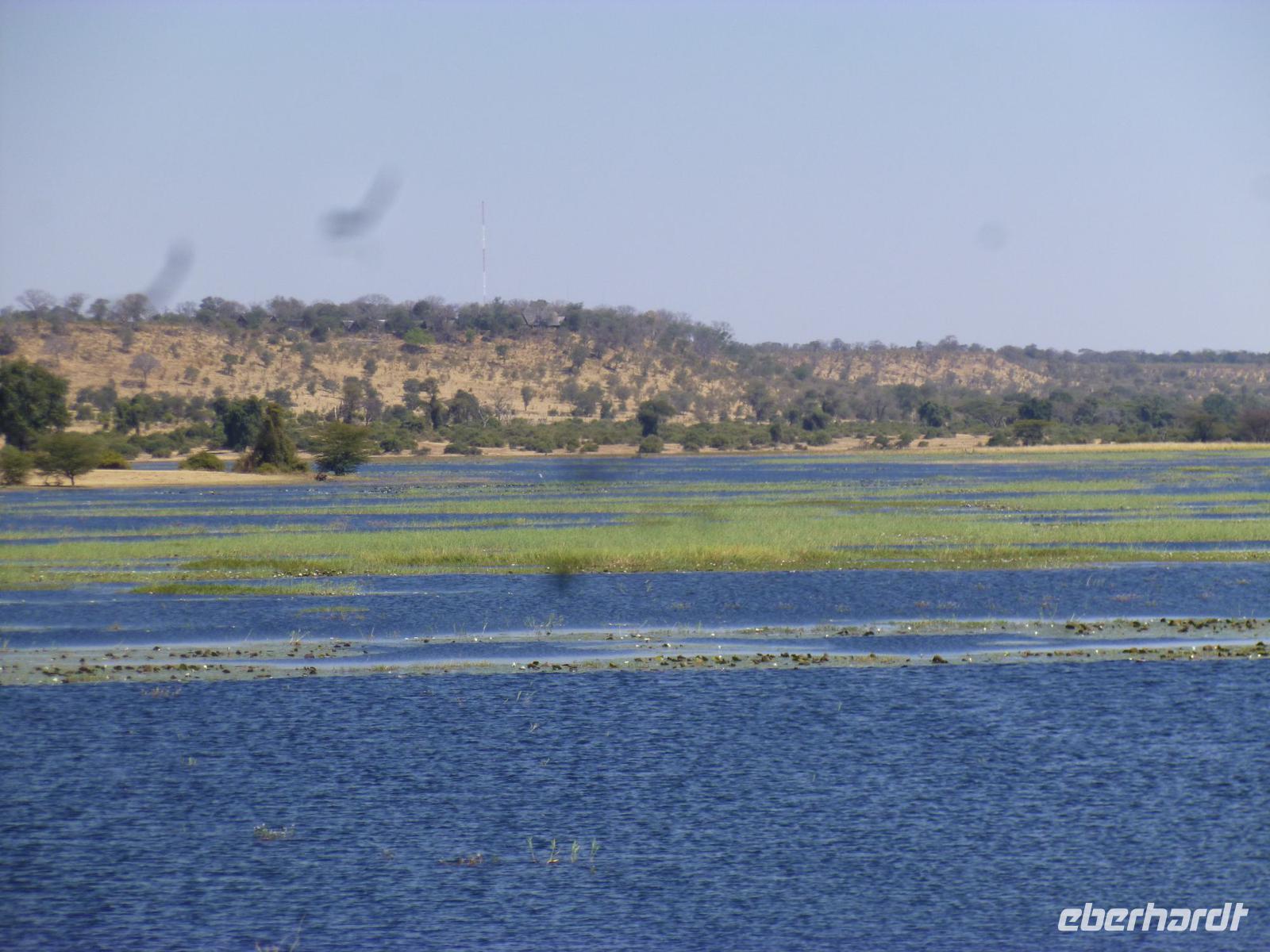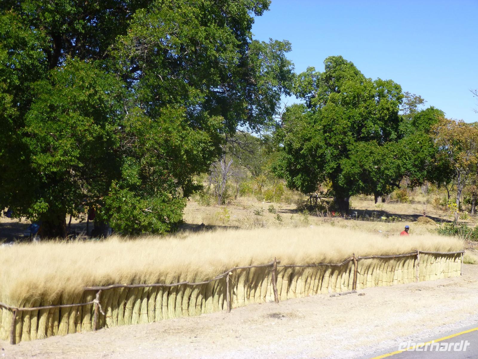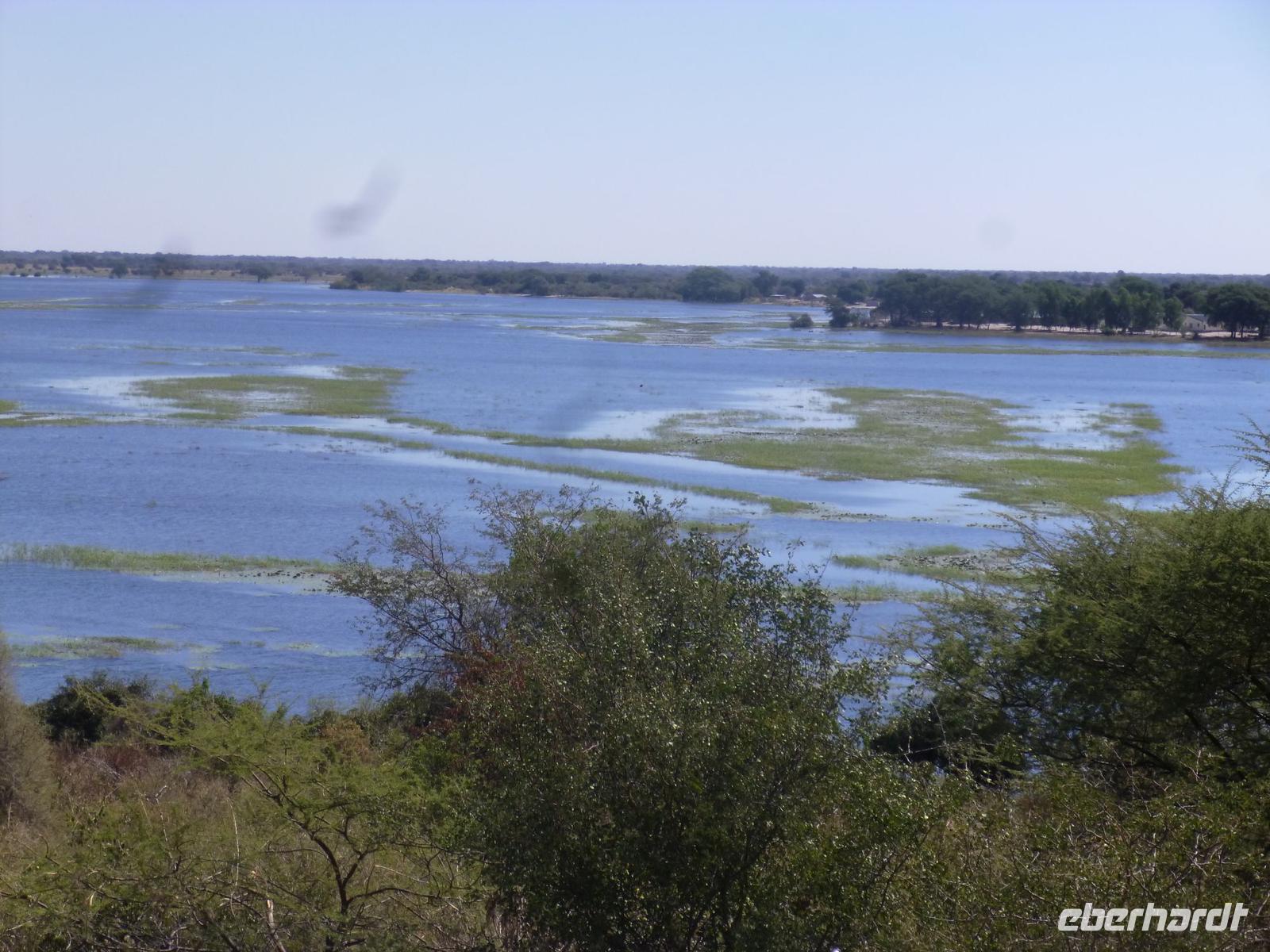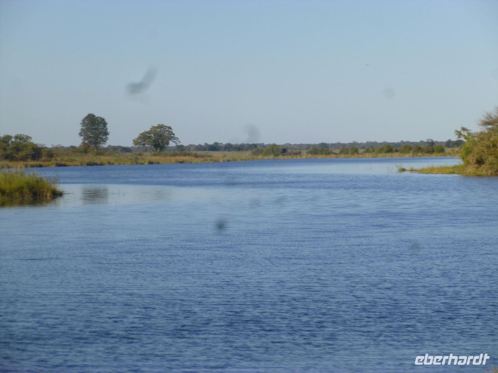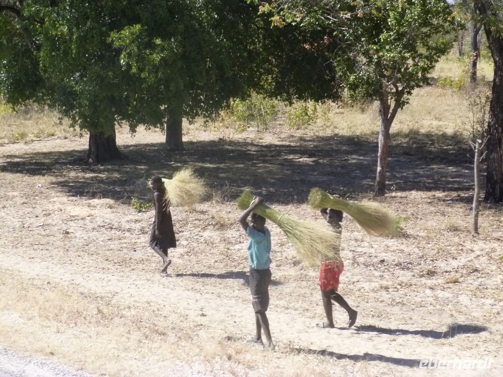 Wir verlassen Rundu und uns erwartet eine lange Fahrt durch den Caprivizipfel. Wieder sehen wir die Runddörfer mit ihren runden Hütten, die meist einer Familie gehören. Sie leben ohne Strom und Wasser. Das Wasser wird von weit her geholt und so beobachten wir Kinder, die mit einem Holzschlitten mit Rindern davor Wasser transportieren. Uns begegnen Frauen, die zum Teil in schönen Kleidern Hirse und andere Lebensmittel in Schalen auf dem Kopf tragen. In dieser Region wird Landwirtschaft betrieben. Vor allem werden Mais und Hirse, aber auch einige Bohnen angebaut. Immer mehr Menschen haben sich hier angesiedelt und damit auch einige Tiere vertrieben. Vor 20 Jahren gab es in Rundu noch Elefanten, die über die Straße liefen und sich jetzt zurück gezogen haben. An der Straße wurden Graspüschel verkauft, die für die Dächer der Häuser verwendet werden. Einige Frauen beobachten wir, die auf dem Kopf dieses Gras trugen. Es ist keine leichte Arbeit, dieses Gras zu schlagen. Auch von einigen Hotels wird es gekauft, um die Dächer in ihren Lodges zu decken. Wir halten in Divundu, um den Kavango-Fluss zu sehen. Wir laufen über die Brücke des Kavango und erreichen den Bwata- Nationalpark. Hier leben die Menschen mit den Tieren, Elefanten und Löwen. Das Gebiet war während des Befreiungskampfes sehr umkämpft und alles war vermint. Noch ein letzter Blick in das Kavangodelta und weiter geht es in den Caprivistreifen.