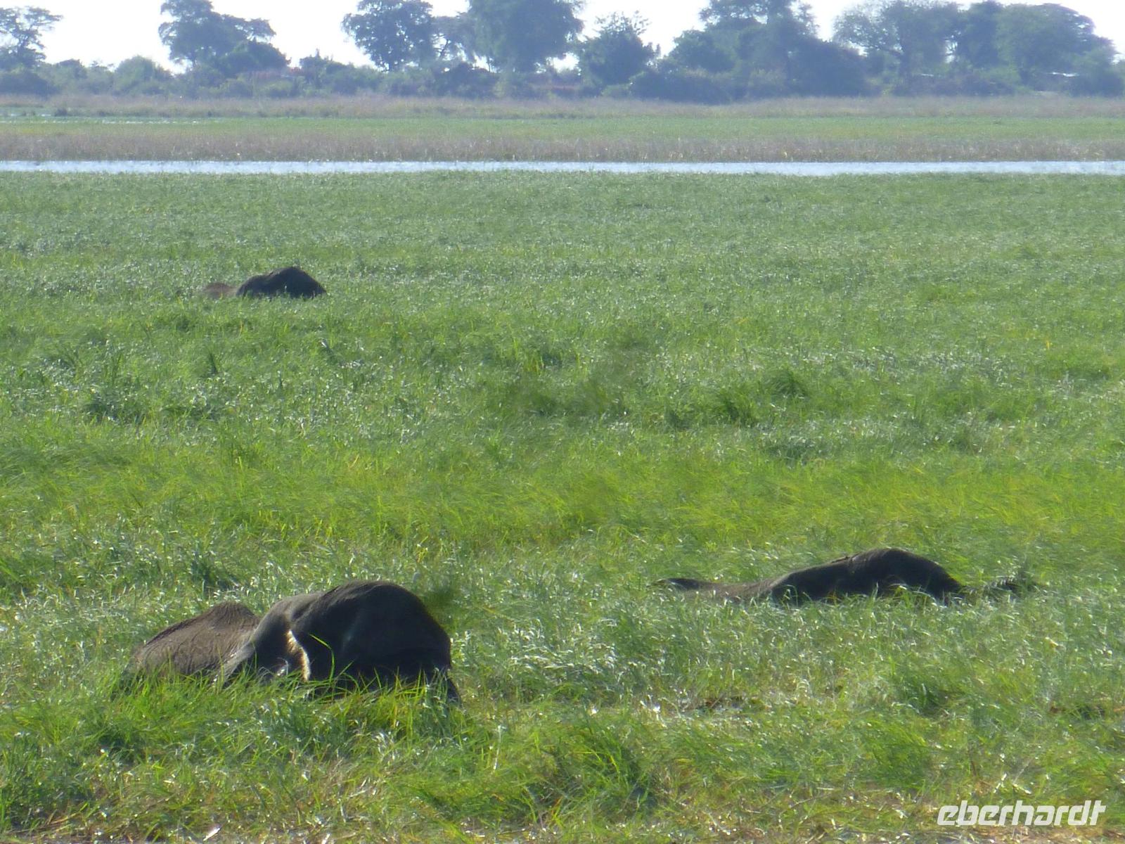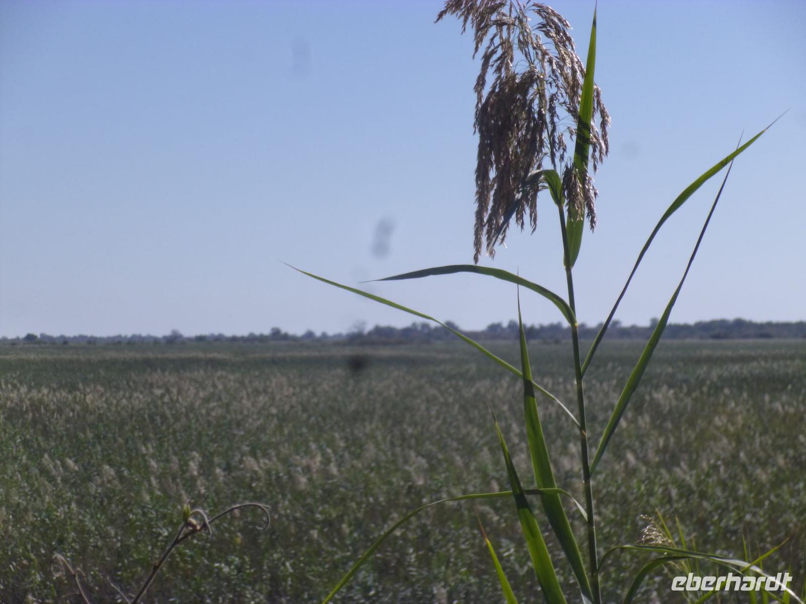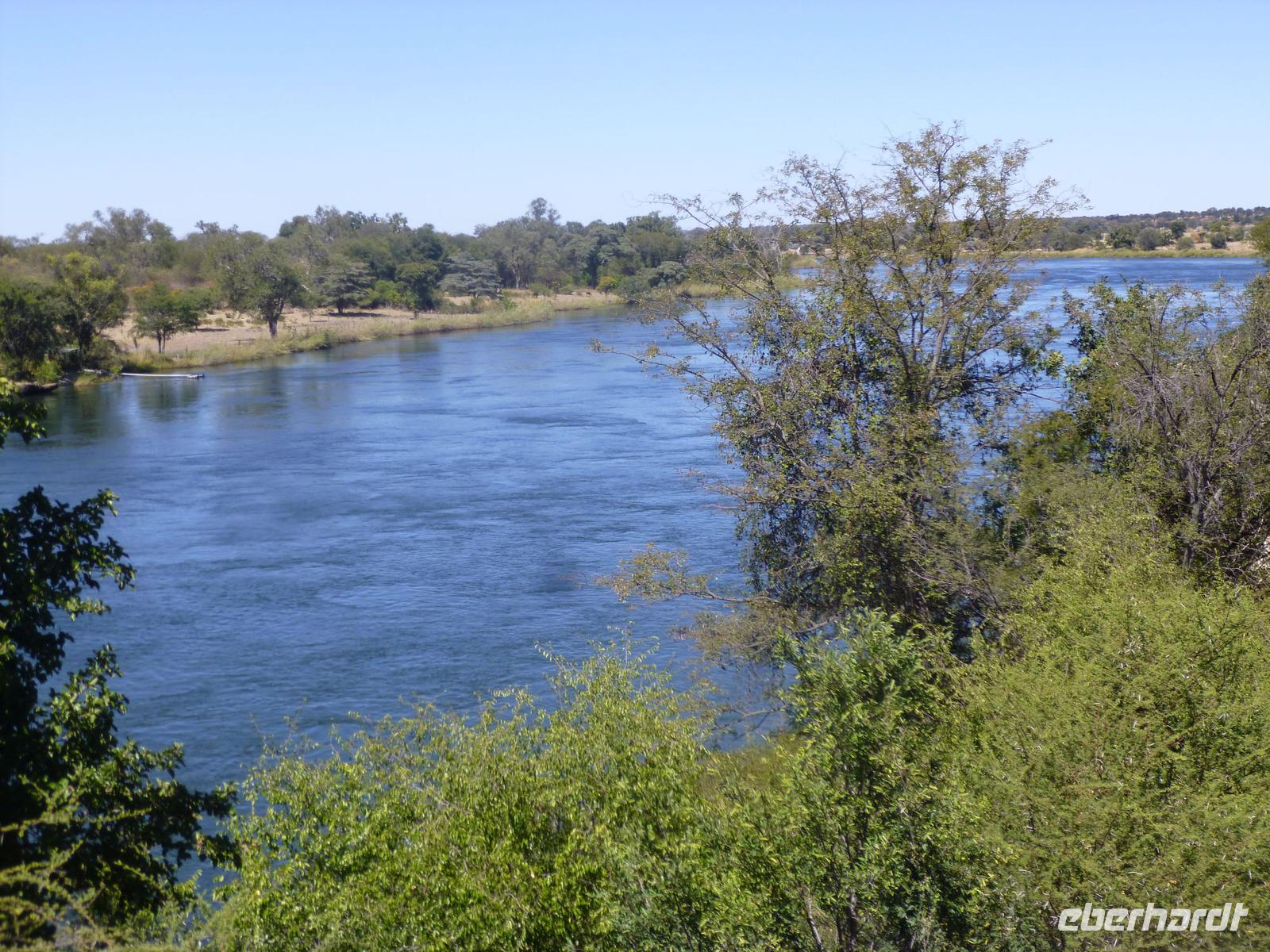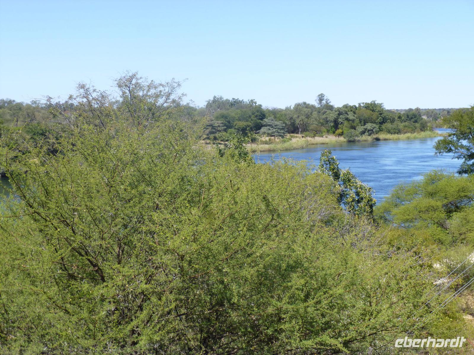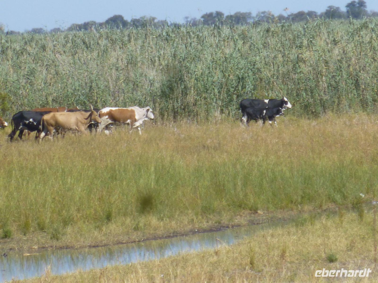 Wir verlassen Rundu und uns erwartet eine lange Fahrt durch den Caprivizipfel. Wieder sehen wir die Runddörfer mit ihren runden Hütten, die meist einer Familie gehören. Sie leben ohne Strom und Wasser. Das Wasser wird von weit her geholt und so beobachten wir Kinder, die mit einem Holzschlitten mit Rindern davor Wasser transportieren. Uns begegnen Frauen, die zum Teil in schönen Kleidern Hirse und andere Lebensmittel in Schalen auf dem Kopf tragen. In dieser Region wird Landwirtschaft betrieben. Vor allem werden Mais und Hirse, aber auch einige Bohnen angebaut. Immer mehr Menschen haben sich hier angesiedelt und damit auch einige Tiere vertrieben. Vor 20 Jahren gab es in Rundu noch Elefanten, die über die Straße liefen und sich jetzt zurück gezogen haben. An der Straße wurden Graspüschel verkauft, die für die Dächer der Häuser verwendet werden. Einige Frauen beobachten wir, die auf dem Kopf dieses Gras trugen. Es ist keine leichte Arbeit, dieses Gras zu schlagen. Auch von einigen Hotels wird es gekauft, um die Dächer in ihren Lodges zu decken. Wir halten in Divundu, um den Kavango-Fluss zu sehen. Wir laufen über die Brücke des Kavango und erreichen den Bwata- Nationalpark. Hier leben die Menschen mit den Tieren, Elefanten und Löwen. Das Gebiet war während des Befreiungskampfes sehr umkämpft und alles war vermint. Noch ein letzter Blick in das Kavangodelta und weiter geht es in den Caprivistreifen.
