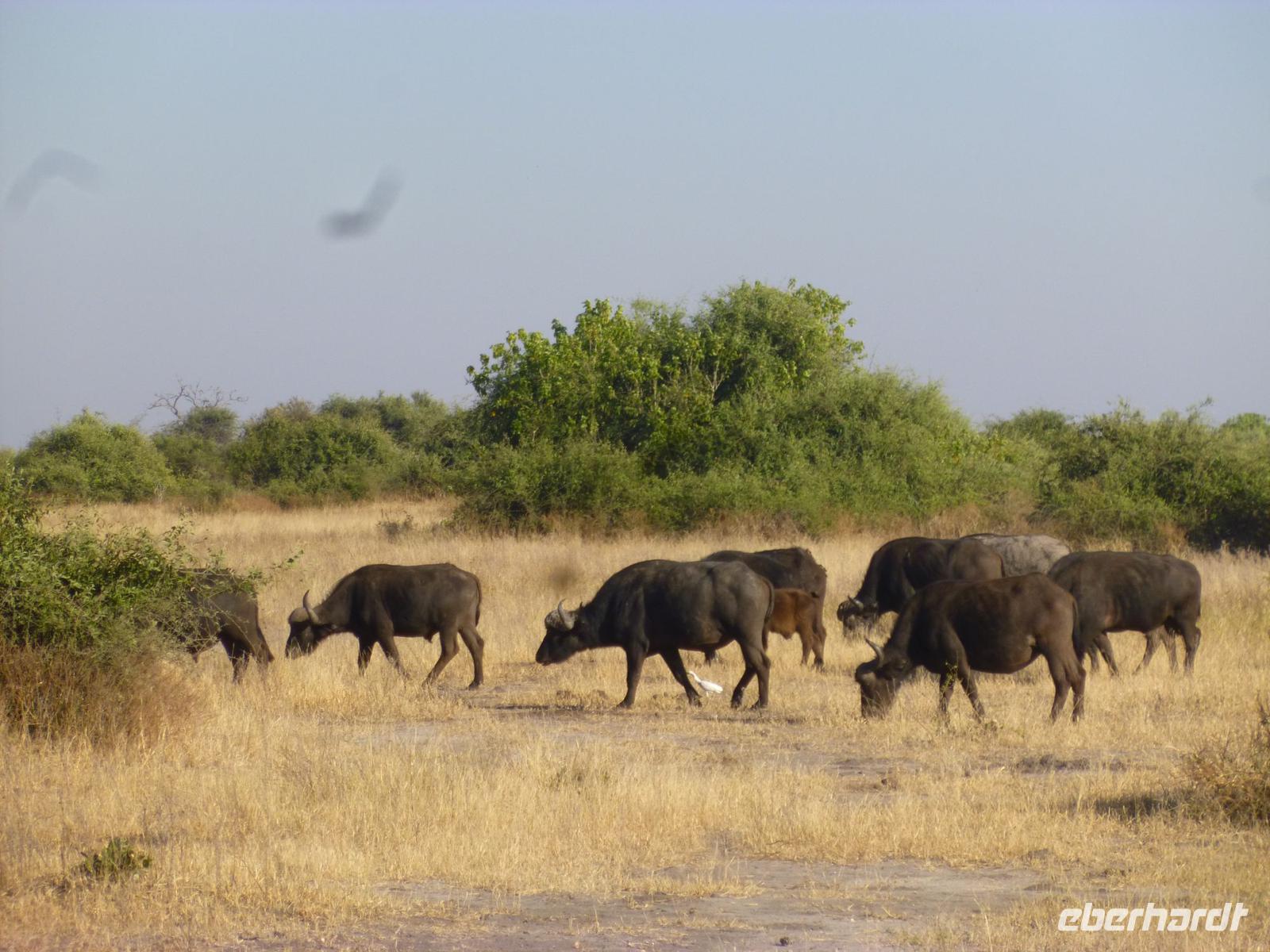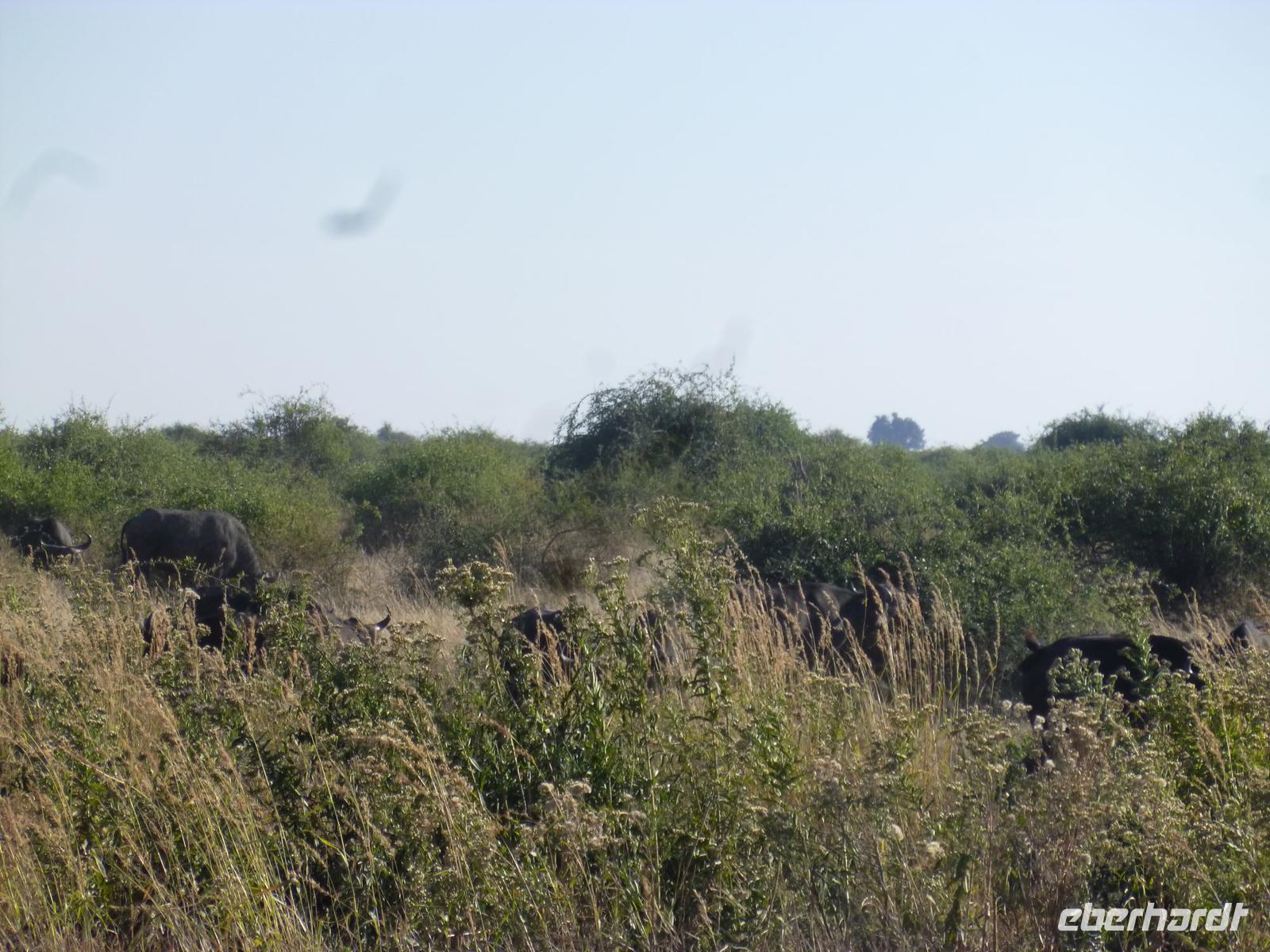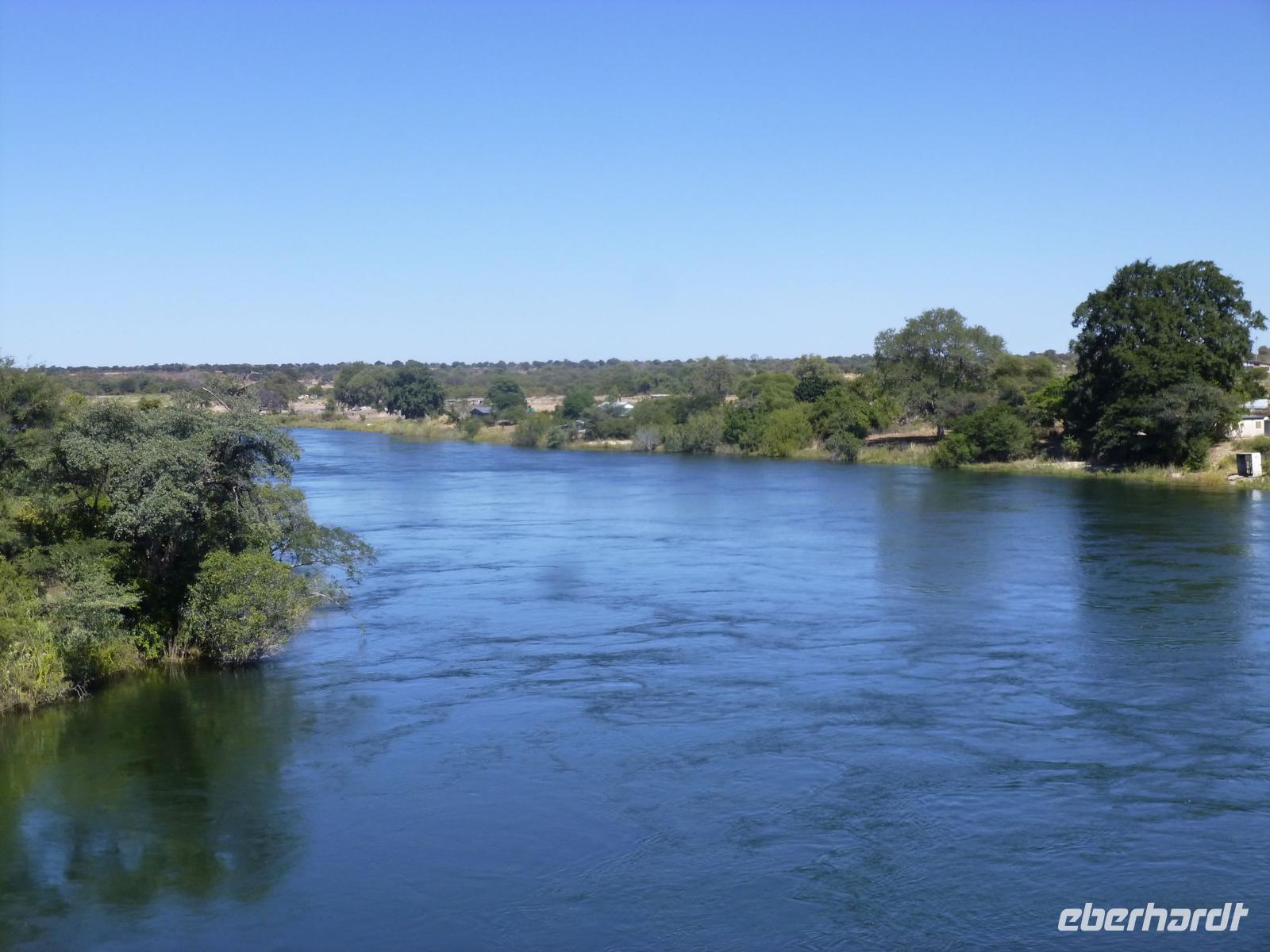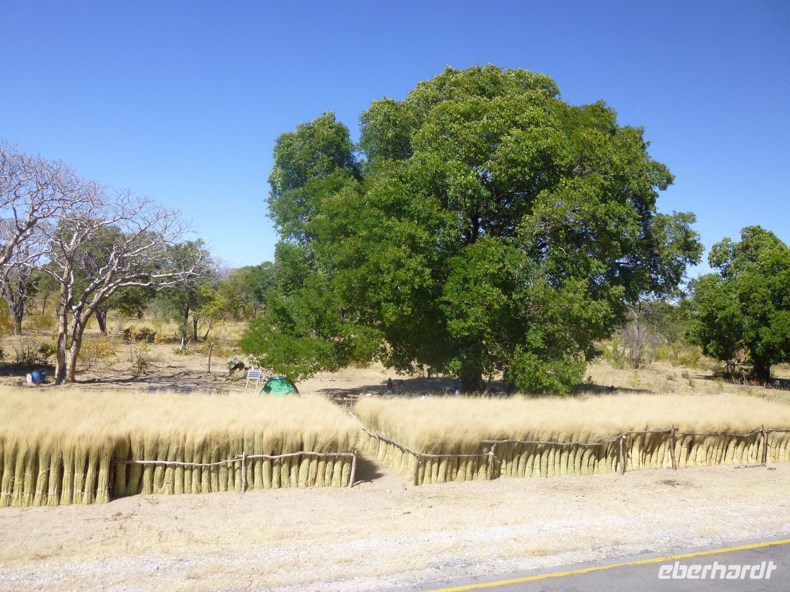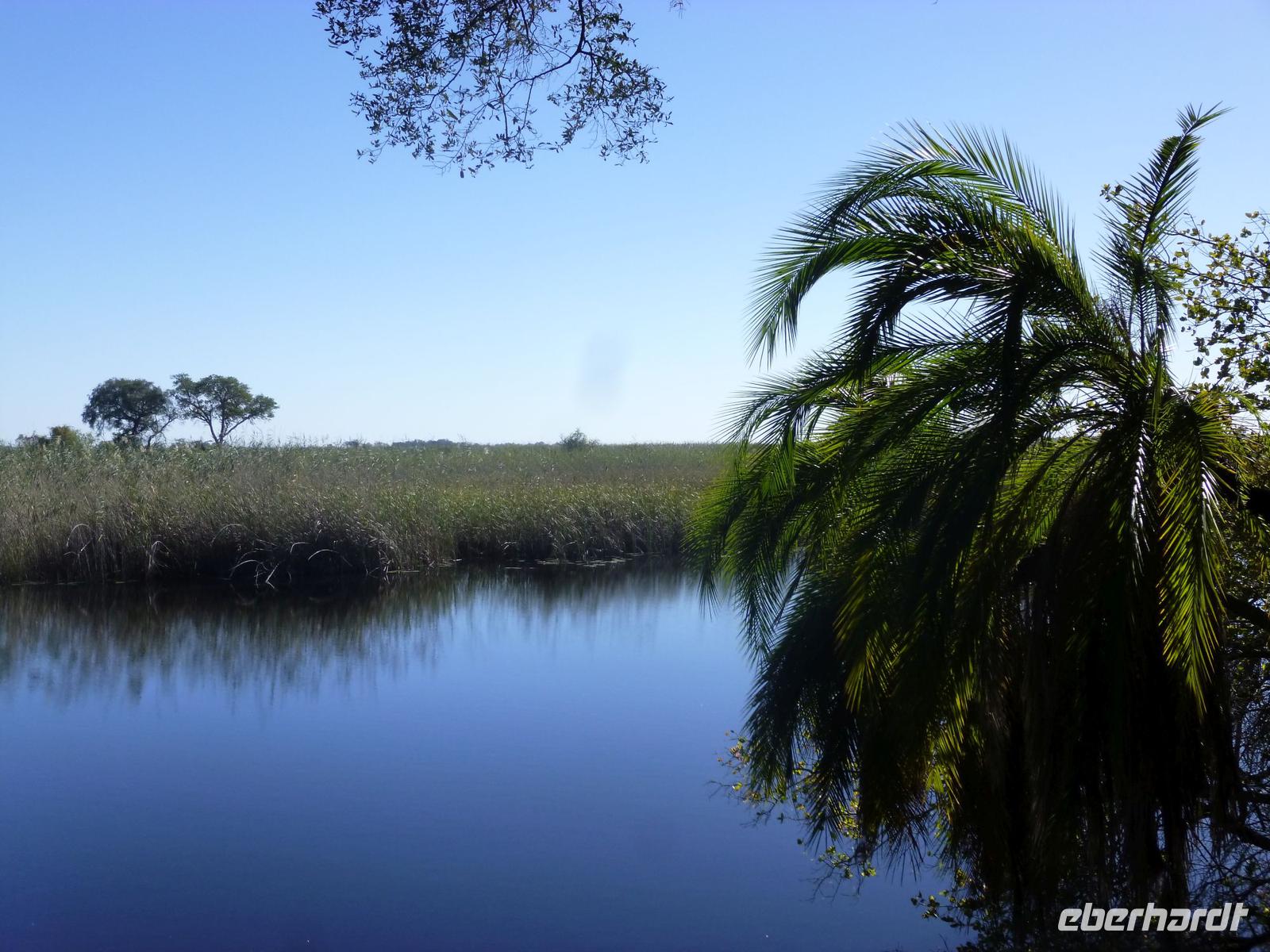 Wir verlassen Rundu und uns erwartet eine lange Fahrt durch den Caprivizipfel. Wieder sehen wir die Runddörfer mit ihren runden Hütten, die meist einer Familie gehören. Sie leben ohne Strom und Wasser. Das Wasser wird von weit her geholt und so beobachten wir Kinder, die mit einem Holzschlitten mit Rindern davor Wasser transportieren. Uns begegnen Frauen, die zum Teil in schönen Kleidern Hirse und andere Lebensmittel in Schalen auf dem Kopf tragen. In dieser Region wird Landwirtschaft betrieben. Vor allem werden Mais und Hirse, aber auch einige Bohnen angebaut. Immer mehr Menschen haben sich hier angesiedelt und damit auch einige Tiere vertrieben. Vor 20 Jahren gab es in Rundu noch Elefanten, die über die Straße liefen und sich jetzt zurück gezogen haben. An der Straße wurden Graspüschel verkauft, die für die Dächer der Häuser verwendet werden. Einige Frauen beobachten wir, die auf dem Kopf dieses Gras trugen. Es ist keine leichte Arbeit, dieses Gras zu schlagen. Auch von einigen Hotels wird es gekauft, um die Dächer in ihren Lodges zu decken. Wir halten in Divundu, um den Kavango-Fluss zu sehen. Wir laufen über die Brücke des Kavango und erreichen den Bwata- Nationalpark. Hier leben die Menschen mit den Tieren, Elefanten und Löwen. Das Gebiet war während des Befreiungskampfes sehr umkämpft und alles war vermint. Noch ein letzter Blick in das Kavangodelta und weiter geht es in den Caprivistreifen.