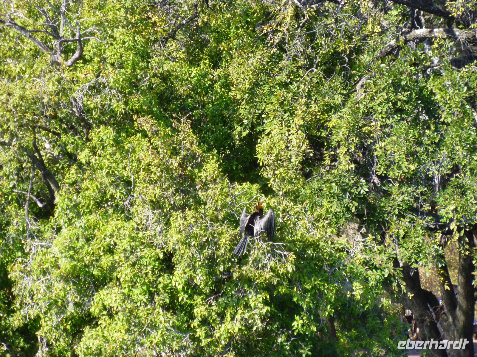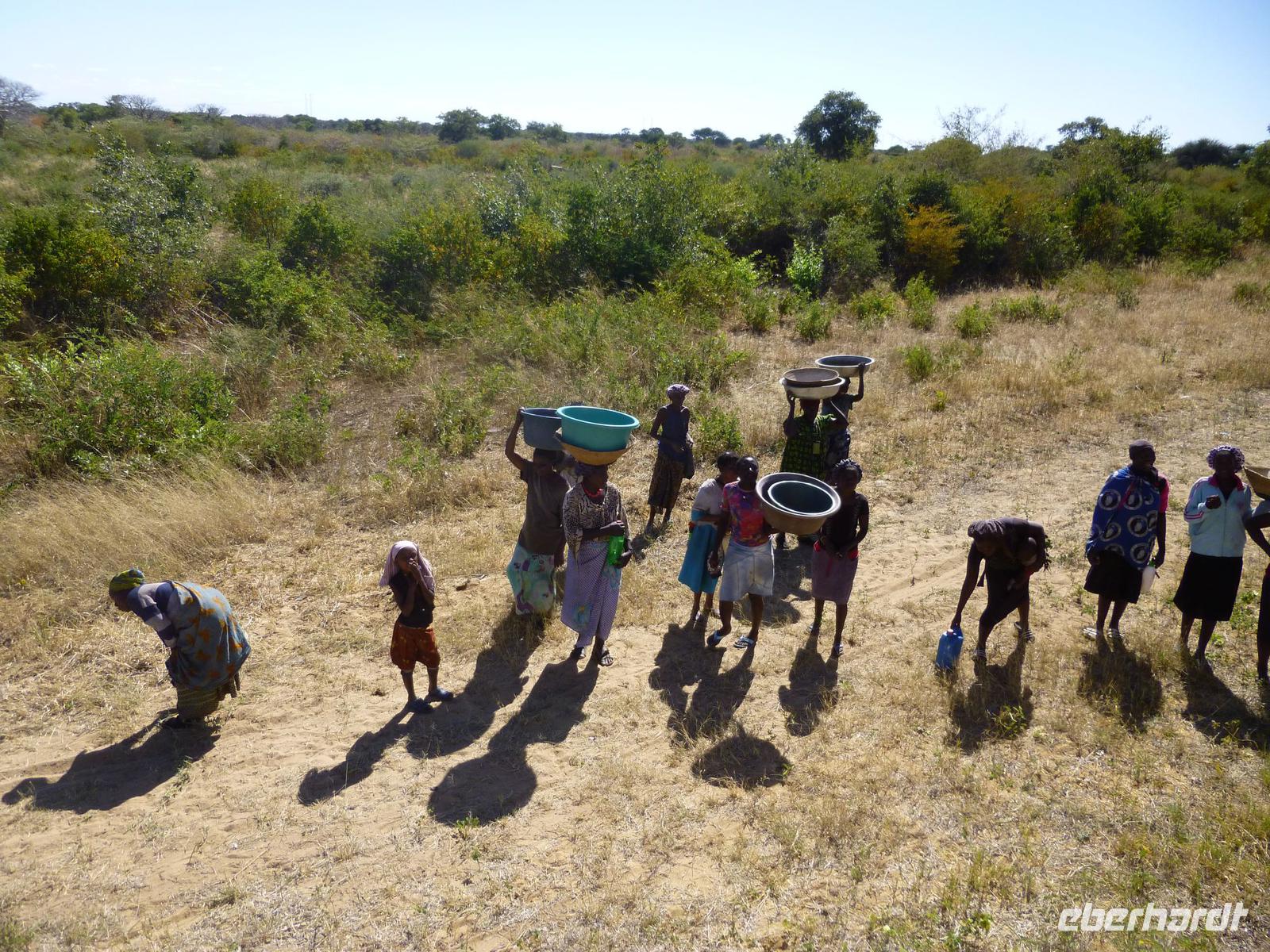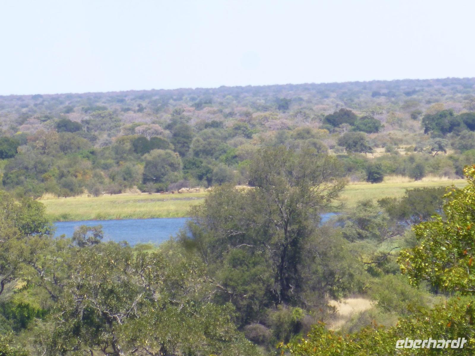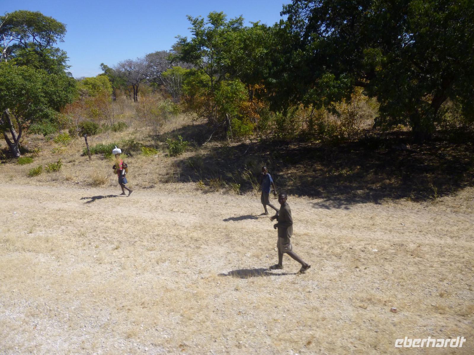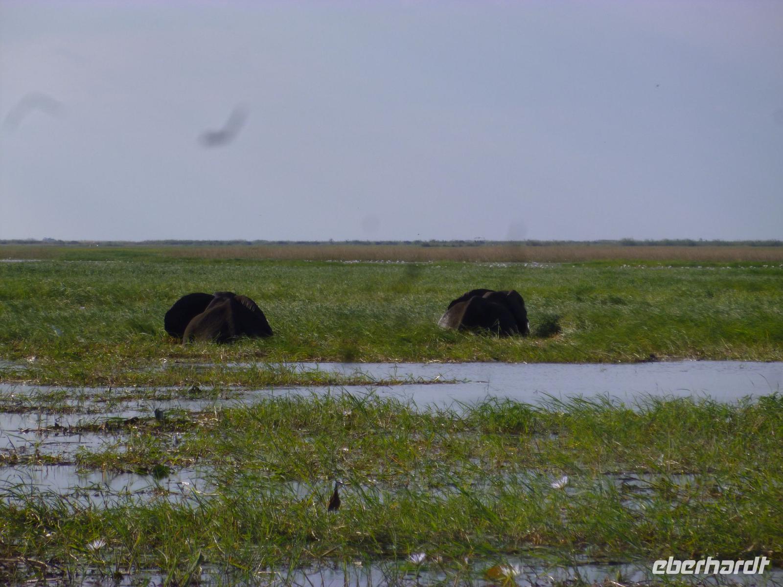 Wir verlassen Rundu und uns erwartet eine lange Fahrt durch den Caprivizipfel. Wieder sehen wir die Runddörfer mit ihren runden Hütten, die meist einer Familie gehören. Sie leben ohne Strom und Wasser. Das Wasser wird von weit her geholt und so beobachten wir Kinder, die mit einem Holzschlitten mit Rindern davor Wasser transportieren. Uns begegnen Frauen, die zum Teil in schönen Kleidern Hirse und andere Lebensmittel in Schalen auf dem Kopf tragen. In dieser Region wird Landwirtschaft betrieben. Vor allem werden Mais und Hirse, aber auch einige Bohnen angebaut. Immer mehr Menschen haben sich hier angesiedelt und damit auch einige Tiere vertrieben. Vor 20 Jahren gab es in Rundu noch Elefanten, die über die Straße liefen und sich jetzt zurück gezogen haben. An der Straße wurden Graspüschel verkauft, die für die Dächer der Häuser verwendet werden. Einige Frauen beobachten wir, die auf dem Kopf dieses Gras trugen. Es ist keine leichte Arbeit, dieses Gras zu schlagen. Auch von einigen Hotels wird es gekauft, um die Dächer in ihren Lodges zu decken. Wir halten in Divundu, um den Kavango-Fluss zu sehen. Wir laufen über die Brücke des Kavango und erreichen den Bwata- Nationalpark. Hier leben die Menschen mit den Tieren, Elefanten und Löwen. Das Gebiet war während des Befreiungskampfes sehr umkämpft und alles war vermint. Noch ein letzter Blick in das Kavangodelta und weiter geht es in den Caprivistreifen.