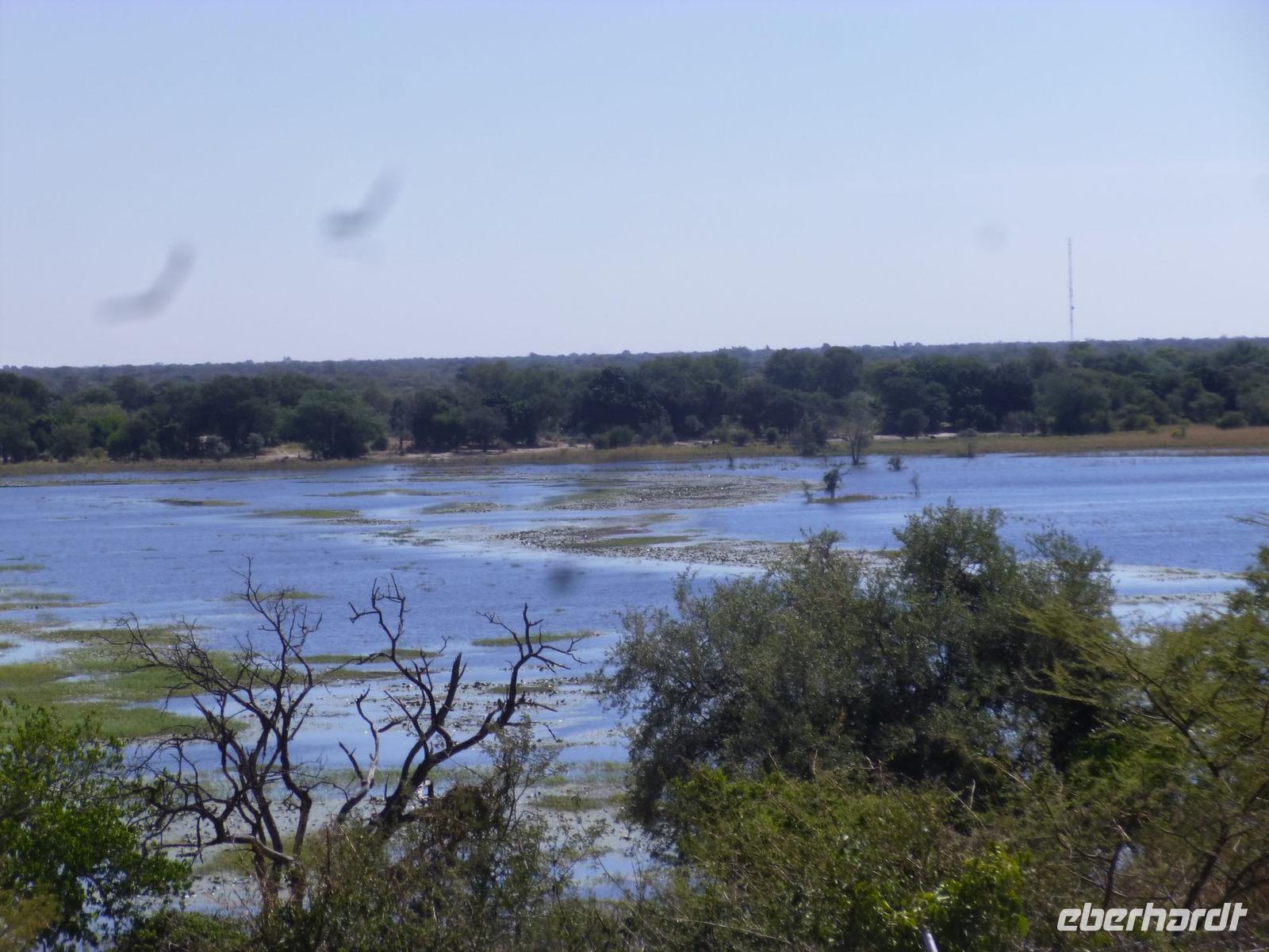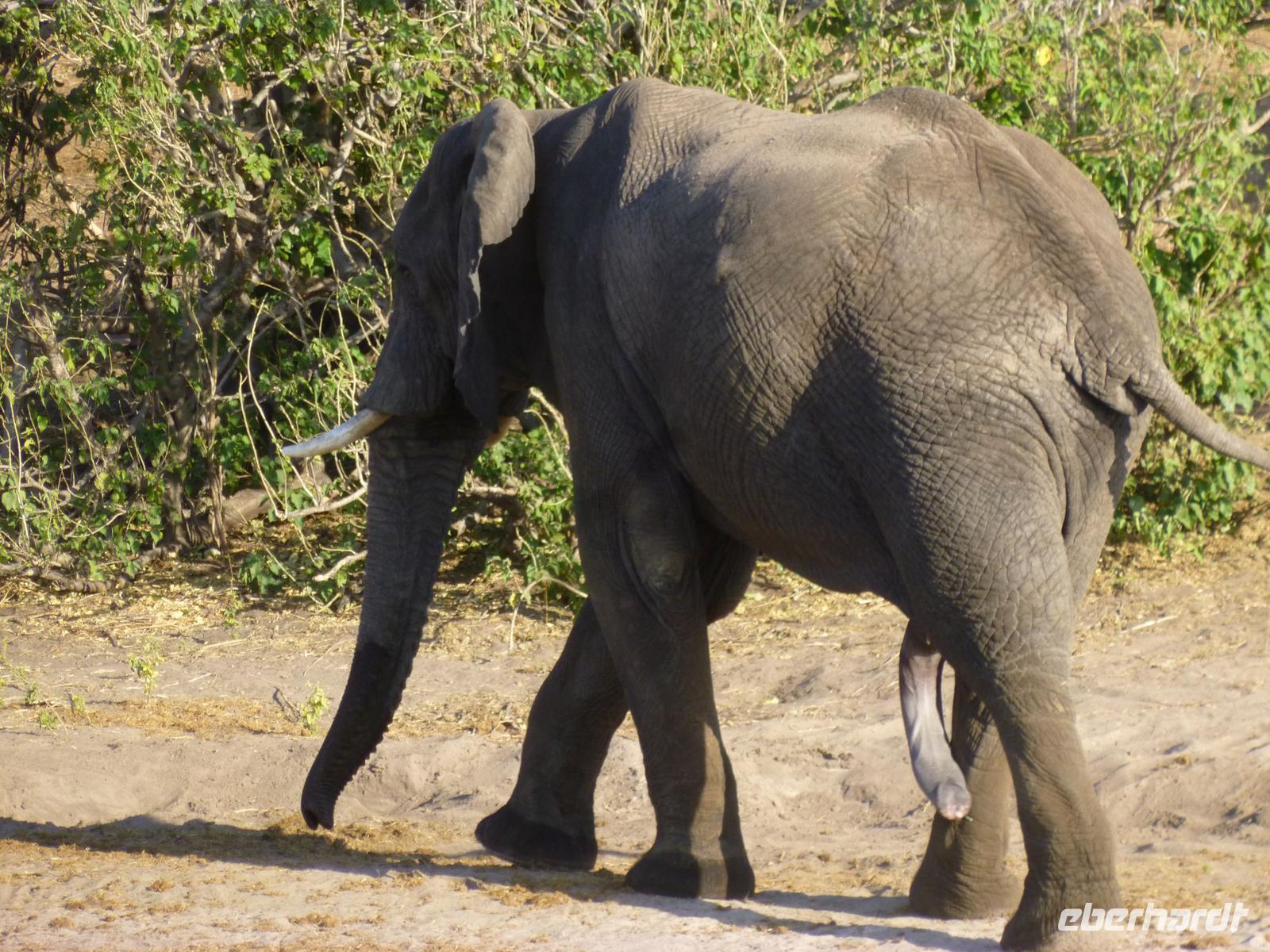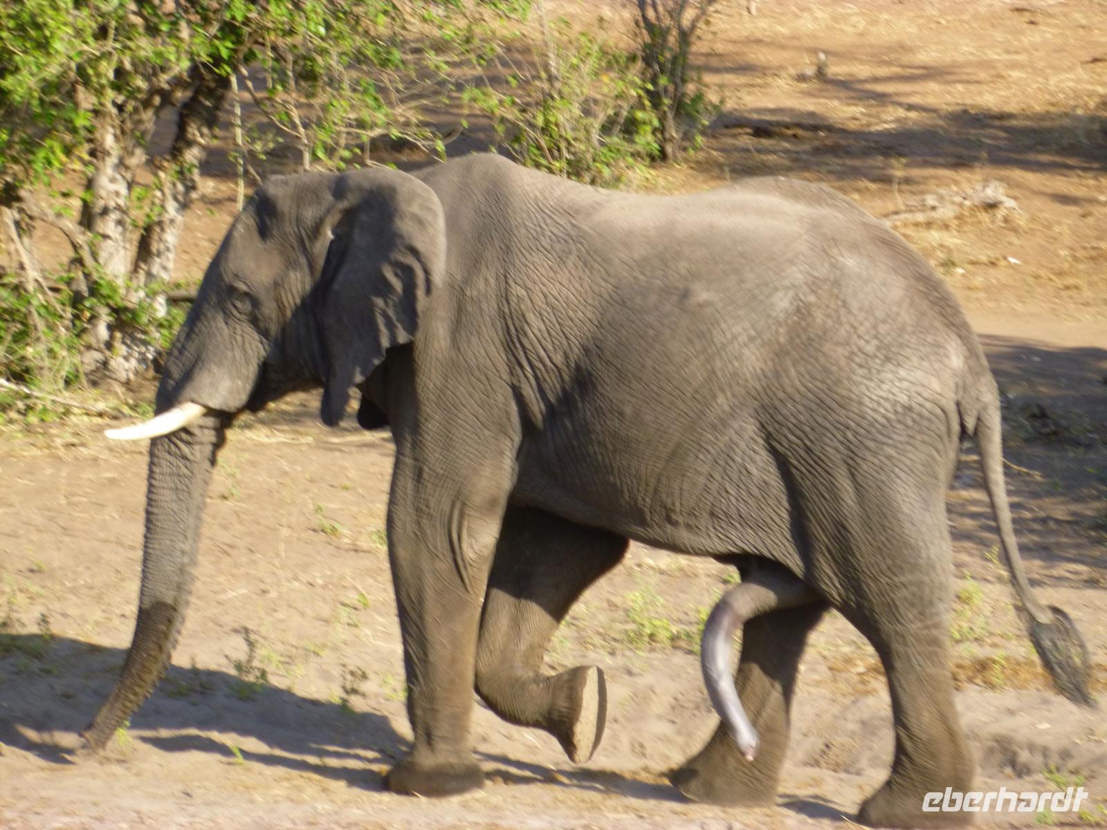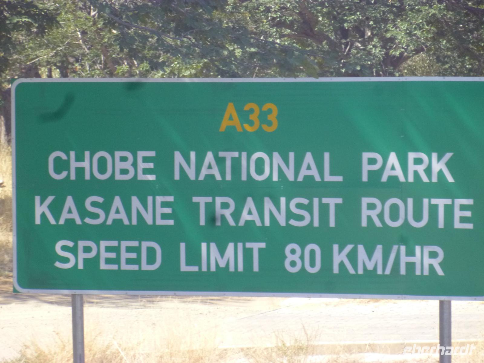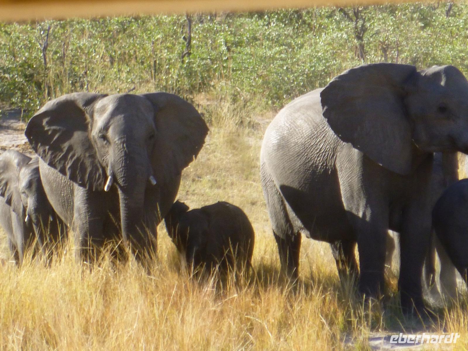 Wir verlassen den Caprivistreifen und fahren vorbei an Baobab Bäumen und den typischen Runddörfern zur Ngoma Bridge zur Grenzkontrolle. Anschließend überqueren wir die Grenze nach Botswana. Wir fuhren durch den Chobe Nationalpark nach Kasane. Tom erhielt den Hinweis, dass wir nicht anhalten und die Strecke nicht verlassen dürfen. Der Nationalpark umfasst ein Gebiet von 11.00 Quadratkilometer. Die Wildkonzentration ist sehr hoch. Allein 50.000 Elefanten leben im Park. Das stellt ein Problem für die Ökologie dar. Die Elefantenherden verursachen erhebliche Schäden.