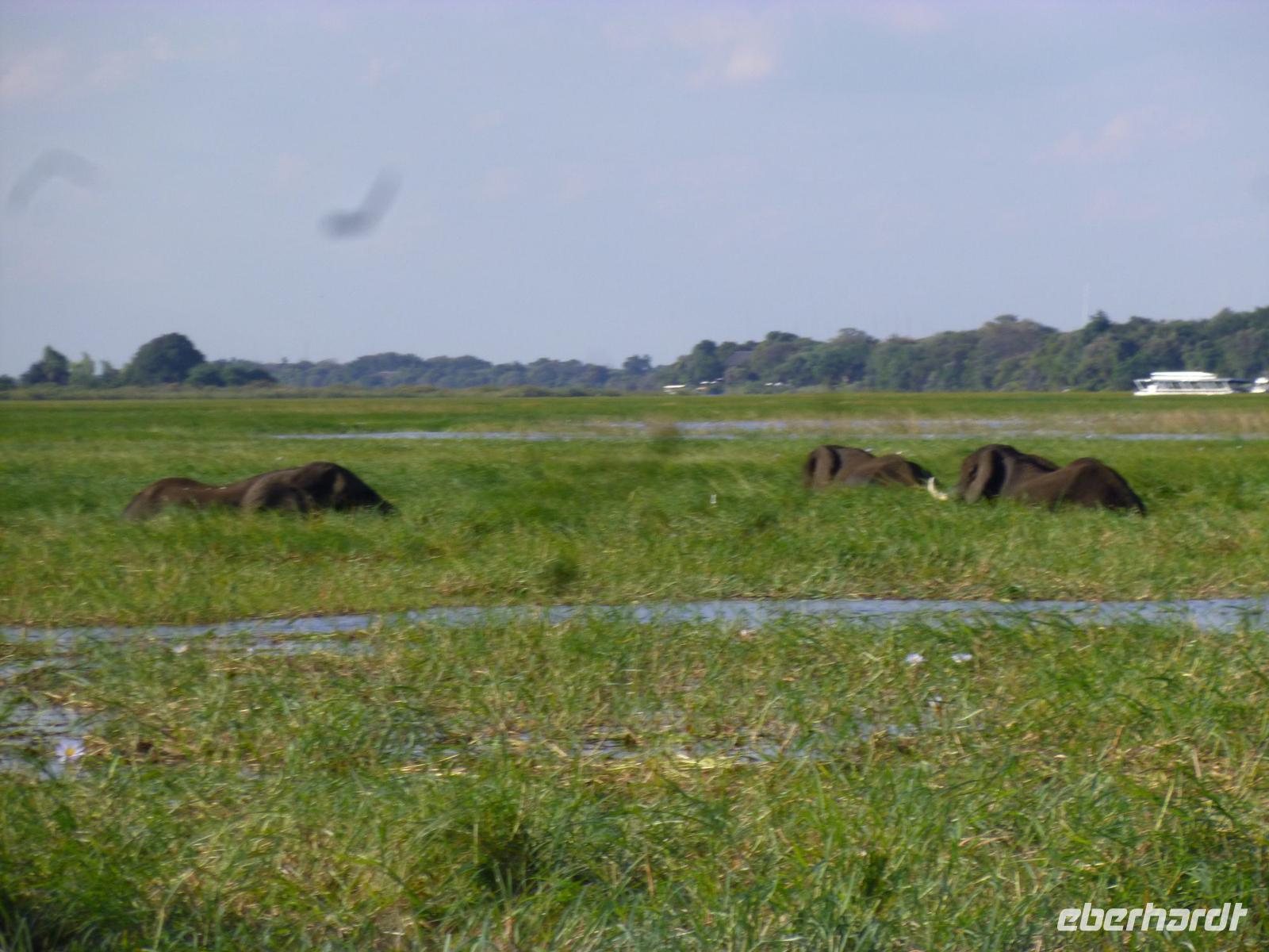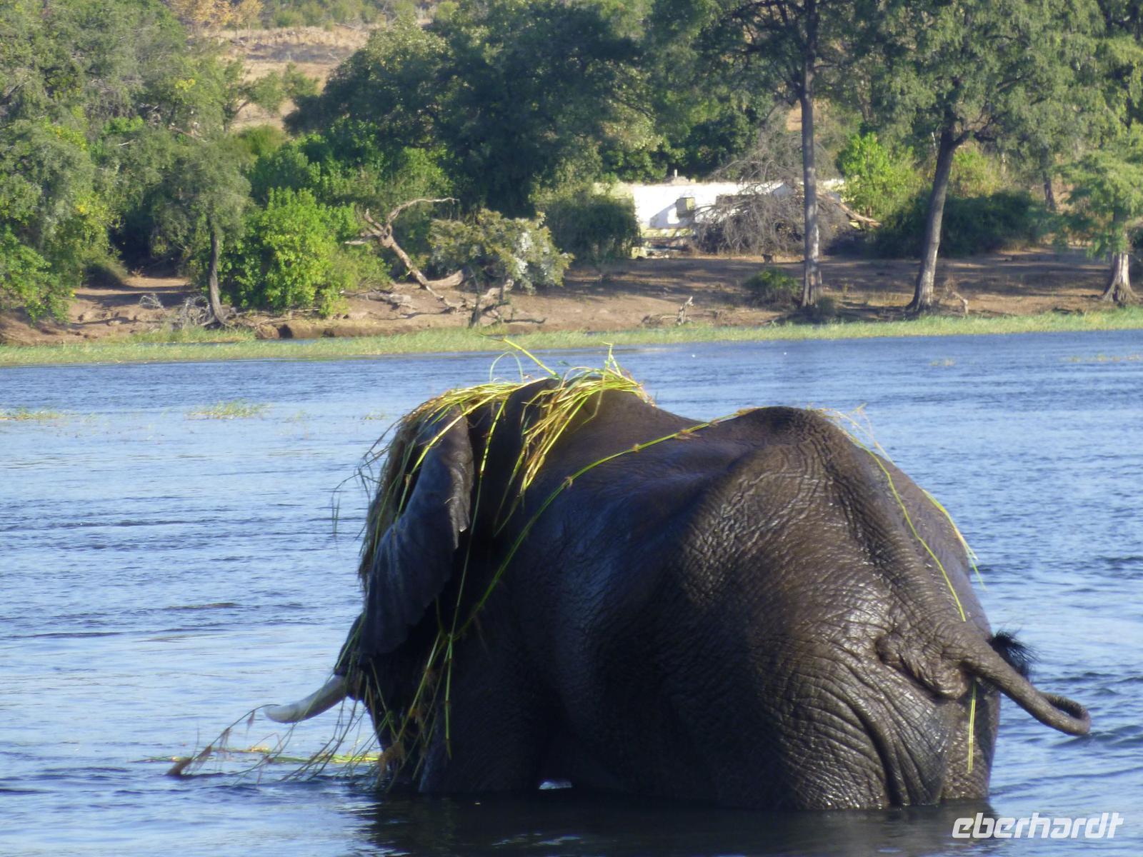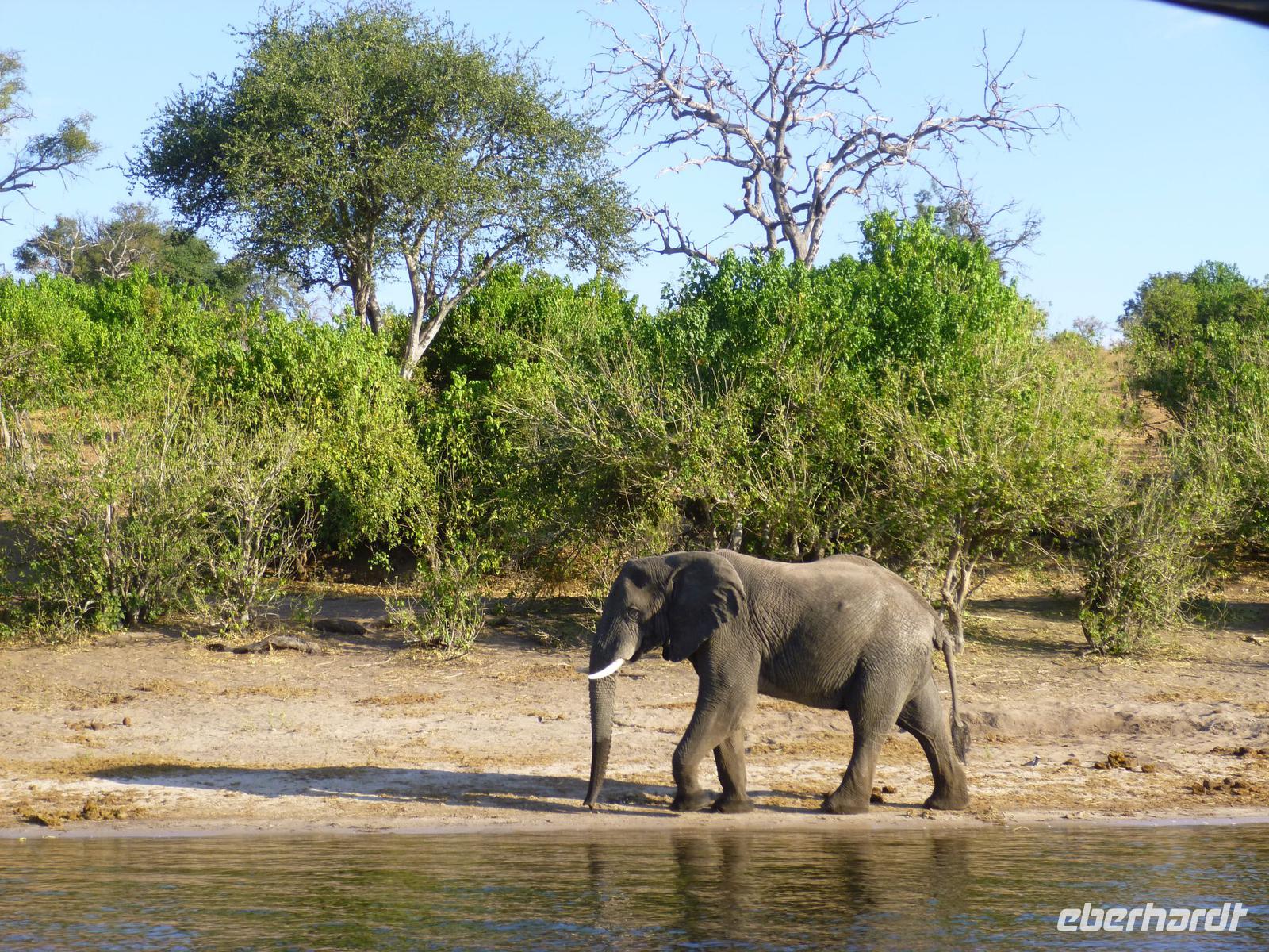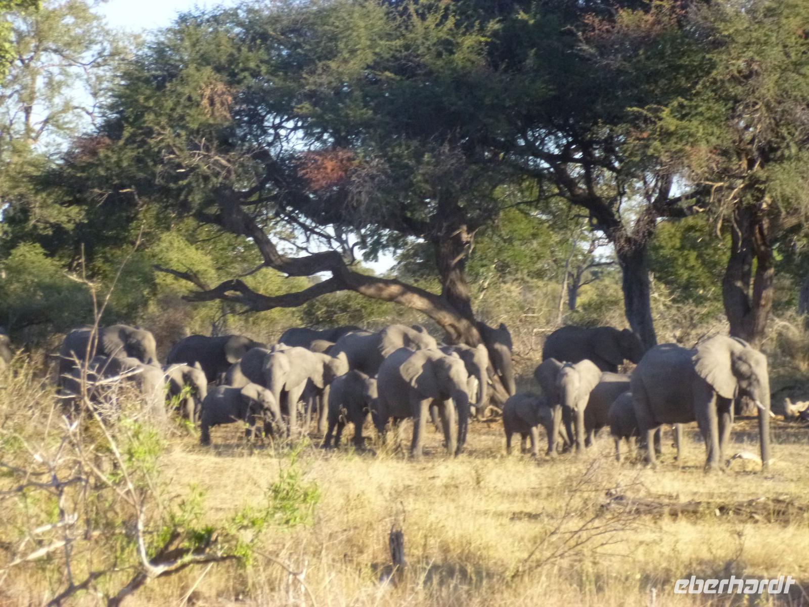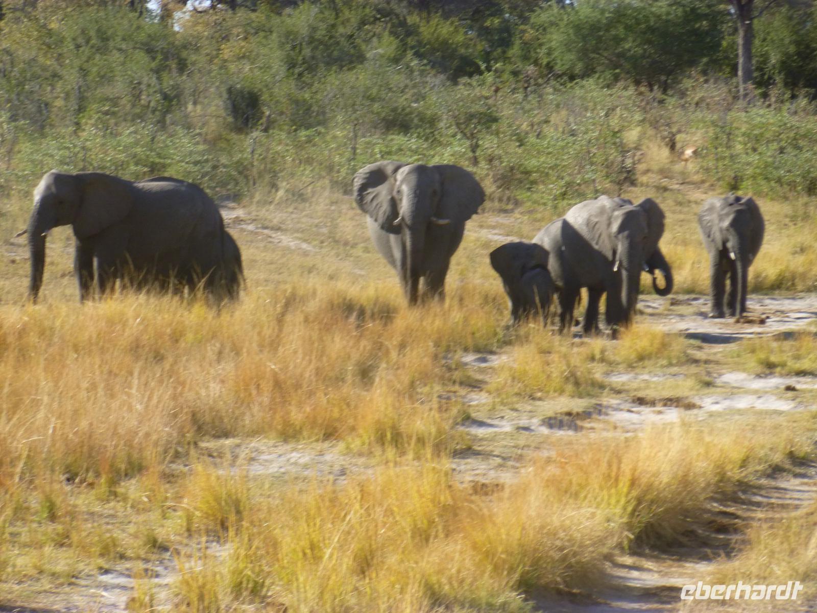 Wir verlassen den Caprivistreifen und fahren vorbei an Baobab Bäumen und den typischen Runddörfern zur Ngoma Bridge zur Grenzkontrolle. Anschließend überqueren wir die Grenze nach Botswana. Wir fuhren durch den Chobe Nationalpark nach Kasane. Tom erhielt den Hinweis, dass wir nicht anhalten und die Strecke nicht verlassen dürfen. Der Nationalpark umfasst ein Gebiet von 11.00 Quadratkilometer. Die Wildkonzentration ist sehr hoch. Allein 50.000 Elefanten leben im Park. Das stellt ein Problem für die Ökologie dar. Die Elefantenherden verursachen erhebliche Schäden.