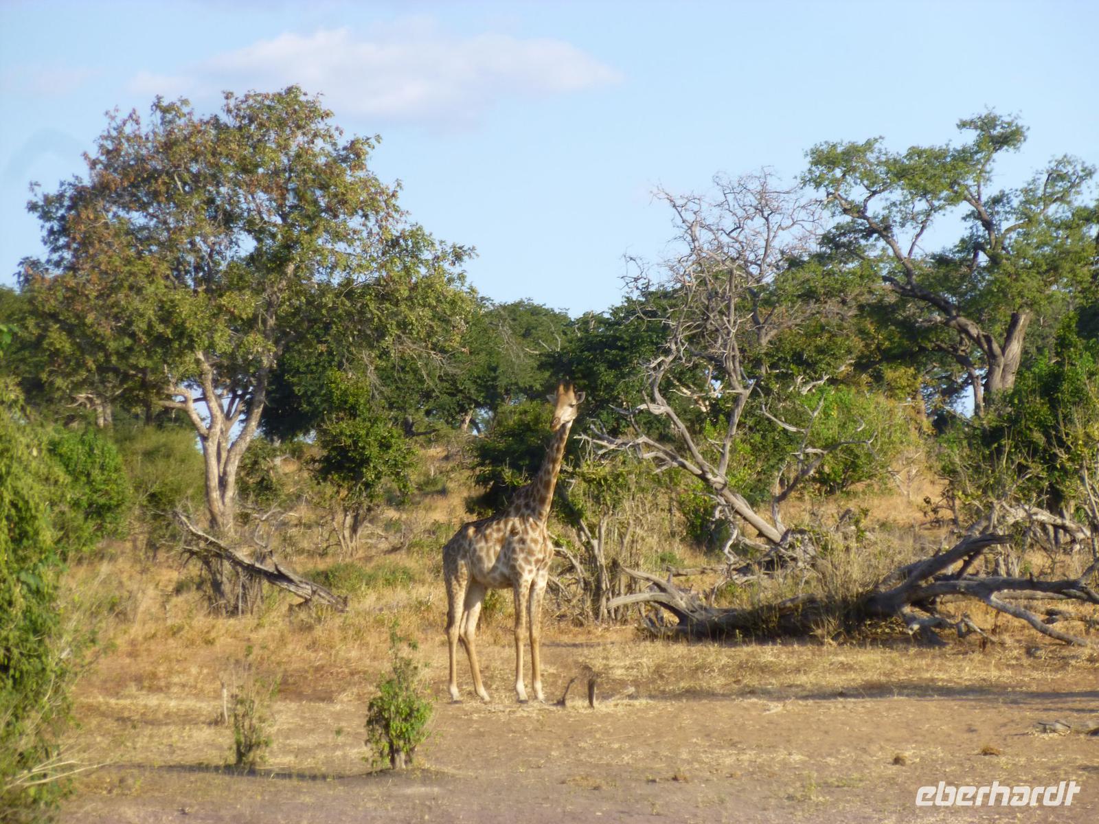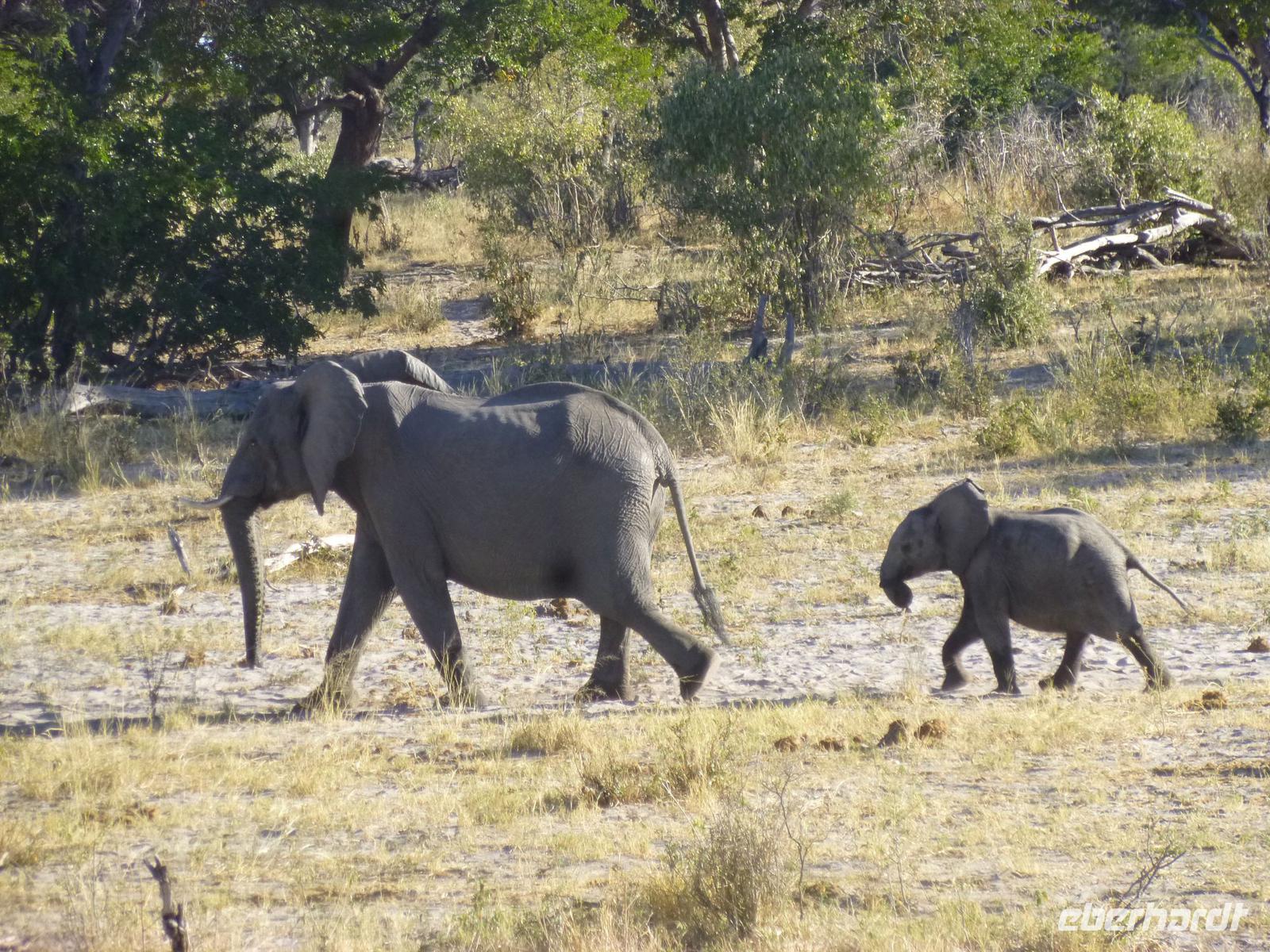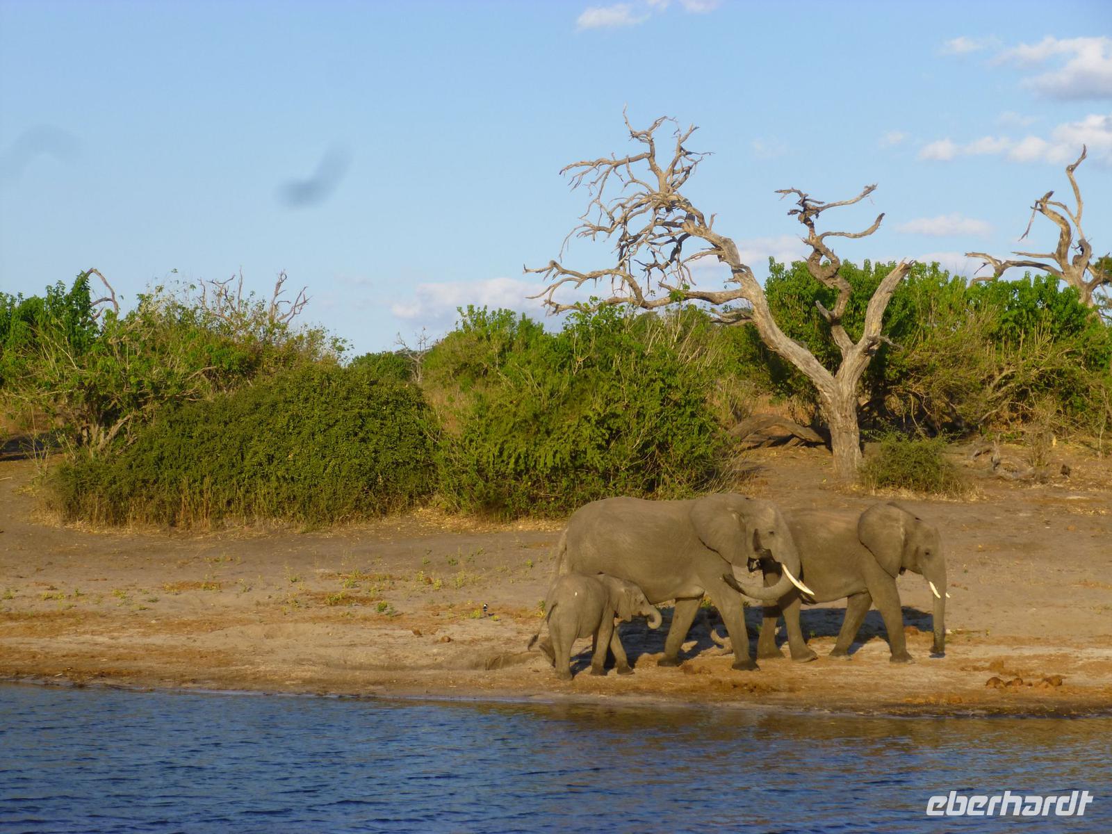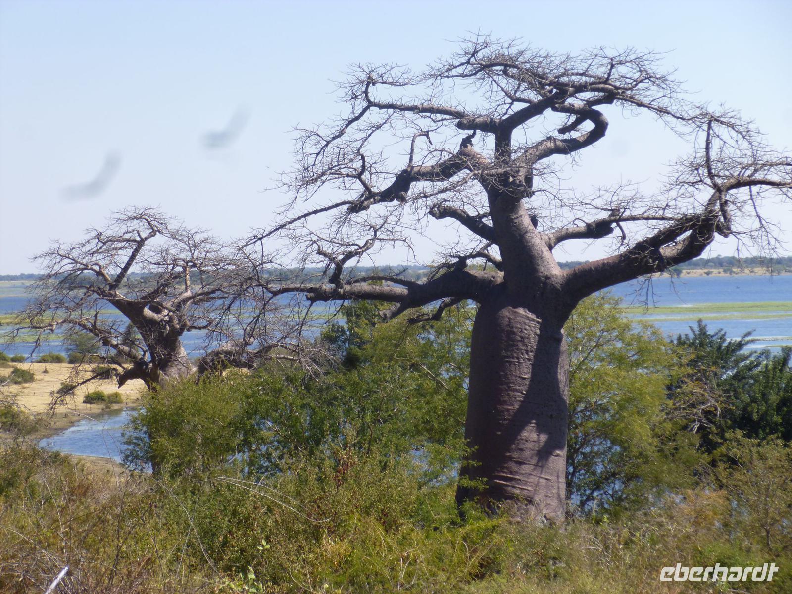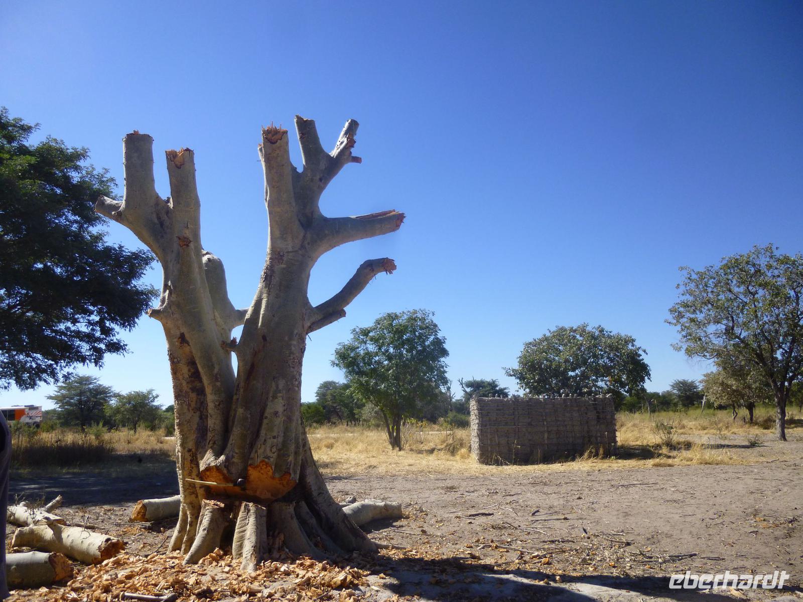 Wir verlassen den Caprivistreifen und fahren vorbei an Baobab Bäumen und den typischen Runddörfern zur Ngoma Bridge zur Grenzkontrolle. Anschließend überqueren wir die Grenze nach Botswana. Wir fuhren durch den Chobe Nationalpark nach Kasane. Tom erhielt den Hinweis, dass wir nicht anhalten und die Strecke nicht verlassen dürfen. Der Nationalpark umfasst ein Gebiet von 11.00 Quadratkilometer. Die Wildkonzentration ist sehr hoch. Allein 50.000 Elefanten leben im Park. Das stellt ein Problem für die Ökologie dar. Die Elefantenherden verursachen erhebliche Schäden.