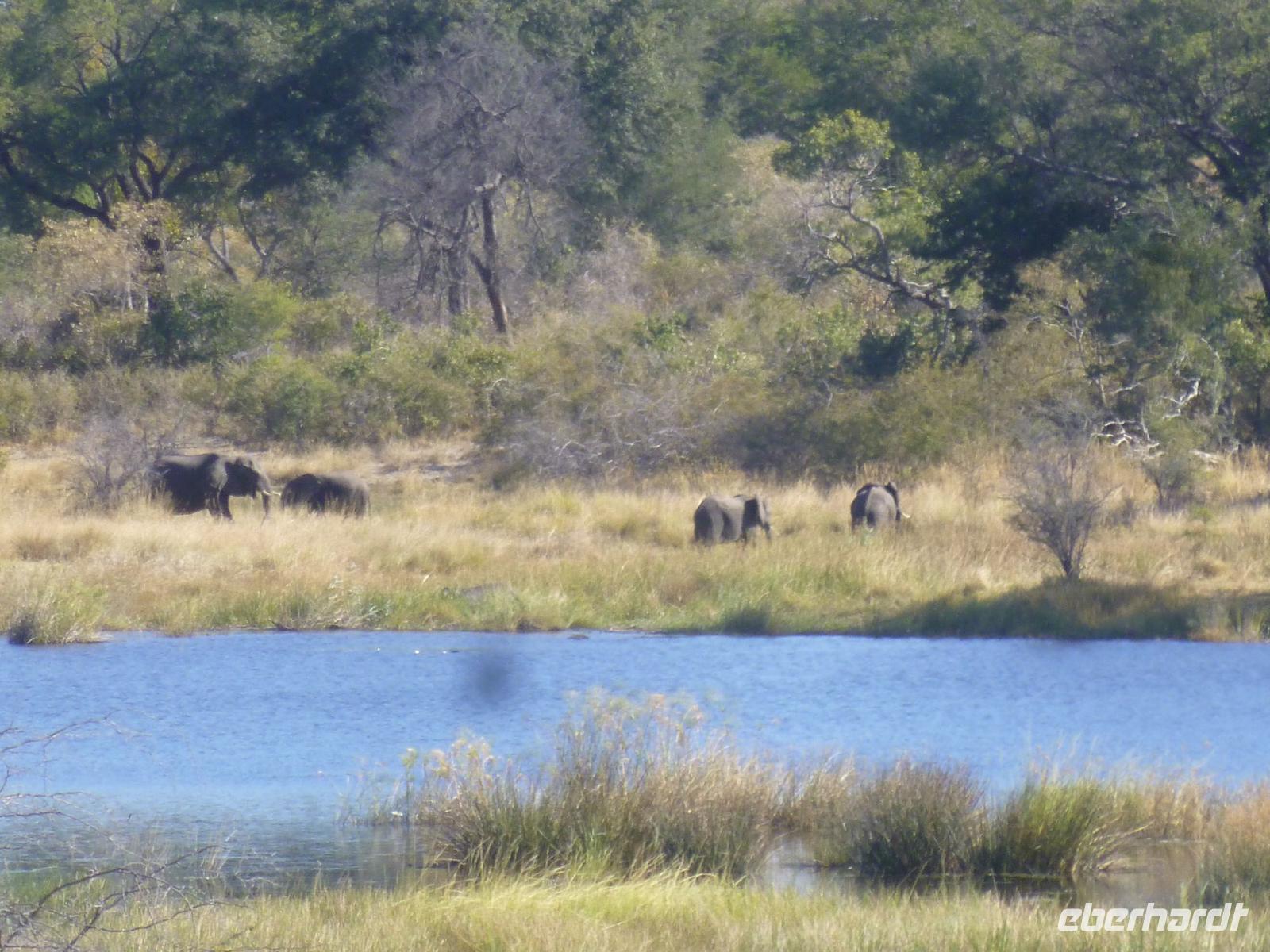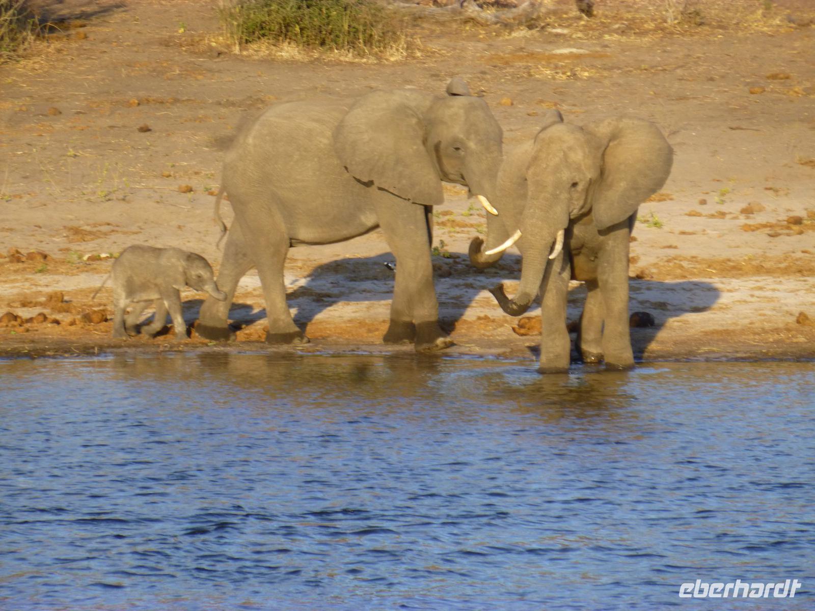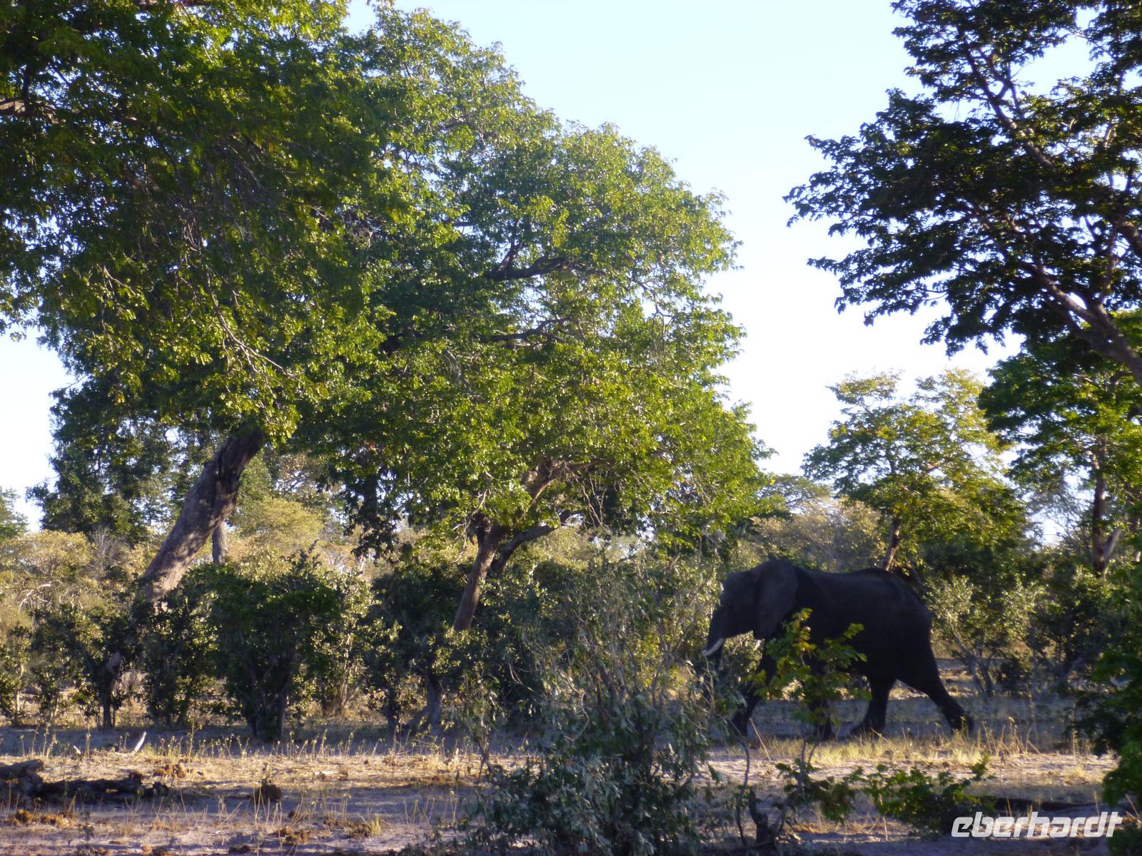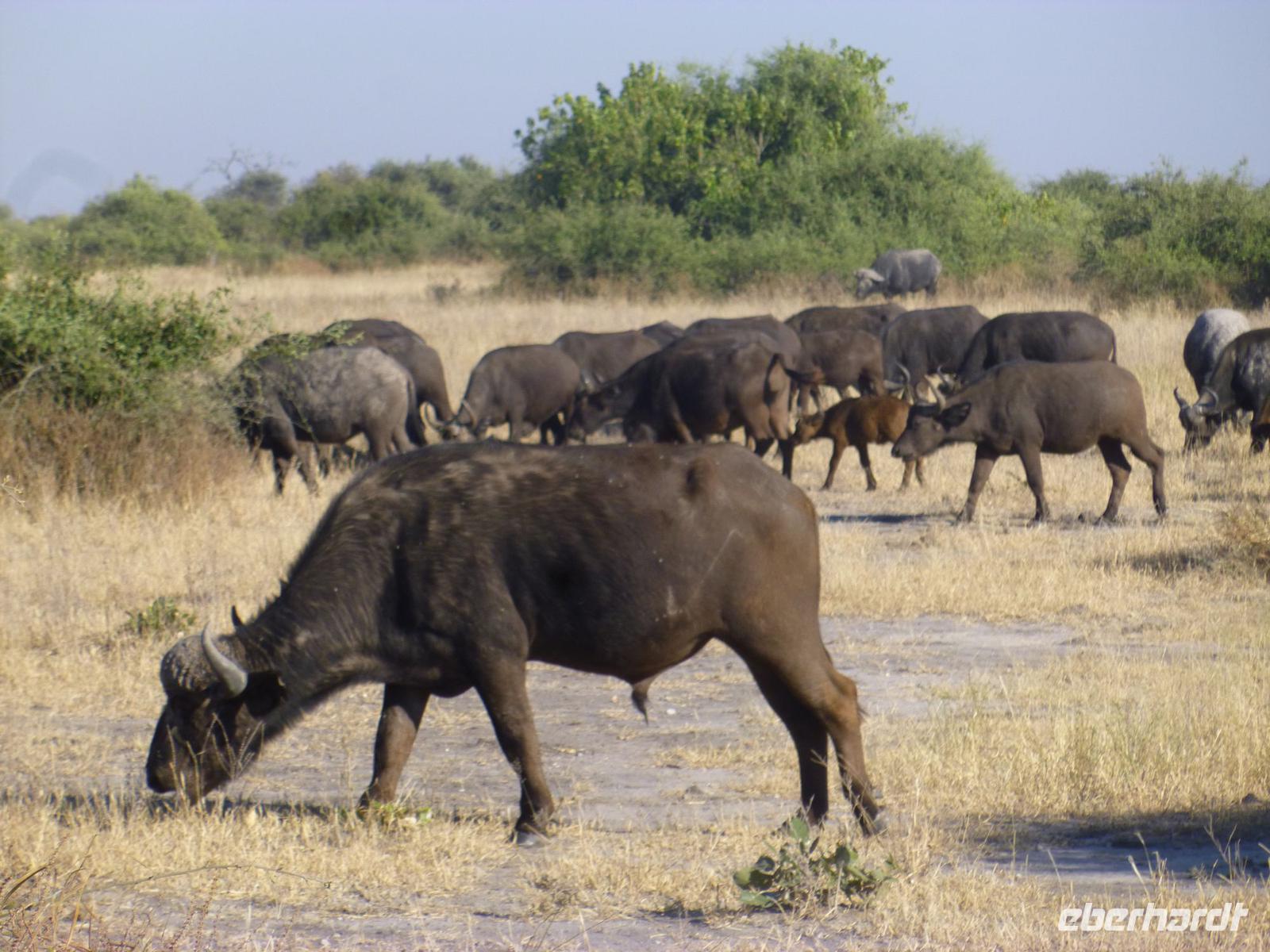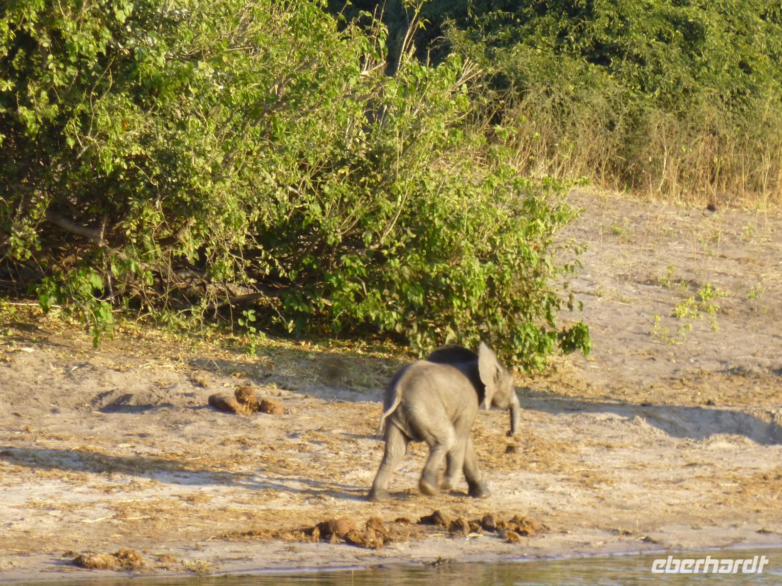 Wir verlassen den Caprivistreifen und fahren vorbei an Baobab Bäumen und den typischen Runddörfern zur Ngoma Bridge zur Grenzkontrolle. Anschließend überqueren wir die Grenze nach Botswana. Wir fuhren durch den Chobe Nationalpark nach Kasane. Tom erhielt den Hinweis, dass wir nicht anhalten und die Strecke nicht verlassen dürfen. Der Nationalpark umfasst ein Gebiet von 11.00 Quadratkilometer. Die Wildkonzentration ist sehr hoch. Allein 50.000 Elefanten leben im Park. Das stellt ein Problem für die Ökologie dar. Die Elefantenherden verursachen erhebliche Schäden.