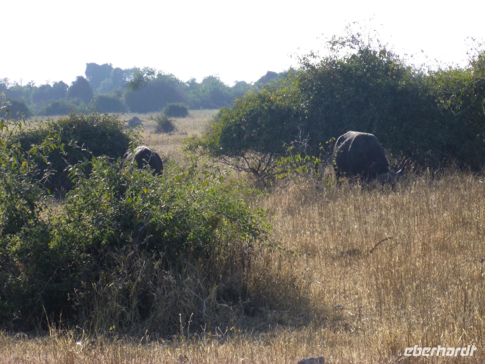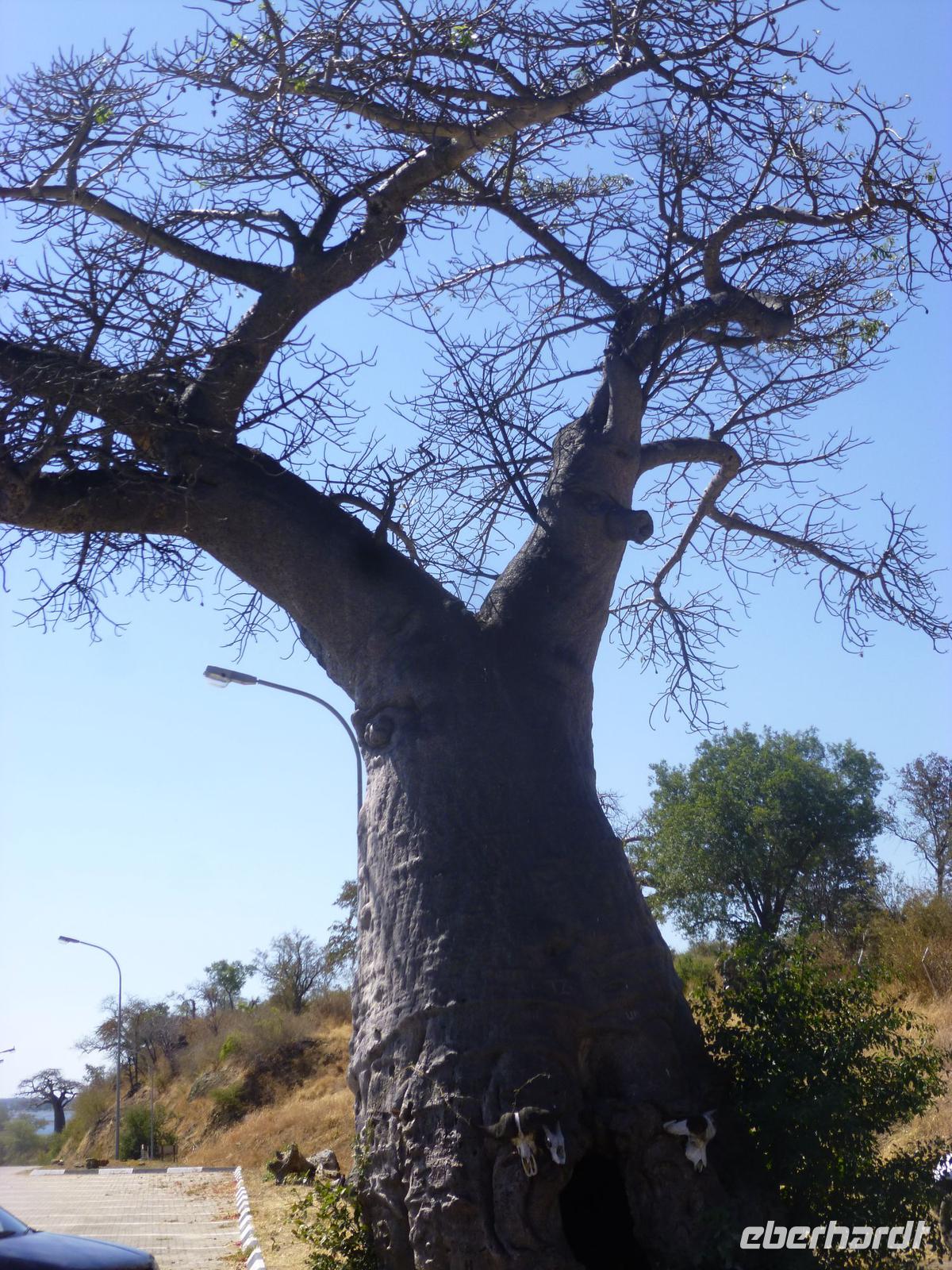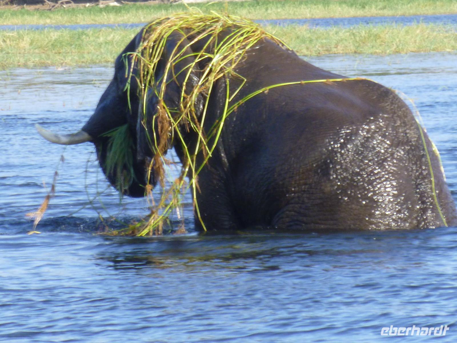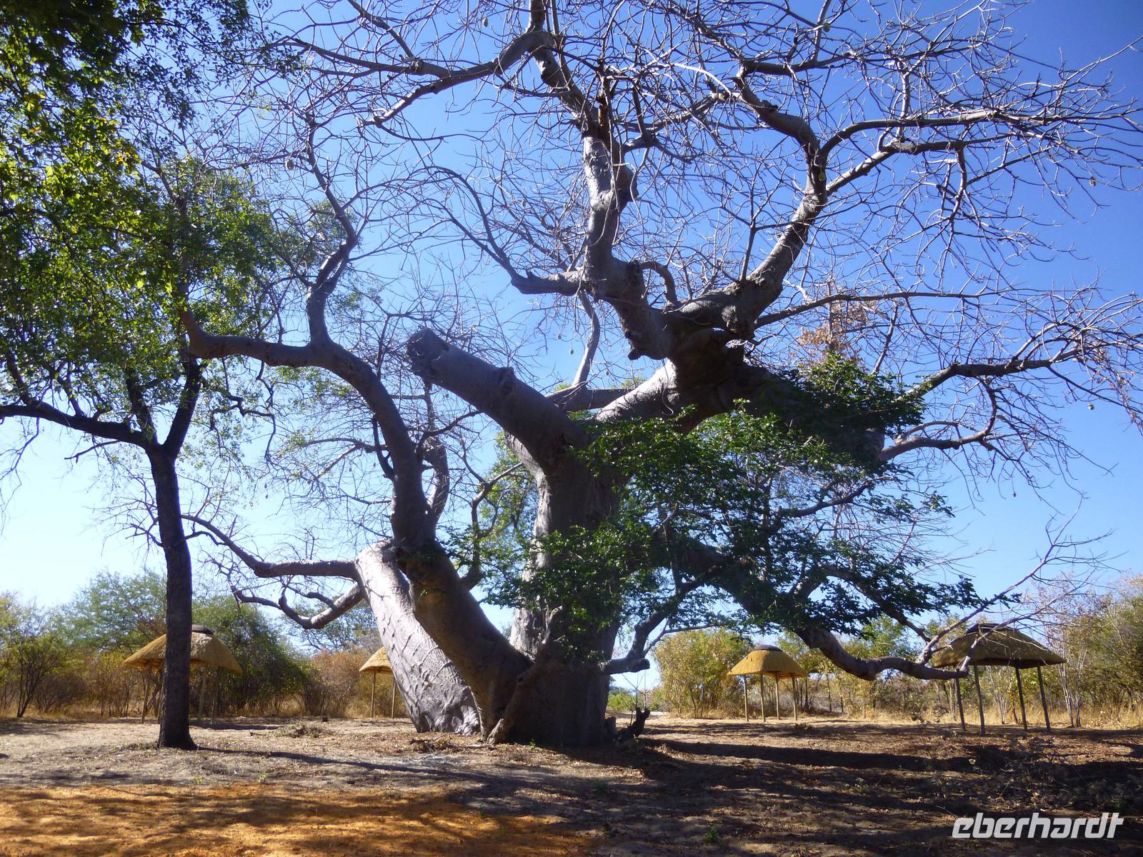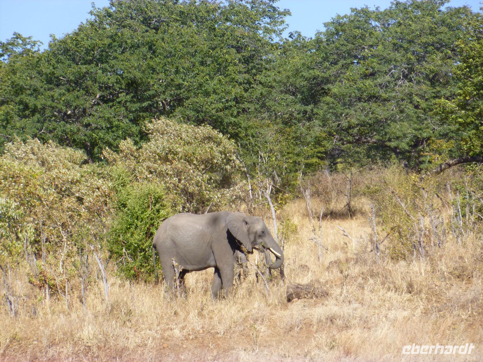 Wir verlassen den Caprivistreifen und fahren vorbei an Baobab Bäumen und den typischen Runddörfern zur Ngoma Bridge zur Grenzkontrolle. Anschließend überqueren wir die Grenze nach Botswana. Wir fuhren durch den Chobe Nationalpark nach Kasane. Tom erhielt den Hinweis, dass wir nicht anhalten und die Strecke nicht verlassen dürfen. Der Nationalpark umfasst ein Gebiet von 11.00 Quadratkilometer. Die Wildkonzentration ist sehr hoch. Allein 50.000 Elefanten leben im Park. Das stellt ein Problem für die Ökologie dar. Die Elefantenherden verursachen erhebliche Schäden.