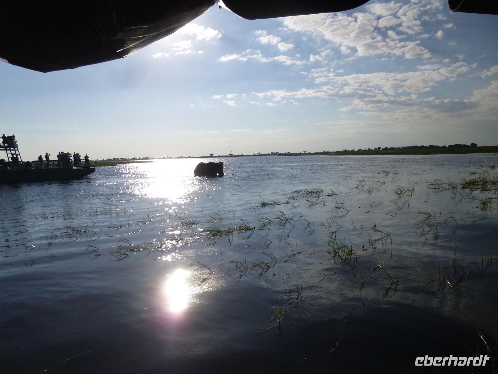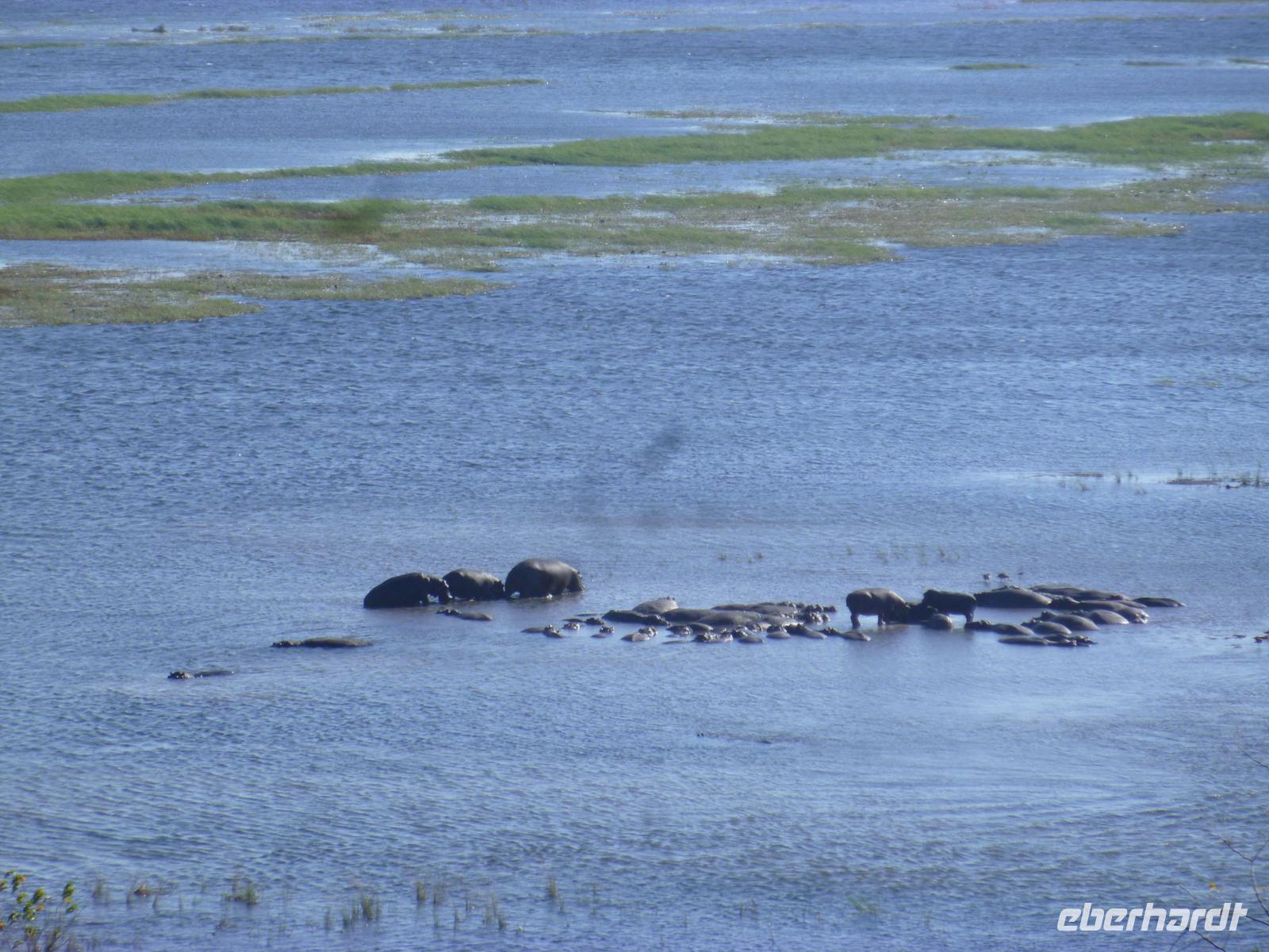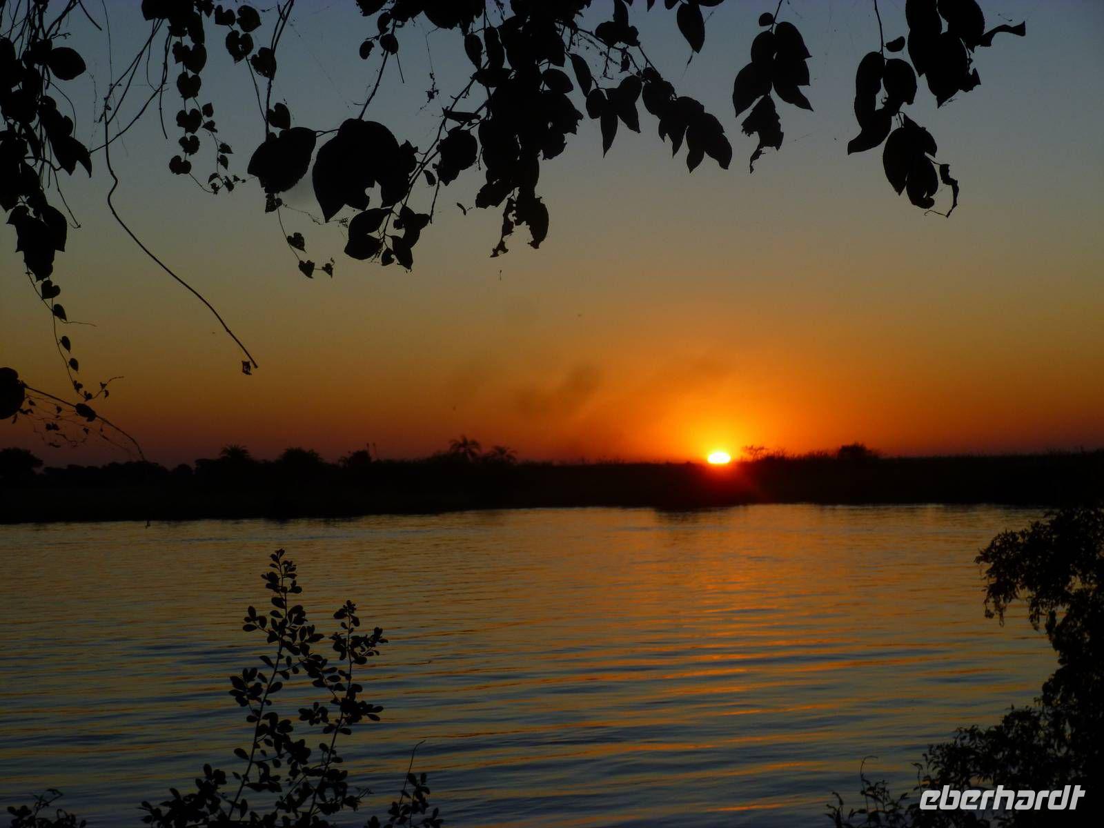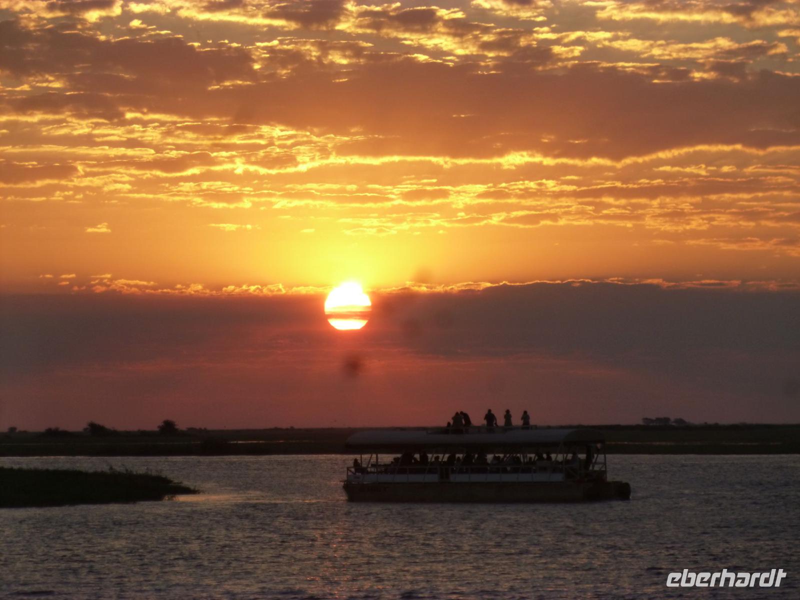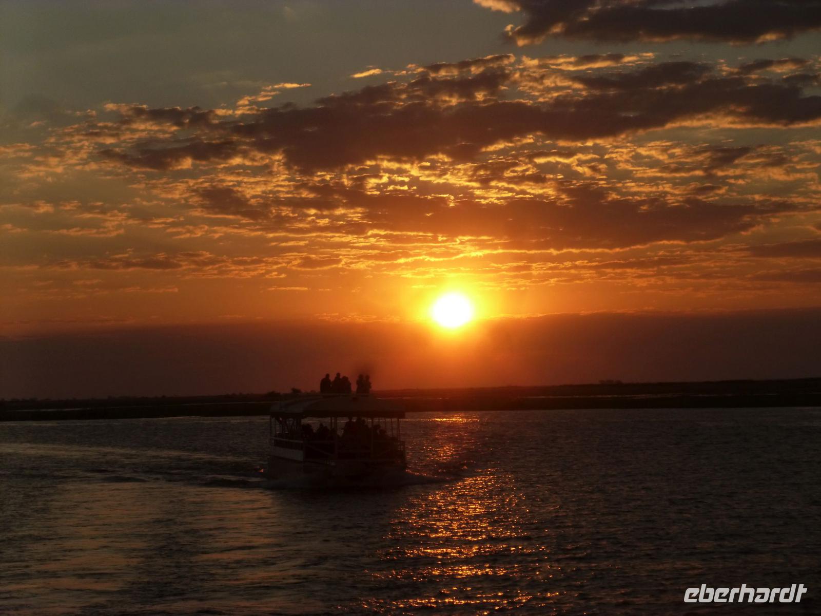 Früh am Morgen klingelt der Wecker und wir begeben uns mit dem Jeep auf eine Pirschfahrt durch den Nationalpark. Nach unserer Einfahrt in den Nationalpark waren wir noch gar nicht auf Tierbeobachtungen vorbereitet. Plötzlich tauchte direkt an der Straße ein Löwenpärchen auf. Erst sahen wir die Löwin und majestätisch stolzierte der Löwe hinter ihr her. Weiter ging die Fahrt durch den Nationalpark. Besonders beeindruckt waren wir von der Kraft des Leoparden. Leider war keiner zu sehen. Aber in der Gabelung eines Baumes hing ein erlegte Antilope. Auf der Rückfahrt sahen wir noch eine große Herde Büffel, Elefanten und die ersten Hypos. Das frühe aufstehen hatte sich gelohnt eine sehr gute Ausbeute. Nach unserer Rückkehr in der Lodge stärken wir uns am Frühstücksbuffet. Wir hatten etwas Zeit zum relaxen bevor wir eine Bootsfahrt auf dem Chope unternahmen. Wir hatten Glück wir fuhren mit dem großen Boot hinaus und nur eine kleine Gruppe aus Deutschland mit uns. Wir beobachten Krokodile und eine Herde Elefanten sowie die kleinen Bienenfresser. Besonders interessant war die Beobachtung eines kleinen Elefanten der gerade säugte. Und nun endlich die ersten Hypos von der Nähe. Sie standen am Ufer begaben sich in die richtige Foto Position. Auf einer kleinen Insel waren einige Hypos zu sehen. Wir konnten sie beim fressen beobachten schön war zu sehen wir eine Mutter ihr Kleines auf dem Rücken trug. Ein schöner Sonnenuntergang beendete diesen ereignisreichen Tag.