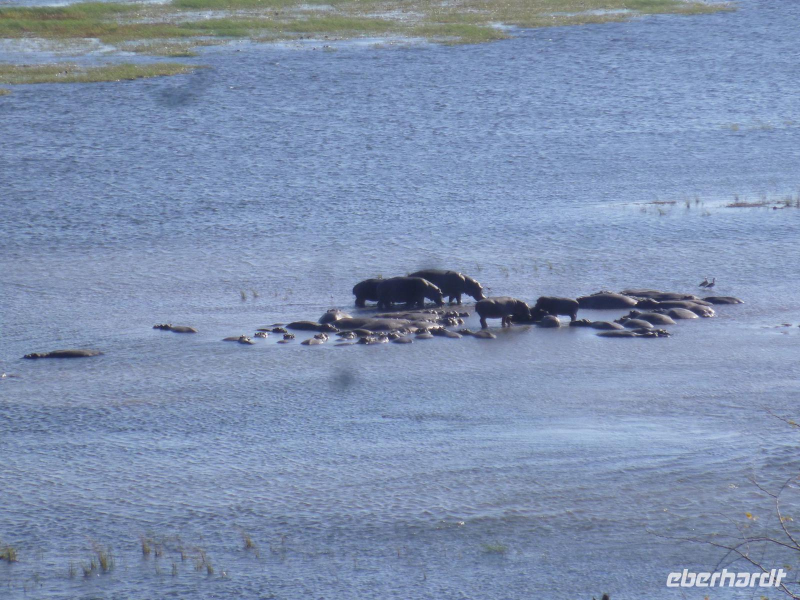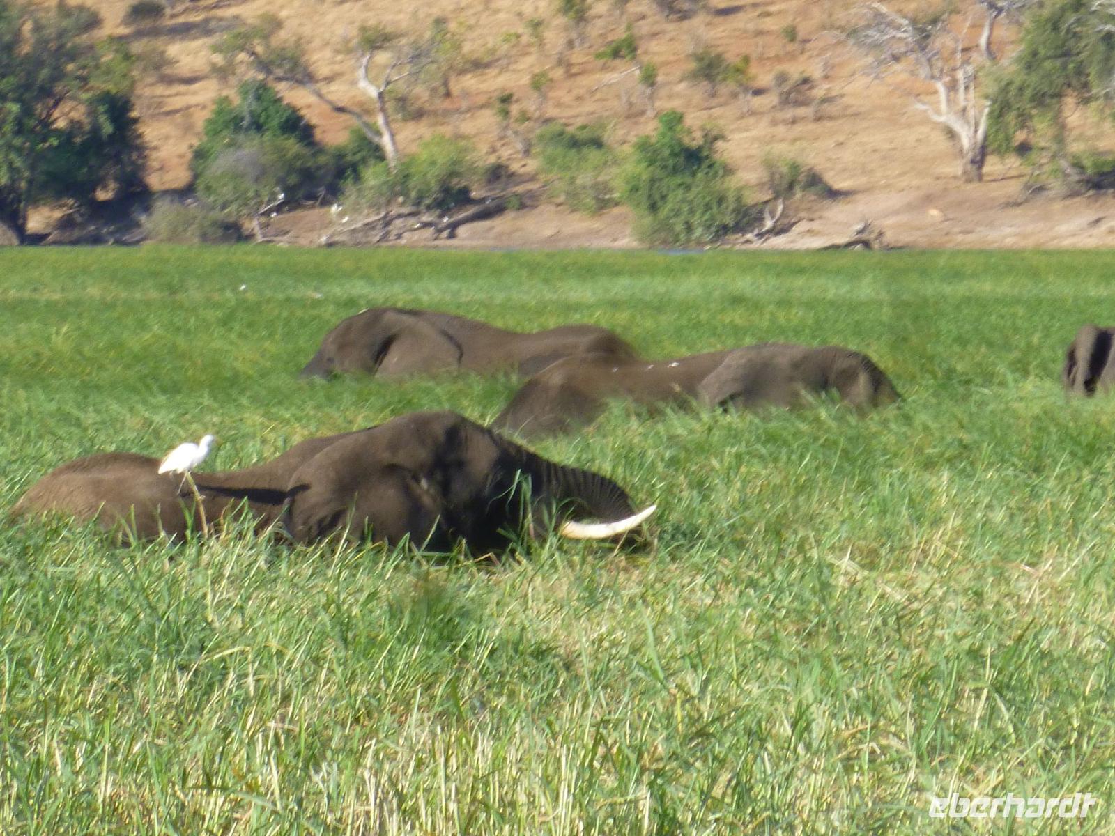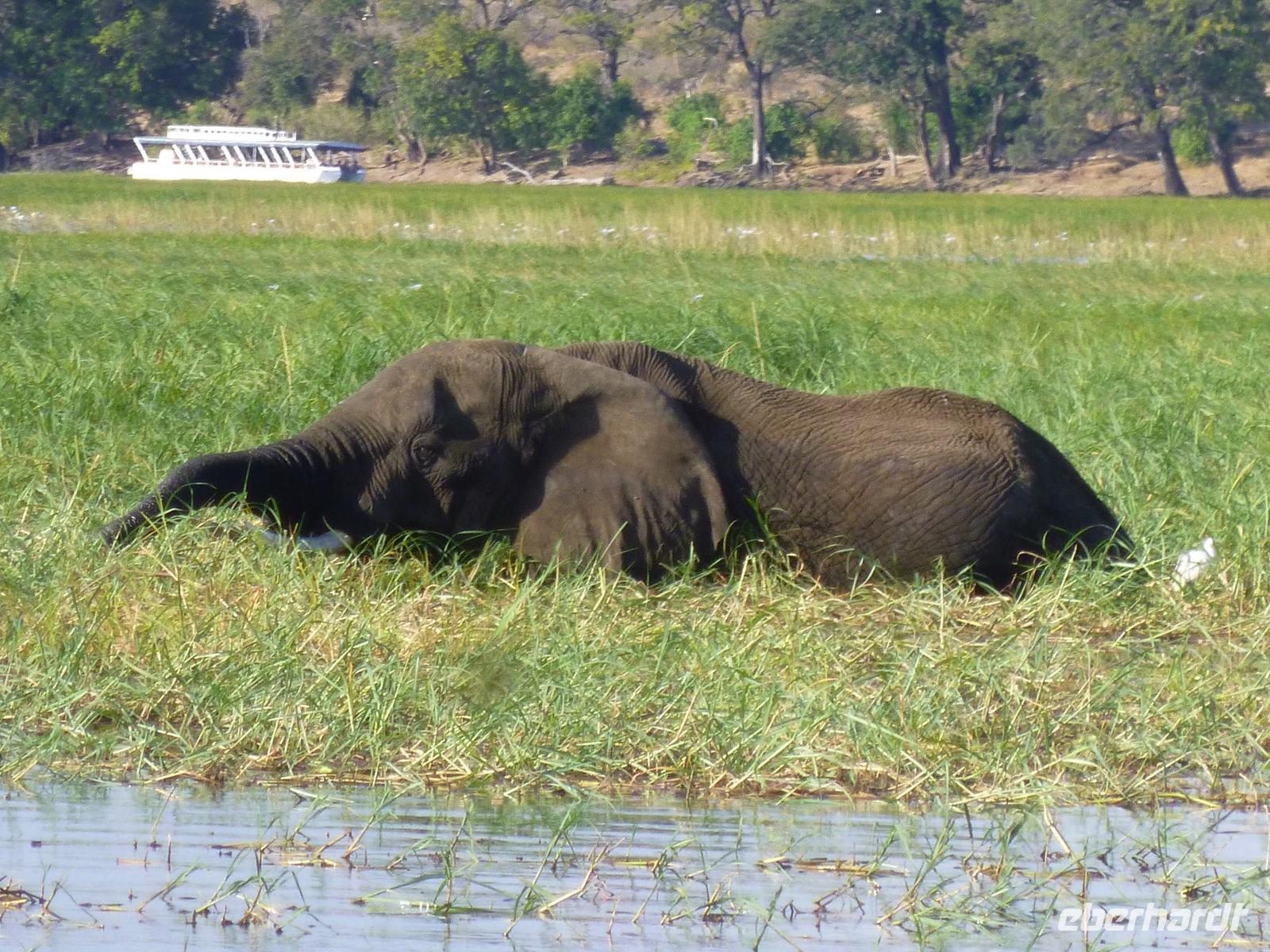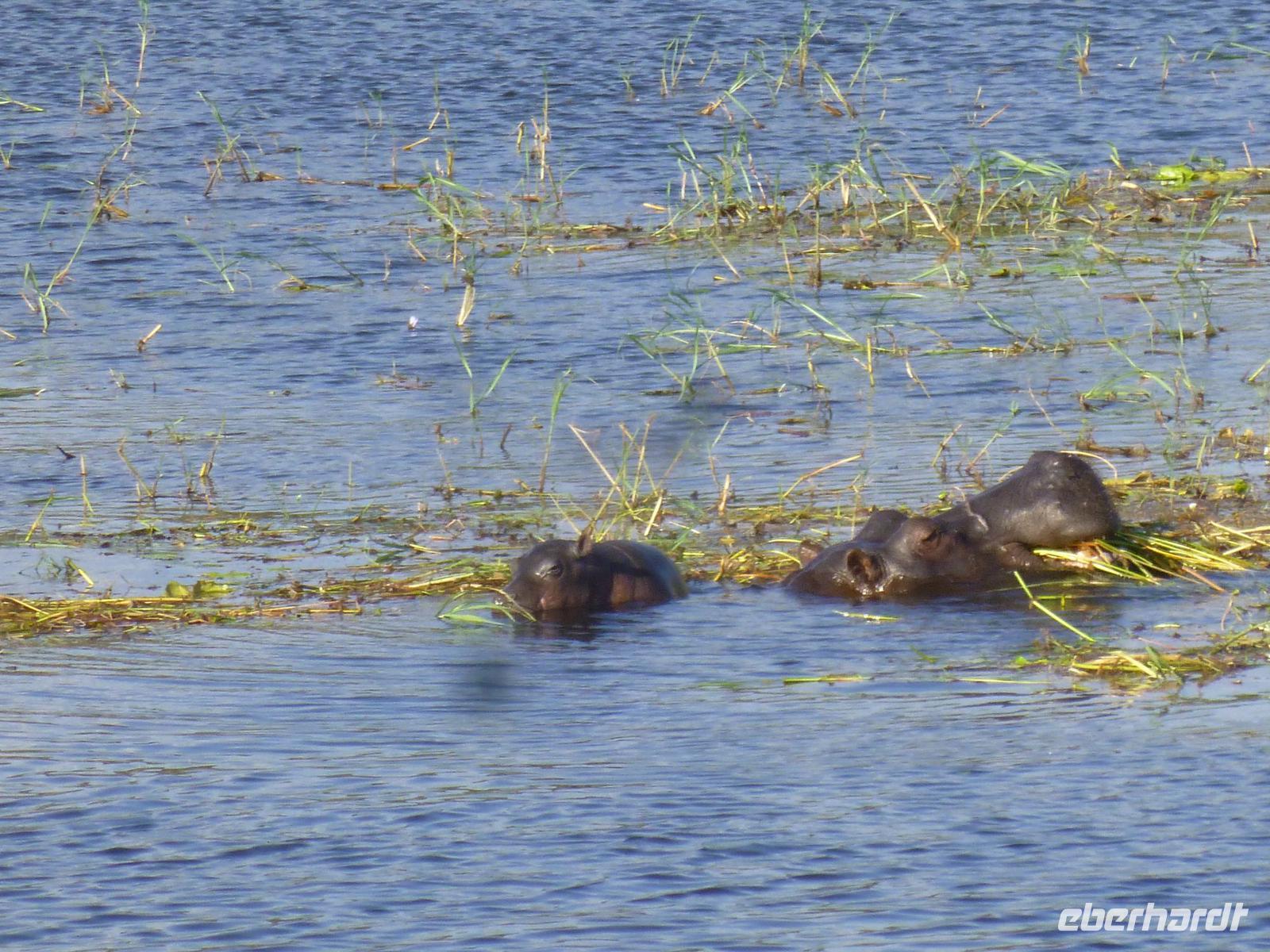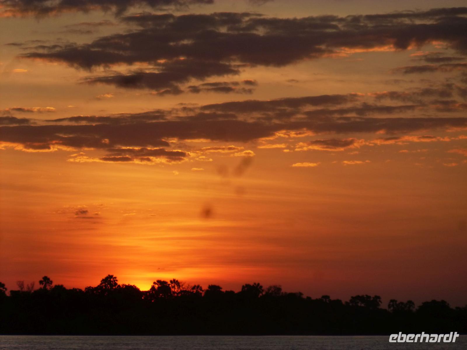 Früh am Morgen klingelt der Wecker und wir begeben uns mit dem Jeep auf eine Pirschfahrt durch den Nationalpark. Nach unserer Einfahrt in den Nationalpark waren wir noch gar nicht auf Tierbeobachtungen vorbereitet. Plötzlich tauchte direkt an der Straße ein Löwenpärchen auf. Erst sahen wir die Löwin und majestätisch stolzierte der Löwe hinter ihr her. Weiter ging die Fahrt durch den Nationalpark. Besonders beeindruckt waren wir von der Kraft des Leoparden. Leider war keiner zu sehen. Aber in der Gabelung eines Baumes hing ein erlegte Antilope. Auf der Rückfahrt sahen wir noch eine große Herde Büffel, Elefanten und die ersten Hypos. Das frühe aufstehen hatte sich gelohnt eine sehr gute Ausbeute. Nach unserer Rückkehr in der Lodge stärken wir uns am Frühstücksbuffet. Wir hatten etwas Zeit zum relaxen bevor wir eine Bootsfahrt auf dem Chope unternahmen. Wir hatten Glück wir fuhren mit dem großen Boot hinaus und nur eine kleine Gruppe aus Deutschland mit uns. Wir beobachten Krokodile und eine Herde Elefanten sowie die kleinen Bienenfresser. Besonders interessant war die Beobachtung eines kleinen Elefanten der gerade säugte. Und nun endlich die ersten Hypos von der Nähe. Sie standen am Ufer begaben sich in die richtige Foto Position. Auf einer kleinen Insel waren einige Hypos zu sehen. Wir konnten sie beim fressen beobachten schön war zu sehen wir eine Mutter ihr Kleines auf dem Rücken trug. Ein schöner Sonnenuntergang beendete diesen ereignisreichen Tag.