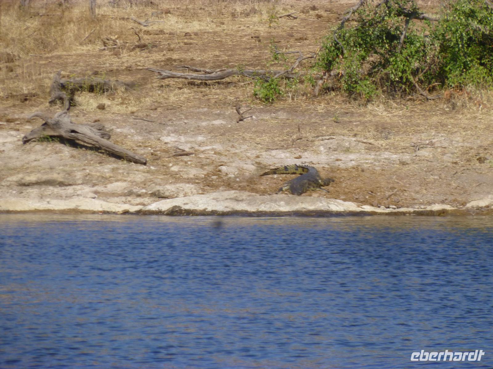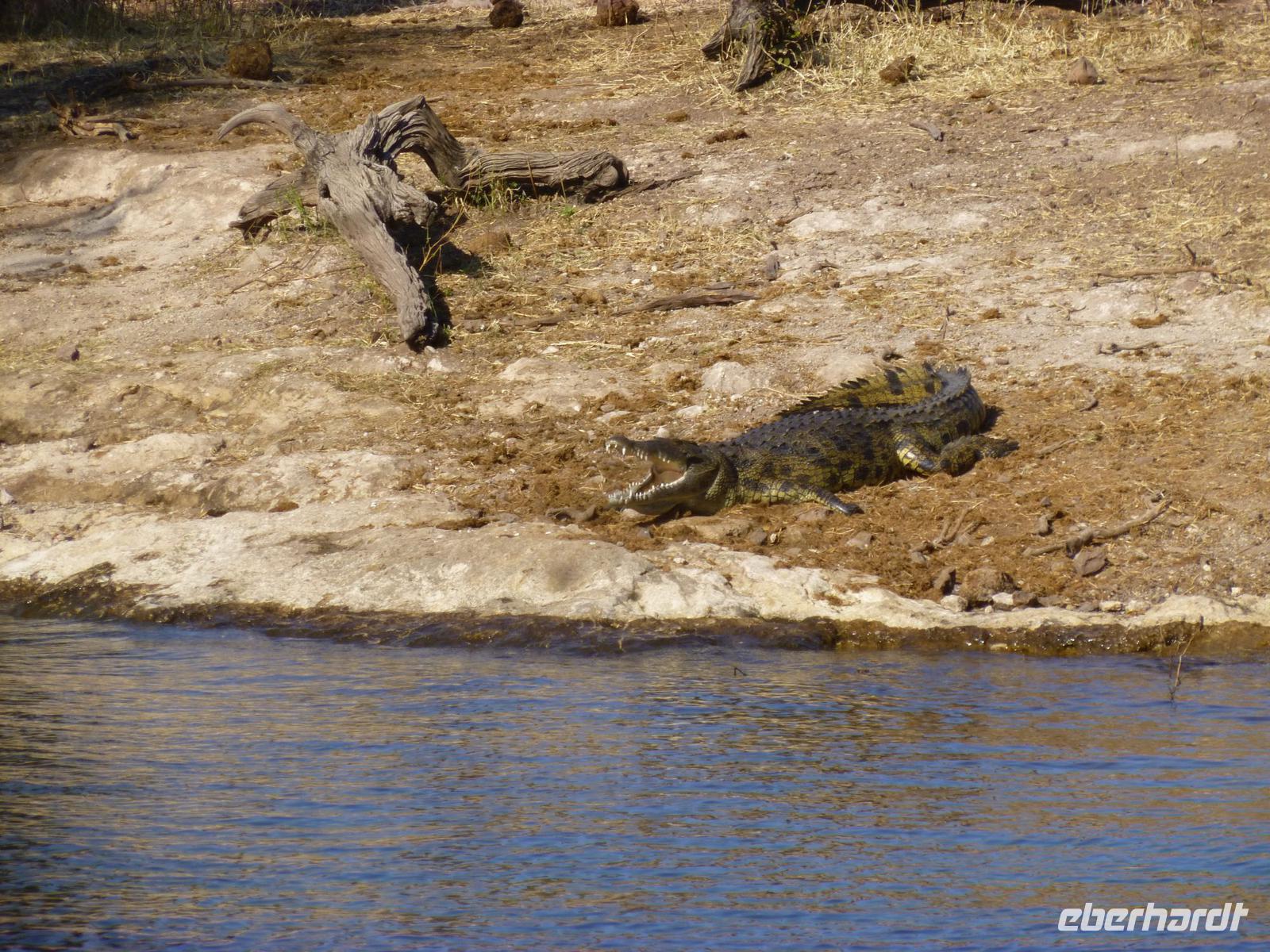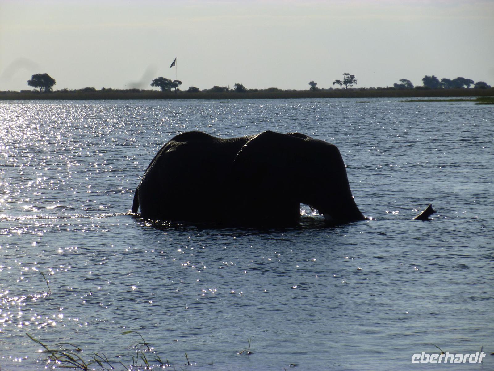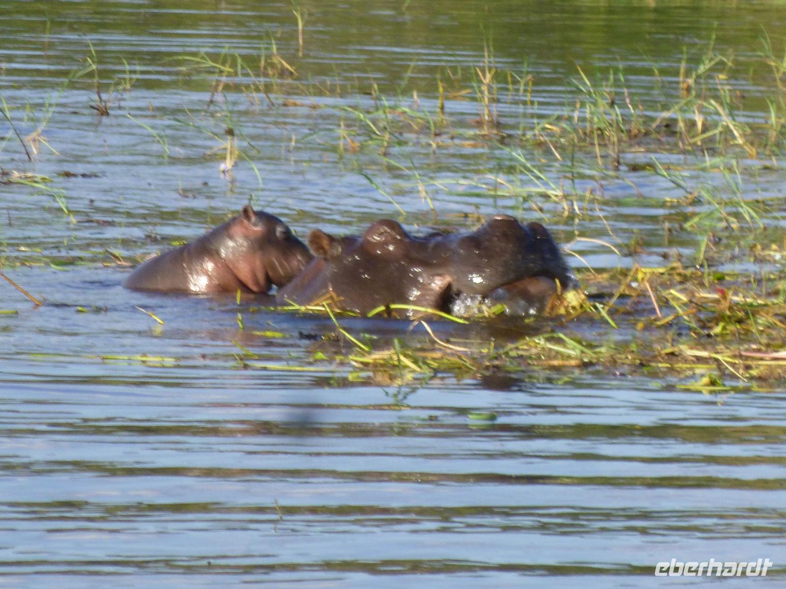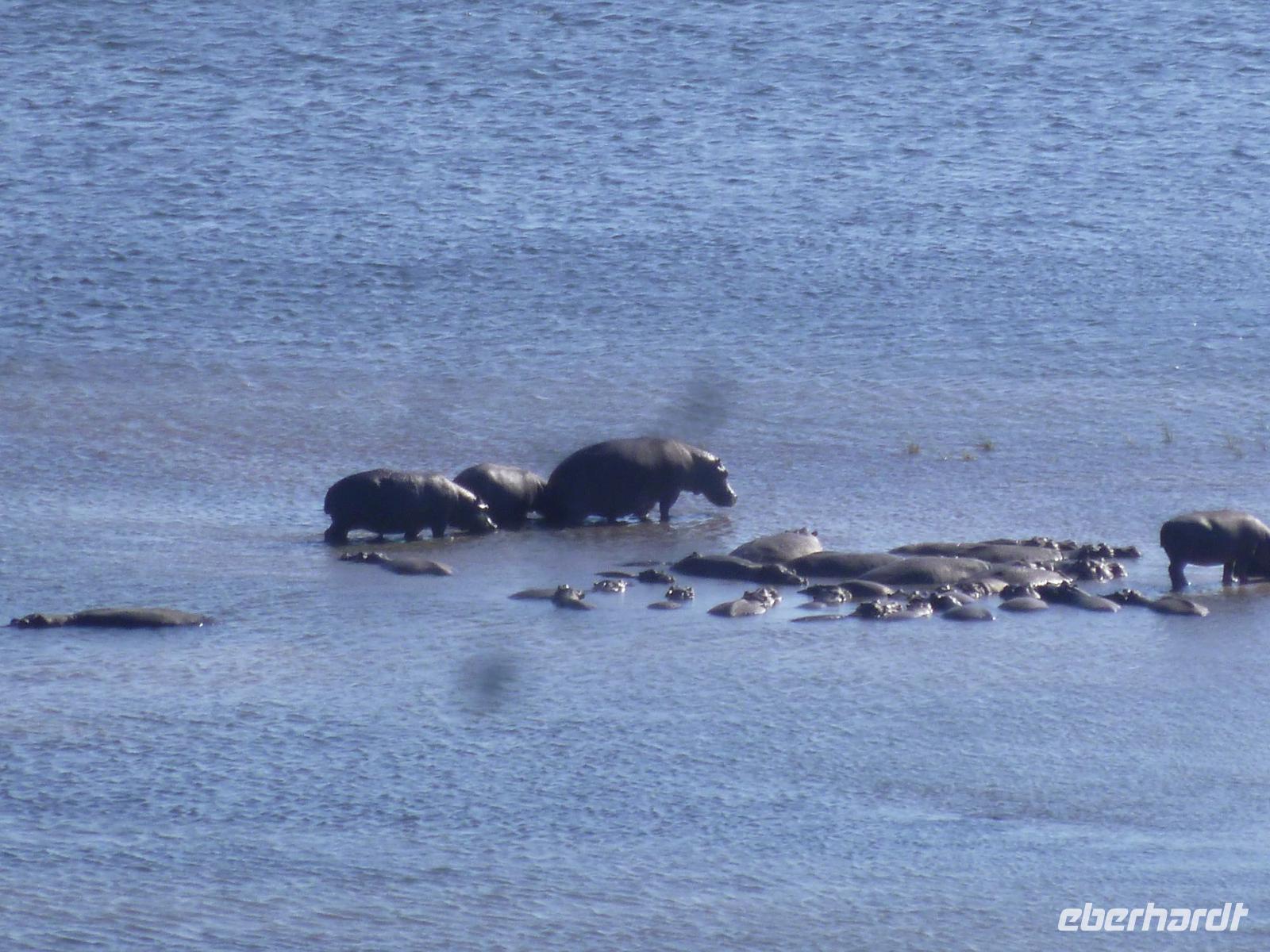 Früh am Morgen klingelt der Wecker und wir begeben uns mit dem Jeep auf eine Pirschfahrt durch den Nationalpark. Nach unserer Einfahrt in den Nationalpark waren wir noch gar nicht auf Tierbeobachtungen vorbereitet. Plötzlich tauchte direkt an der Straße ein Löwenpärchen auf. Erst sahen wir die Löwin und majestätisch stolzierte der Löwe hinter ihr her. Weiter ging die Fahrt durch den Nationalpark. Besonders beeindruckt waren wir von der Kraft des Leoparden. Leider war keiner zu sehen. Aber in der Gabelung eines Baumes hing ein erlegte Antilope. Auf der Rückfahrt sahen wir noch eine große Herde Büffel, Elefanten und die ersten Hypos. Das frühe aufstehen hatte sich gelohnt eine sehr gute Ausbeute. Nach unserer Rückkehr in der Lodge stärken wir uns am Frühstücksbuffet. Wir hatten etwas Zeit zum relaxen bevor wir eine Bootsfahrt auf dem Chope unternahmen. Wir hatten Glück wir fuhren mit dem großen Boot hinaus und nur eine kleine Gruppe aus Deutschland mit uns. Wir beobachten Krokodile und eine Herde Elefanten sowie die kleinen Bienenfresser. Besonders interessant war die Beobachtung eines kleinen Elefanten der gerade säugte. Und nun endlich die ersten Hypos von der Nähe. Sie standen am Ufer begaben sich in die richtige Foto Position. Auf einer kleinen Insel waren einige Hypos zu sehen. Wir konnten sie beim fressen beobachten schön war zu sehen wir eine Mutter ihr Kleines auf dem Rücken trug. Ein schöner Sonnenuntergang beendete diesen ereignisreichen Tag.